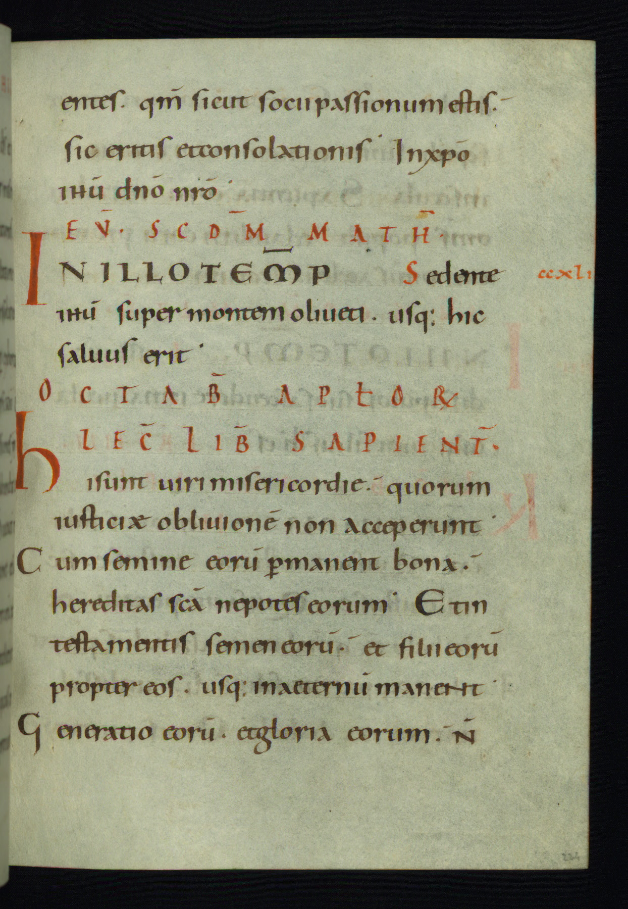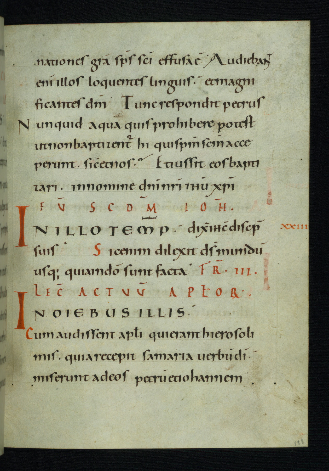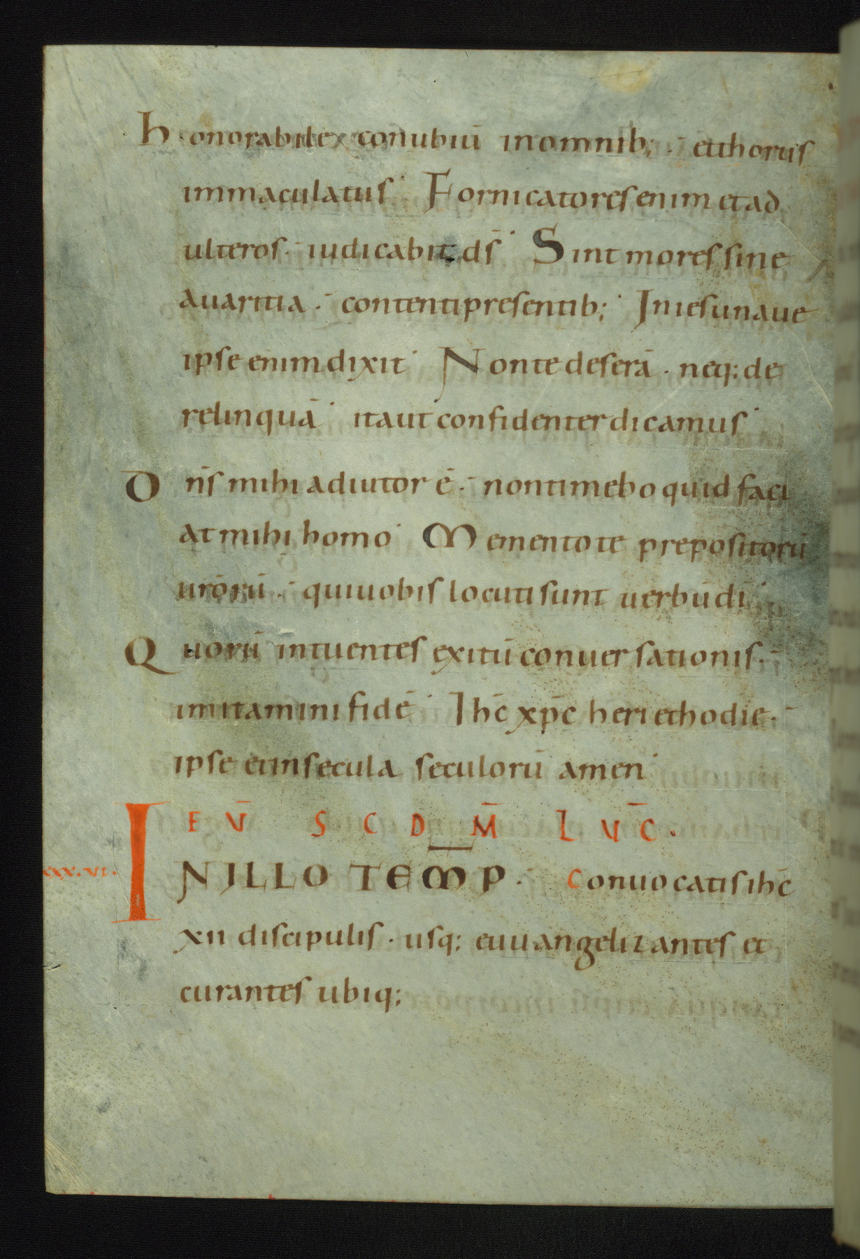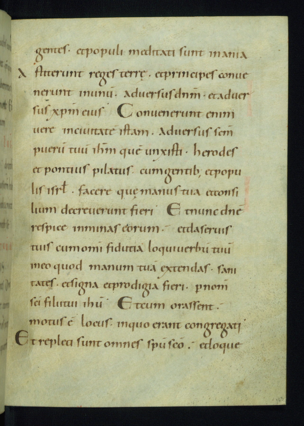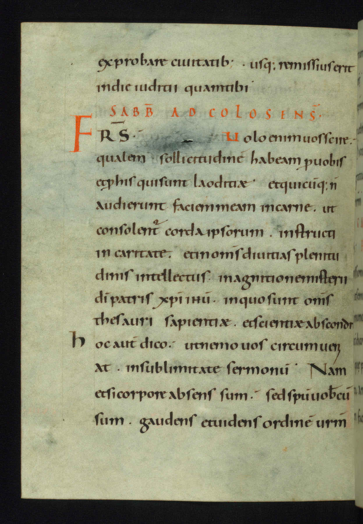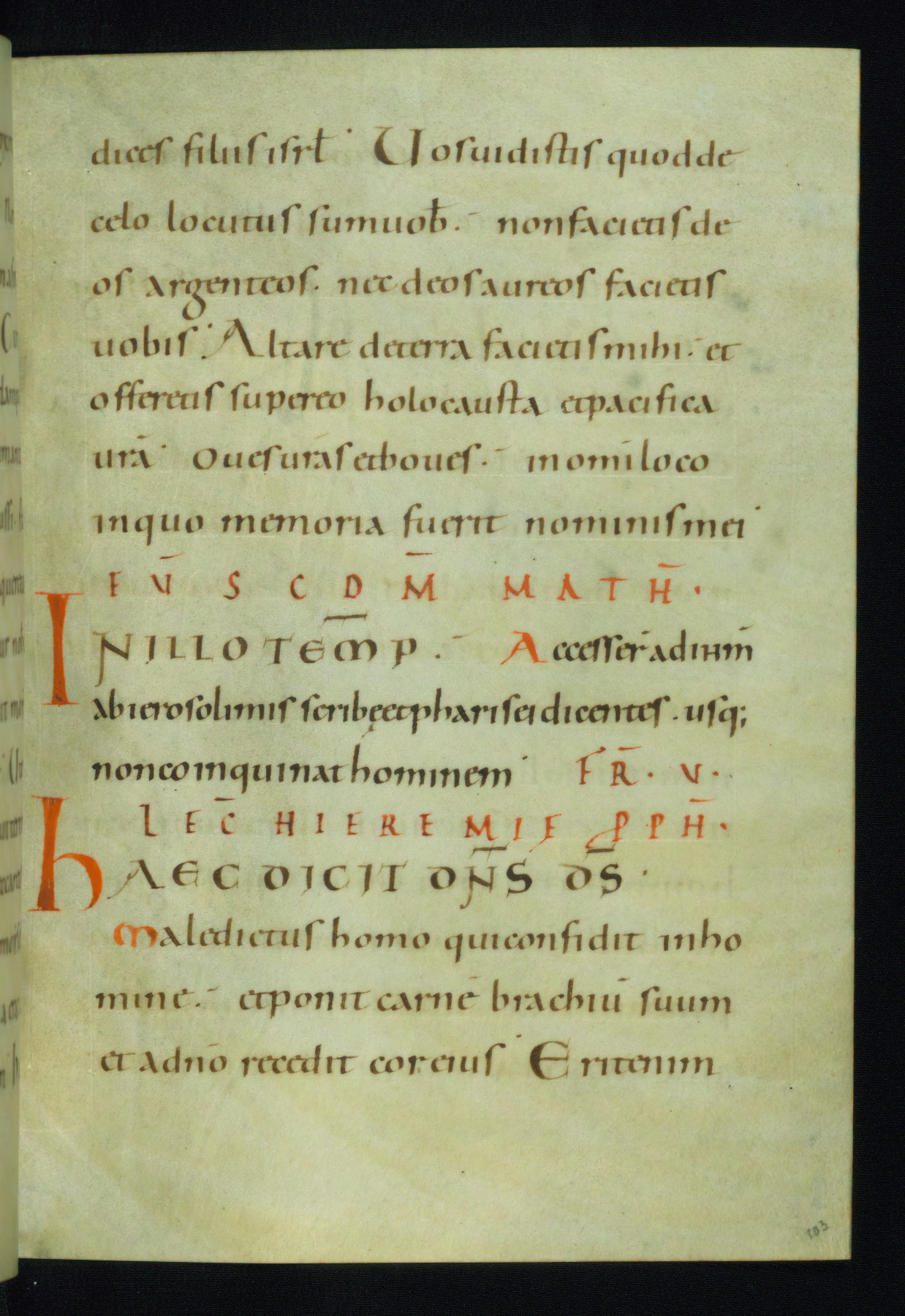This Lectionary was created ca. 1000 in Trier. Written in a clear Caroline minuscule, it contains decorated initials at the openings of important readings. A set of illuminated letters marks the beginning of the Epistle and Gospel lessons for Easter; they display the hierarchy of scripts with capital letters decorated with gold leaf or drawn in red ink, followed by uncial and Caroline minuscule. Initials in orange, sometimes filled with gold, mark the divisions of the text. The book has been stylistically compared with Ottonian manuscripts, especially with a Psalter preserved in Trier (Stadtbibliothek, Ms. 7) illuminated by the so-called Master of the Registrum Gregorii.