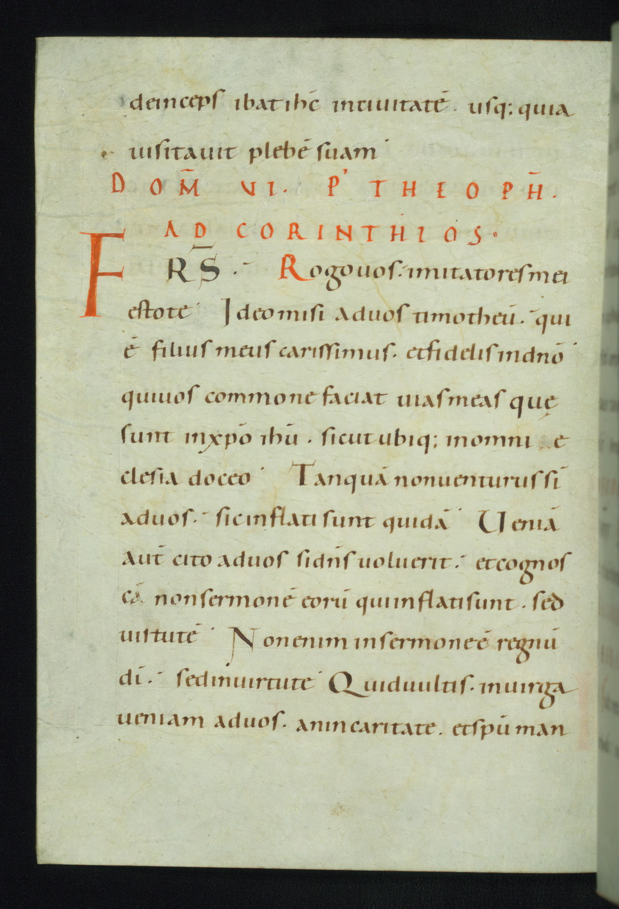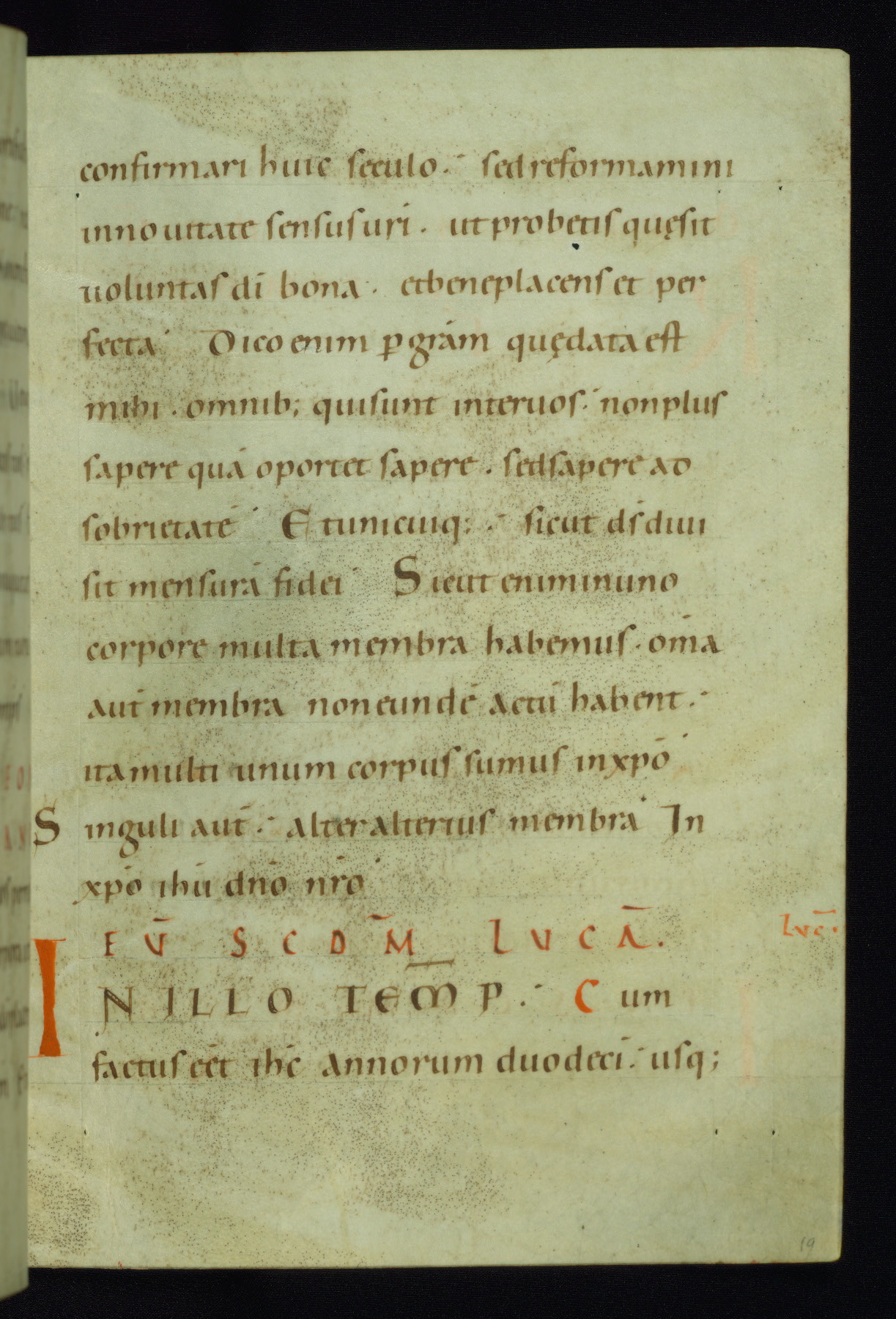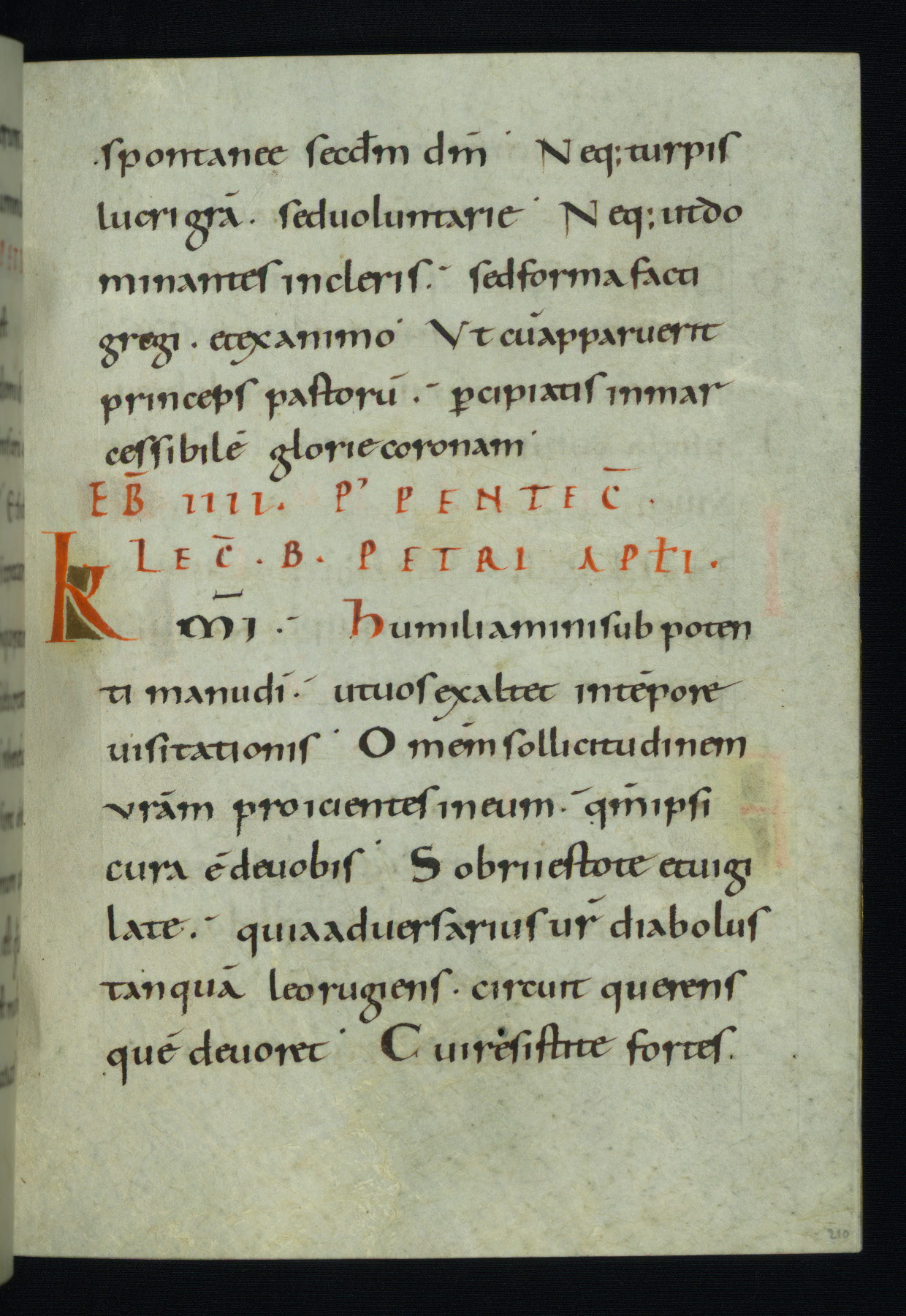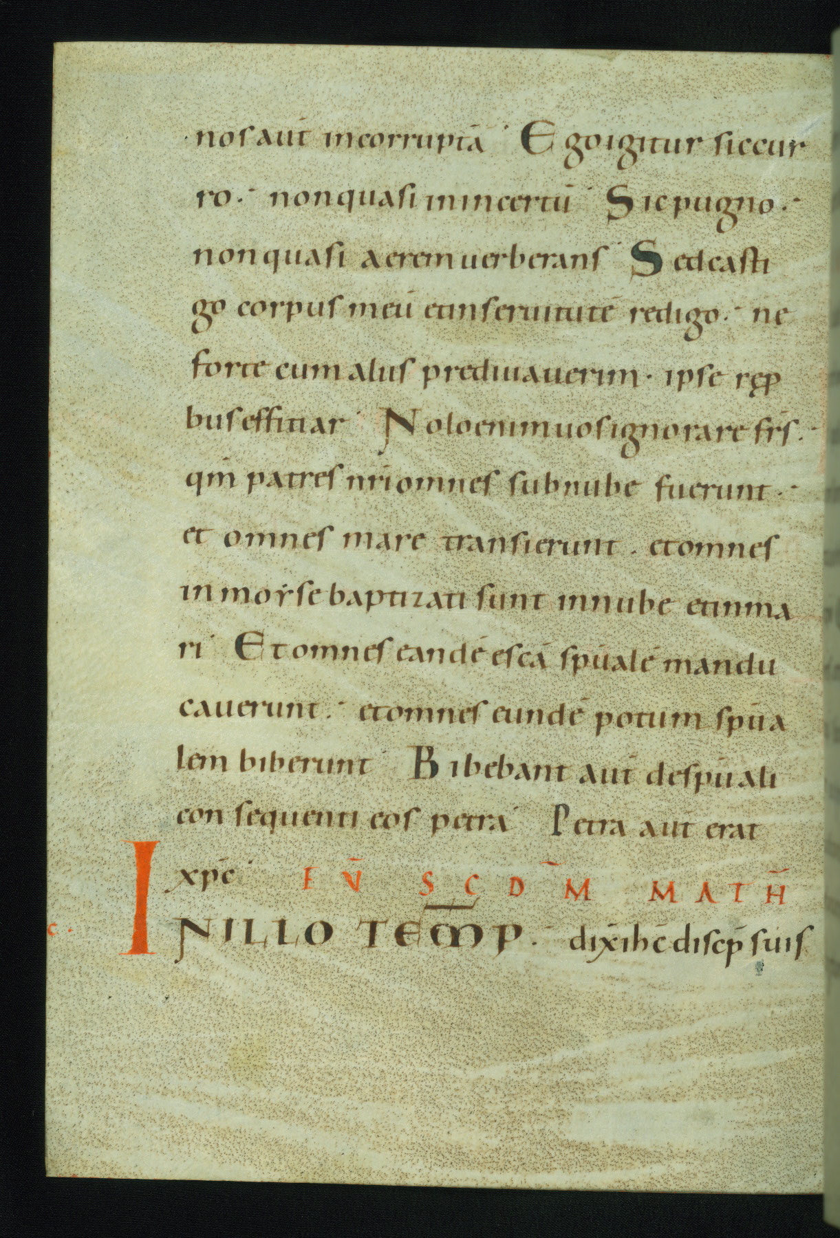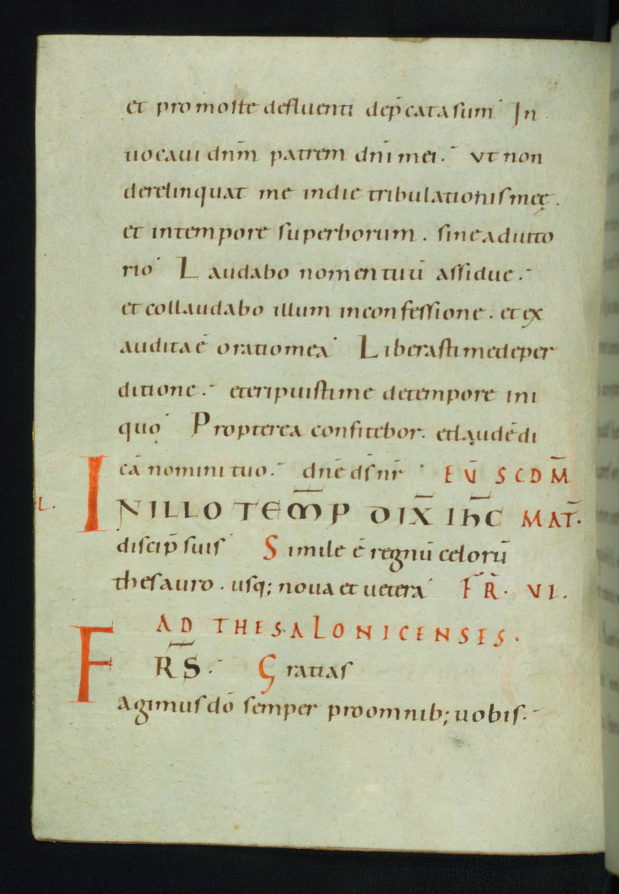 This Lectionary was created ca. 1000 in Trier. Written in a clear Caroline minuscule, it contains decorated initials at the openings of important readings. A set of illuminated letters marks the beginning of the Epistle and Gospel lessons for Easter; they display the hierarchy of scripts with capital letters decorated with gold leaf or drawn in red ink, followed by uncial and Caroline minuscule. Initials in orange, sometimes filled with gold, mark the divisions of the text. The book has been stylistically compared with Ottonian manuscripts, especially with a Psalter preserved in Trier (Stadtbibliothek, Ms. 7) illuminated by the so-called Master of the Registrum Gregorii.