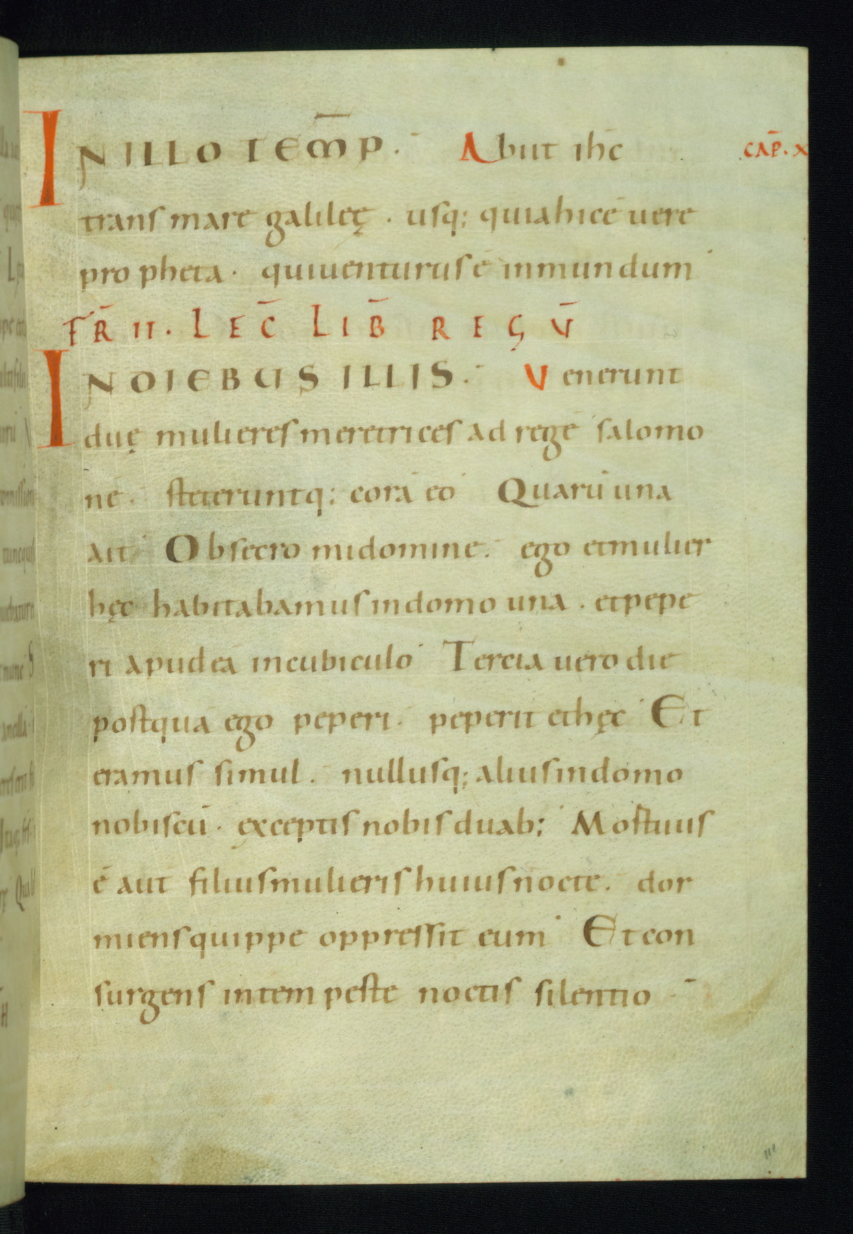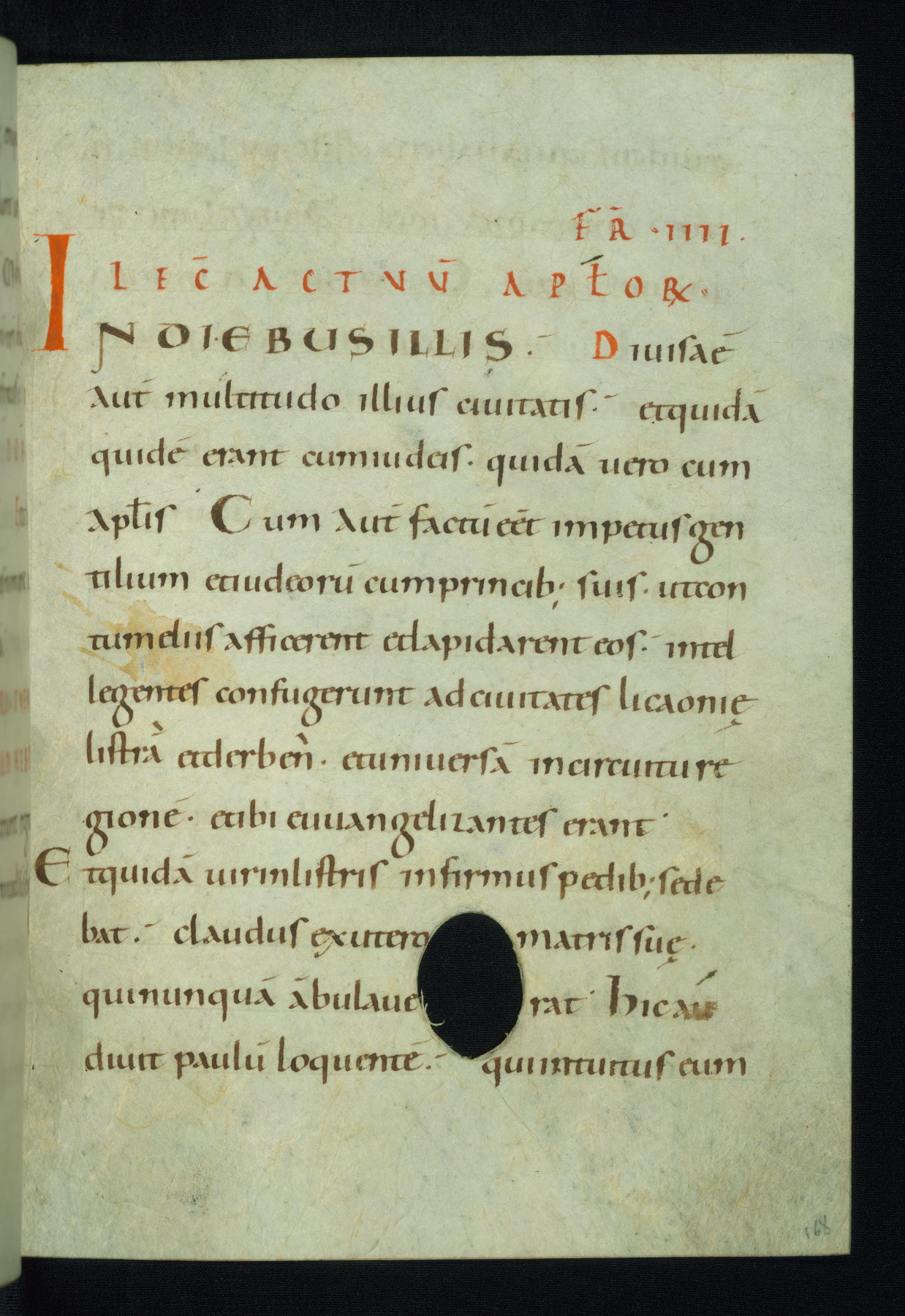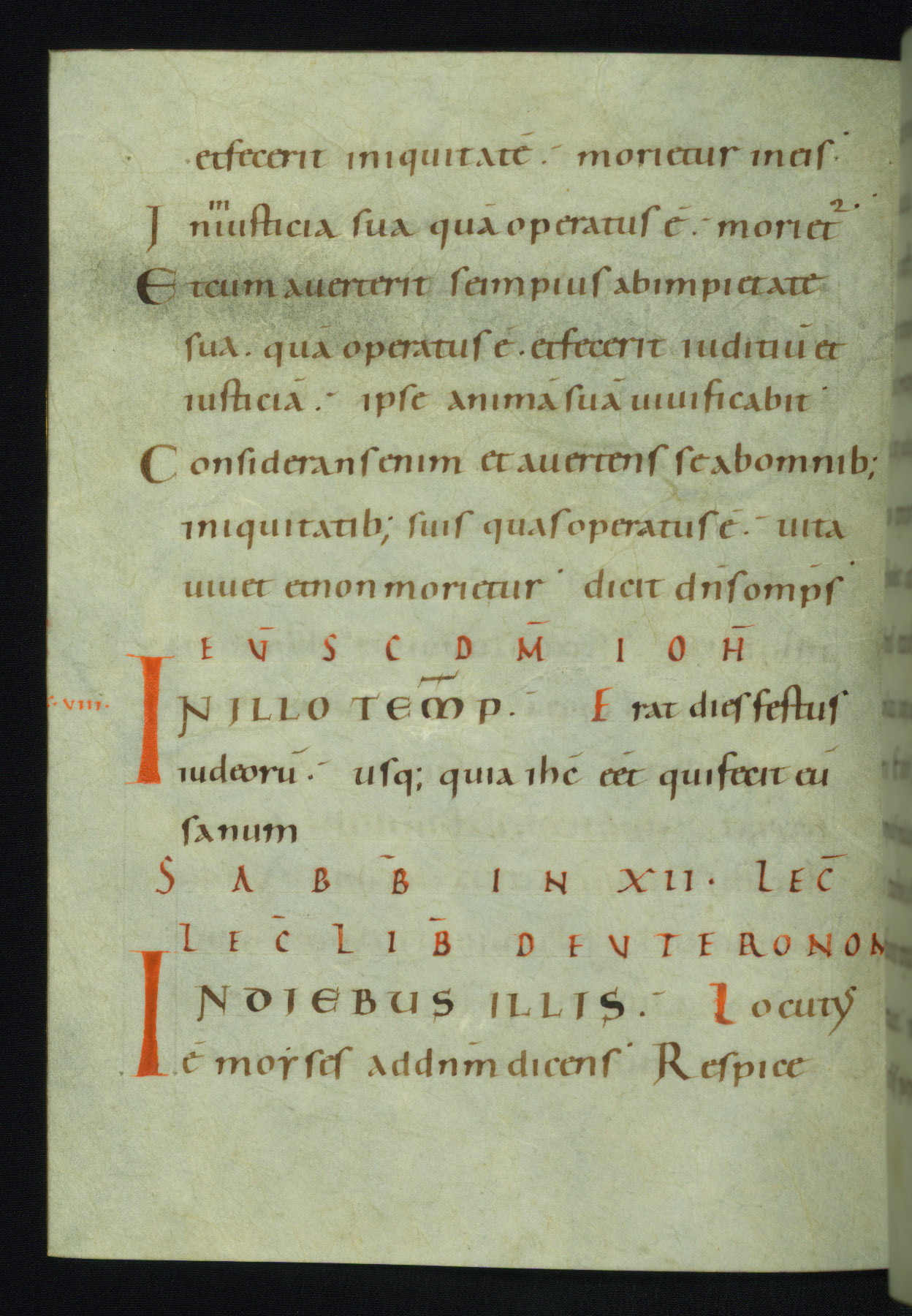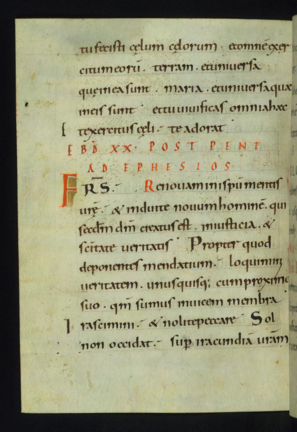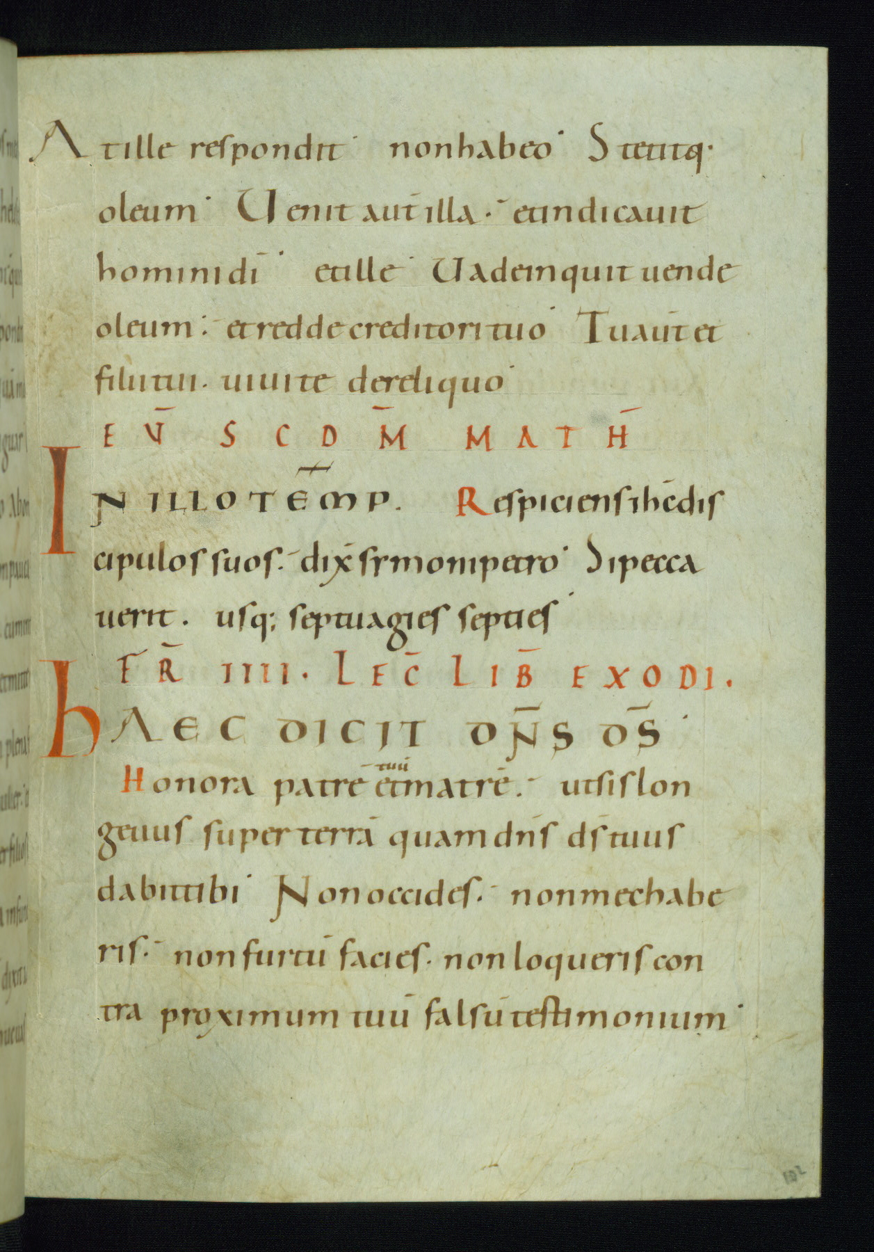 This Lectionary was created ca. 1000 in Trier. Written in a clear Caroline minuscule, it contains decorated initials at the openings of important readings. A set of illuminated letters marks the beginning of the Epistle and Gospel lessons for Easter; they display the hierarchy of scripts with capital letters decorated with gold leaf or drawn in red ink, followed by uncial and Caroline minuscule. Initials in orange, sometimes filled with gold, mark the divisions of the text. The book has been stylistically compared with Ottonian manuscripts, especially with a Psalter preserved in Trier (Stadtbibliothek, Ms. 7) illuminated by the so-called Master of the Registrum Gregorii.