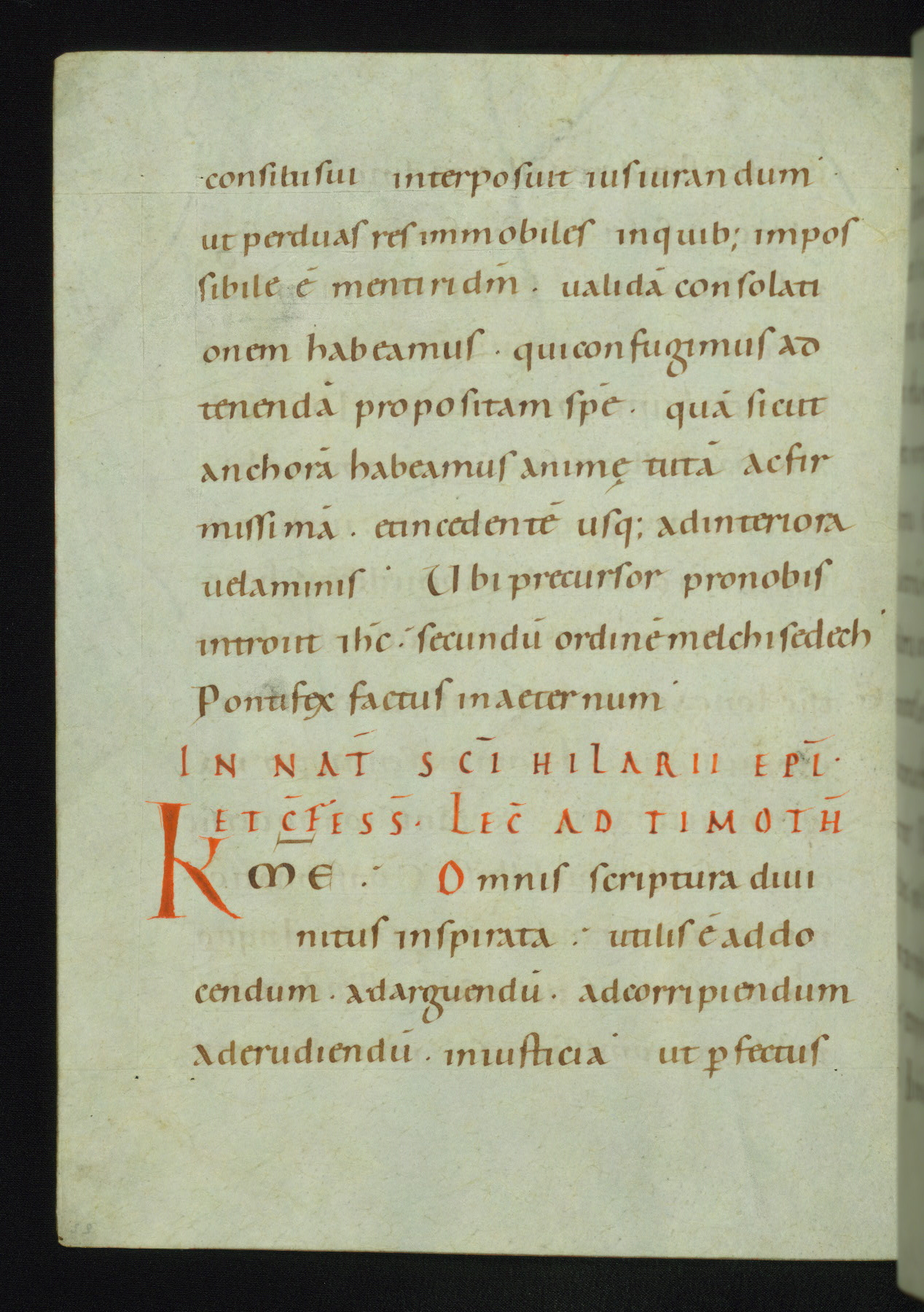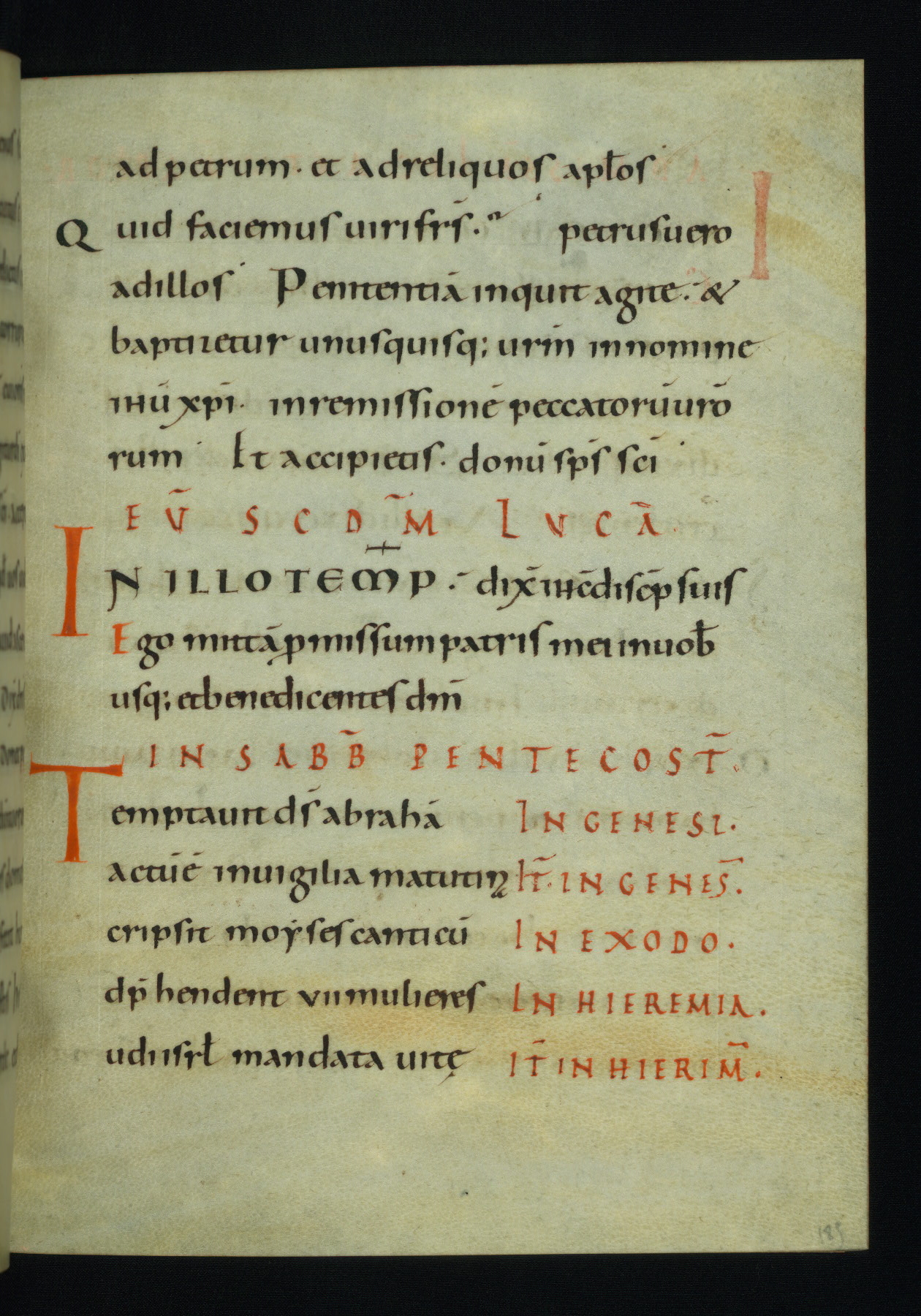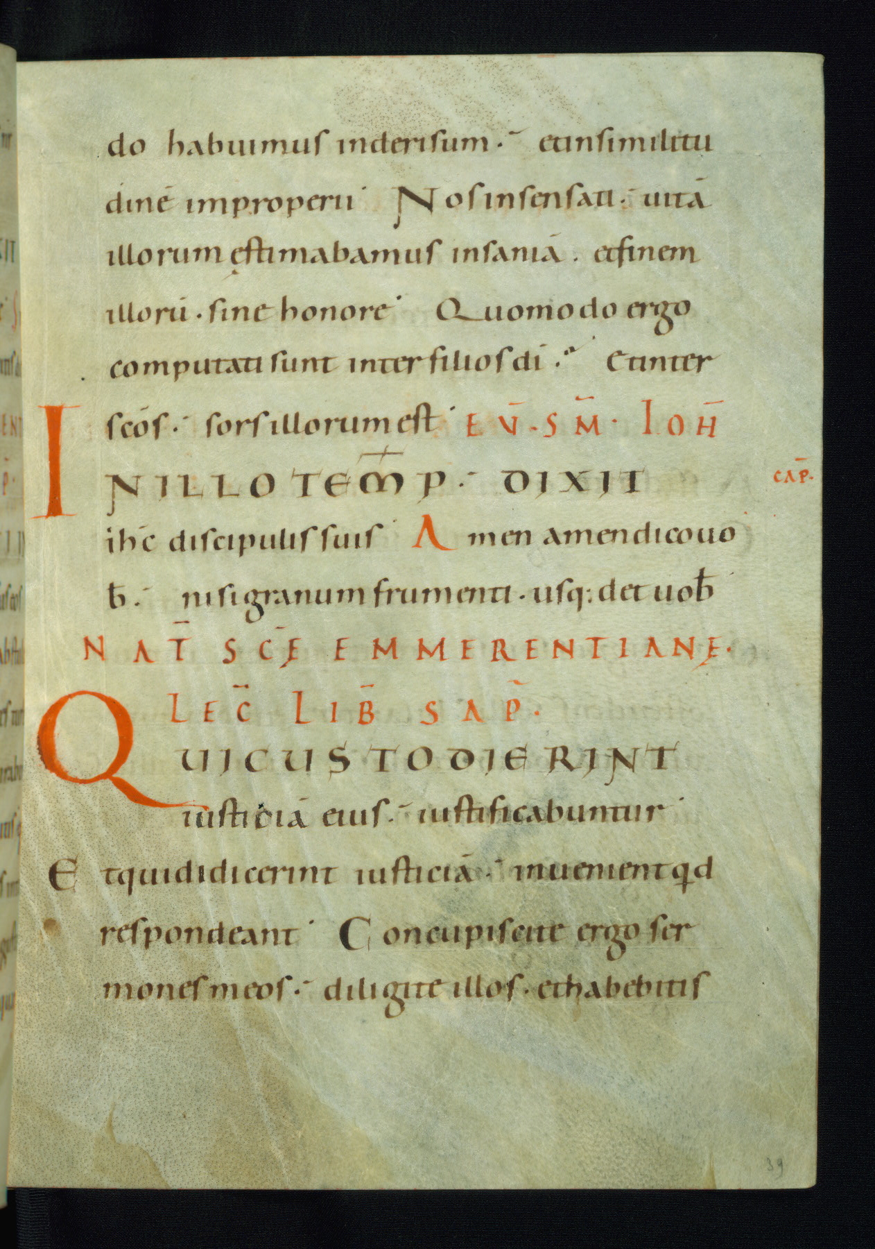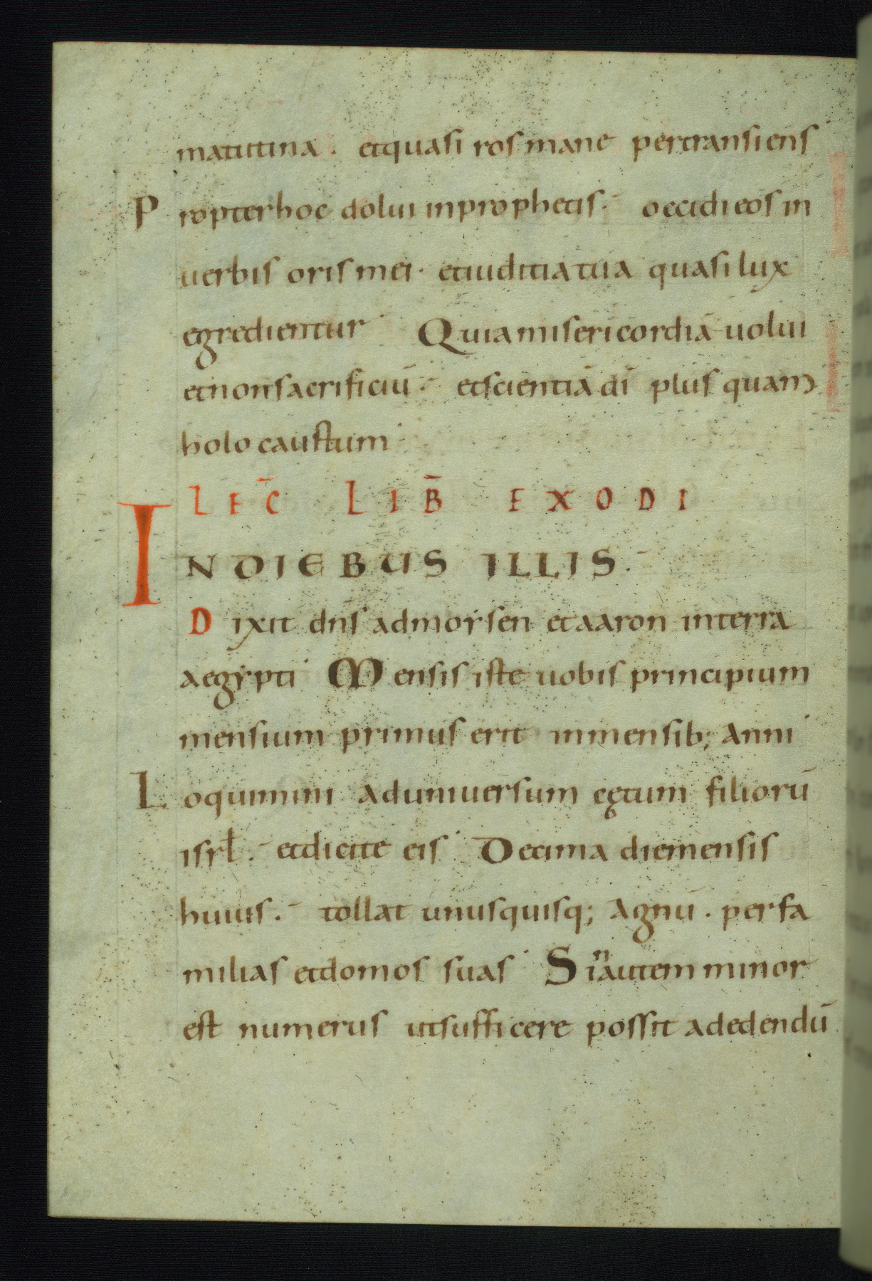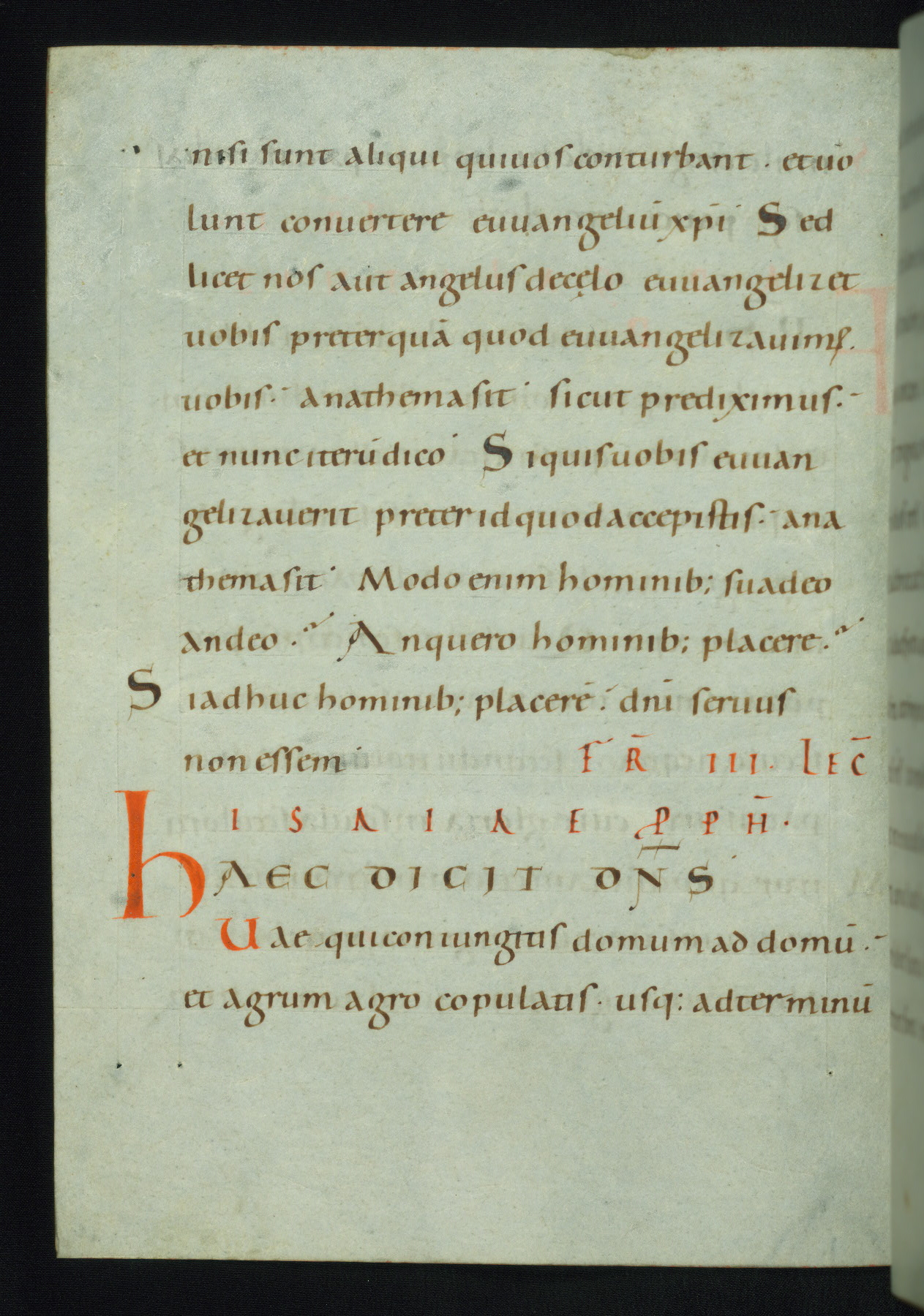 This Lectionary was created ca. 1000 in Trier. Written in a clear Caroline minuscule, it contains decorated initials at the openings of important readings. A set of illuminated letters marks the beginning of the Epistle and Gospel lessons for Easter; they display the hierarchy of scripts with capital letters decorated with gold leaf or drawn in red ink, followed by uncial and Caroline minuscule. Initials in orange, sometimes filled with gold, mark the divisions of the text. The book has been stylistically compared with Ottonian manuscripts, especially with a Psalter preserved in Trier (Stadtbibliothek, Ms. 7) illuminated by the so-called Master of the Registrum Gregorii.