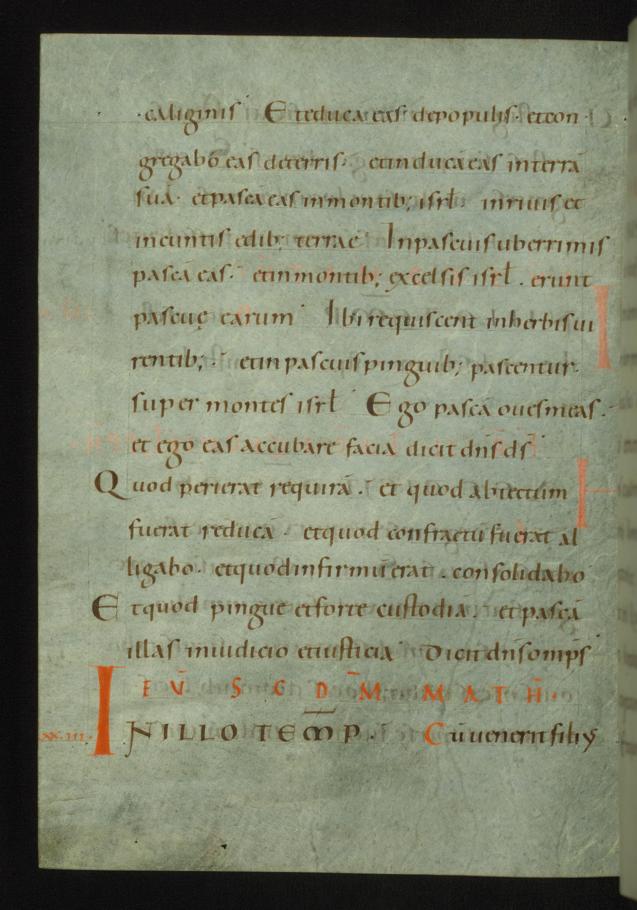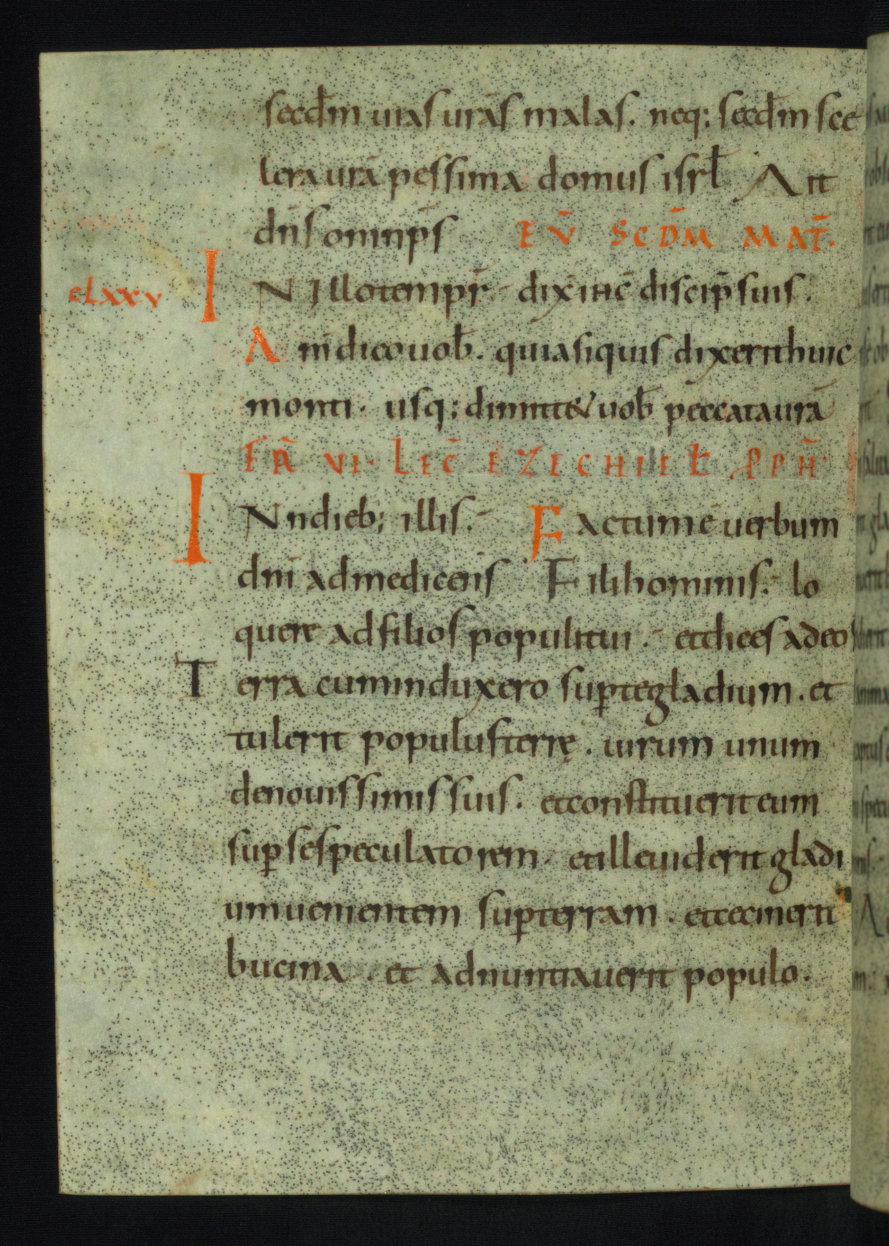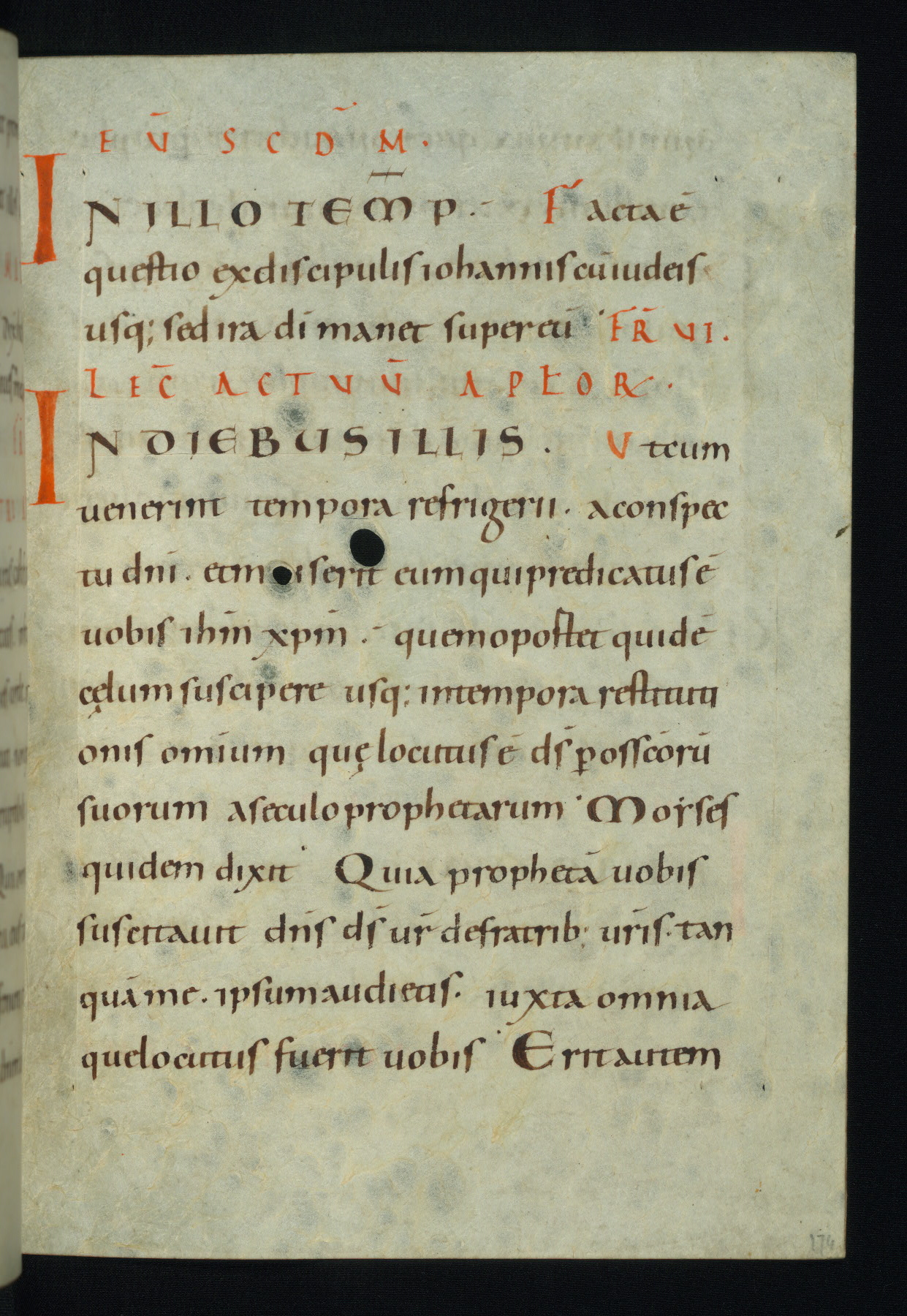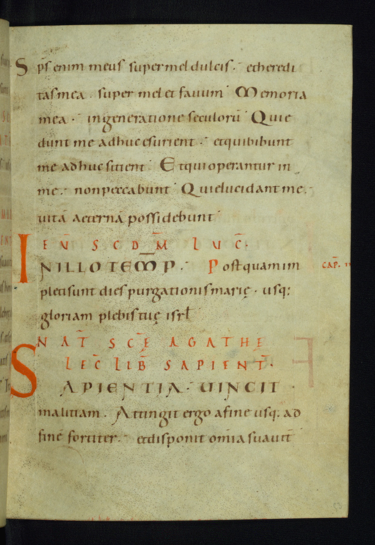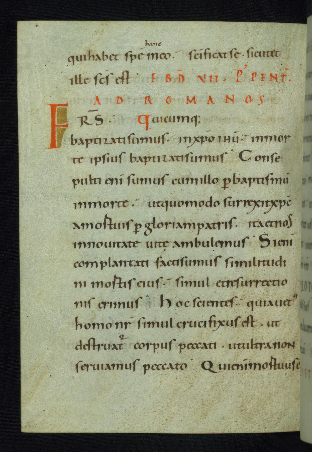 This Lectionary was created ca. 1000 in Trier. Written in a clear Caroline minuscule, it contains decorated initials at the openings of important readings. A set of illuminated letters marks the beginning of the Epistle and Gospel lessons for Easter; they display the hierarchy of scripts with capital letters decorated with gold leaf or drawn in red ink, followed by uncial and Caroline minuscule. Initials in orange, sometimes filled with gold, mark the divisions of the text. The book has been stylistically compared with Ottonian manuscripts, especially with a Psalter preserved in Trier (Stadtbibliothek, Ms. 7) illuminated by the so-called Master of the Registrum Gregorii.