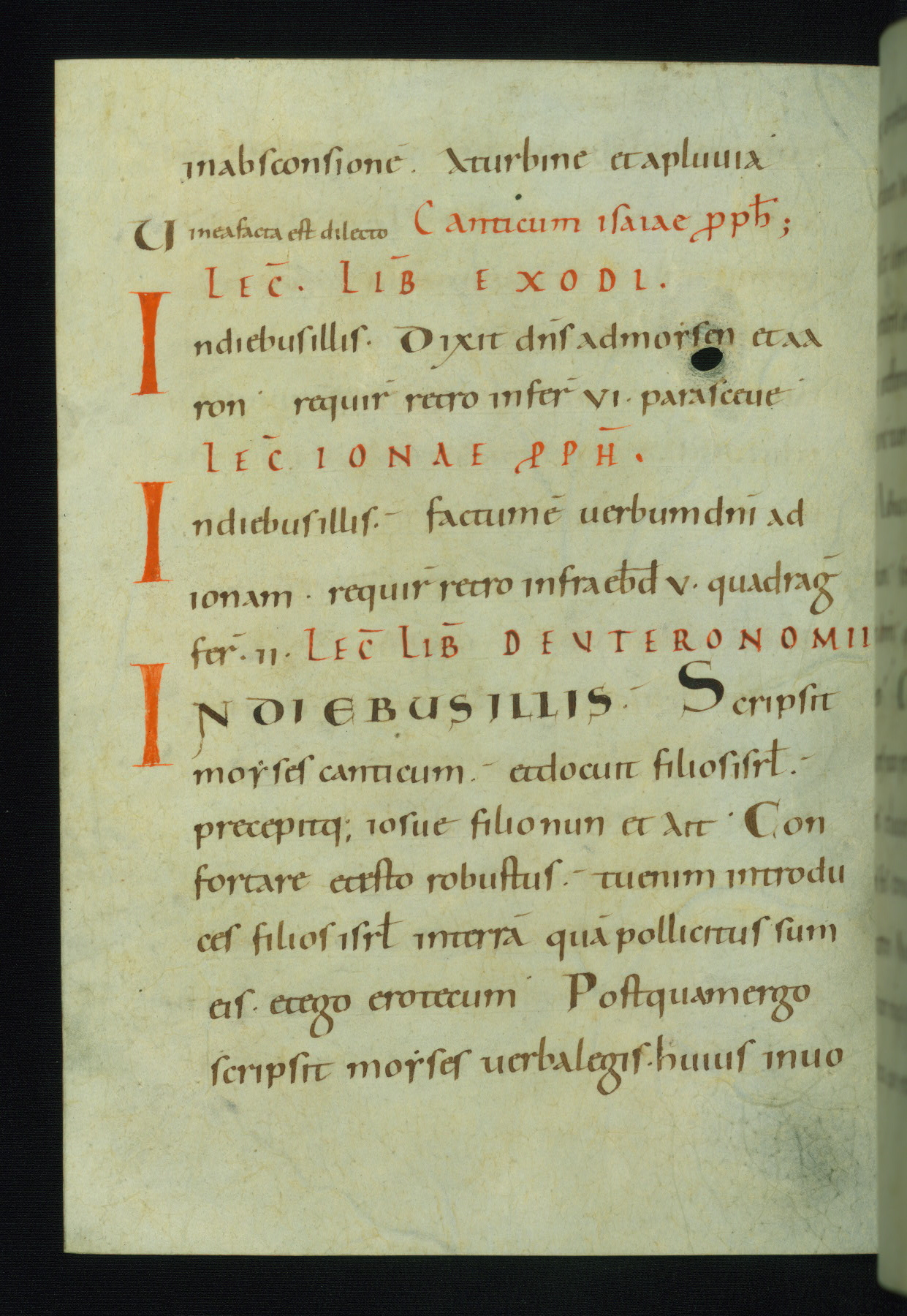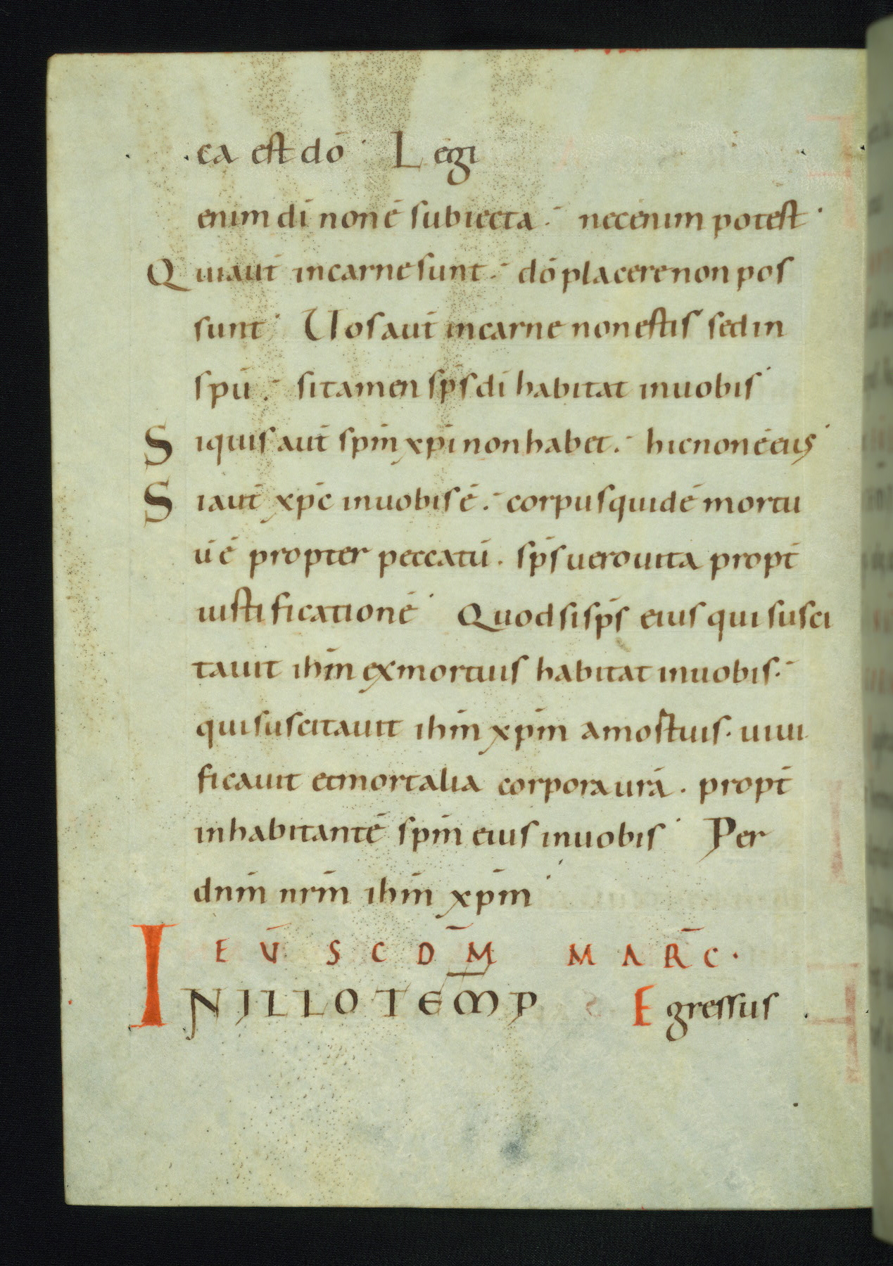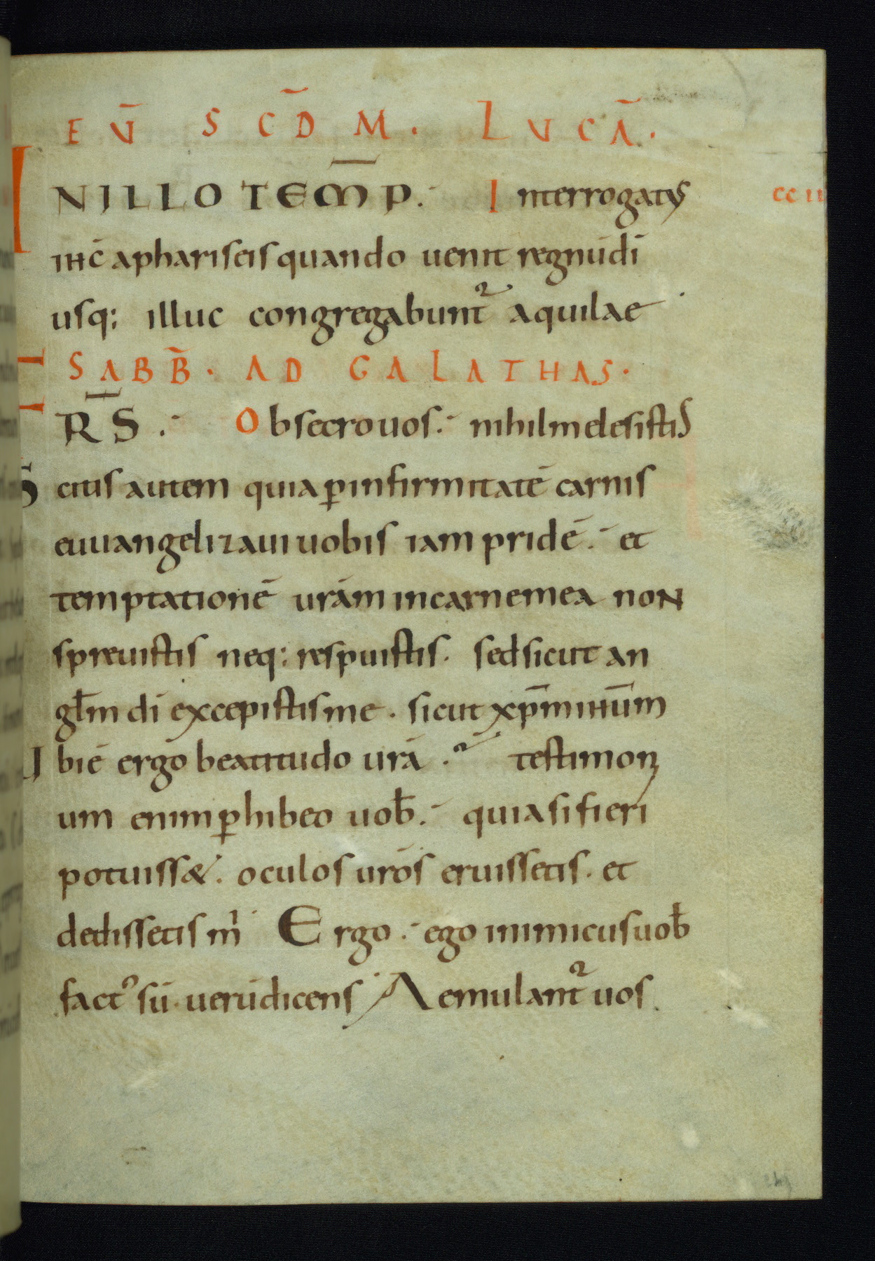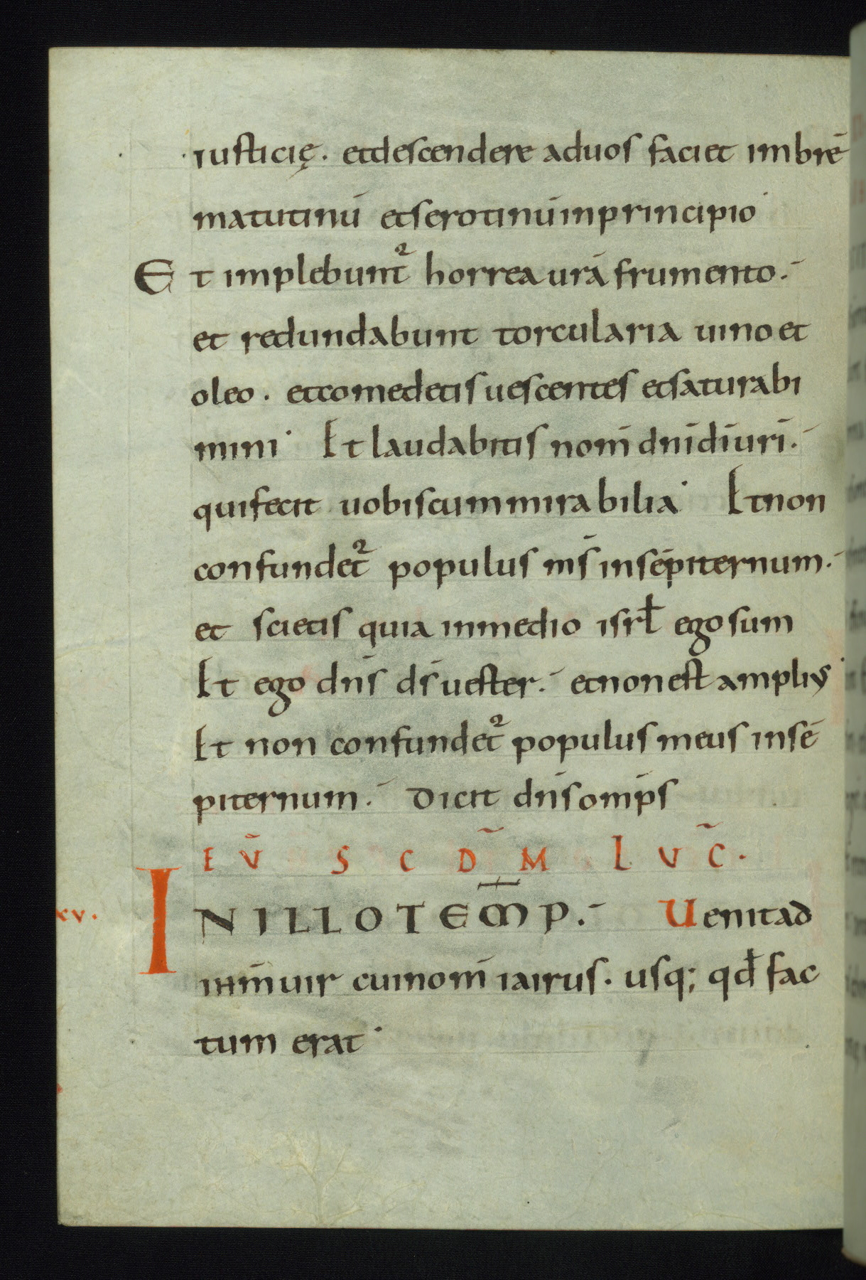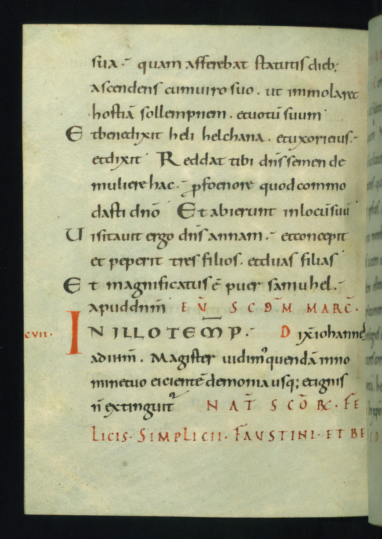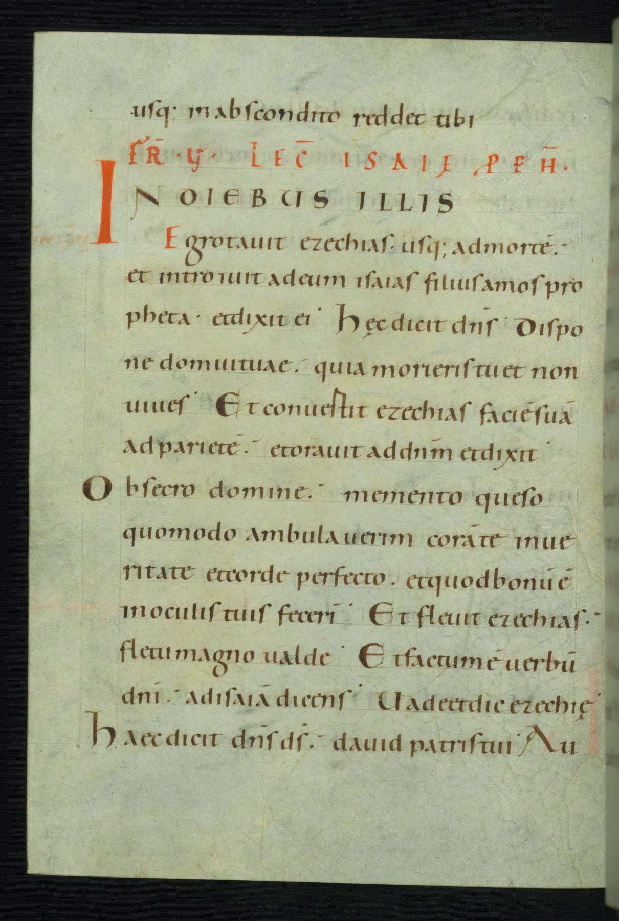 This Lectionary was created ca. 1000 in Trier. Written in a clear Caroline minuscule, it contains decorated initials at the openings of important readings. A set of illuminated letters marks the beginning of the Epistle and Gospel lessons for Easter; they display the hierarchy of scripts with capital letters decorated with gold leaf or drawn in red ink, followed by uncial and Caroline minuscule. Initials in orange, sometimes filled with gold, mark the divisions of the text. The book has been stylistically compared with Ottonian manuscripts, especially with a Psalter preserved in Trier (Stadtbibliothek, Ms. 7) illuminated by the so-called Master of the Registrum Gregorii.
