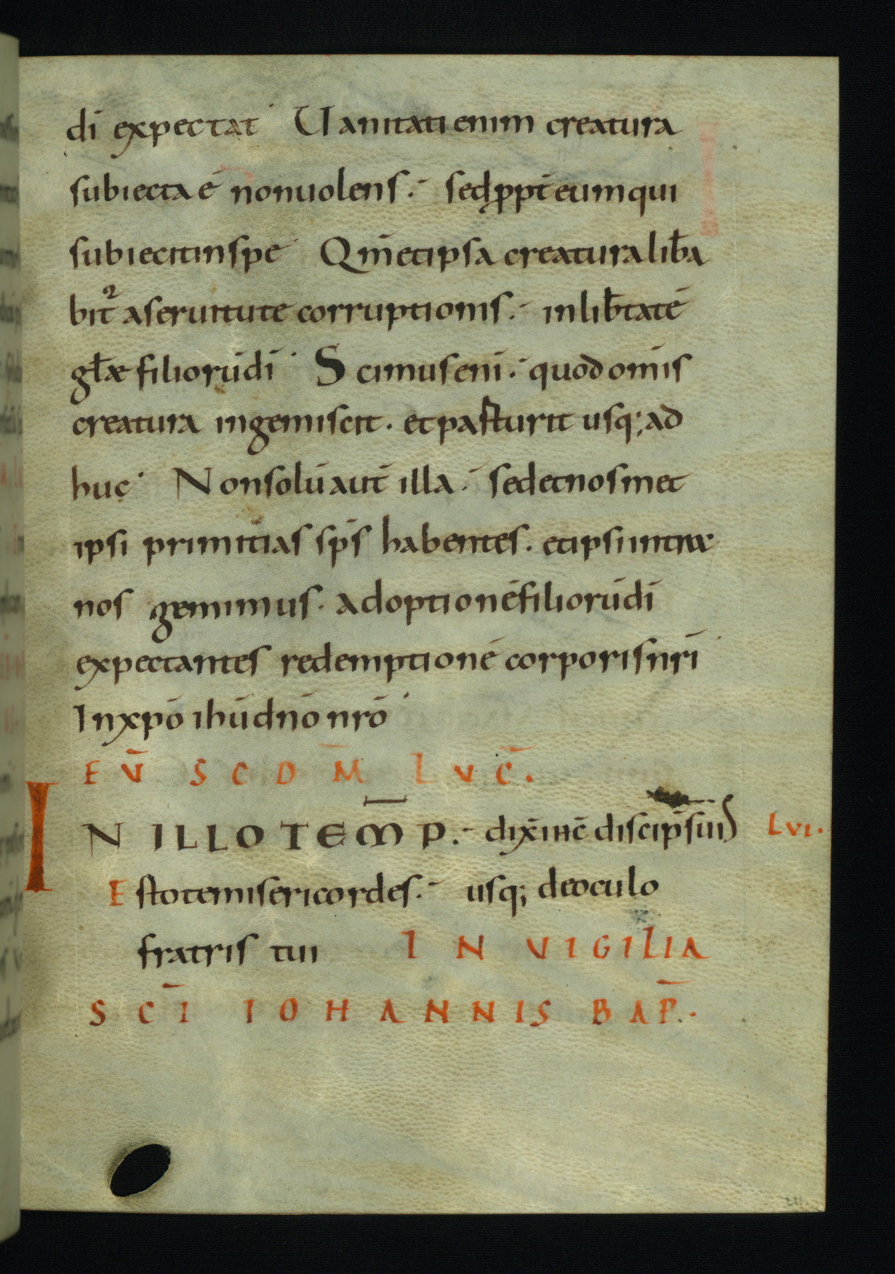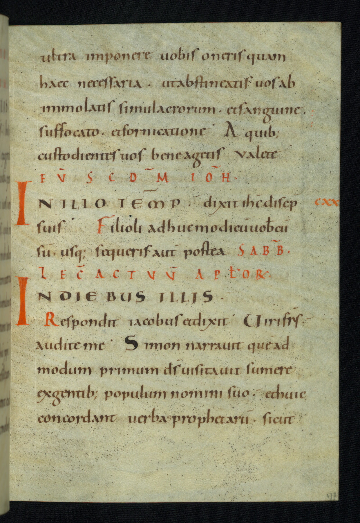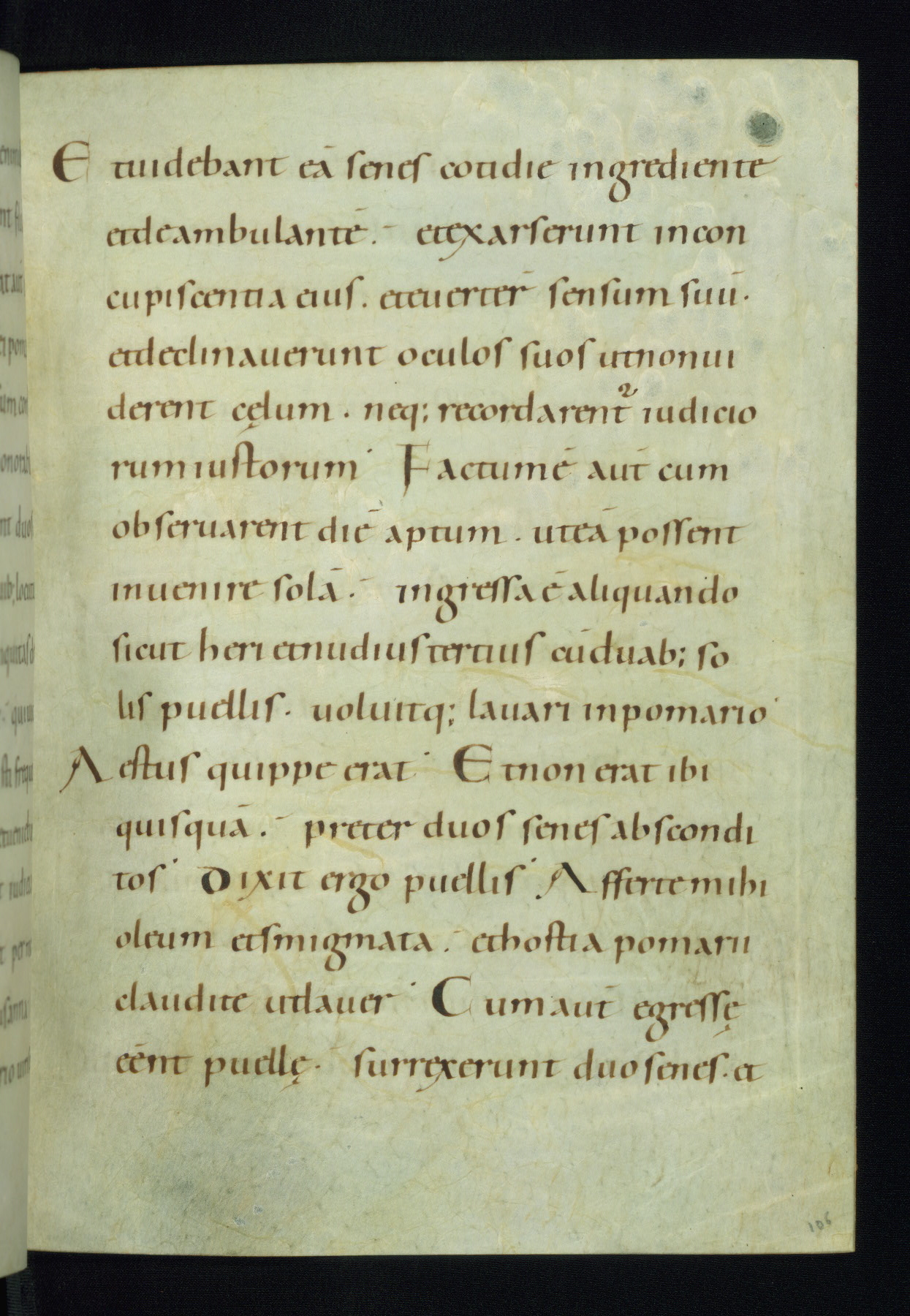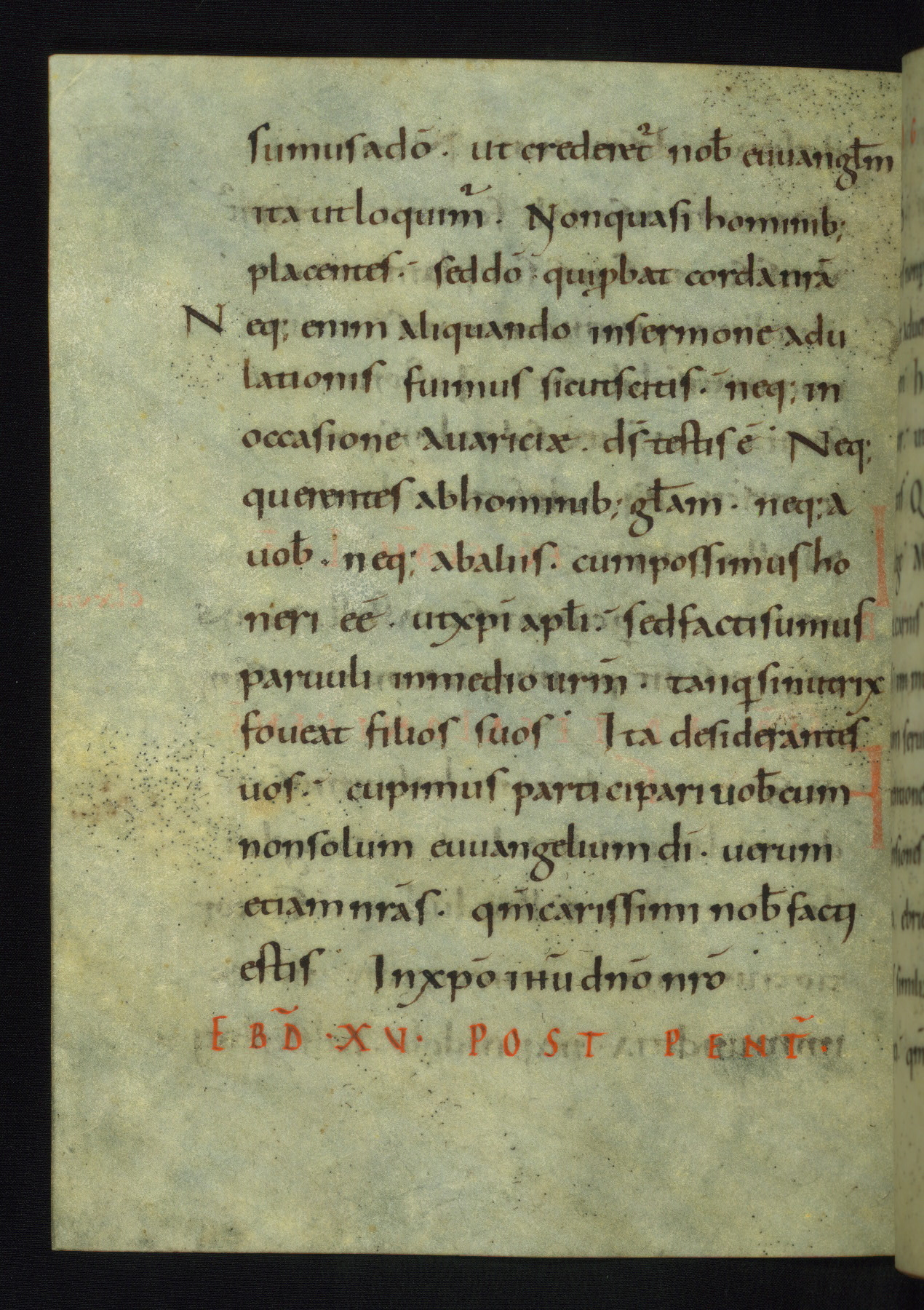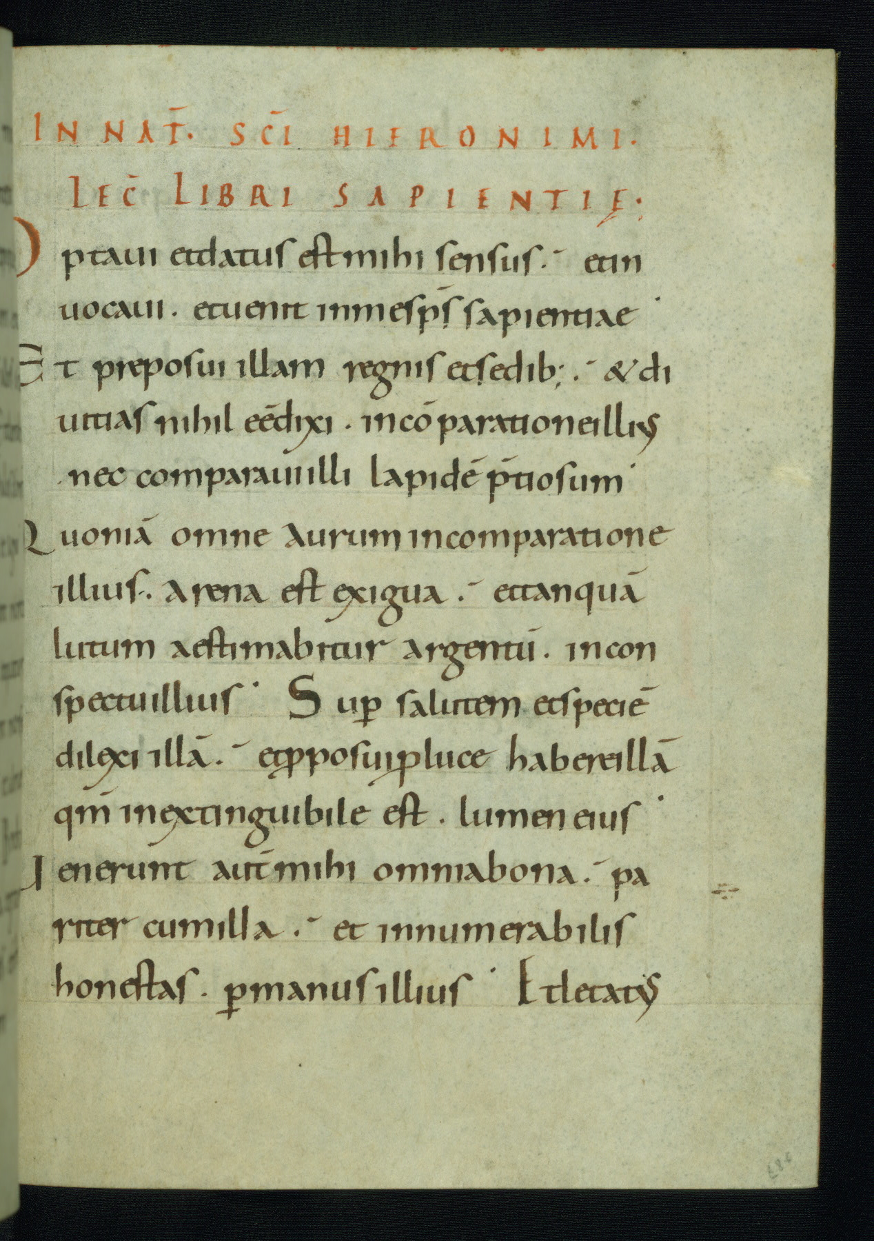This Lectionary was created ca. 1000 in Trier. Written in a clear Caroline minuscule, it contains decorated initials at the openings of important readings. A set of illuminated letters marks the beginning of the Epistle and Gospel lessons for Easter; they display the hierarchy of scripts with capital letters decorated with gold leaf or drawn in red ink, followed by uncial and Caroline minuscule. Initials in orange, sometimes filled with gold, mark the divisions of the text. The book has been stylistically compared with Ottonian manuscripts, especially with a Psalter preserved in Trier (Stadtbibliothek, Ms. 7) illuminated by the so-called Master of the Registrum Gregorii.