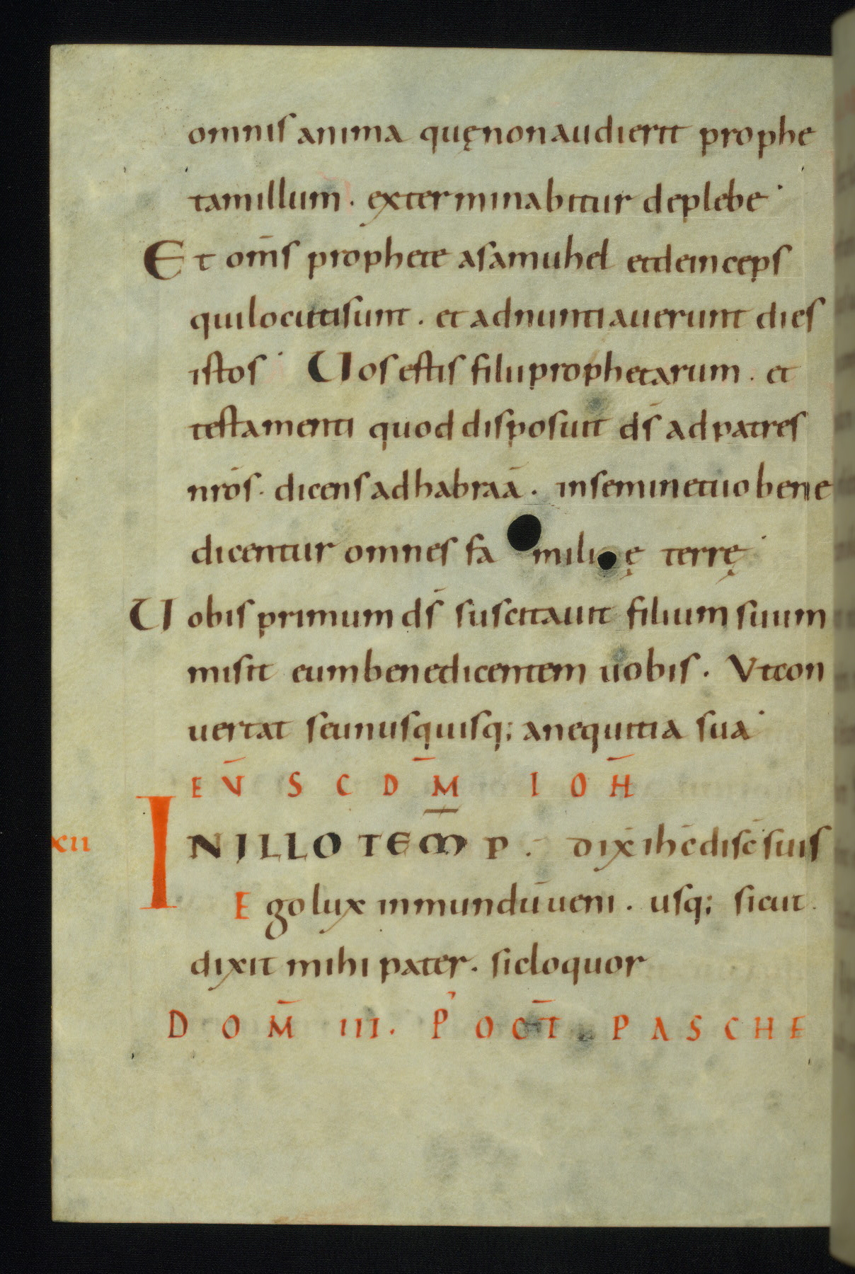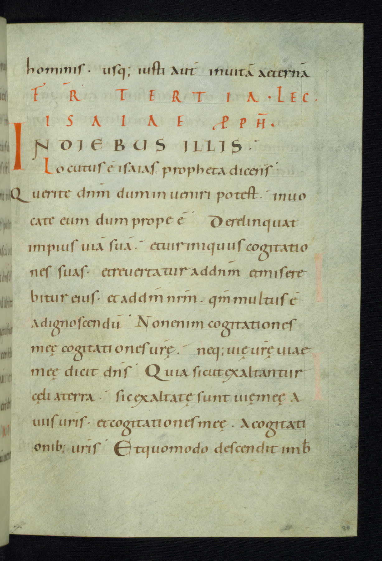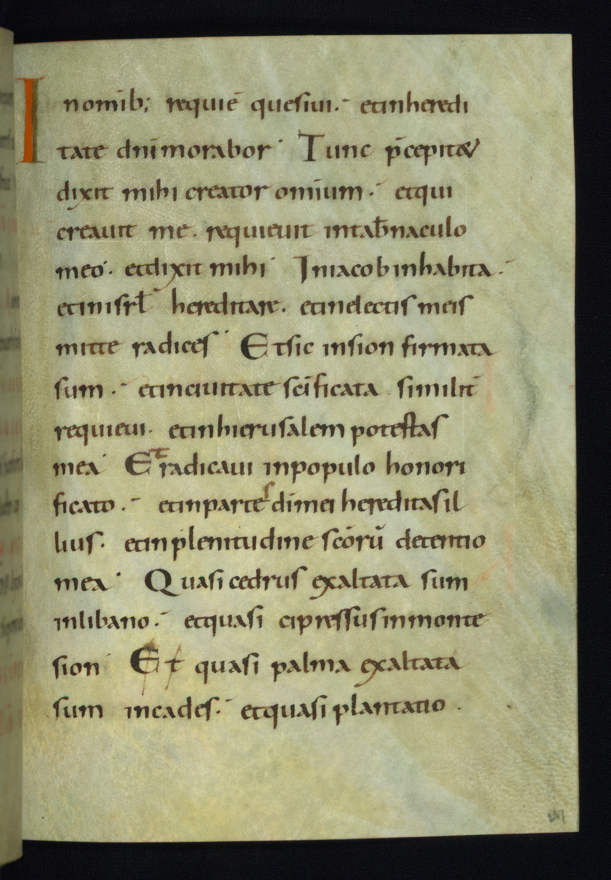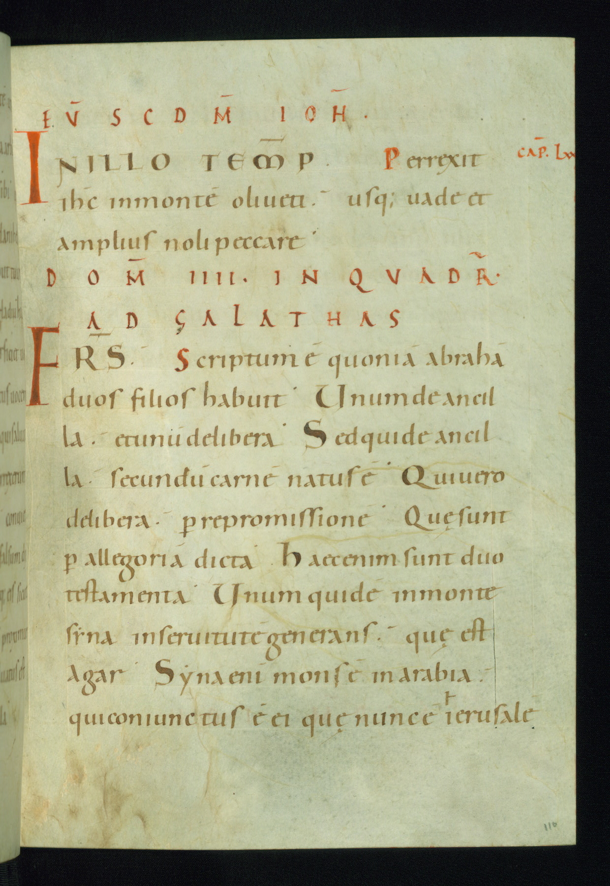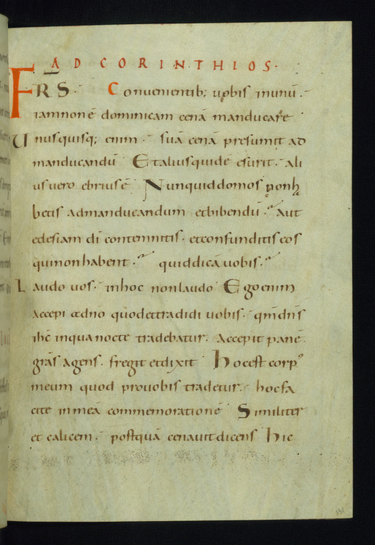 This Lectionary was created ca. 1000 in Trier. Written in a clear Caroline minuscule, it contains decorated initials at the openings of important readings. A set of illuminated letters marks the beginning of the Epistle and Gospel lessons for Easter; they display the hierarchy of scripts with capital letters decorated with gold leaf or drawn in red ink, followed by uncial and Caroline minuscule. Initials in orange, sometimes filled with gold, mark the divisions of the text. The book has been stylistically compared with Ottonian manuscripts, especially with a Psalter preserved in Trier (Stadtbibliothek, Ms. 7) illuminated by the so-called Master of the Registrum Gregorii.