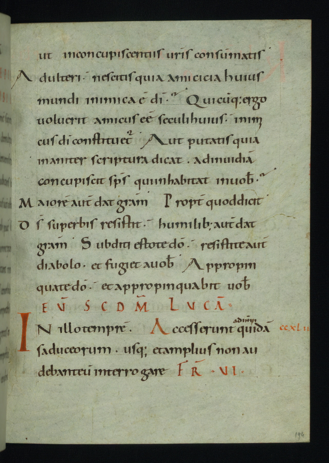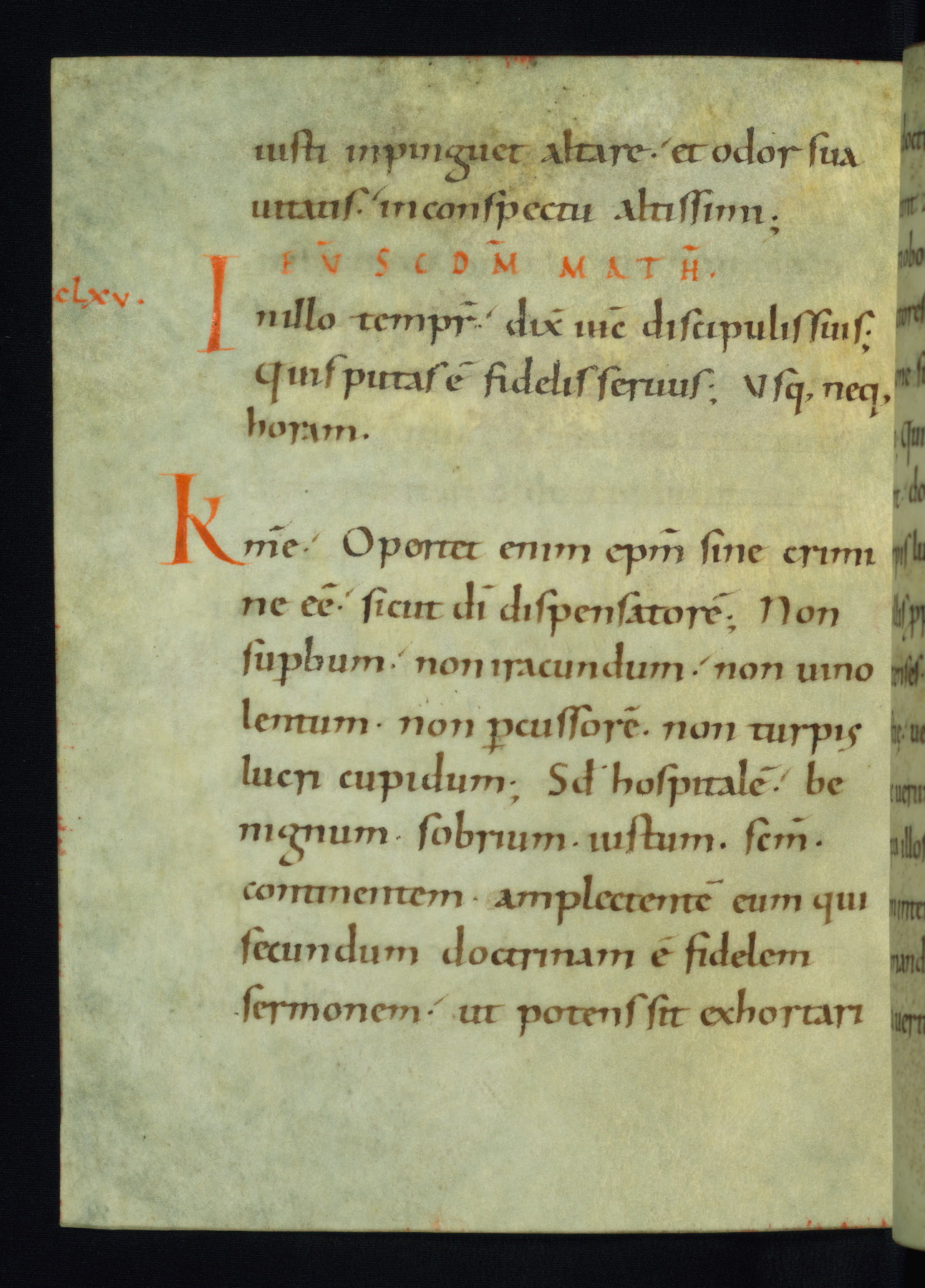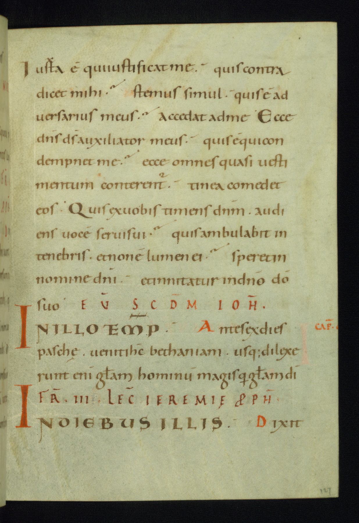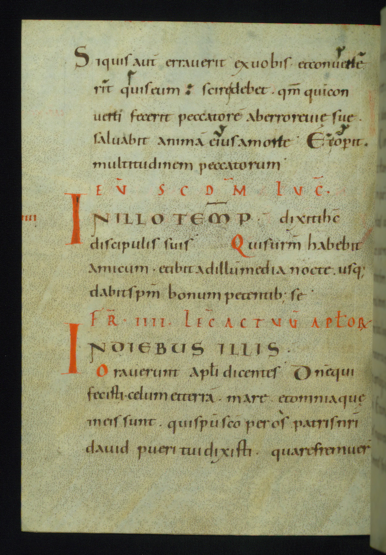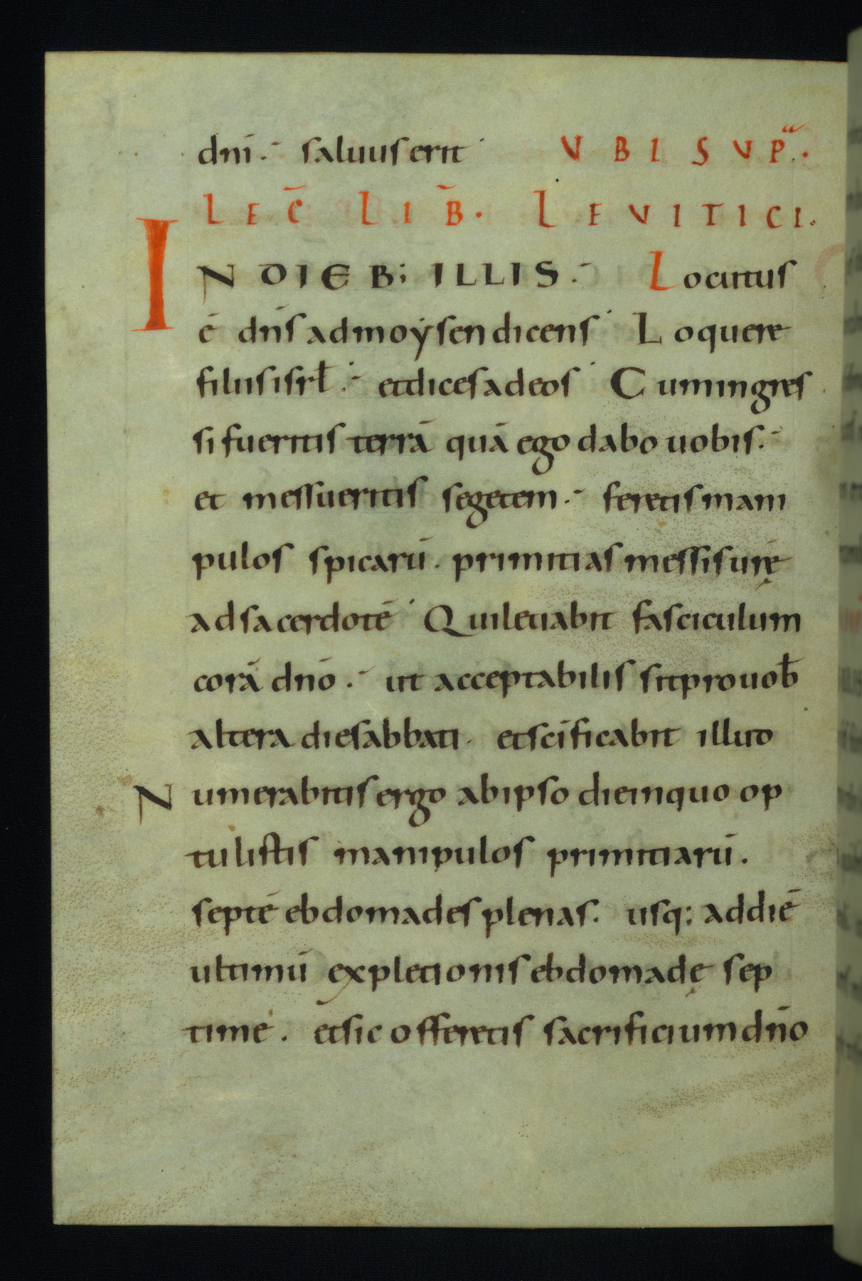 This Lectionary was created ca. 1000 in Trier. Written in a clear Caroline minuscule, it contains decorated initials at the openings of important readings. A set of illuminated letters marks the beginning of the Epistle and Gospel lessons for Easter; they display the hierarchy of scripts with capital letters decorated with gold leaf or drawn in red ink, followed by uncial and Caroline minuscule. Initials in orange, sometimes filled with gold, mark the divisions of the text. The book has been stylistically compared with Ottonian manuscripts, especially with a Psalter preserved in Trier (Stadtbibliothek, Ms. 7) illuminated by the so-called Master of the Registrum Gregorii.