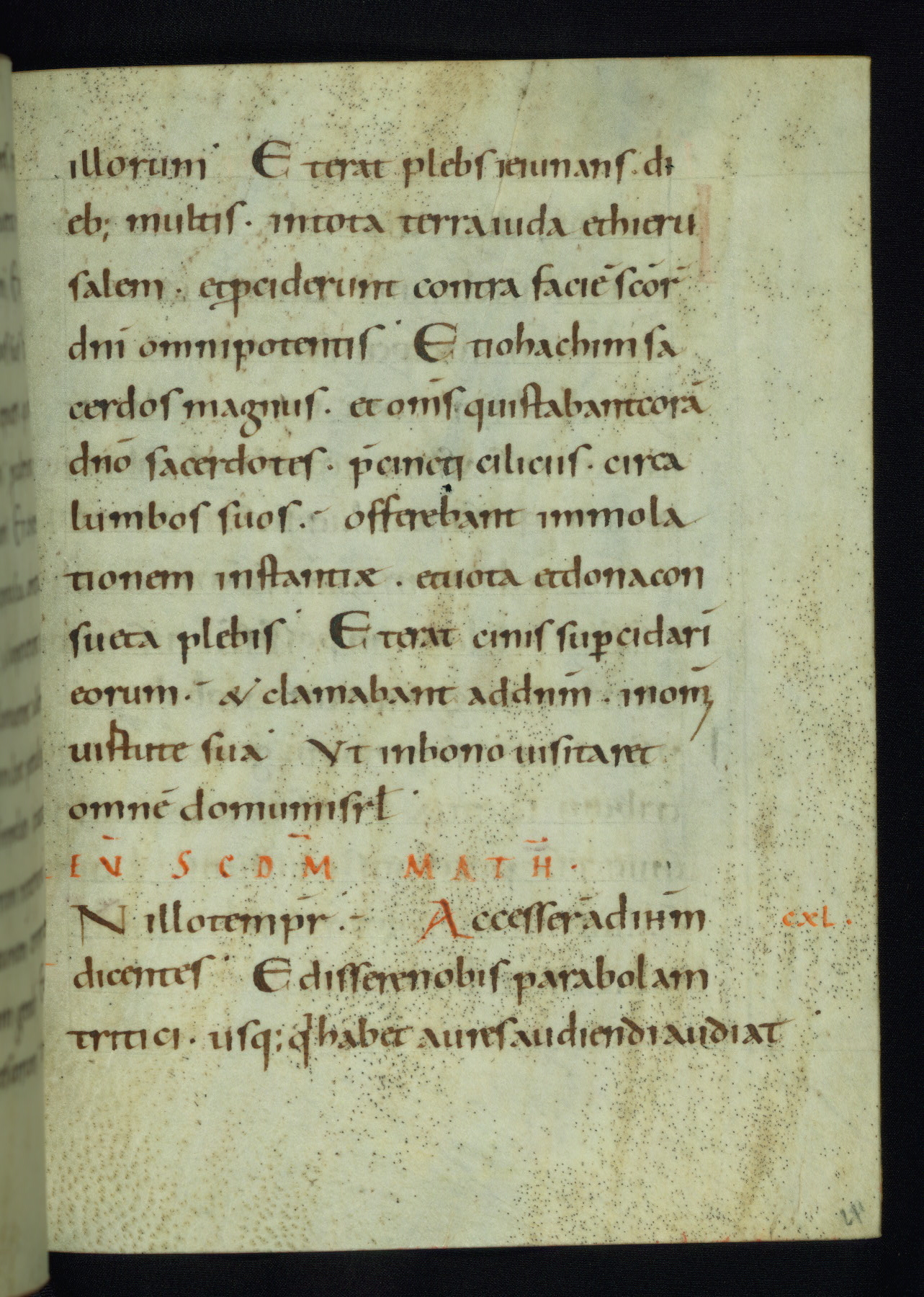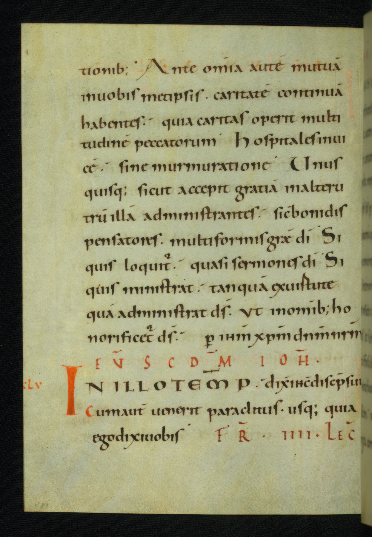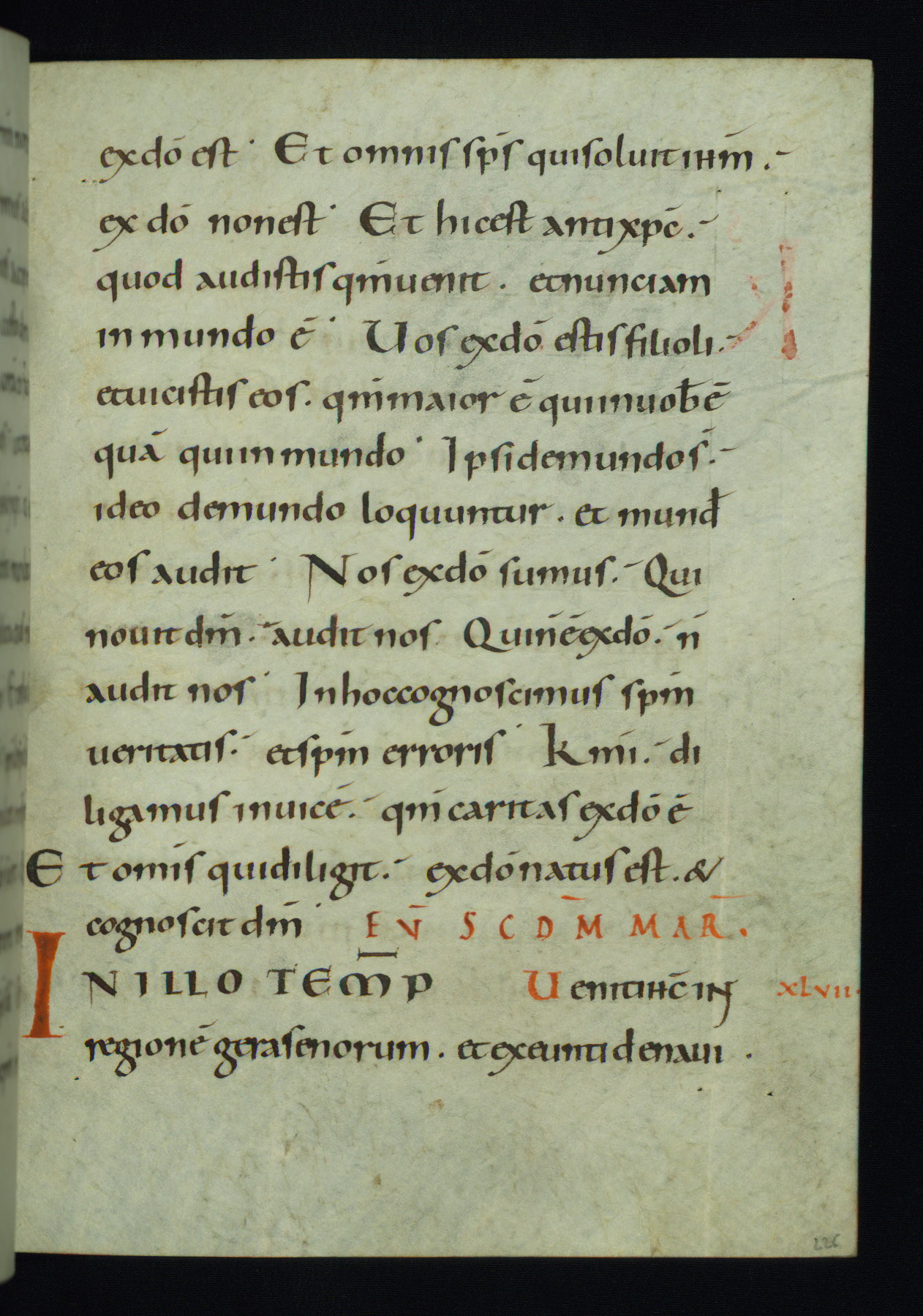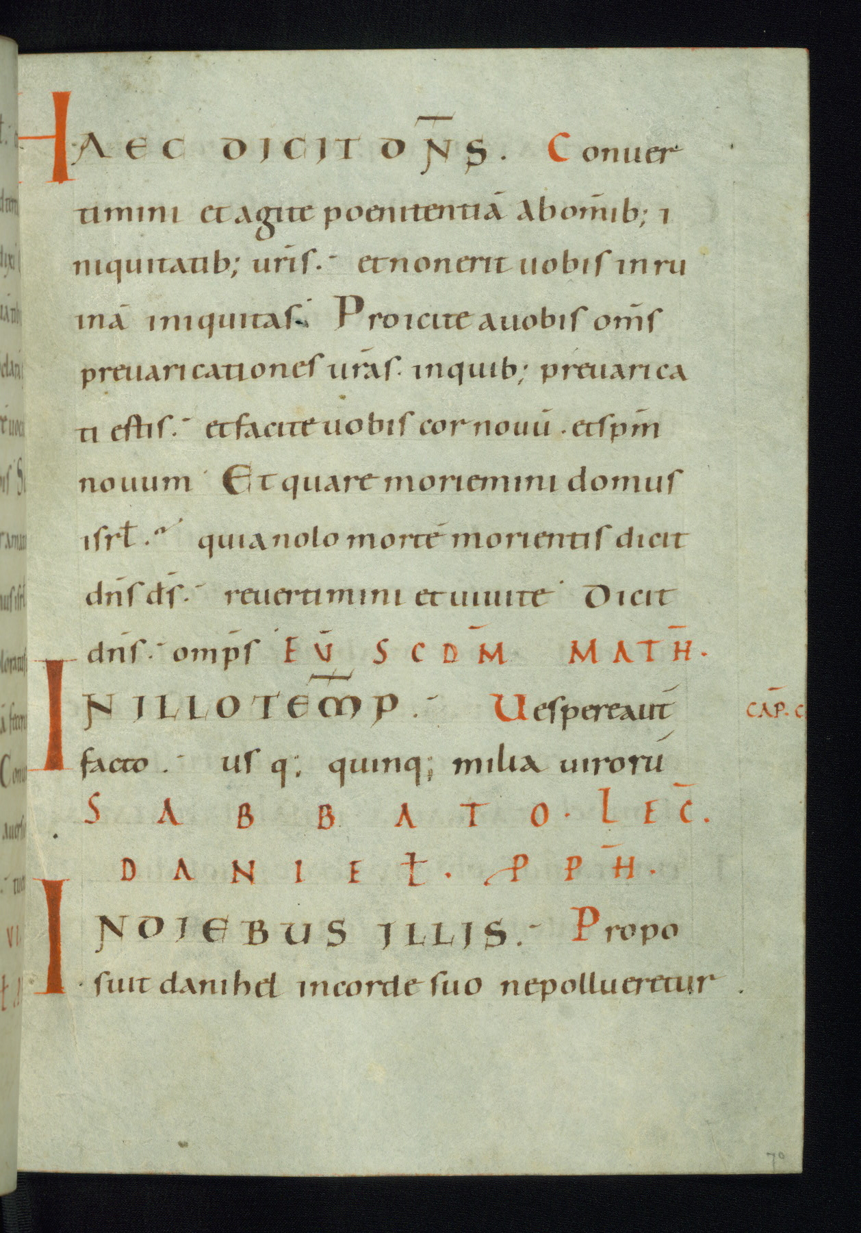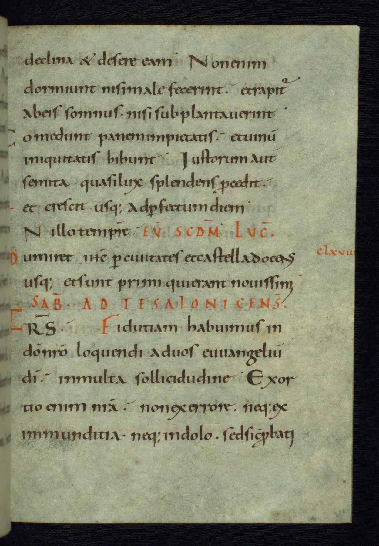This Lectionary was created ca. 1000 in Trier. Written in a clear Caroline minuscule, it contains decorated initials at the openings of important readings. A set of illuminated letters marks the beginning of the Epistle and Gospel lessons for Easter; they display the hierarchy of scripts with capital letters decorated with gold leaf or drawn in red ink, followed by uncial and Caroline minuscule. Initials in orange, sometimes filled with gold, mark the divisions of the text. The book has been stylistically compared with Ottonian manuscripts, especially with a Psalter preserved in Trier (Stadtbibliothek, Ms. 7) illuminated by the so-called Master of the Registrum Gregorii.