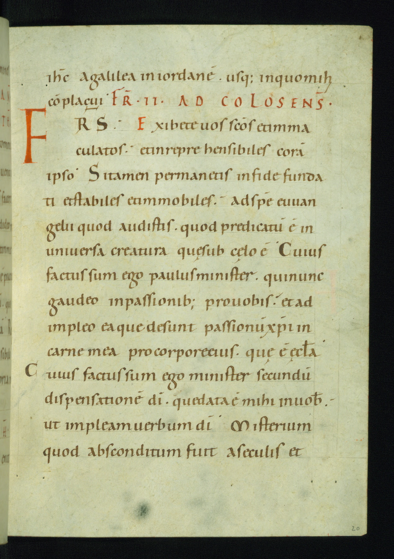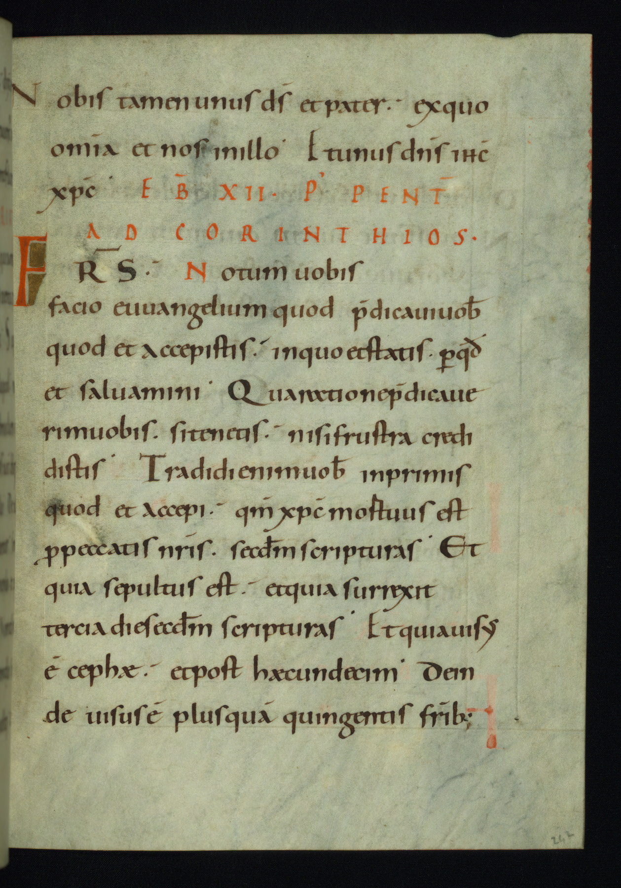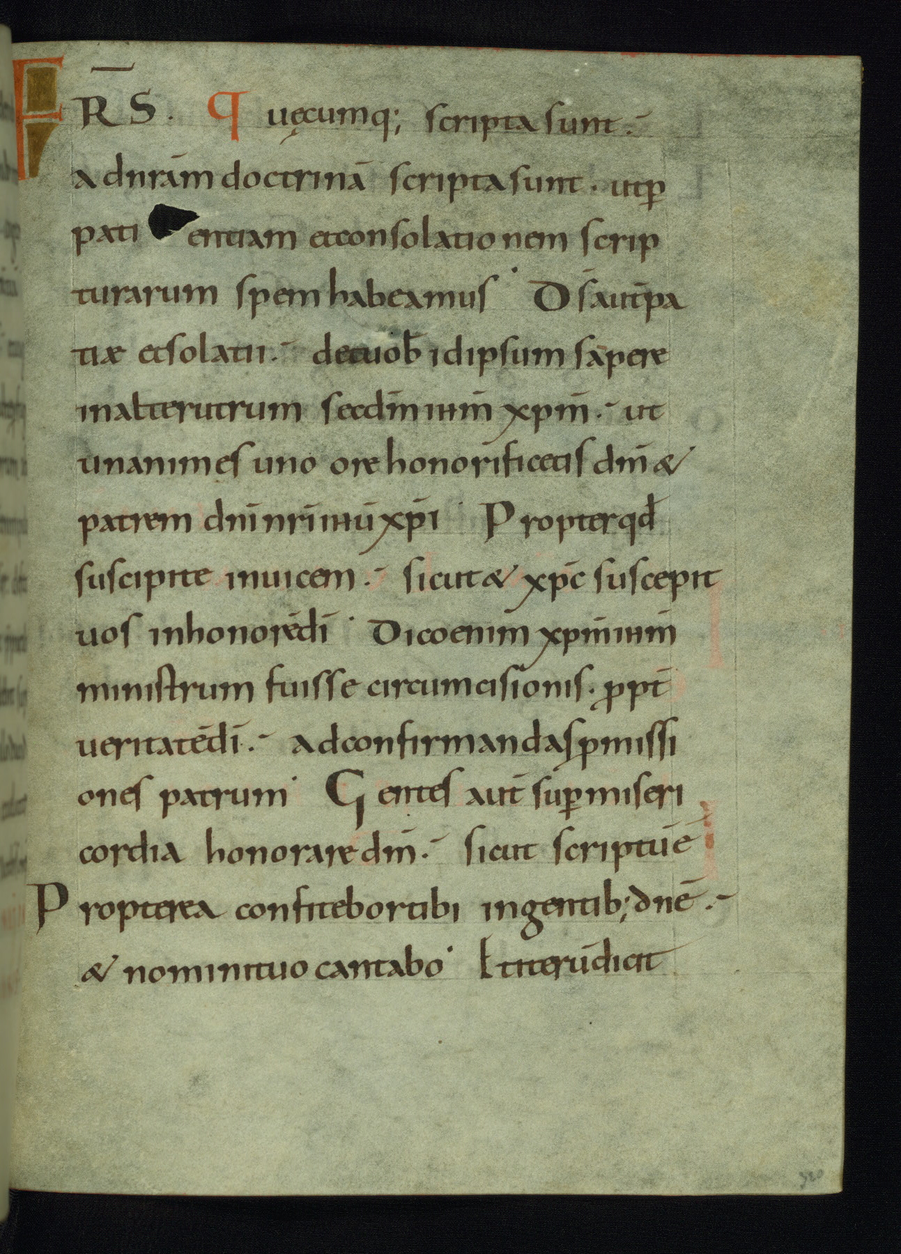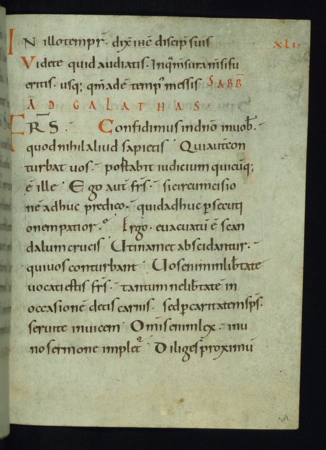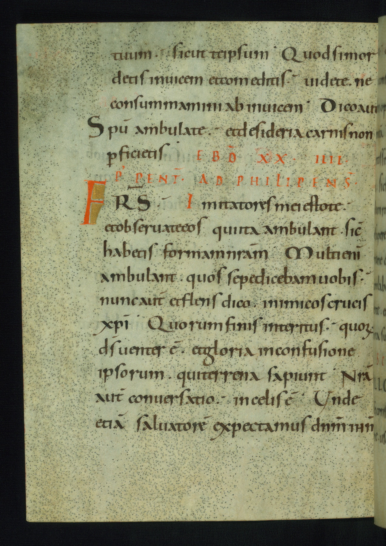 This Lectionary was created ca. 1000 in Trier. Written in a clear Caroline minuscule, it contains decorated initials at the openings of important readings. A set of illuminated letters marks the beginning of the Epistle and Gospel lessons for Easter; they display the hierarchy of scripts with capital letters decorated with gold leaf or drawn in red ink, followed by uncial and Caroline minuscule. Initials in orange, sometimes filled with gold, mark the divisions of the text. The book has been stylistically compared with Ottonian manuscripts, especially with a Psalter preserved in Trier (Stadtbibliothek, Ms. 7) illuminated by the so-called Master of the Registrum Gregorii.