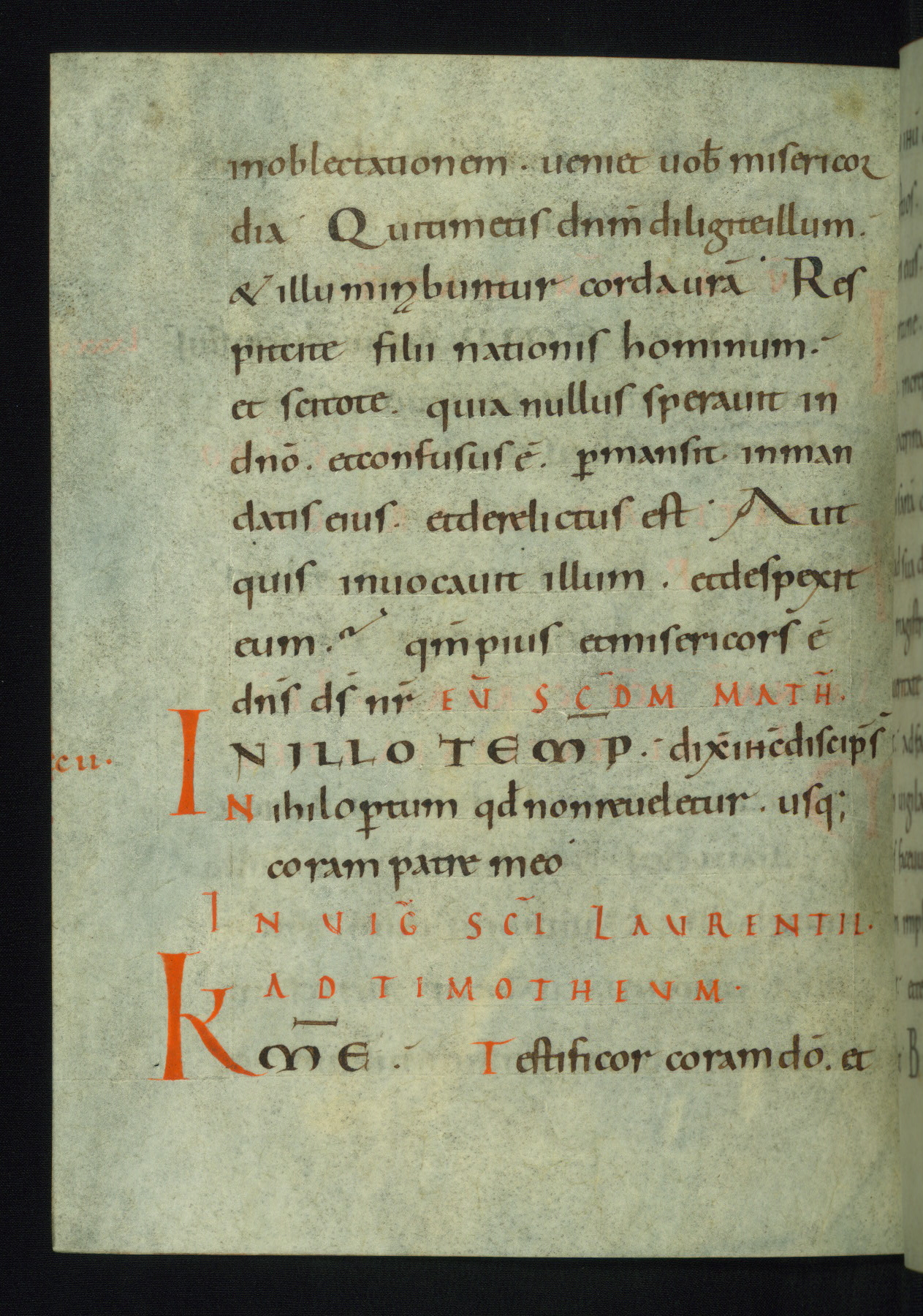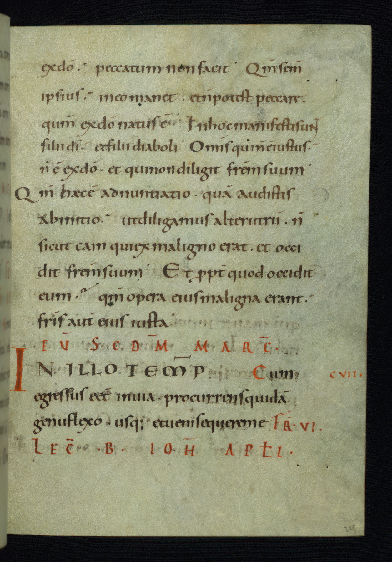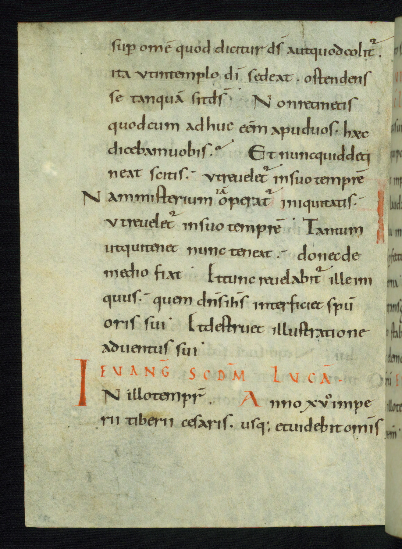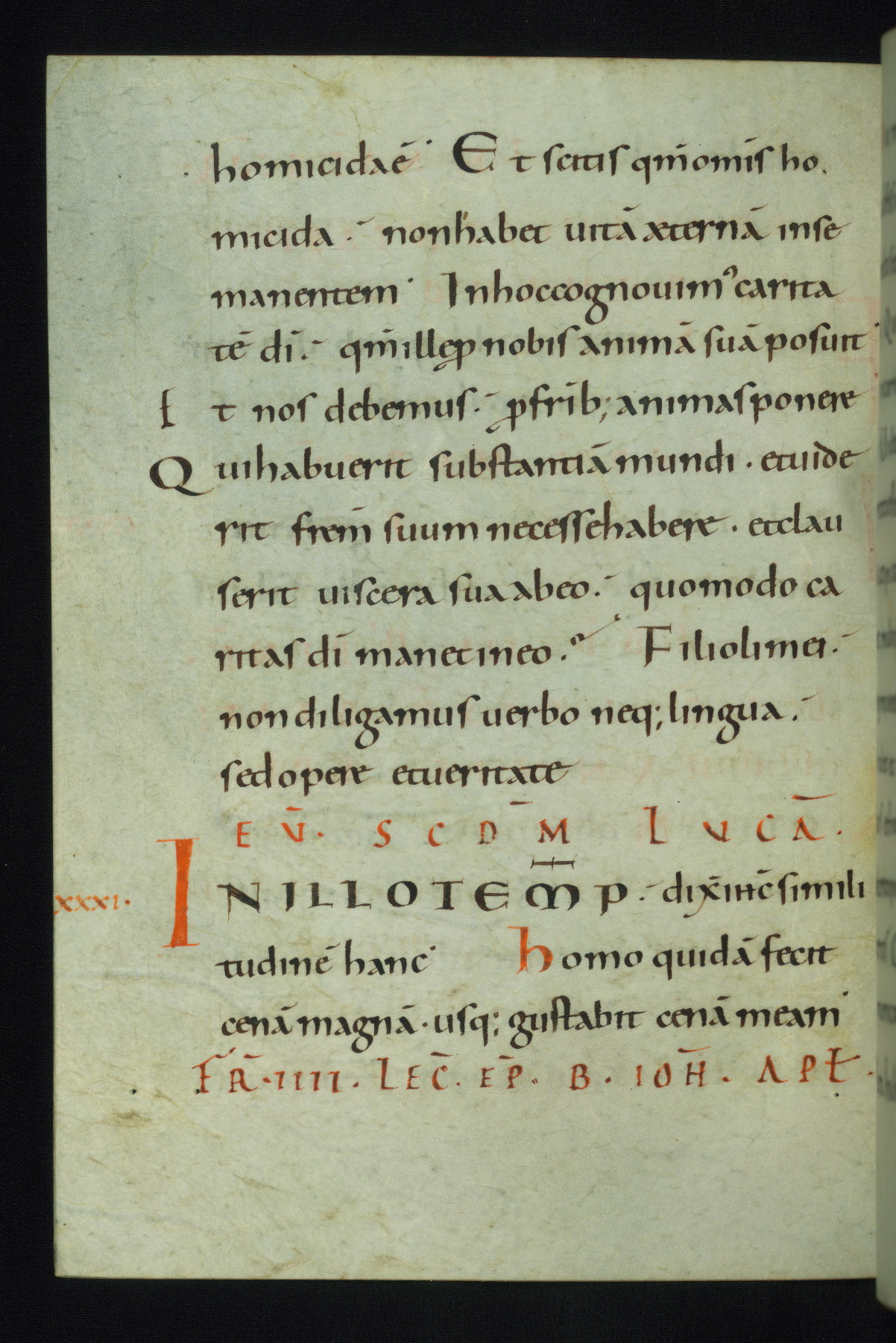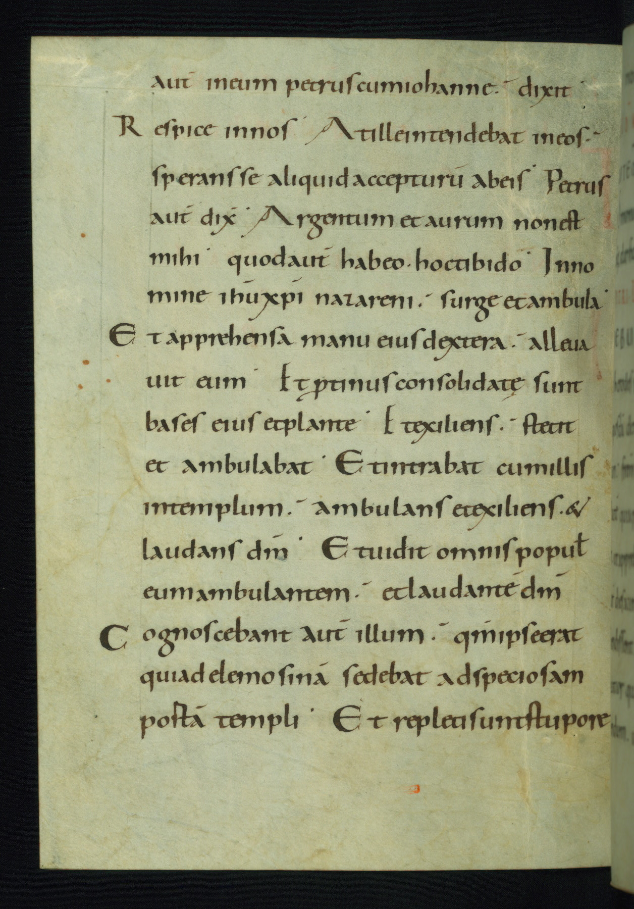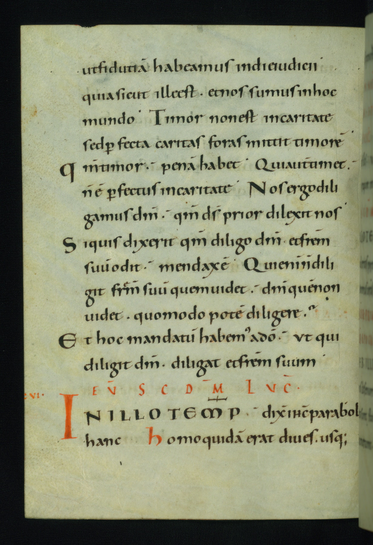 This Lectionary was created ca. 1000 in Trier. Written in a clear Caroline minuscule, it contains decorated initials at the openings of important readings. A set of illuminated letters marks the beginning of the Epistle and Gospel lessons for Easter; they display the hierarchy of scripts with capital letters decorated with gold leaf or drawn in red ink, followed by uncial and Caroline minuscule. Initials in orange, sometimes filled with gold, mark the divisions of the text. The book has been stylistically compared with Ottonian manuscripts, especially with a Psalter preserved in Trier (Stadtbibliothek, Ms. 7) illuminated by the so-called Master of the Registrum Gregorii.