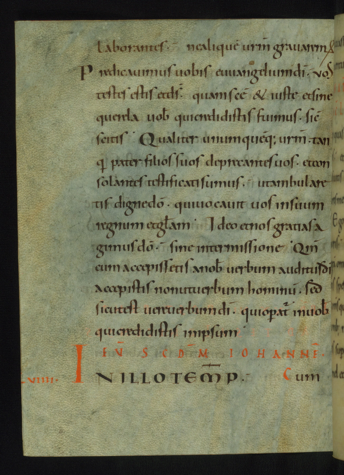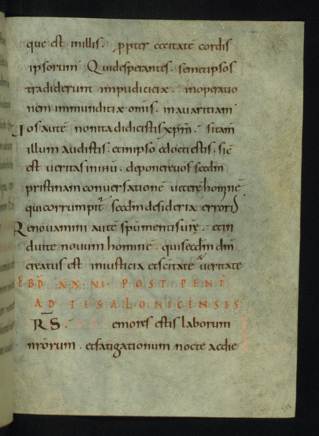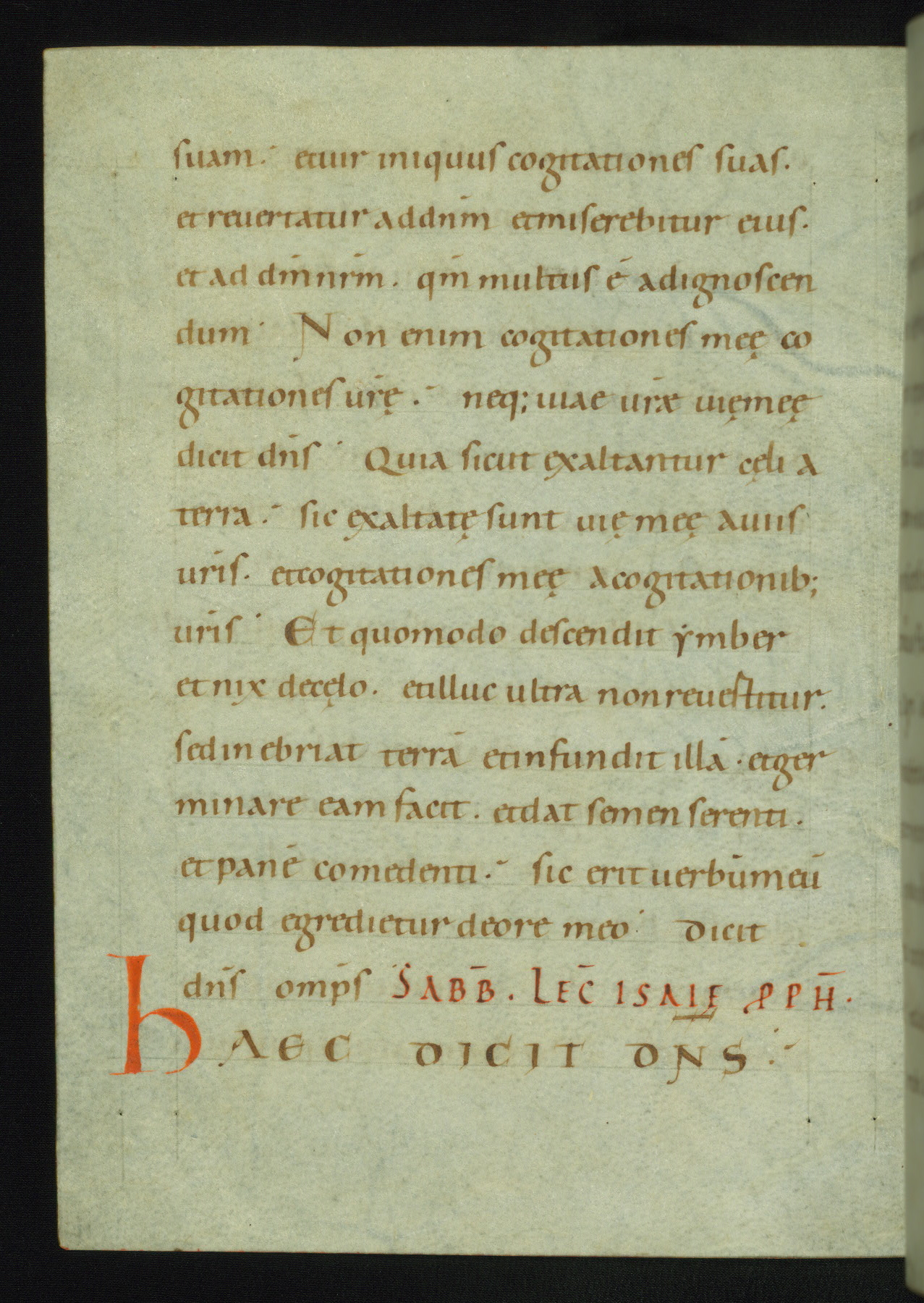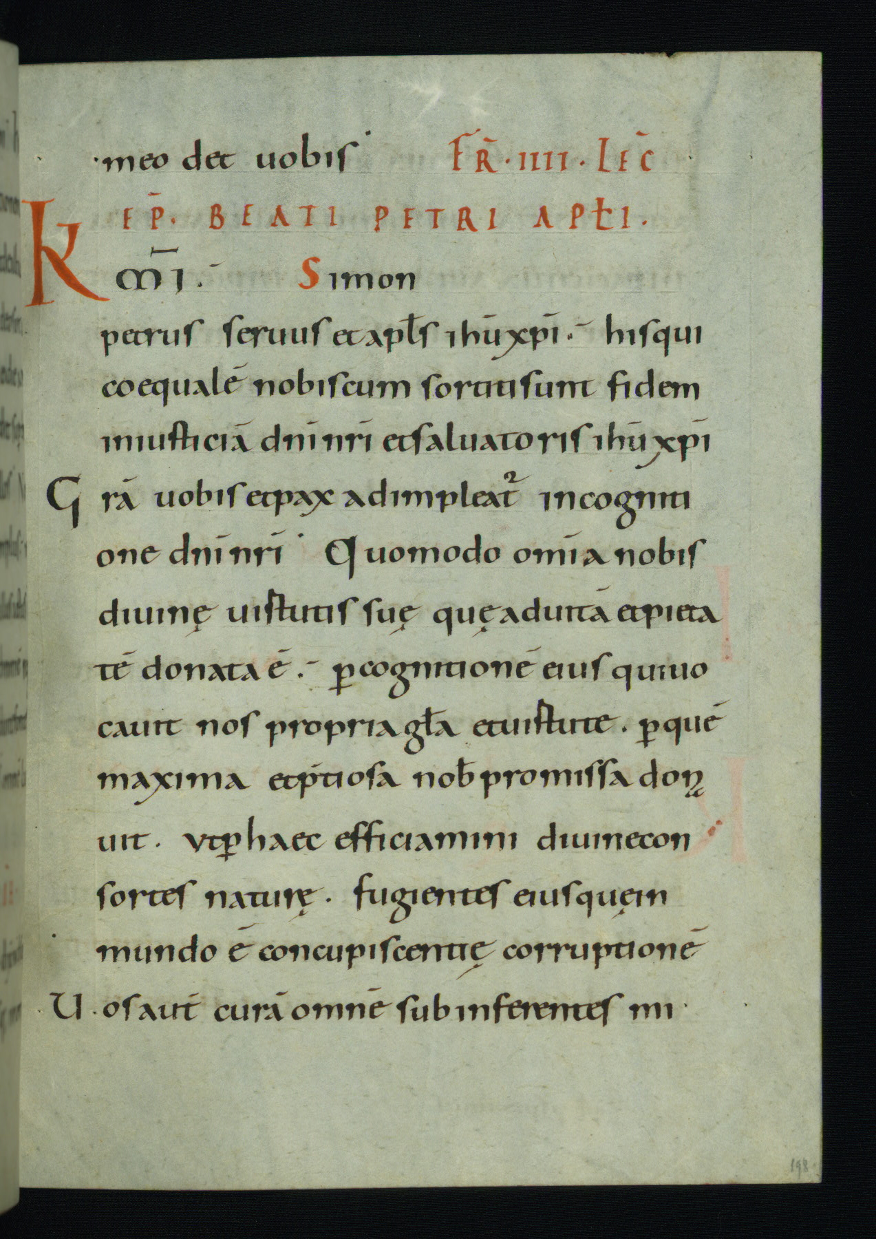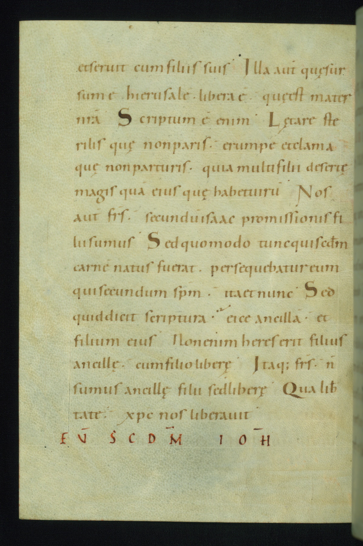 This Lectionary was created ca. 1000 in Trier. Written in a clear Caroline minuscule, it contains decorated initials at the openings of important readings. A set of illuminated letters marks the beginning of the Epistle and Gospel lessons for Easter; they display the hierarchy of scripts with capital letters decorated with gold leaf or drawn in red ink, followed by uncial and Caroline minuscule. Initials in orange, sometimes filled with gold, mark the divisions of the text. The book has been stylistically compared with Ottonian manuscripts, especially with a Psalter preserved in Trier (Stadtbibliothek, Ms. 7) illuminated by the so-called Master of the Registrum Gregorii.