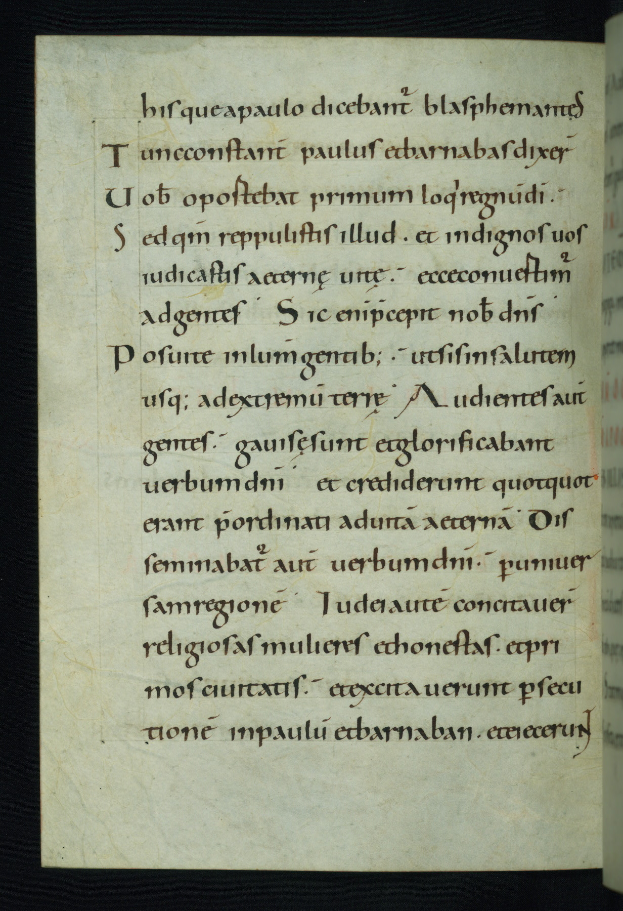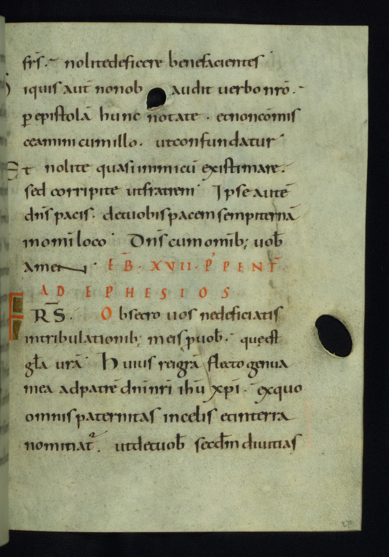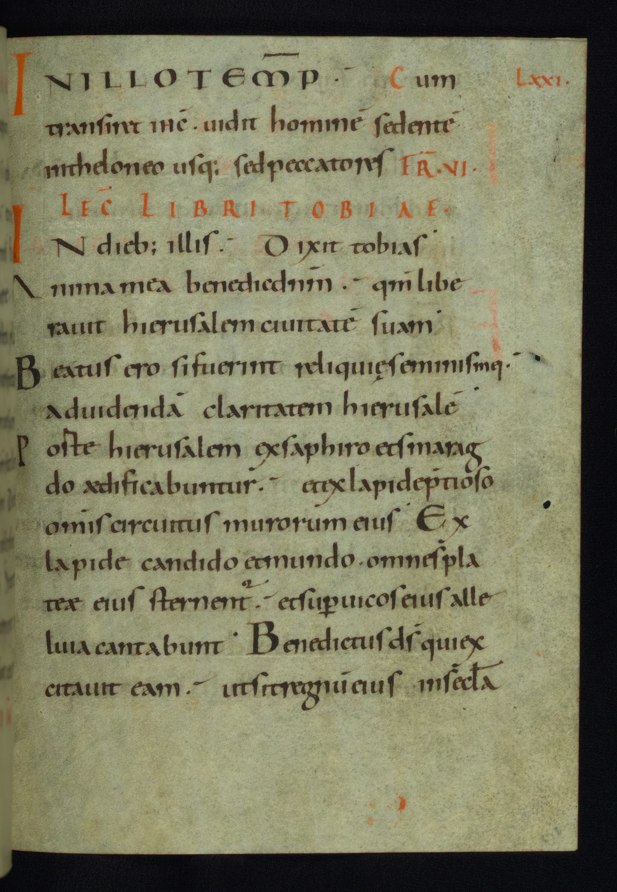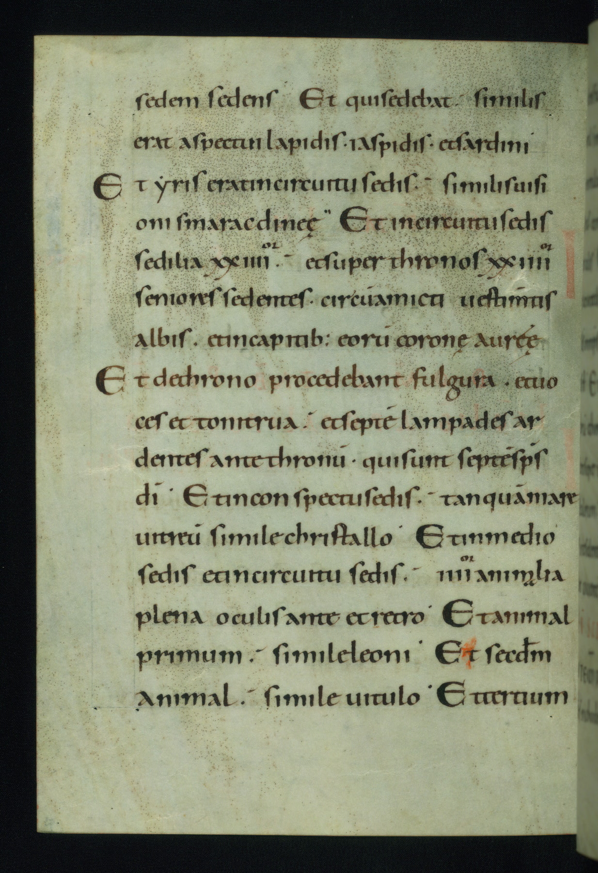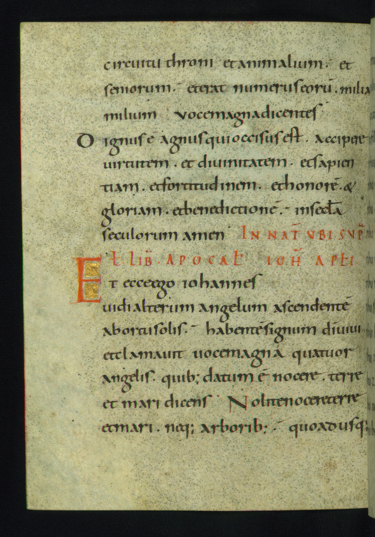 This Lectionary was created ca. 1000 in Trier. Written in a clear Caroline minuscule, it contains decorated initials at the openings of important readings. A set of illuminated letters marks the beginning of the Epistle and Gospel lessons for Easter; they display the hierarchy of scripts with capital letters decorated with gold leaf or drawn in red ink, followed by uncial and Caroline minuscule. Initials in orange, sometimes filled with gold, mark the divisions of the text. The book has been stylistically compared with Ottonian manuscripts, especially with a Psalter preserved in Trier (Stadtbibliothek, Ms. 7) illuminated by the so-called Master of the Registrum Gregorii.