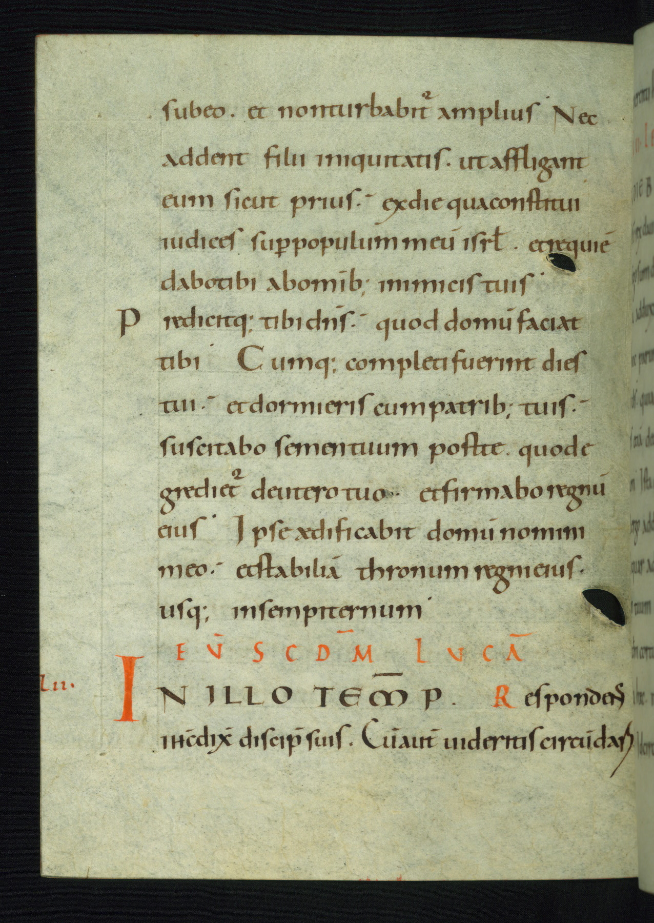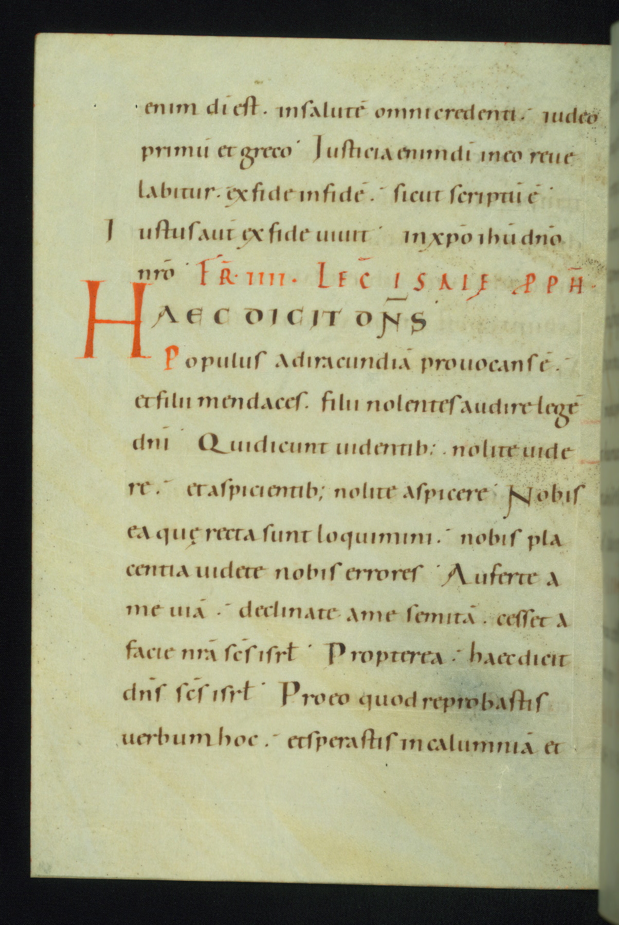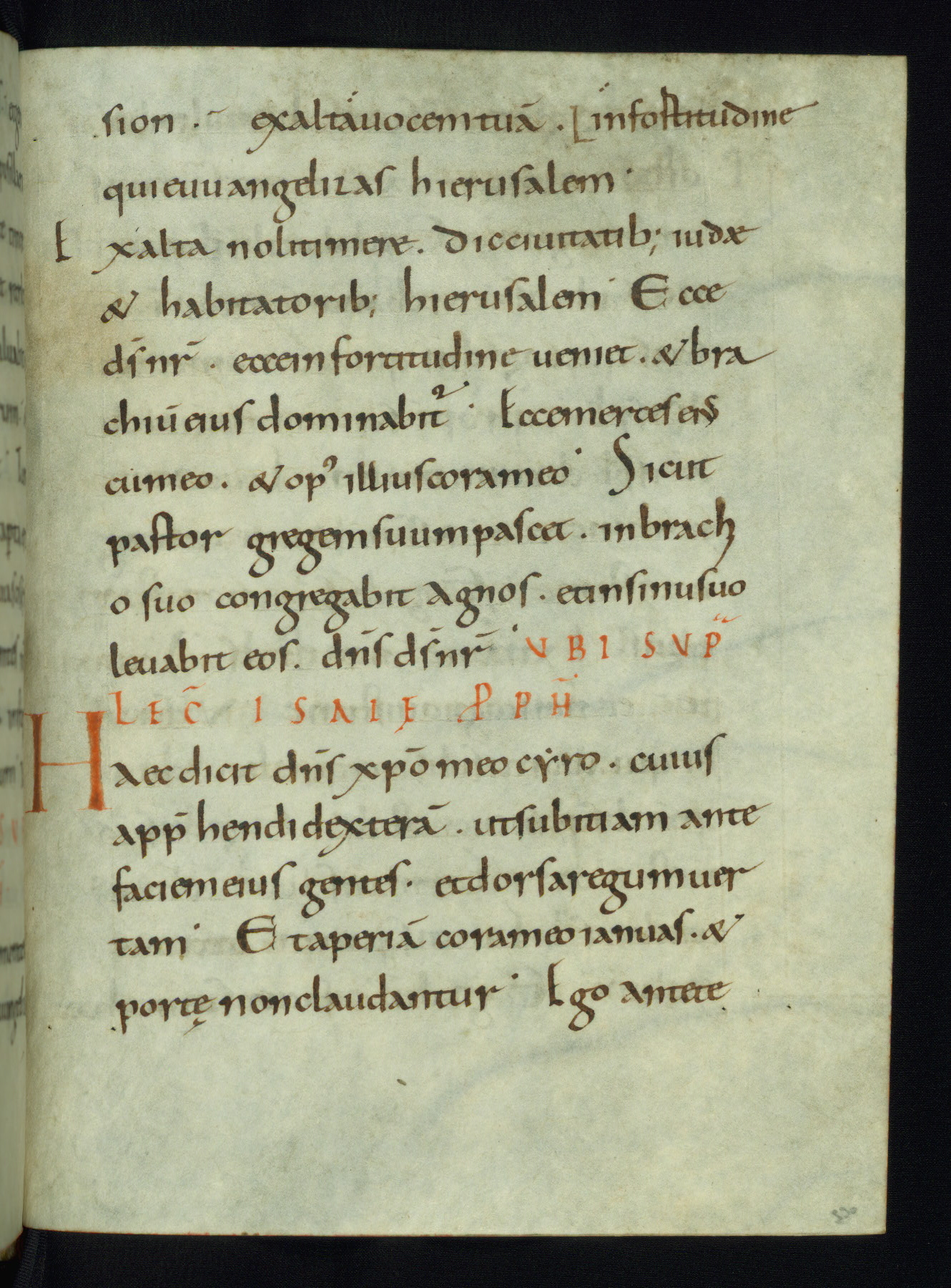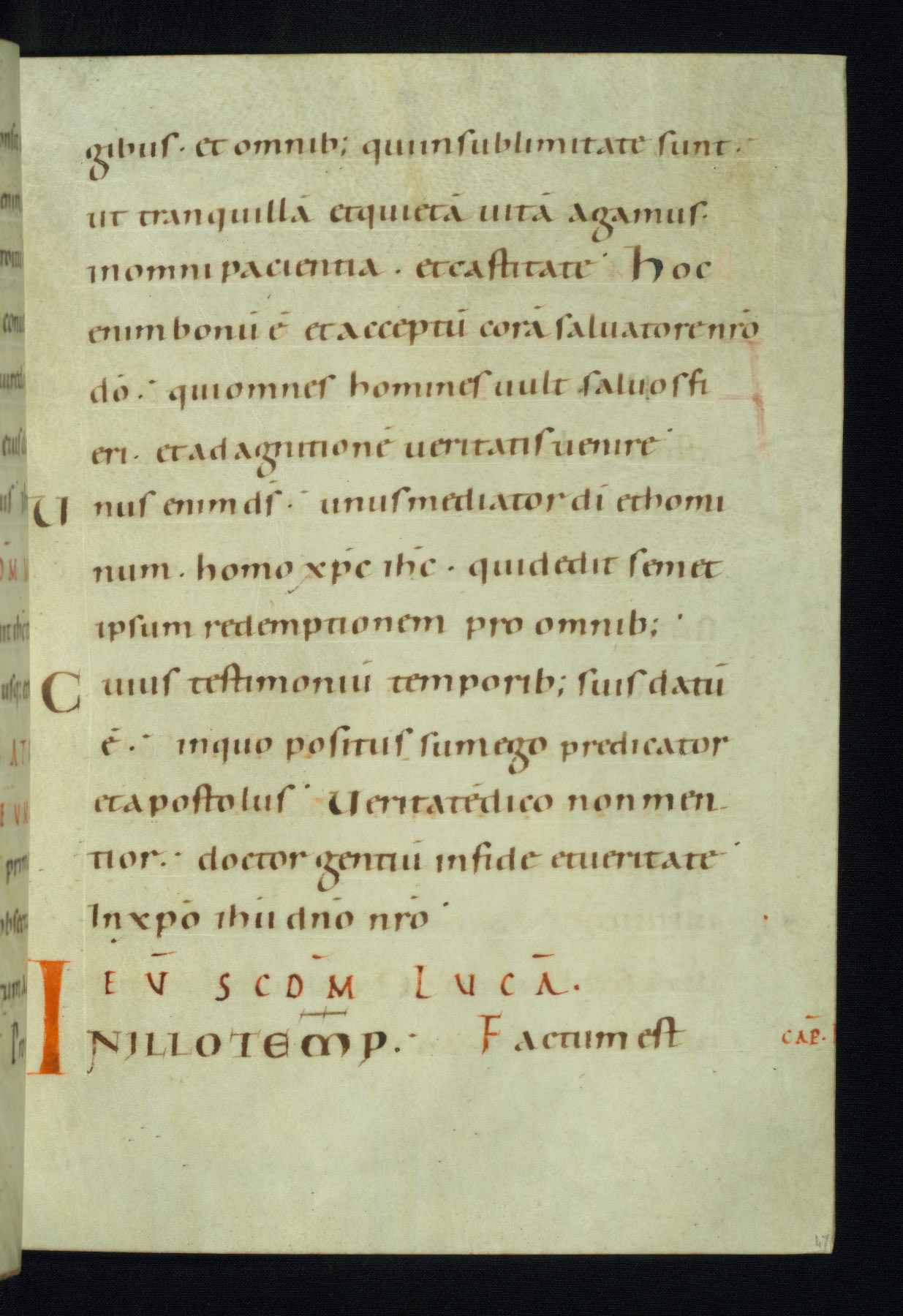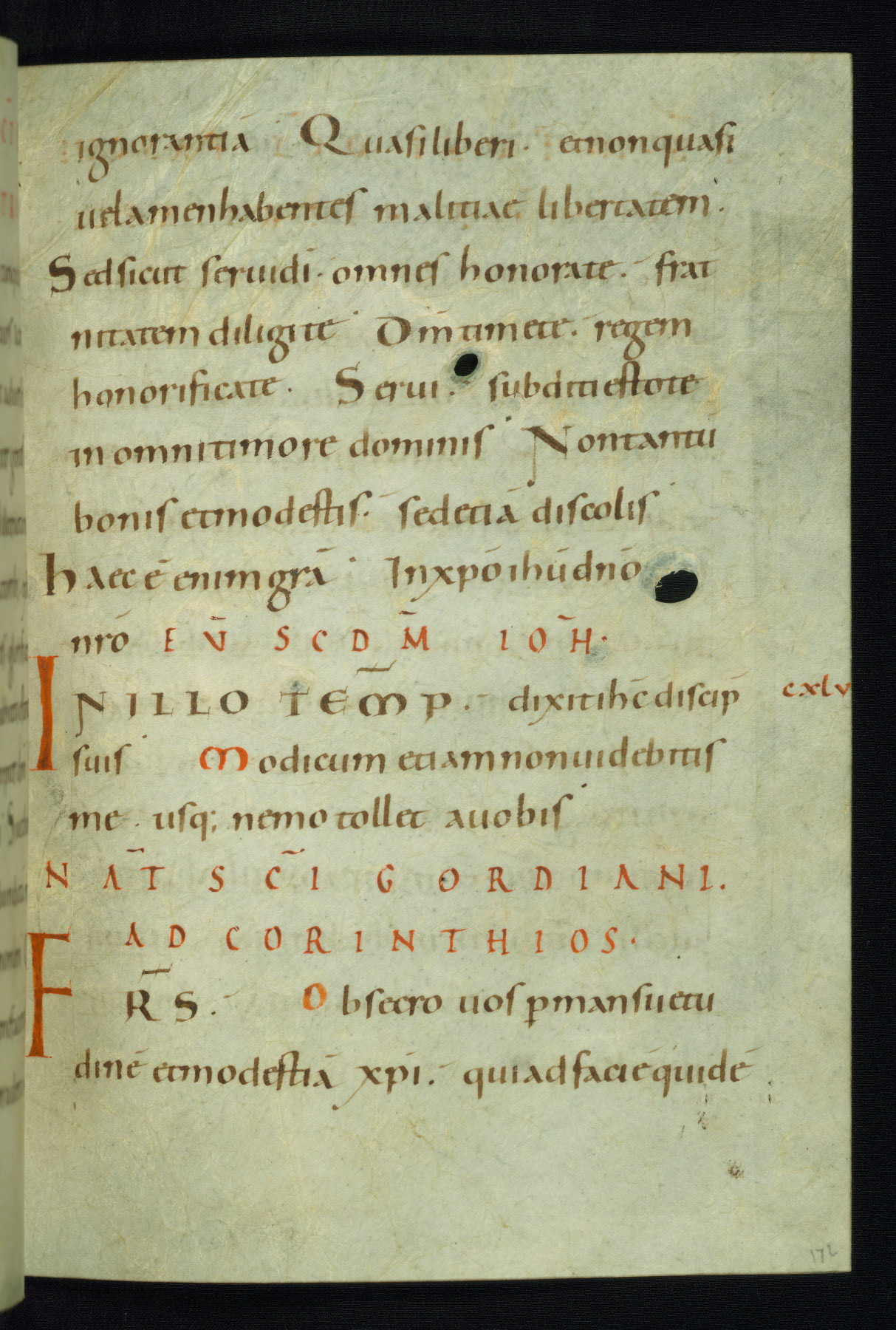 This Lectionary was created ca. 1000 in Trier. Written in a clear Caroline minuscule, it contains decorated initials at the openings of important readings. A set of illuminated letters marks the beginning of the Epistle and Gospel lessons for Easter; they display the hierarchy of scripts with capital letters decorated with gold leaf or drawn in red ink, followed by uncial and Caroline minuscule. Initials in orange, sometimes filled with gold, mark the divisions of the text. The book has been stylistically compared with Ottonian manuscripts, especially with a Psalter preserved in Trier (Stadtbibliothek, Ms. 7) illuminated by the so-called Master of the Registrum Gregorii.