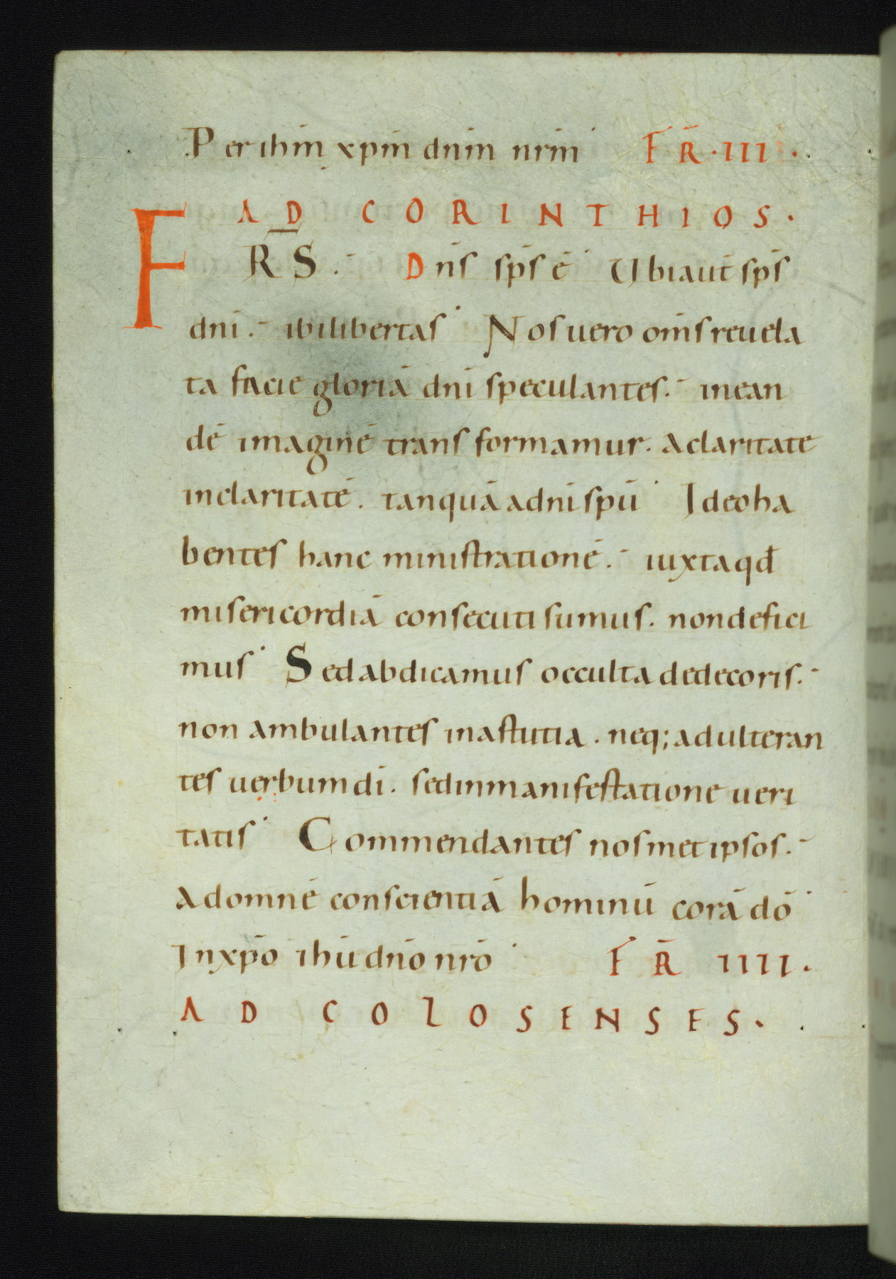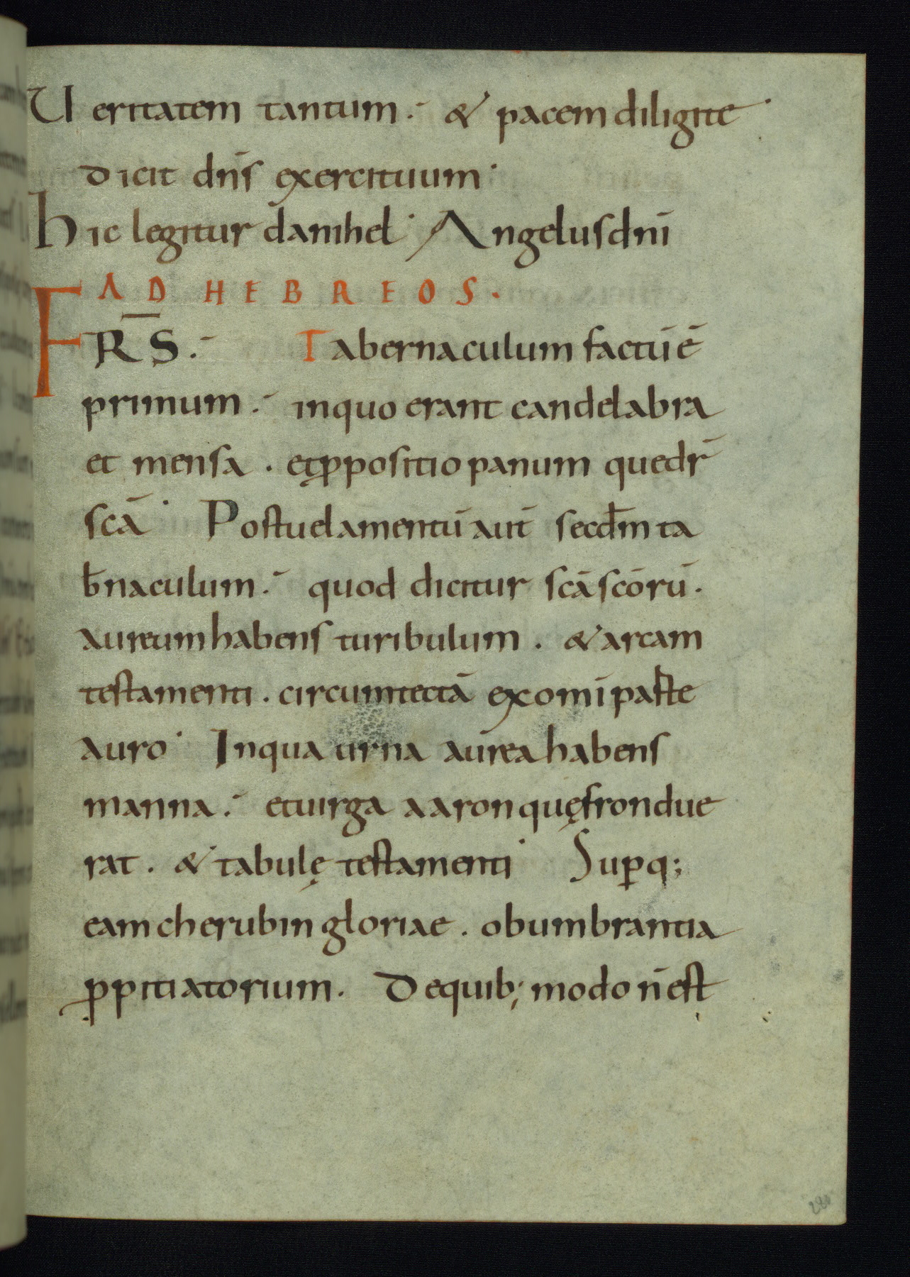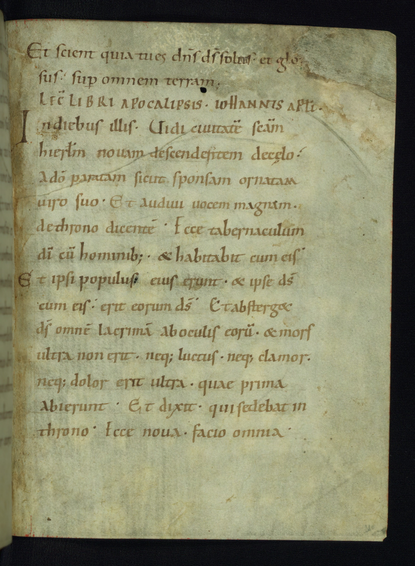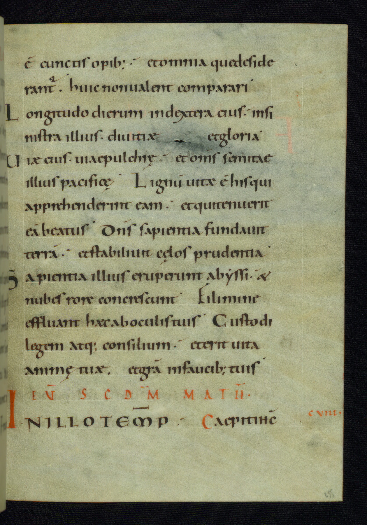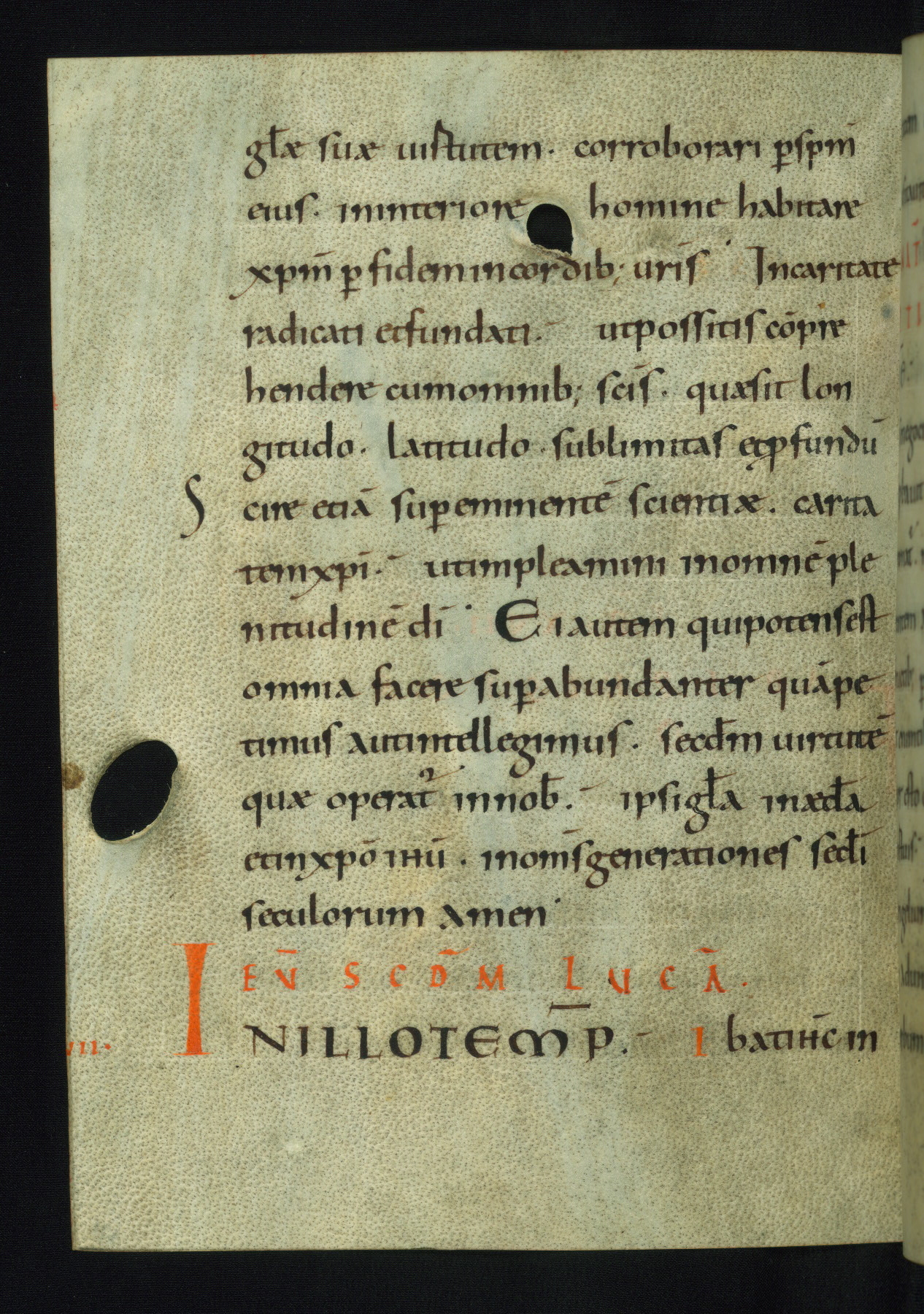 This Lectionary was created ca. 1000 in Trier. Written in a clear Caroline minuscule, it contains decorated initials at the openings of important readings. A set of illuminated letters marks the beginning of the Epistle and Gospel lessons for Easter; they display the hierarchy of scripts with capital letters decorated with gold leaf or drawn in red ink, followed by uncial and Caroline minuscule. Initials in orange, sometimes filled with gold, mark the divisions of the text. The book has been stylistically compared with Ottonian manuscripts, especially with a Psalter preserved in Trier (Stadtbibliothek, Ms. 7) illuminated by the so-called Master of the Registrum Gregorii.