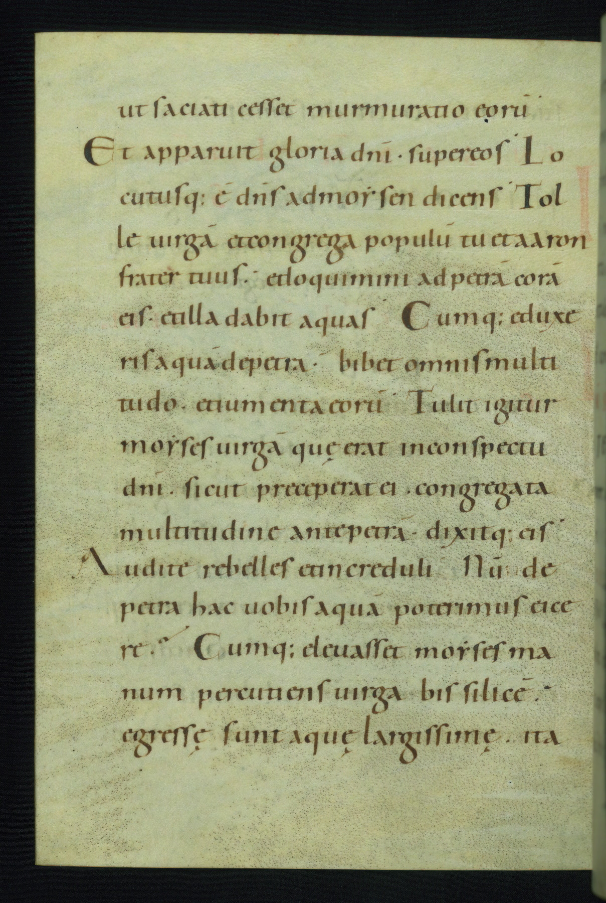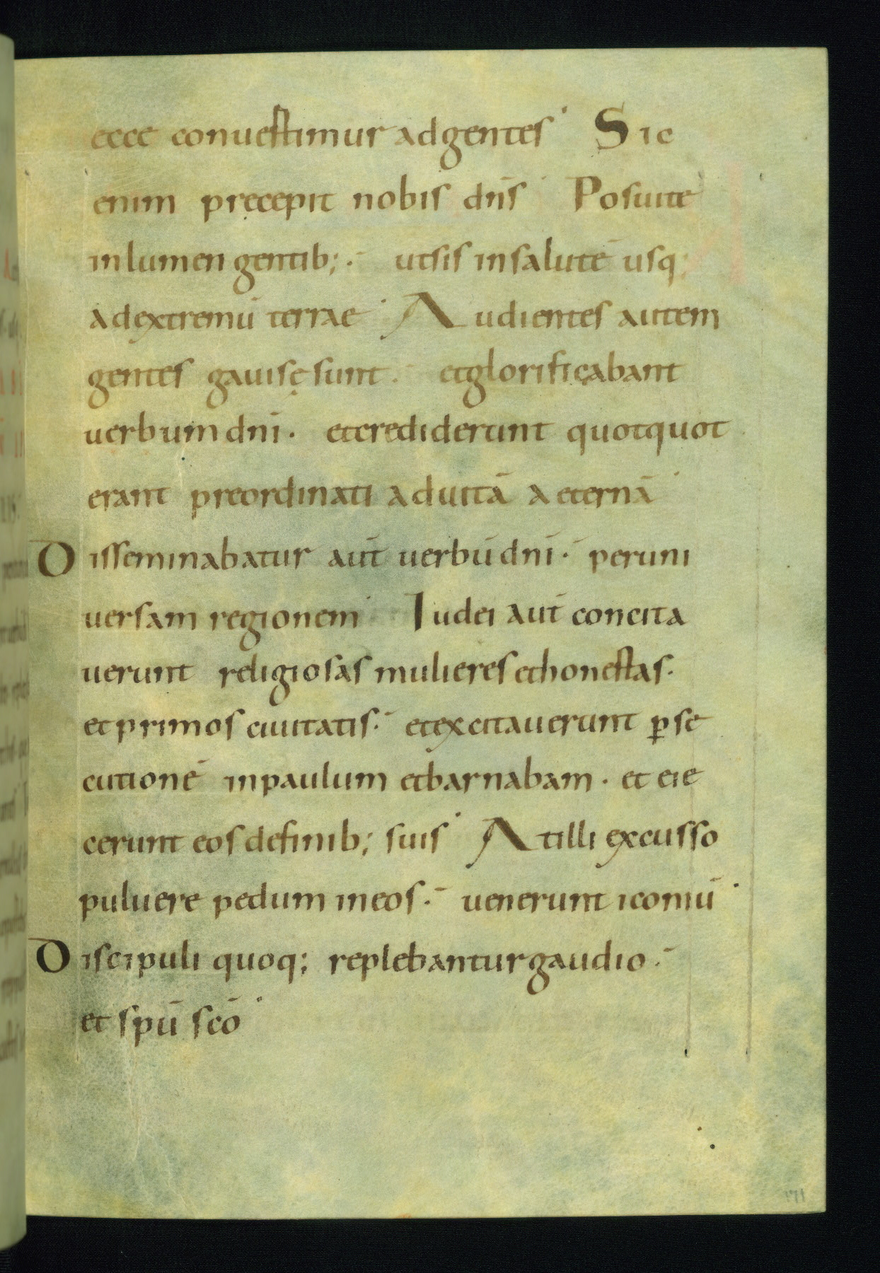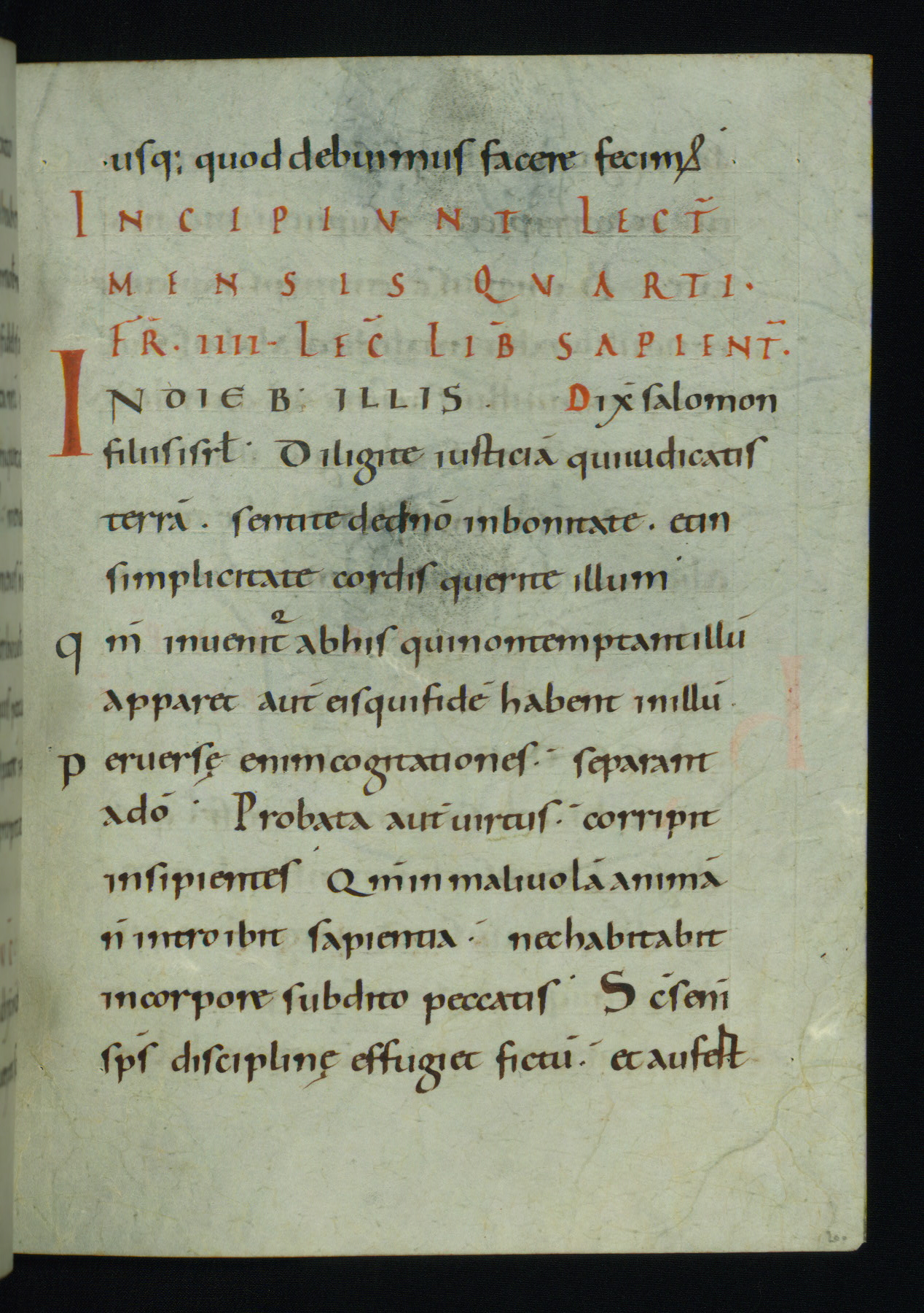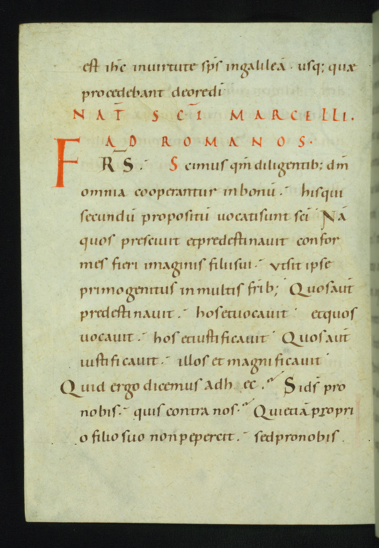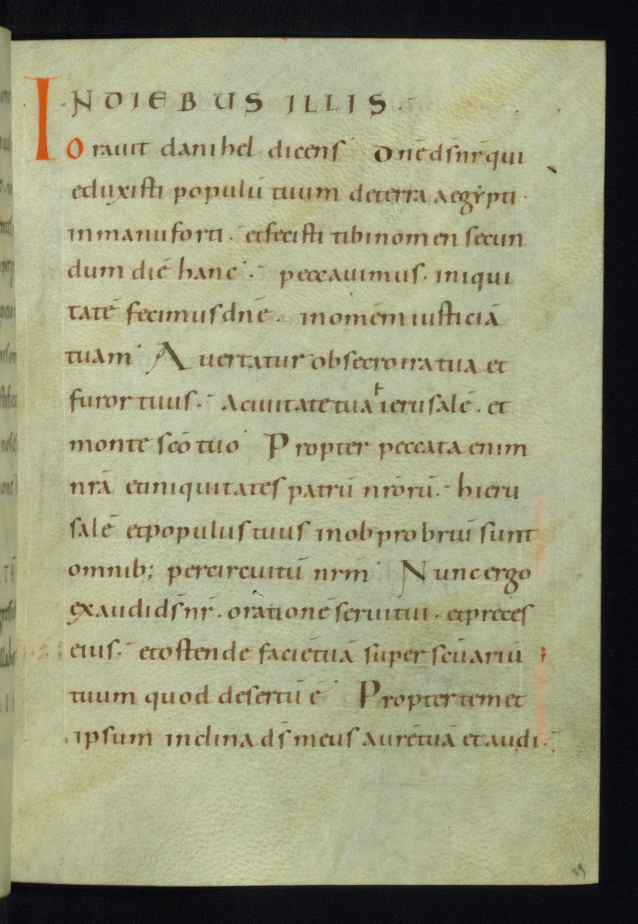 This Lectionary was created ca. 1000 in Trier. Written in a clear Caroline minuscule, it contains decorated initials at the openings of important readings. A set of illuminated letters marks the beginning of the Epistle and Gospel lessons for Easter; they display the hierarchy of scripts with capital letters decorated with gold leaf or drawn in red ink, followed by uncial and Caroline minuscule. Initials in orange, sometimes filled with gold, mark the divisions of the text. The book has been stylistically compared with Ottonian manuscripts, especially with a Psalter preserved in Trier (Stadtbibliothek, Ms. 7) illuminated by the so-called Master of the Registrum Gregorii.