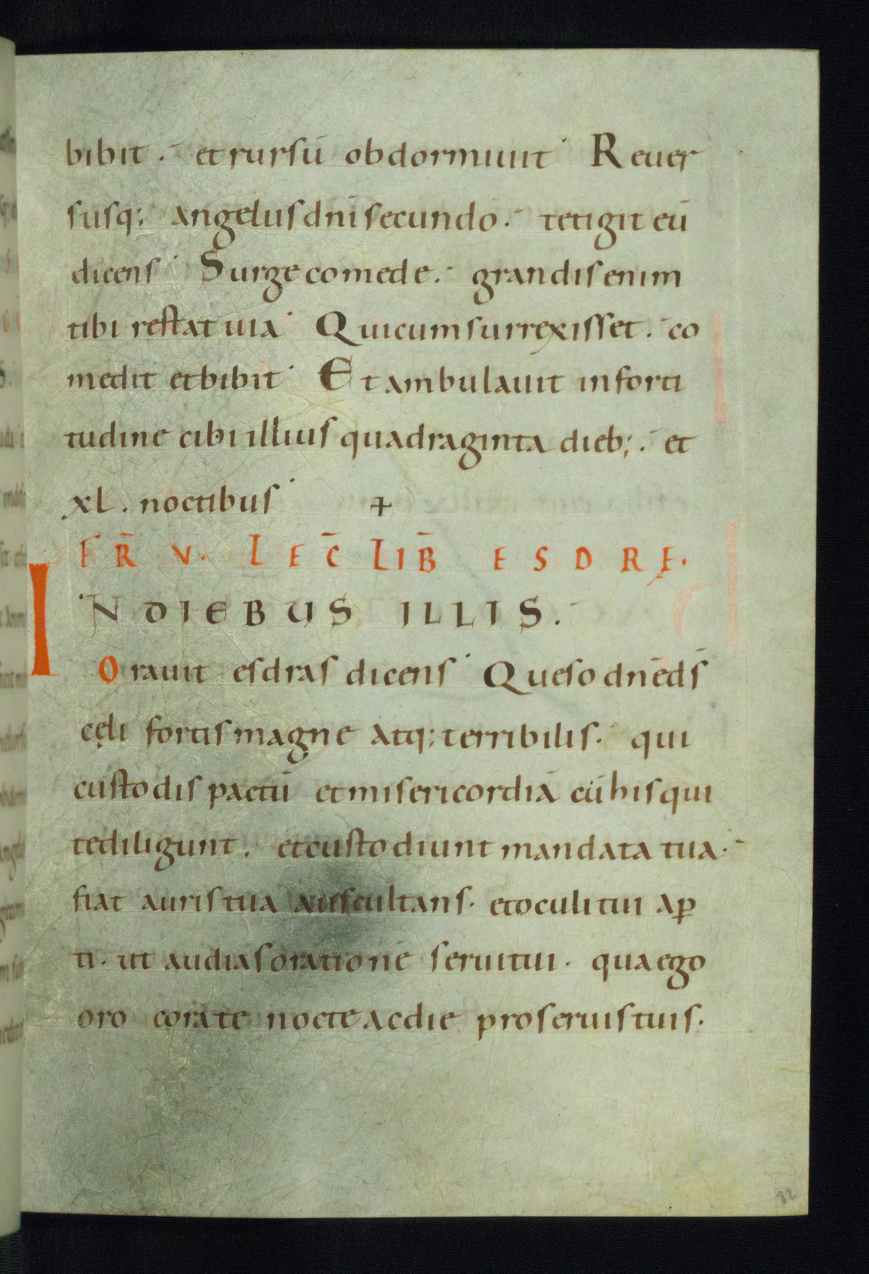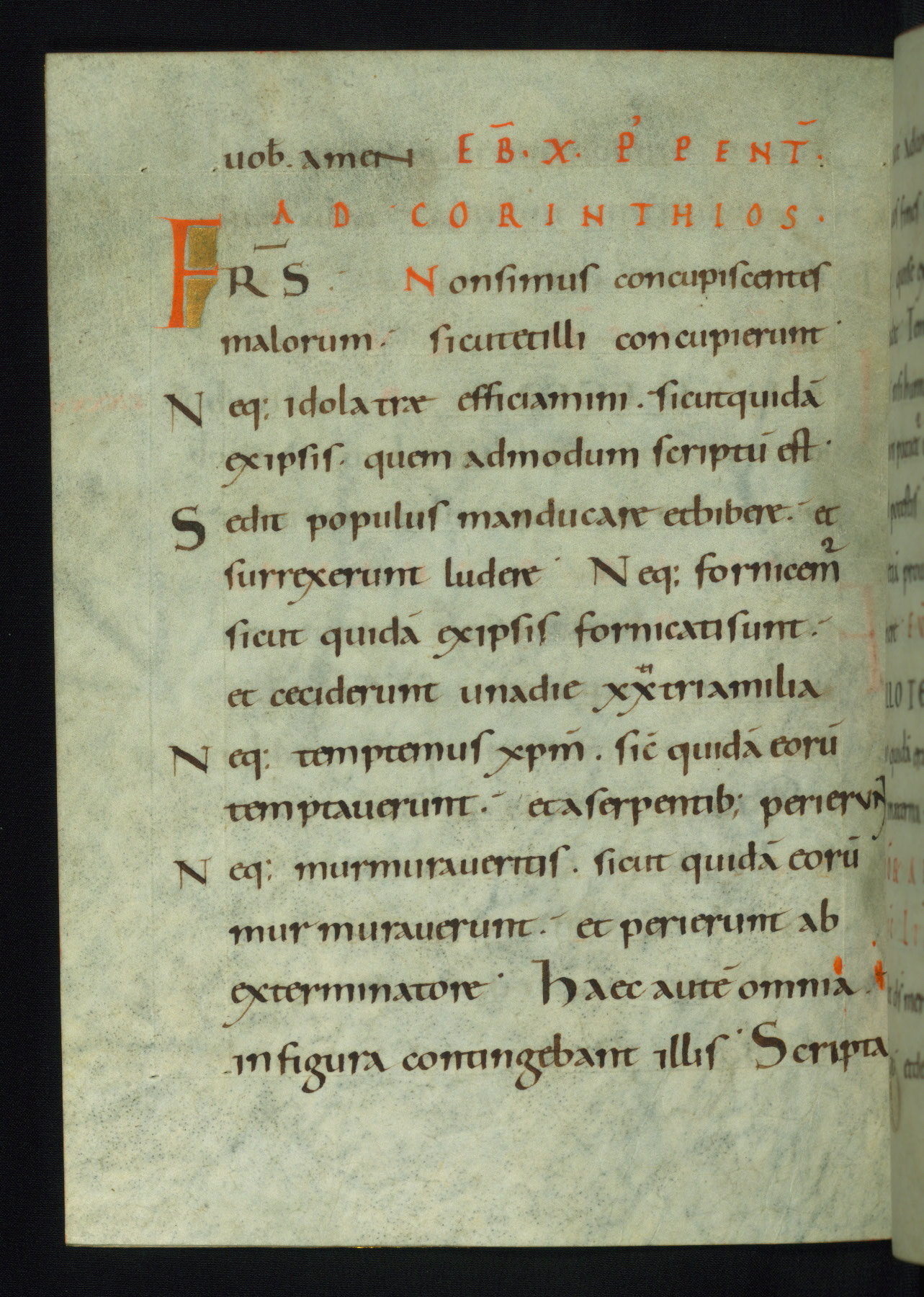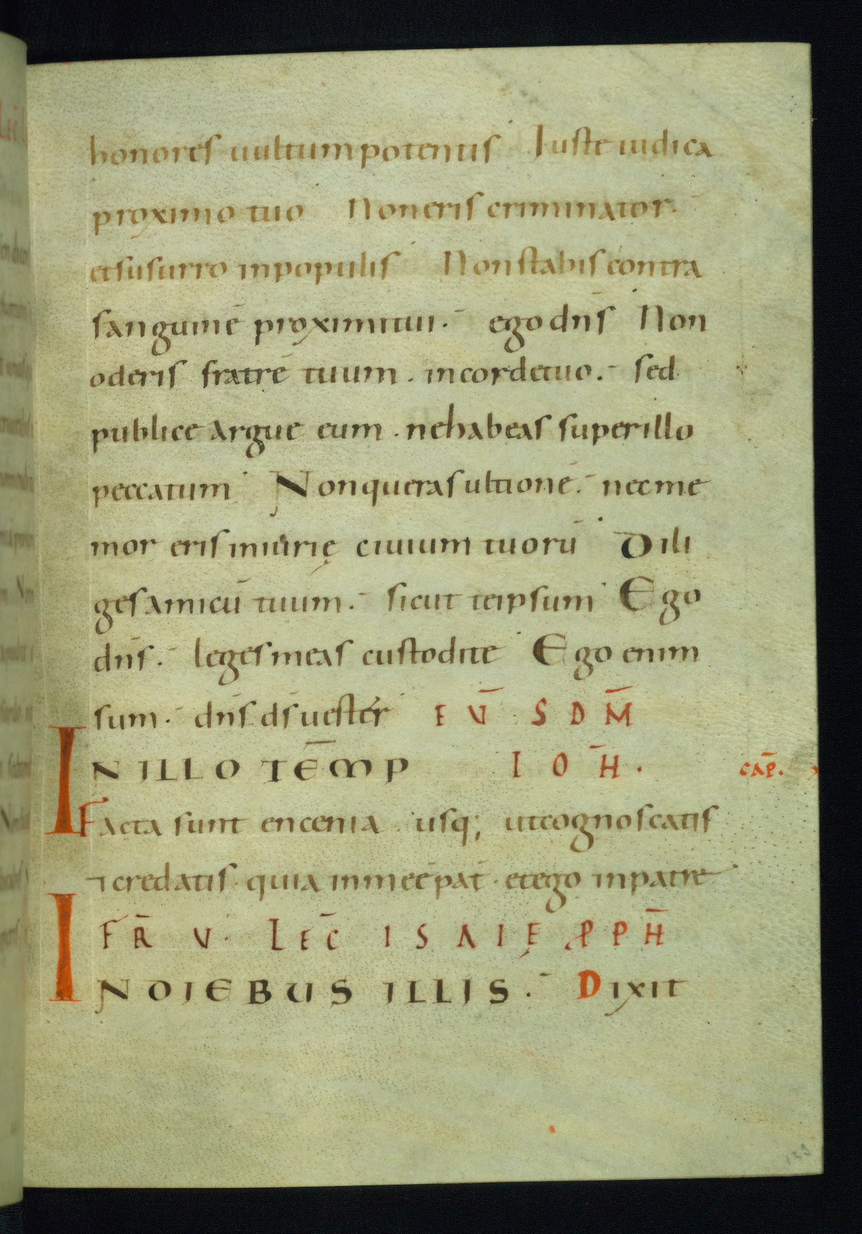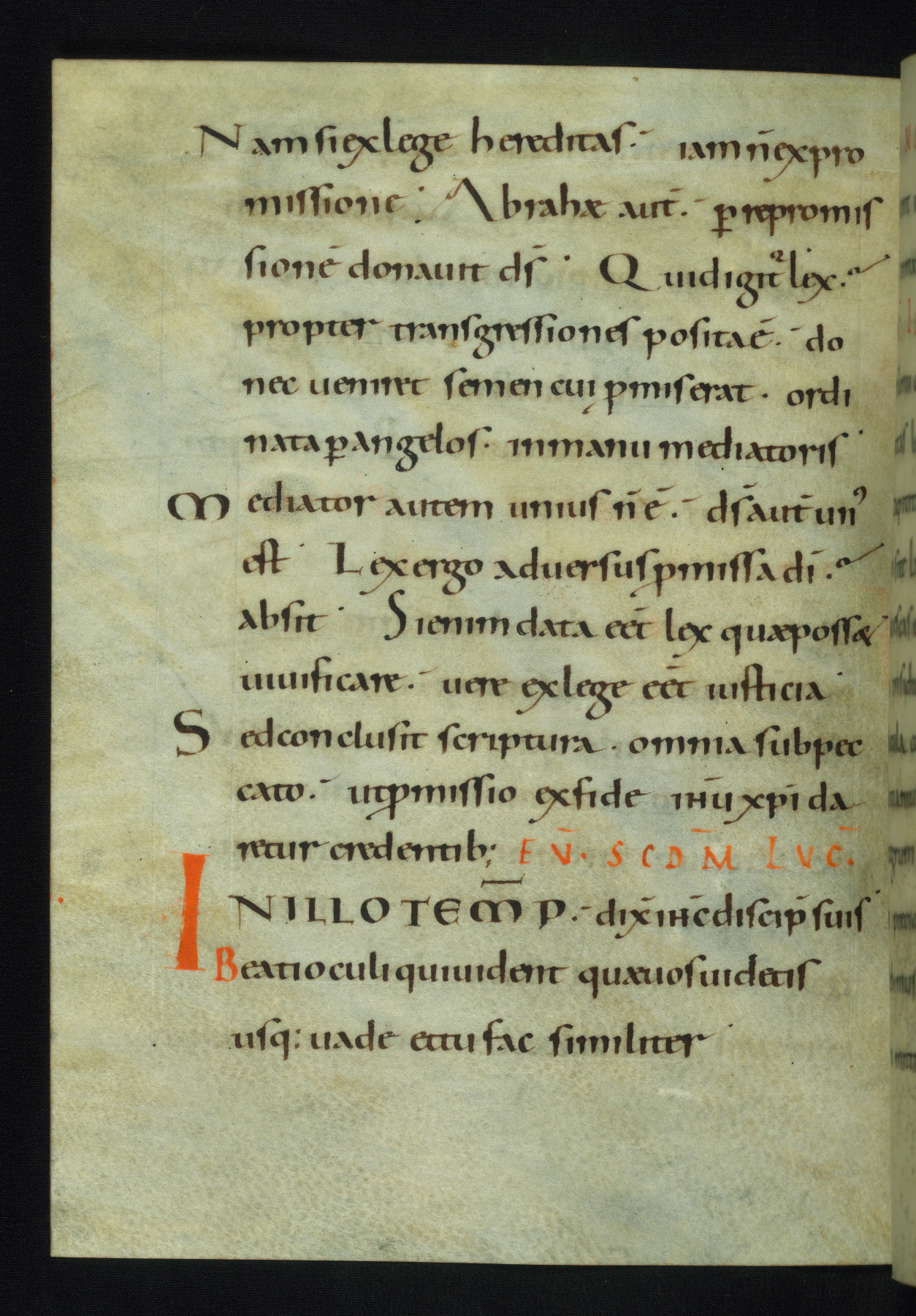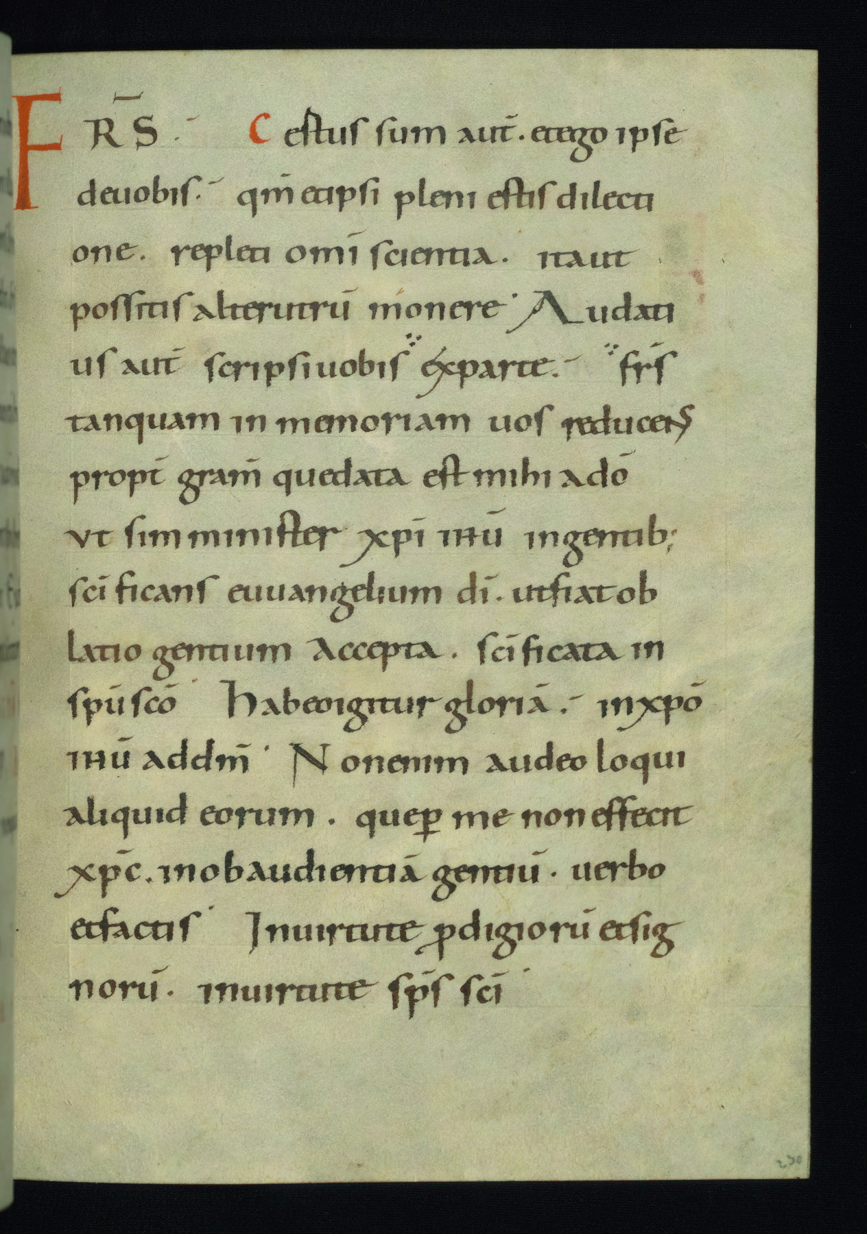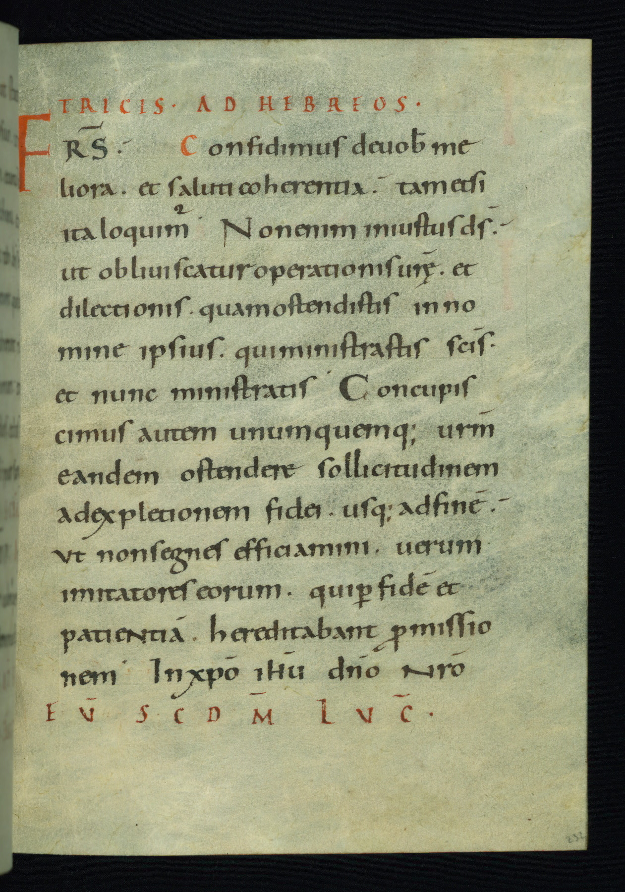 This Lectionary was created ca. 1000 in Trier. Written in a clear Caroline minuscule, it contains decorated initials at the openings of important readings. A set of illuminated letters marks the beginning of the Epistle and Gospel lessons for Easter; they display the hierarchy of scripts with capital letters decorated with gold leaf or drawn in red ink, followed by uncial and Caroline minuscule. Initials in orange, sometimes filled with gold, mark the divisions of the text. The book has been stylistically compared with Ottonian manuscripts, especially with a Psalter preserved in Trier (Stadtbibliothek, Ms. 7) illuminated by the so-called Master of the Registrum Gregorii.