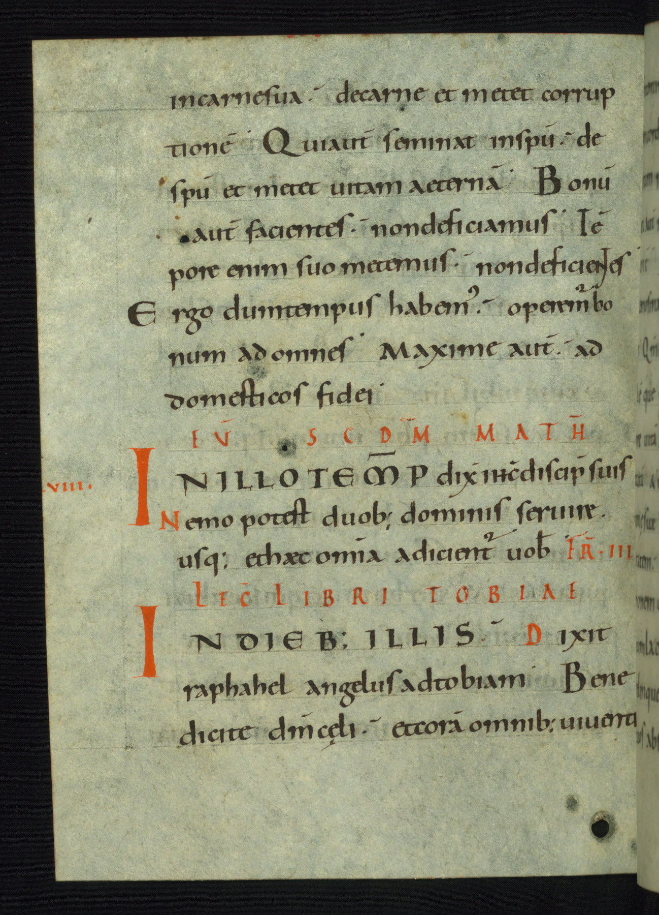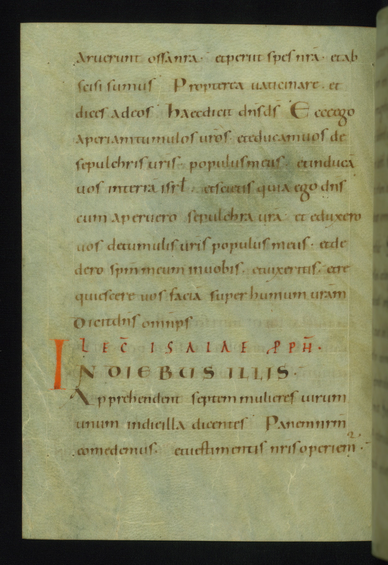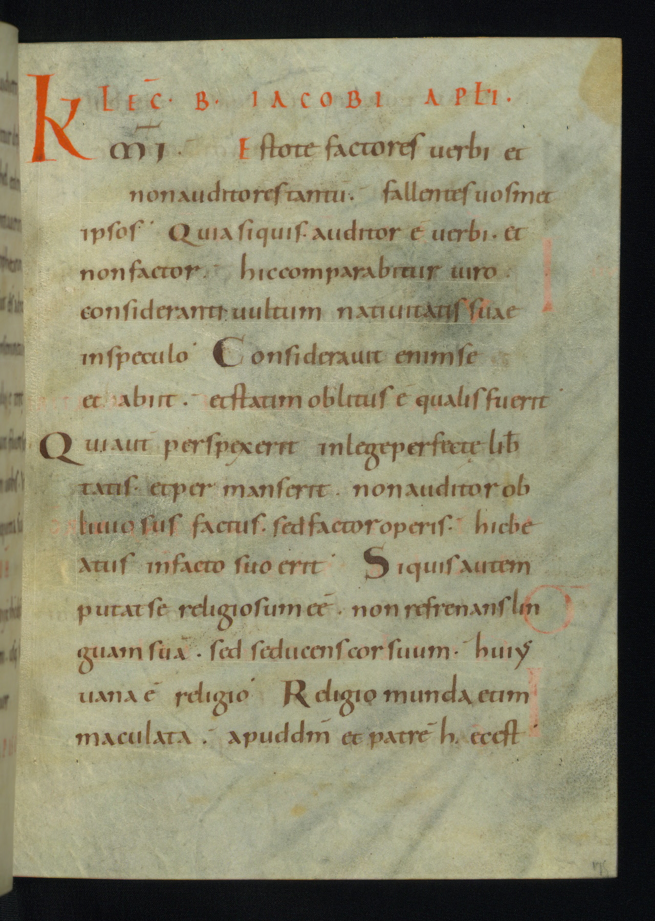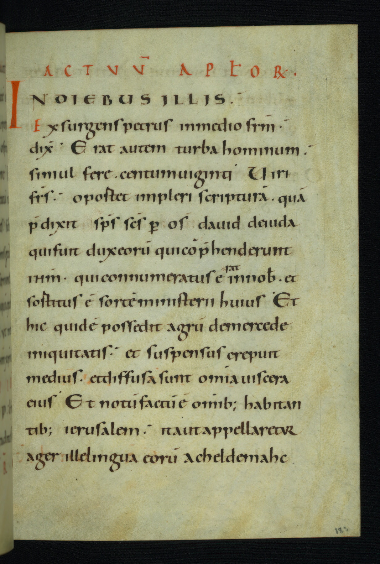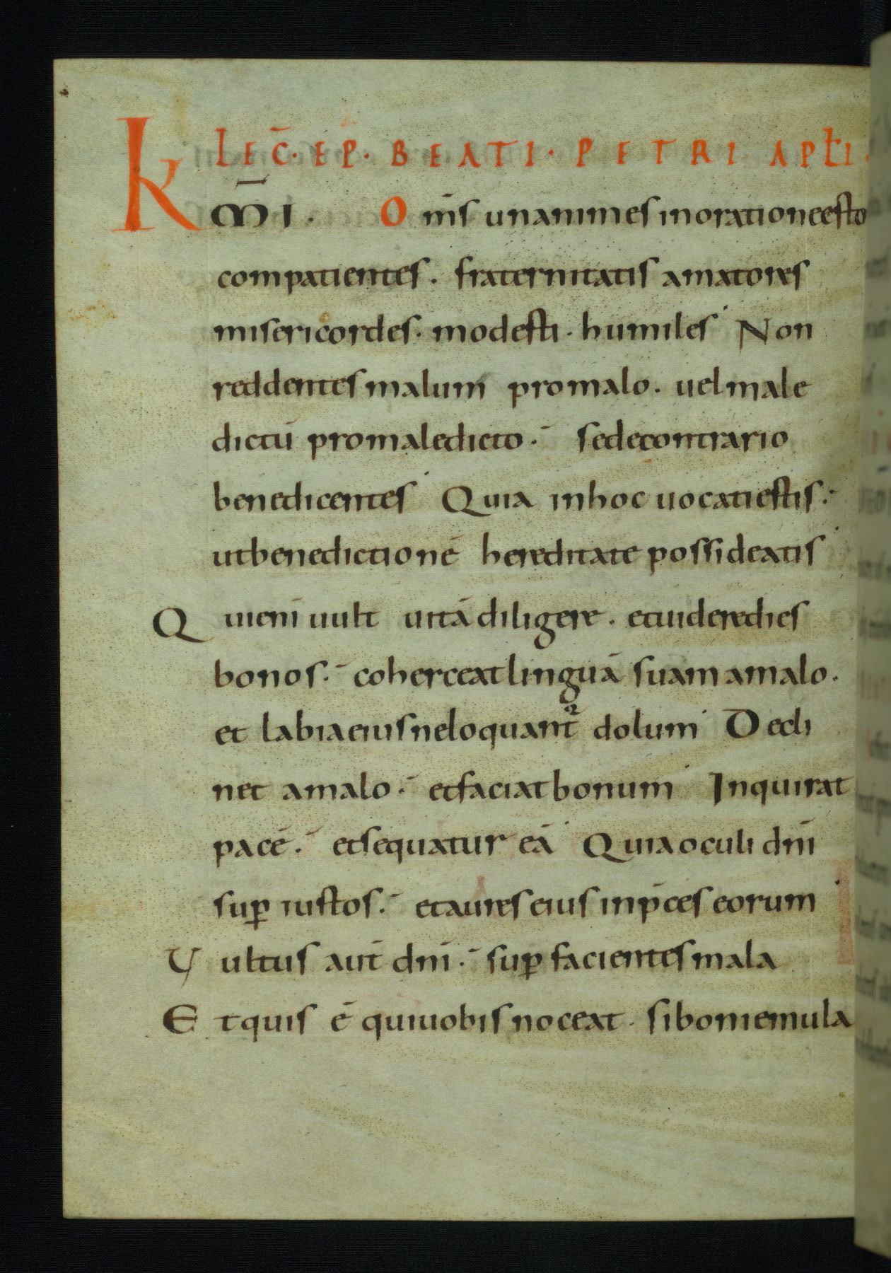 This Lectionary was created ca. 1000 in Trier. Written in a clear Caroline minuscule, it contains decorated initials at the openings of important readings. A set of illuminated letters marks the beginning of the Epistle and Gospel lessons for Easter; they display the hierarchy of scripts with capital letters decorated with gold leaf or drawn in red ink, followed by uncial and Caroline minuscule. Initials in orange, sometimes filled with gold, mark the divisions of the text. The book has been stylistically compared with Ottonian manuscripts, especially with a Psalter preserved in Trier (Stadtbibliothek, Ms. 7) illuminated by the so-called Master of the Registrum Gregorii.
