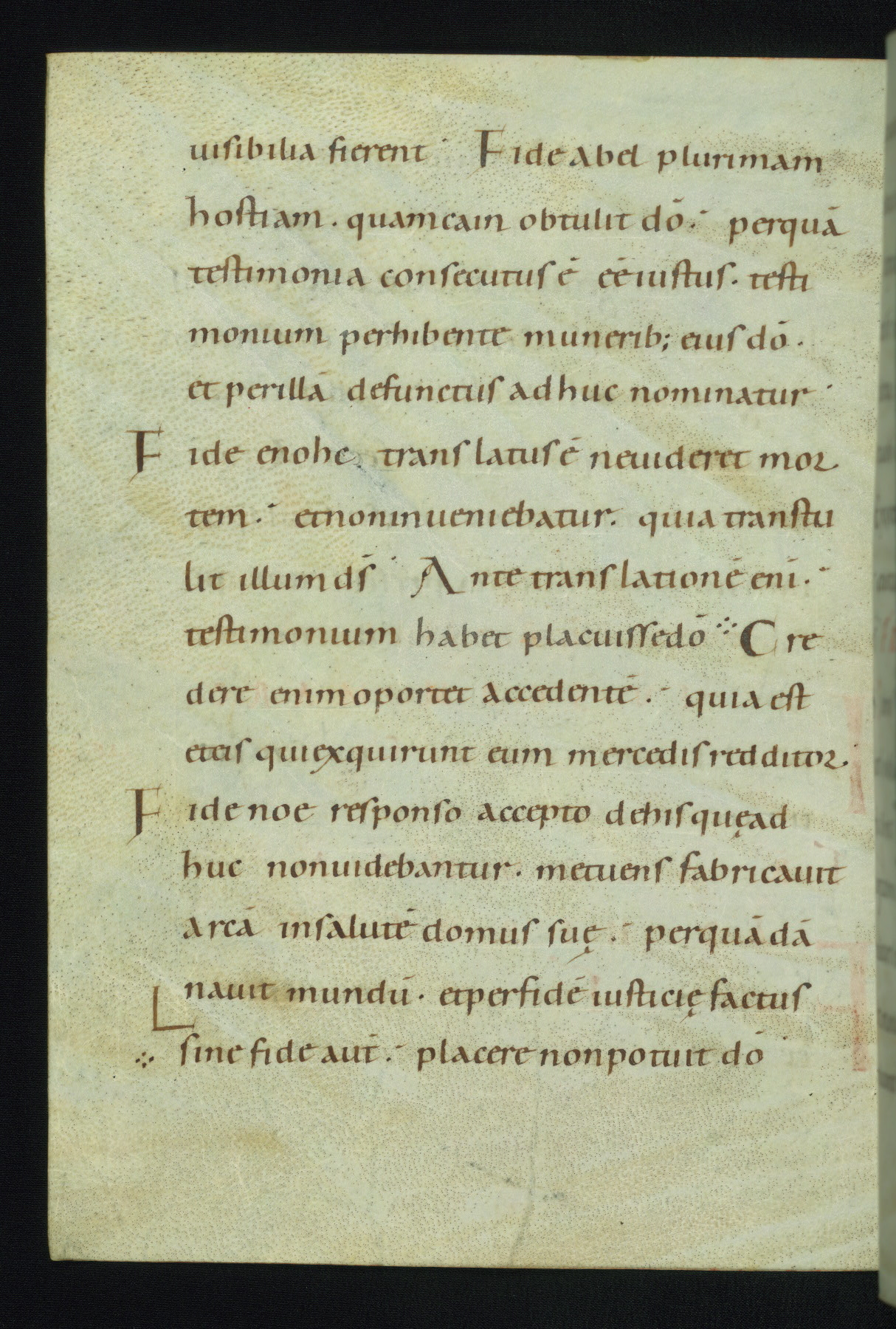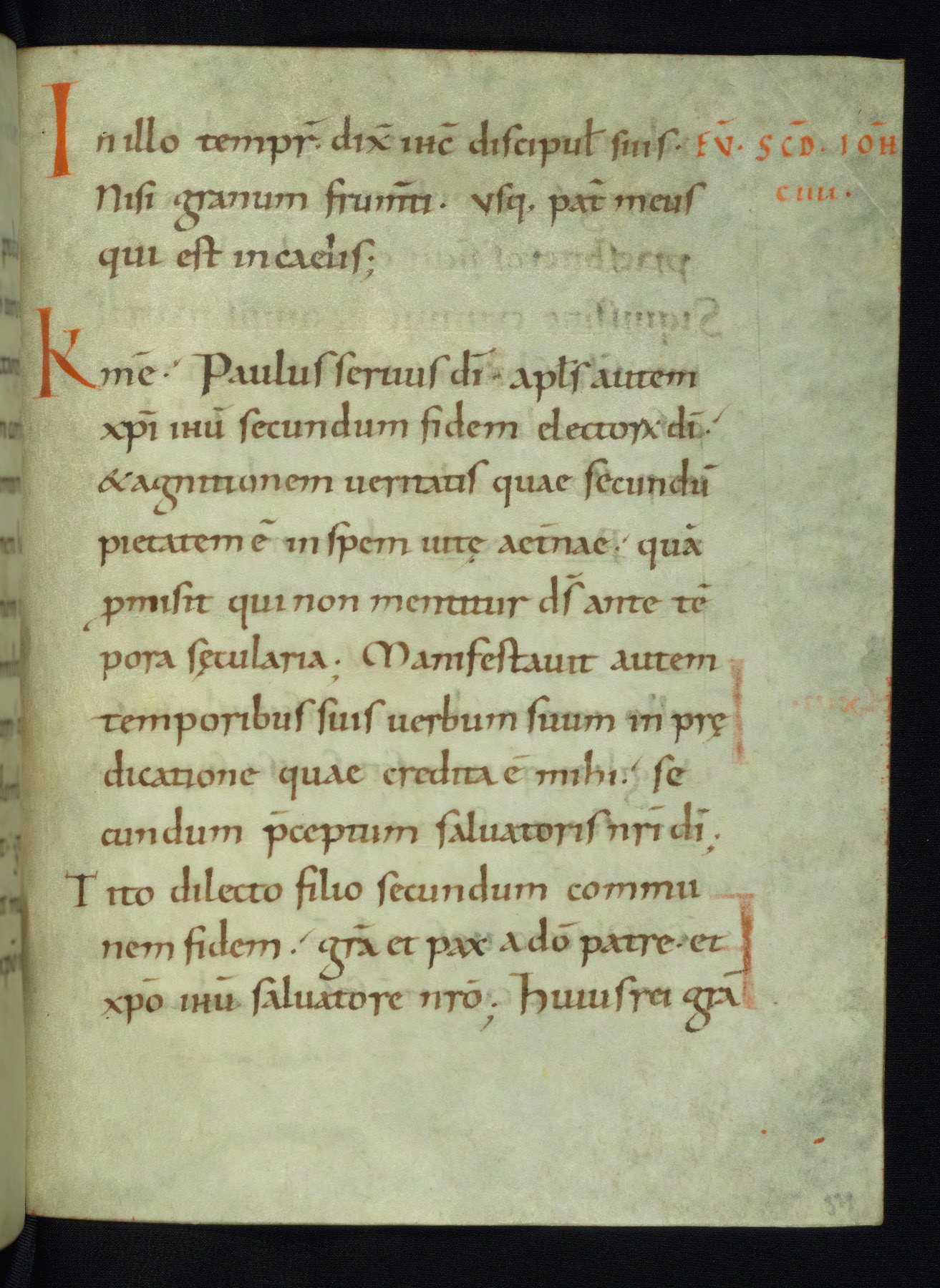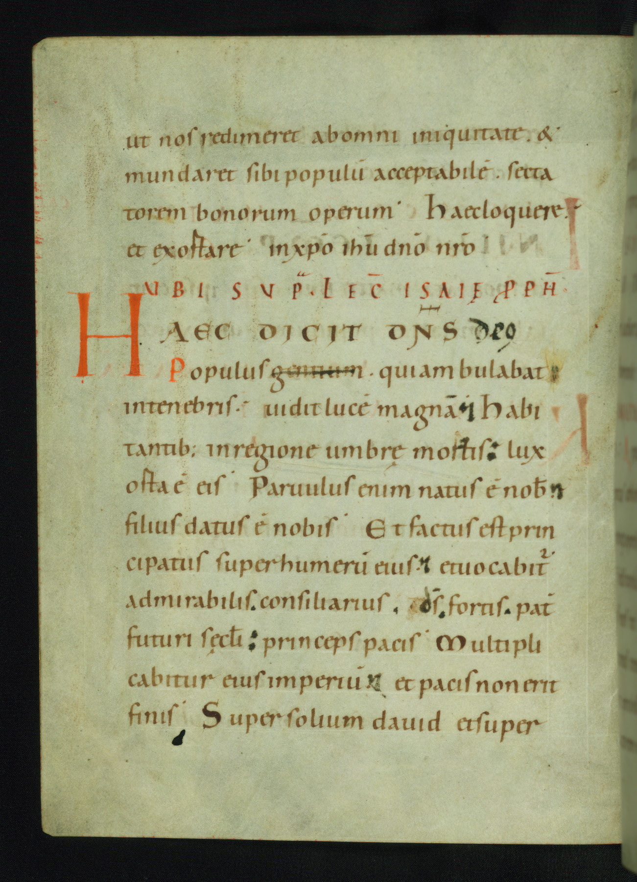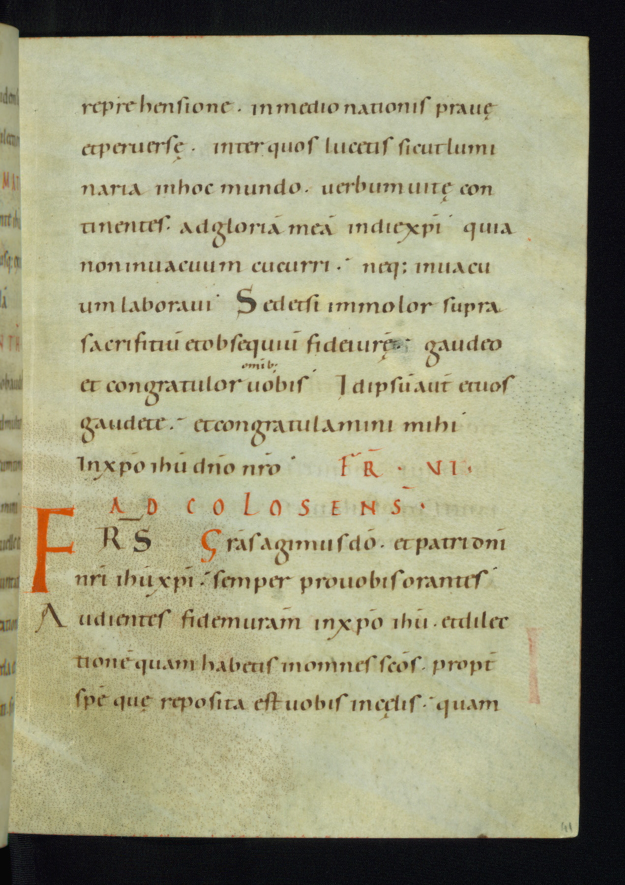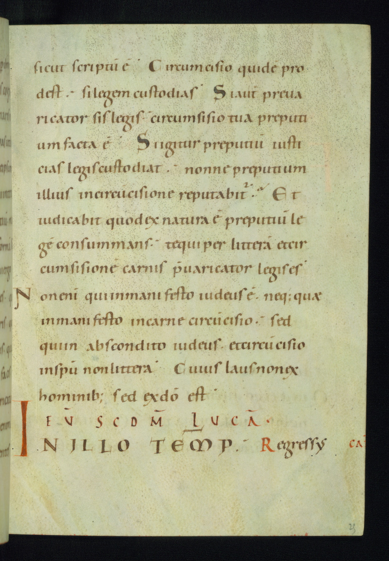 This Lectionary was created ca. 1000 in Trier. Written in a clear Caroline minuscule, it contains decorated initials at the openings of important readings. A set of illuminated letters marks the beginning of the Epistle and Gospel lessons for Easter; they display the hierarchy of scripts with capital letters decorated with gold leaf or drawn in red ink, followed by uncial and Caroline minuscule. Initials in orange, sometimes filled with gold, mark the divisions of the text. The book has been stylistically compared with Ottonian manuscripts, especially with a Psalter preserved in Trier (Stadtbibliothek, Ms. 7) illuminated by the so-called Master of the Registrum Gregorii.