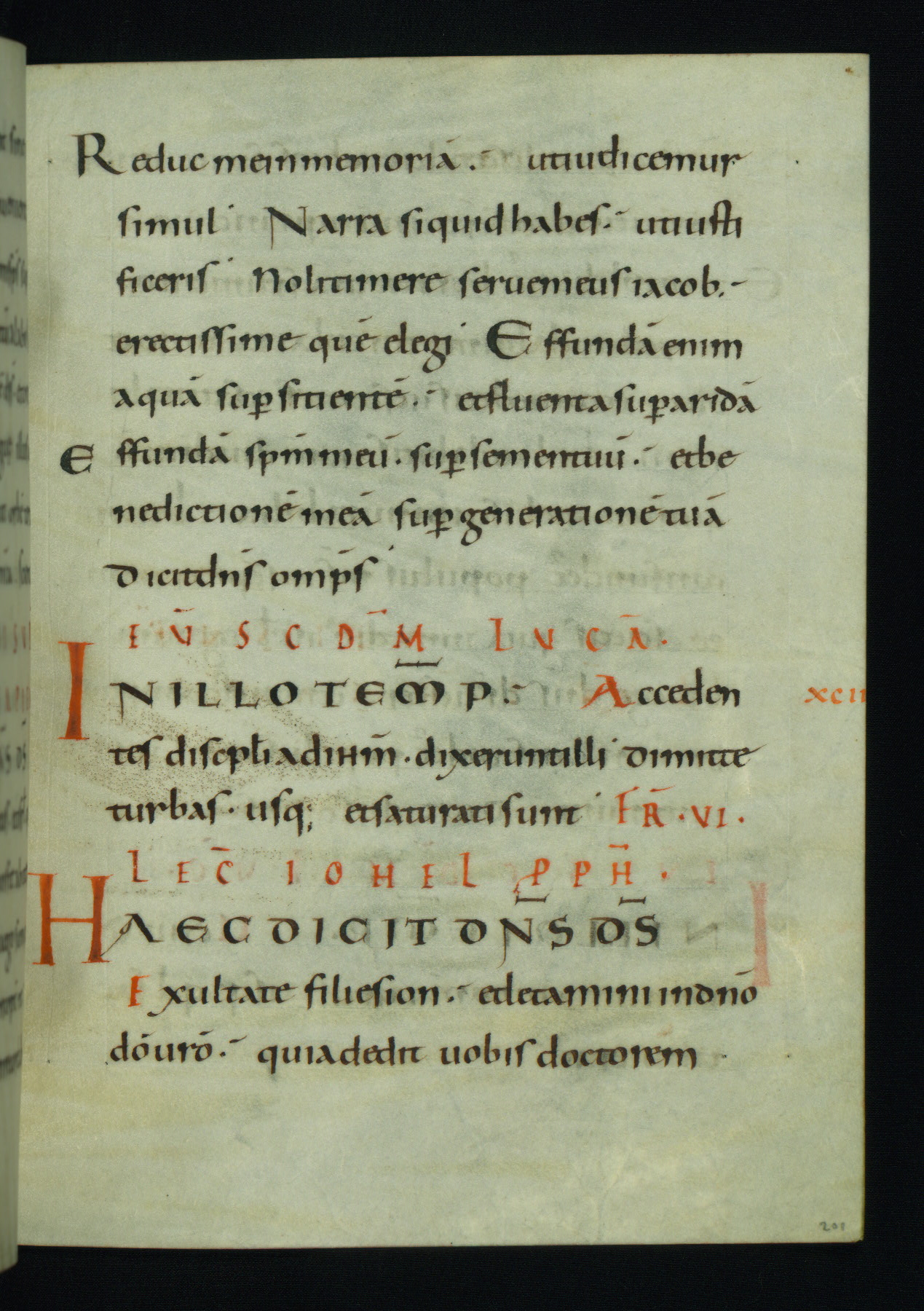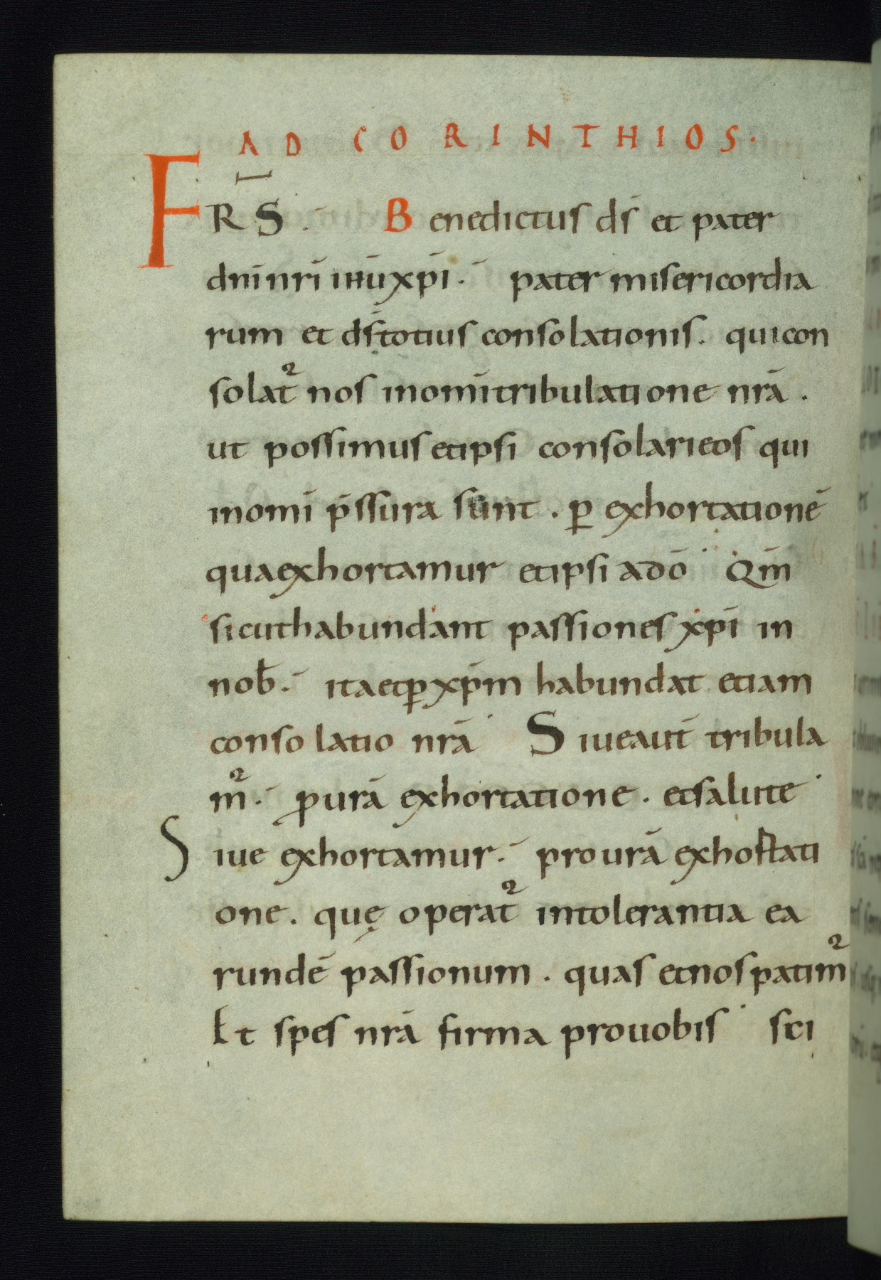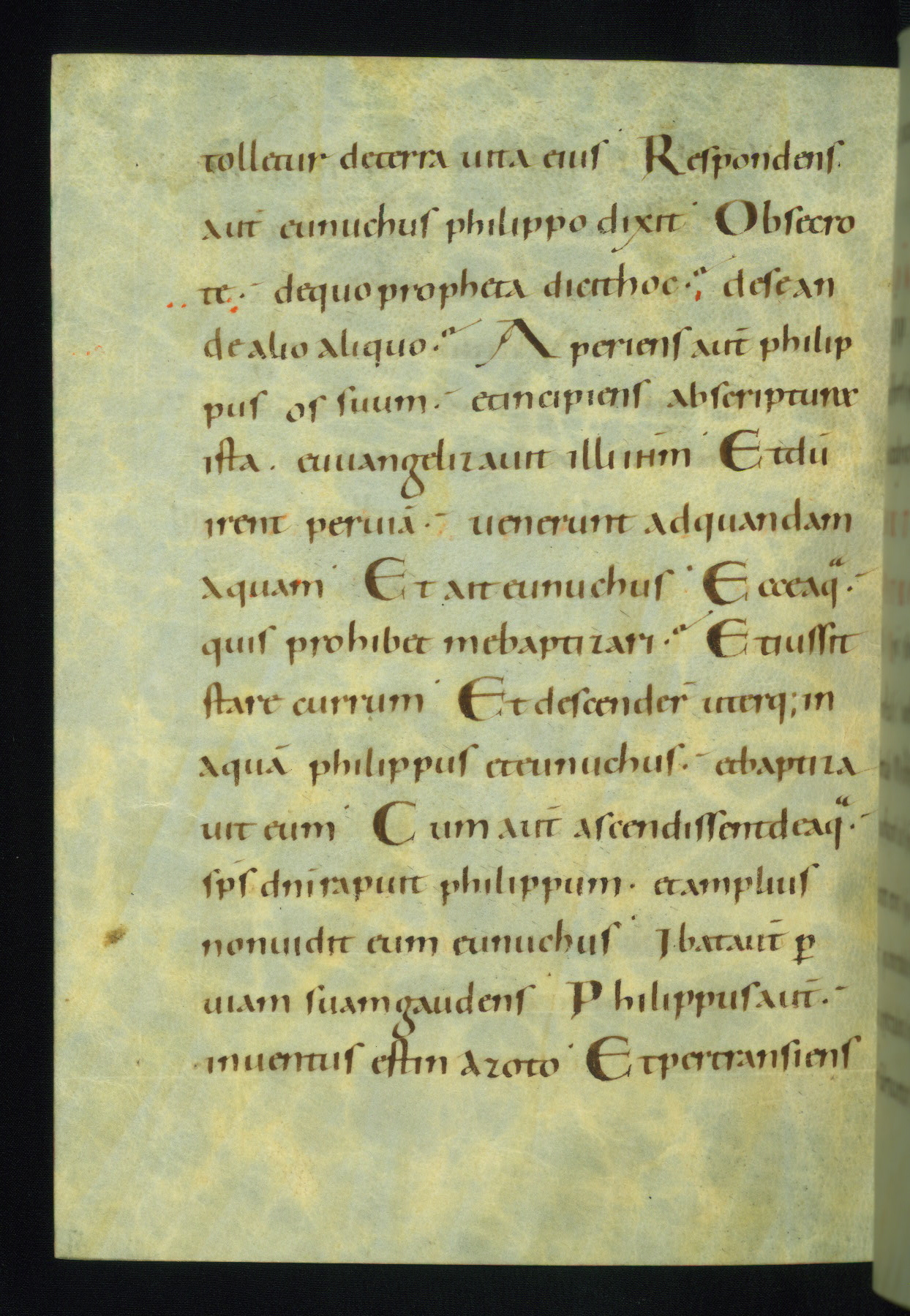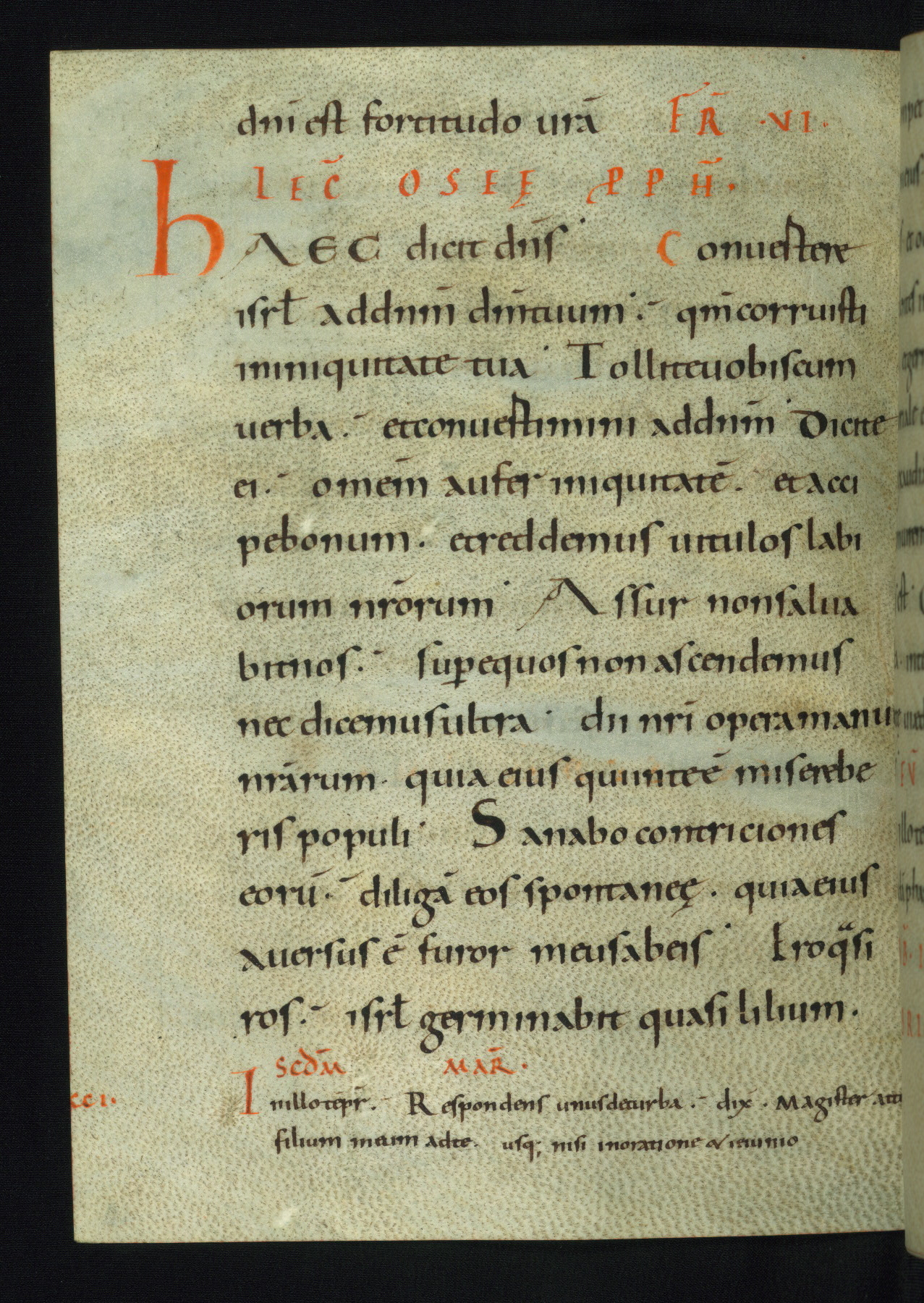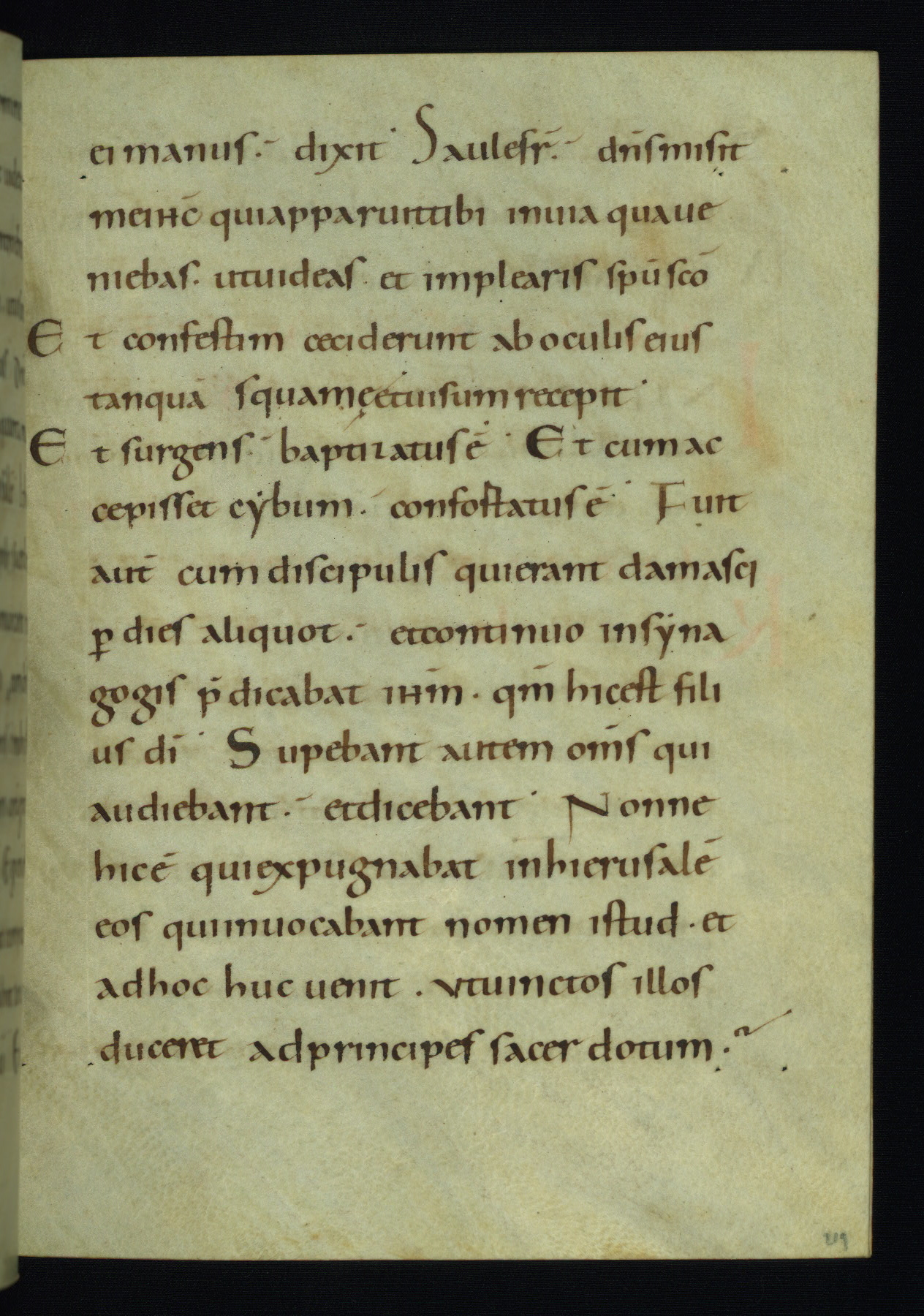This Lectionary was created ca. 1000 in Trier. Written in a clear Caroline minuscule, it contains decorated initials at the openings of important readings. A set of illuminated letters marks the beginning of the Epistle and Gospel lessons for Easter; they display the hierarchy of scripts with capital letters decorated with gold leaf or drawn in red ink, followed by uncial and Caroline minuscule. Initials in orange, sometimes filled with gold, mark the divisions of the text. The book has been stylistically compared with Ottonian manuscripts, especially with a Psalter preserved in Trier (Stadtbibliothek, Ms. 7) illuminated by the so-called Master of the Registrum Gregorii.