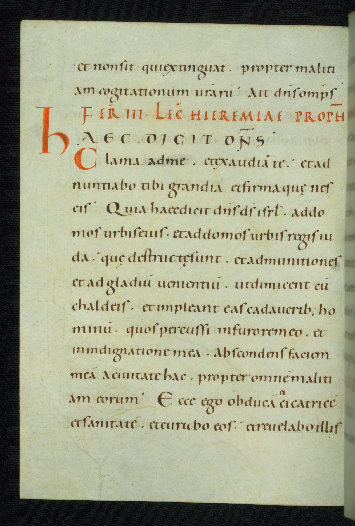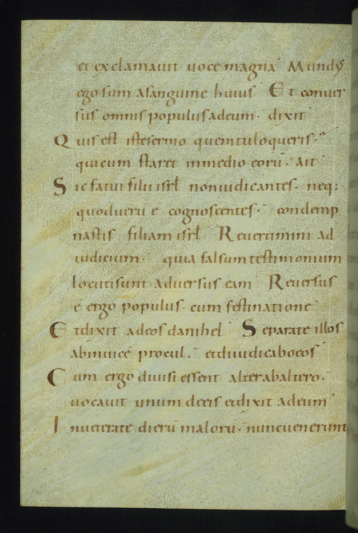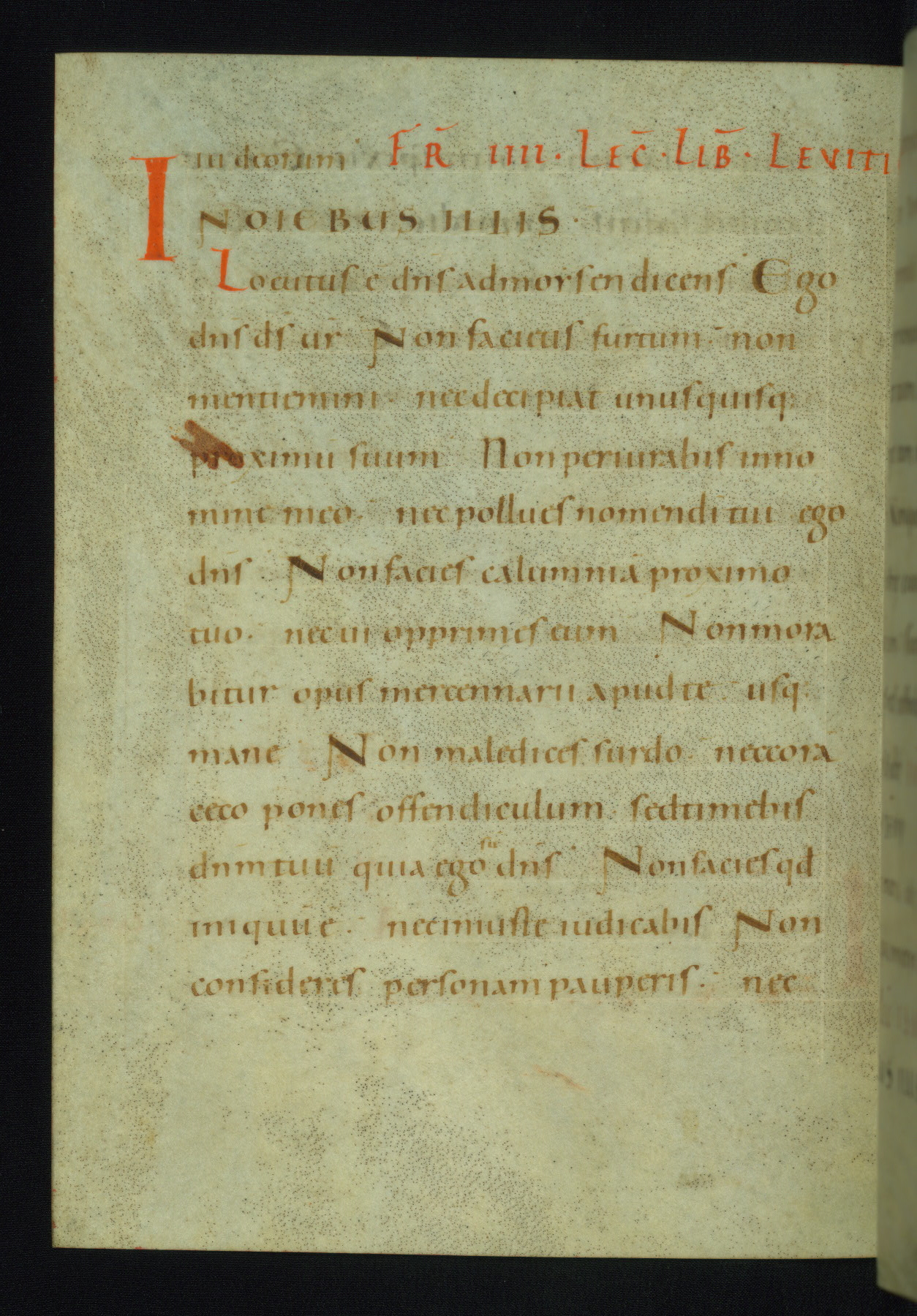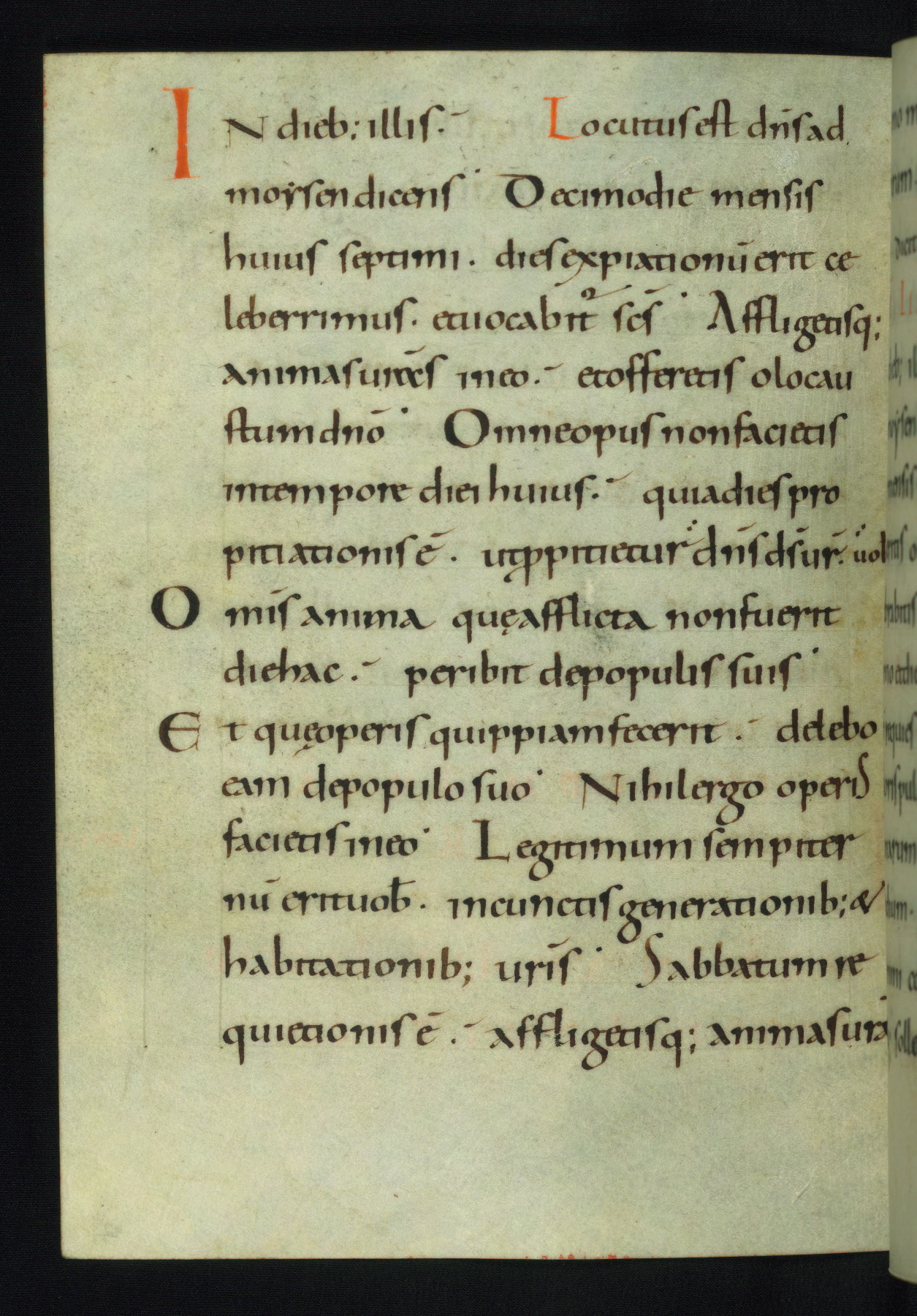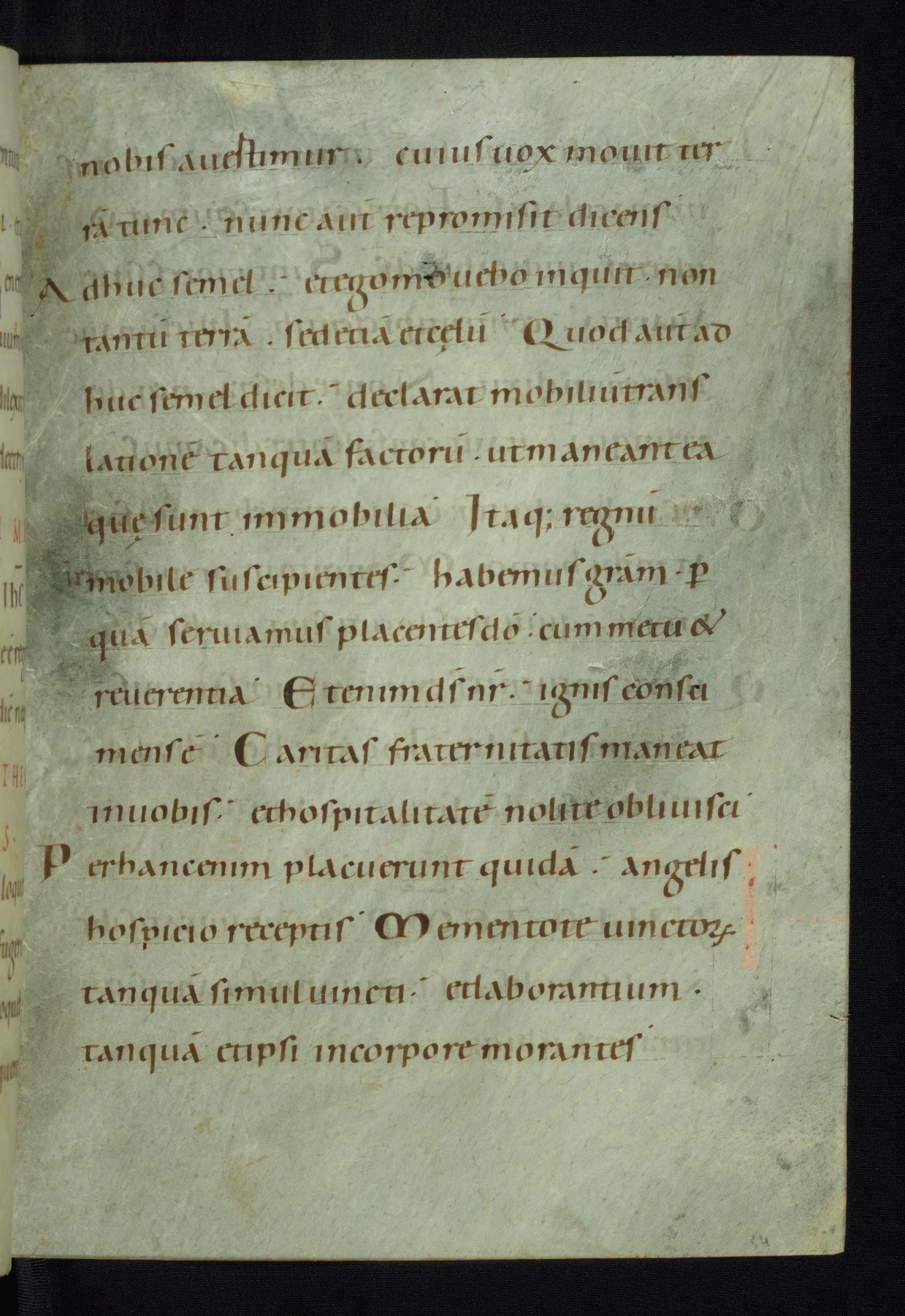 This Lectionary was created ca. 1000 in Trier. Written in a clear Caroline minuscule, it contains decorated initials at the openings of important readings. A set of illuminated letters marks the beginning of the Epistle and Gospel lessons for Easter; they display the hierarchy of scripts with capital letters decorated with gold leaf or drawn in red ink, followed by uncial and Caroline minuscule. Initials in orange, sometimes filled with gold, mark the divisions of the text. The book has been stylistically compared with Ottonian manuscripts, especially with a Psalter preserved in Trier (Stadtbibliothek, Ms. 7) illuminated by the so-called Master of the Registrum Gregorii.