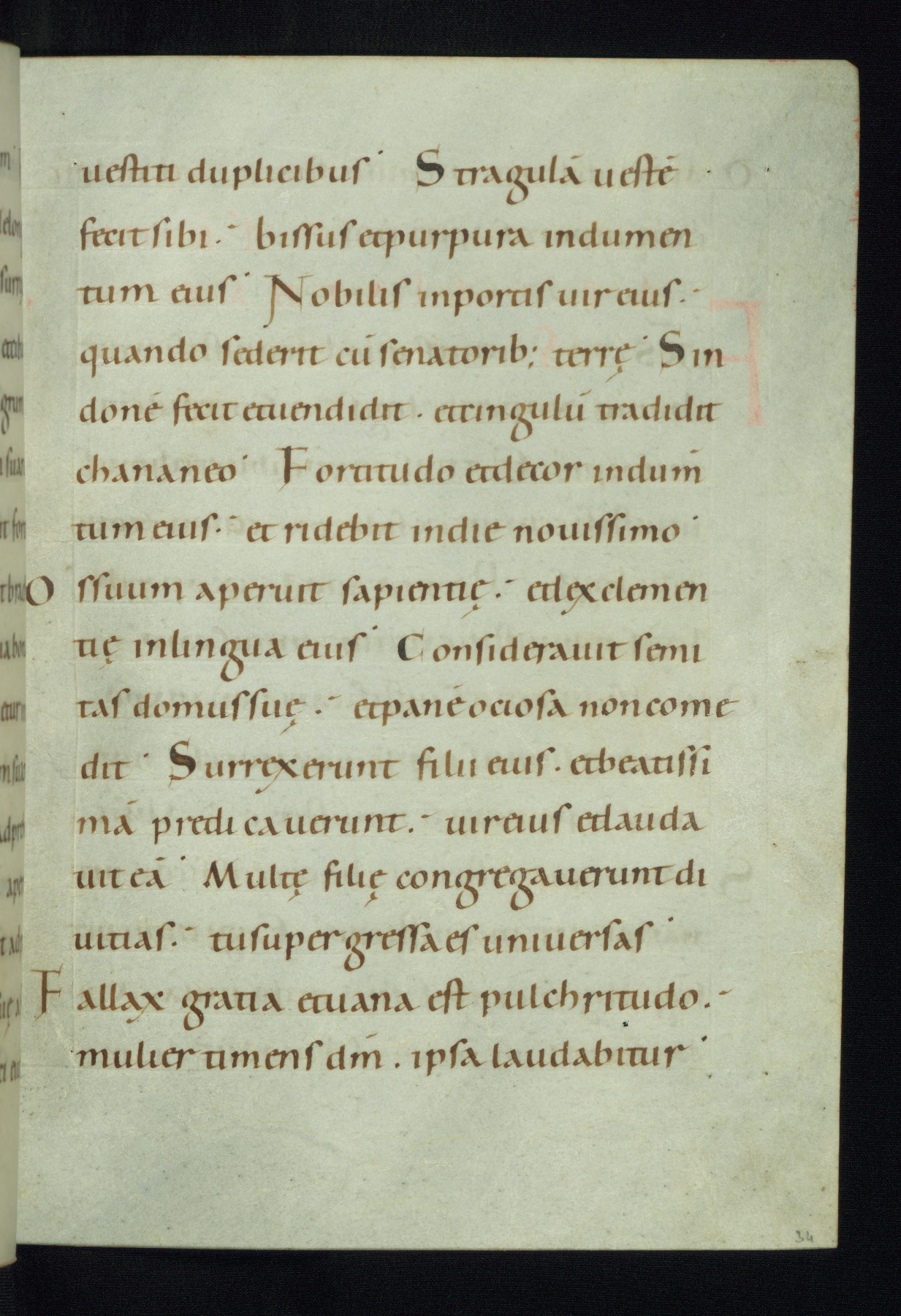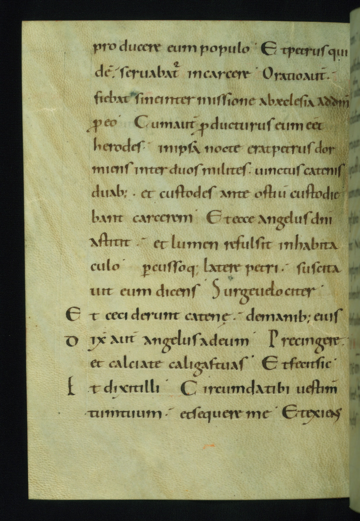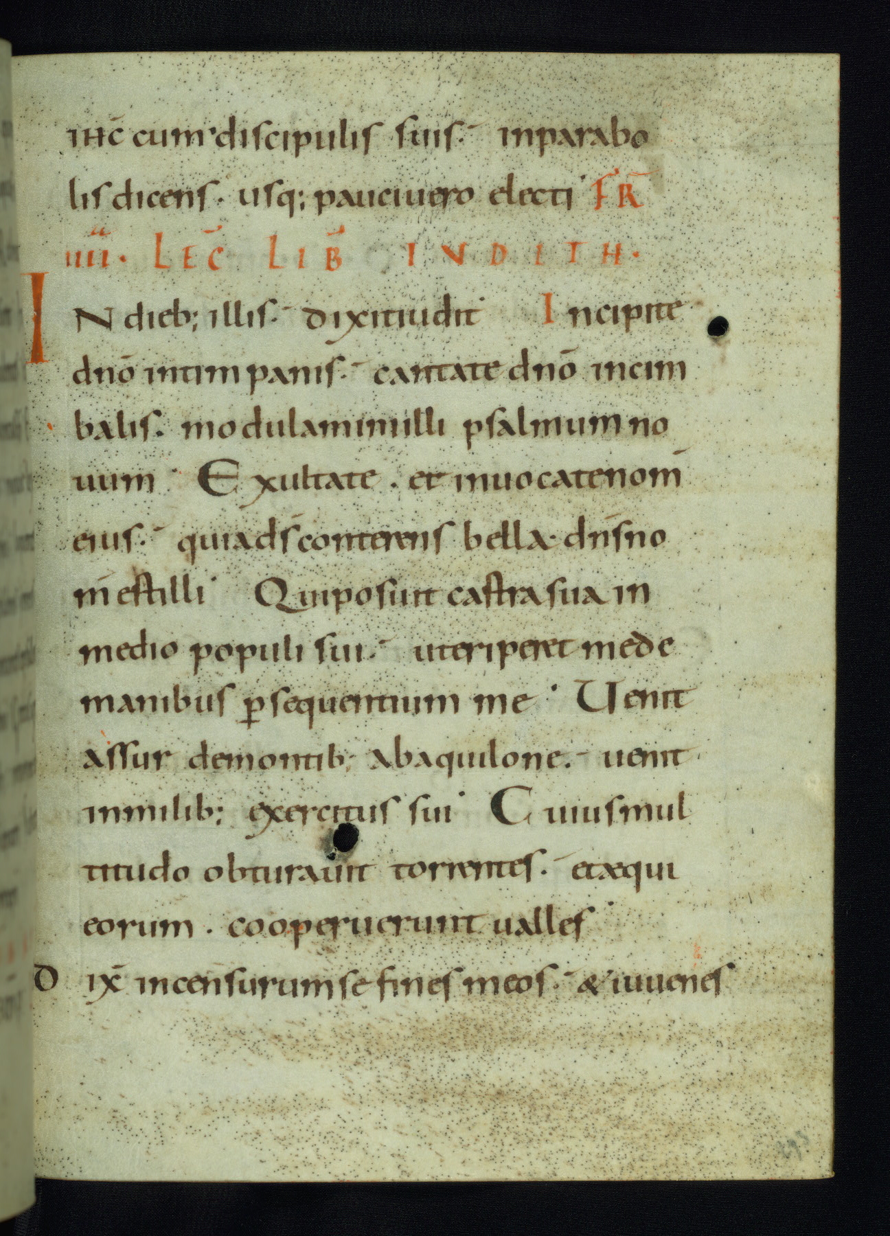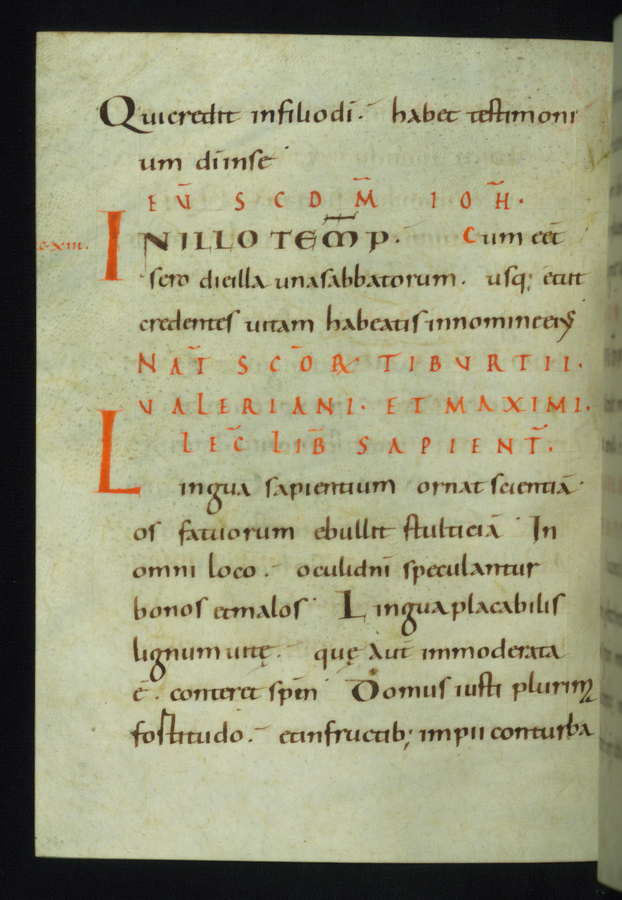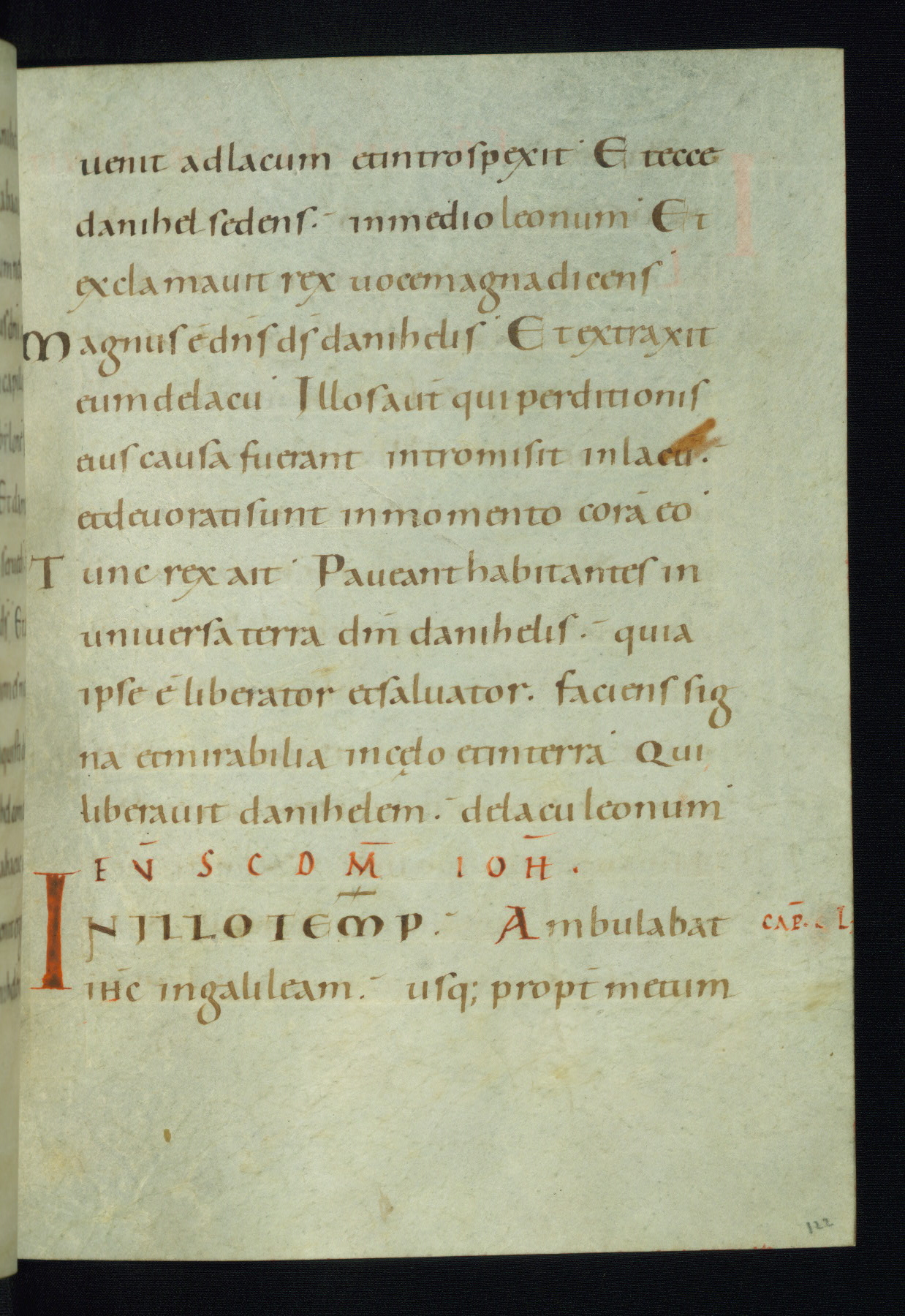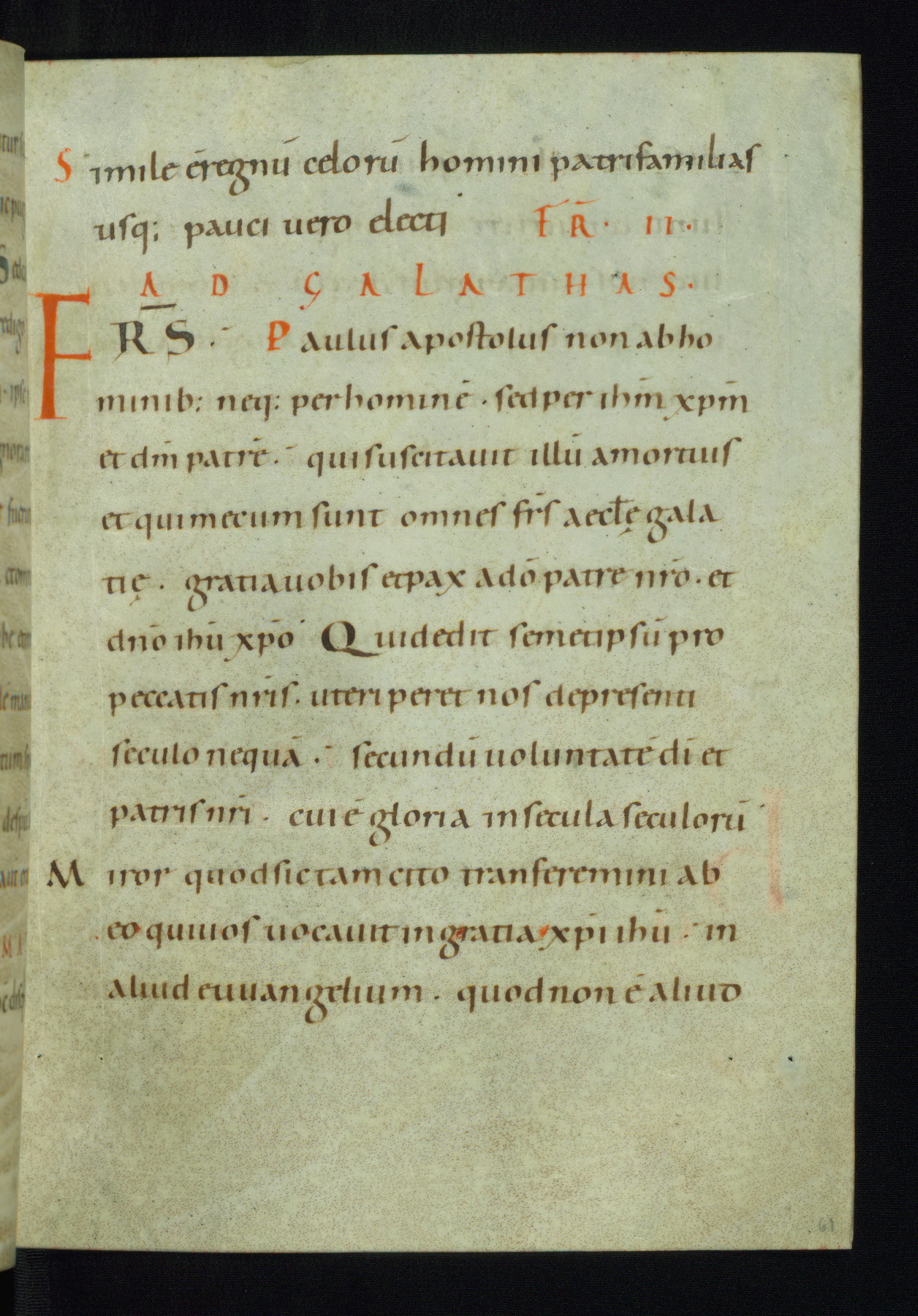 This Lectionary was created ca. 1000 in Trier. Written in a clear Caroline minuscule, it contains decorated initials at the openings of important readings. A set of illuminated letters marks the beginning of the Epistle and Gospel lessons for Easter; they display the hierarchy of scripts with capital letters decorated with gold leaf or drawn in red ink, followed by uncial and Caroline minuscule. Initials in orange, sometimes filled with gold, mark the divisions of the text. The book has been stylistically compared with Ottonian manuscripts, especially with a Psalter preserved in Trier (Stadtbibliothek, Ms. 7) illuminated by the so-called Master of the Registrum Gregorii.