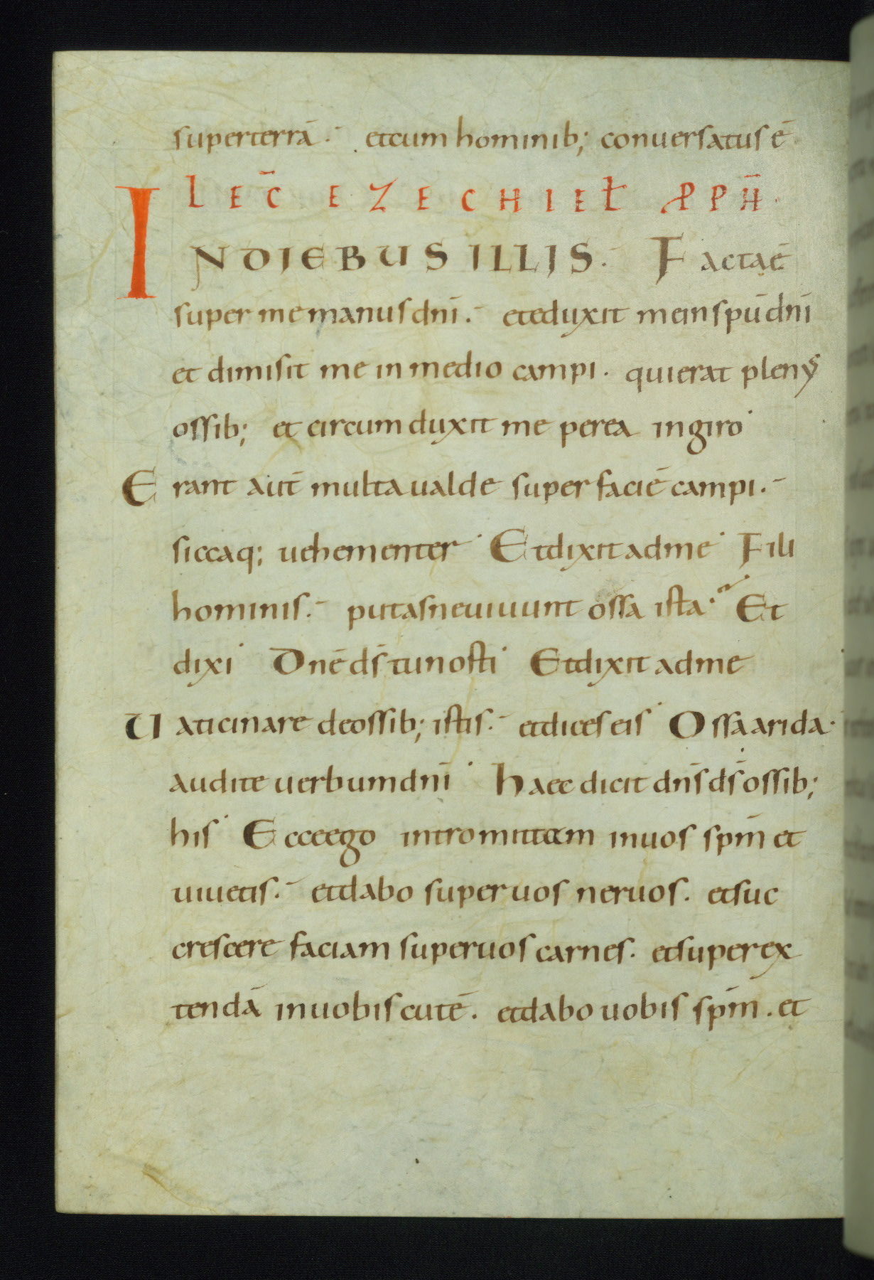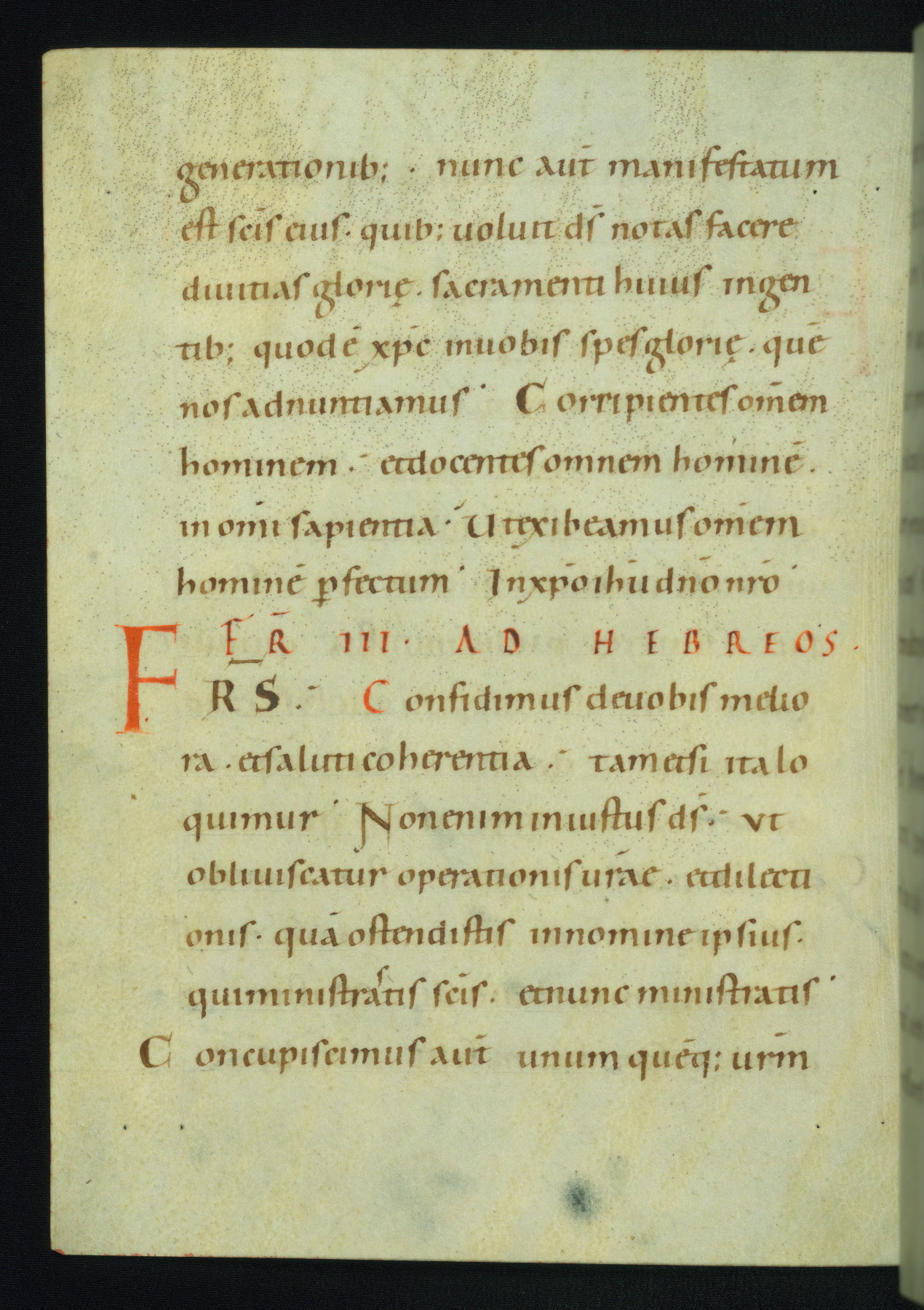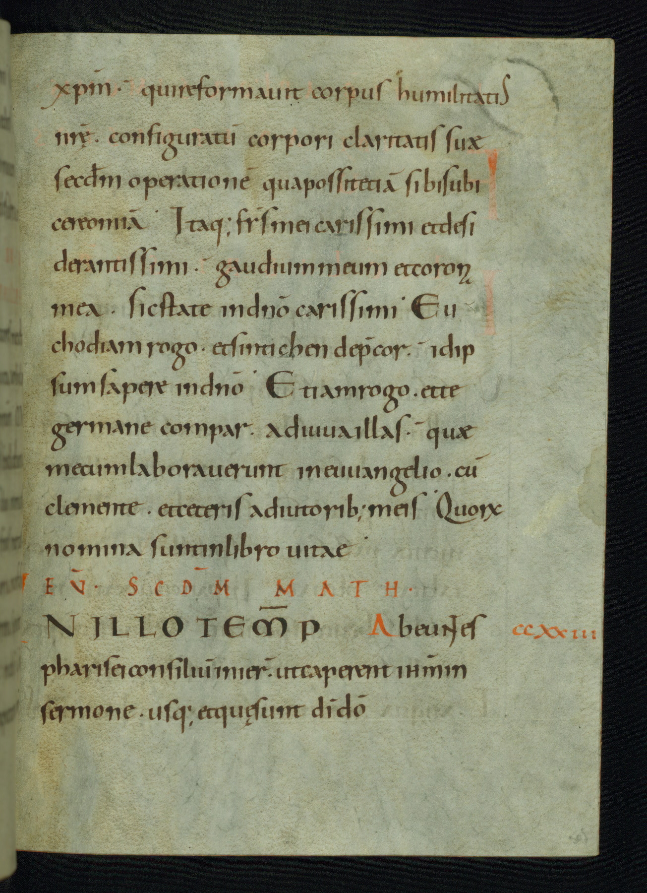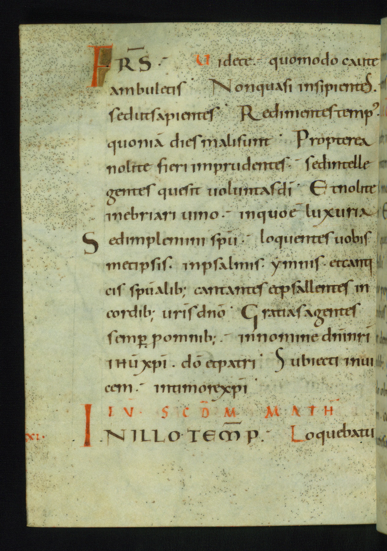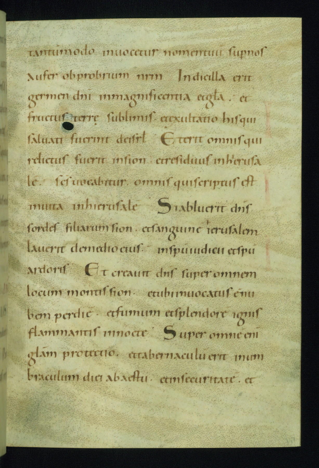 This Lectionary was created ca. 1000 in Trier. Written in a clear Caroline minuscule, it contains decorated initials at the openings of important readings. A set of illuminated letters marks the beginning of the Epistle and Gospel lessons for Easter; they display the hierarchy of scripts with capital letters decorated with gold leaf or drawn in red ink, followed by uncial and Caroline minuscule. Initials in orange, sometimes filled with gold, mark the divisions of the text. The book has been stylistically compared with Ottonian manuscripts, especially with a Psalter preserved in Trier (Stadtbibliothek, Ms. 7) illuminated by the so-called Master of the Registrum Gregorii.