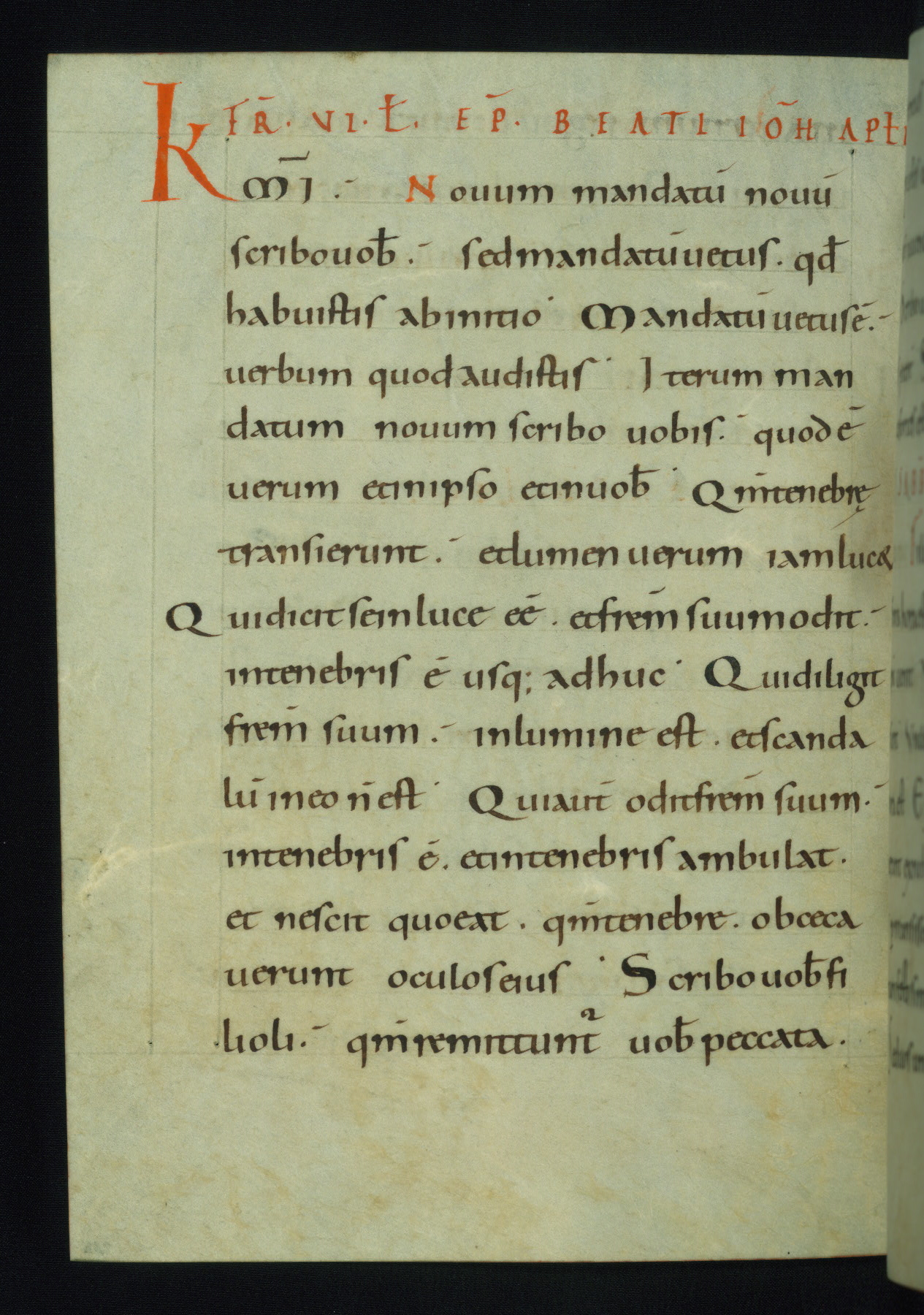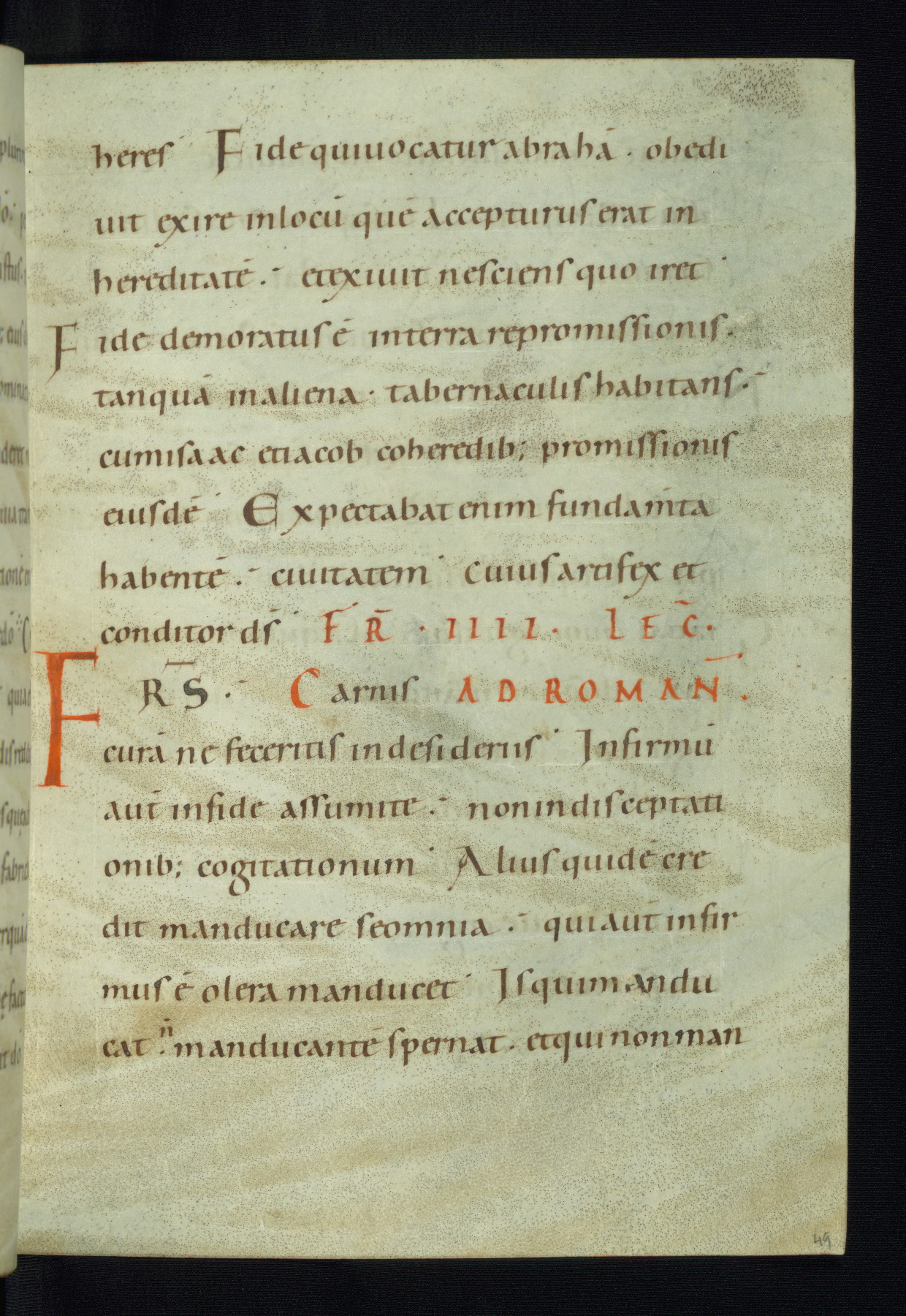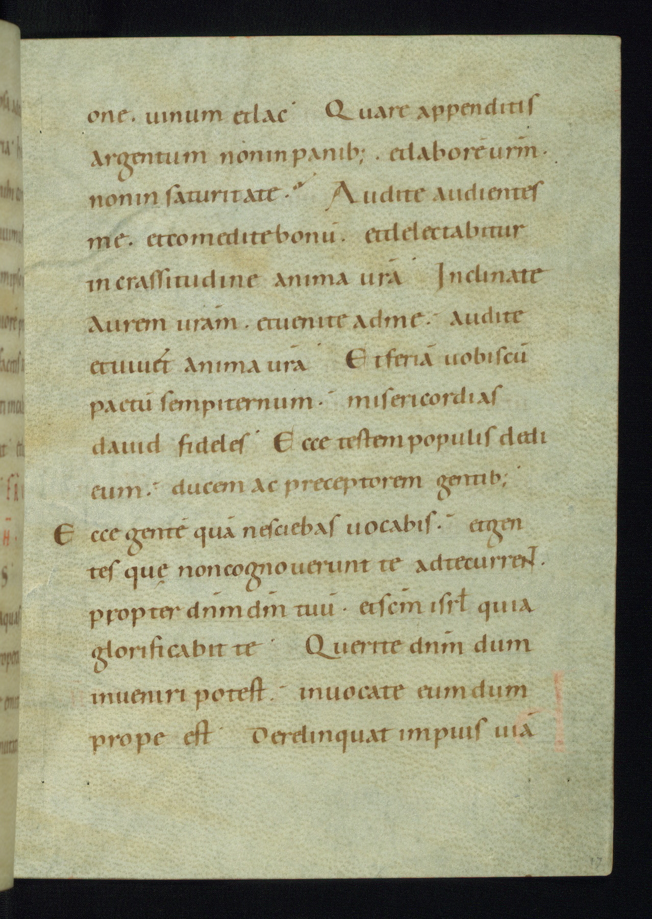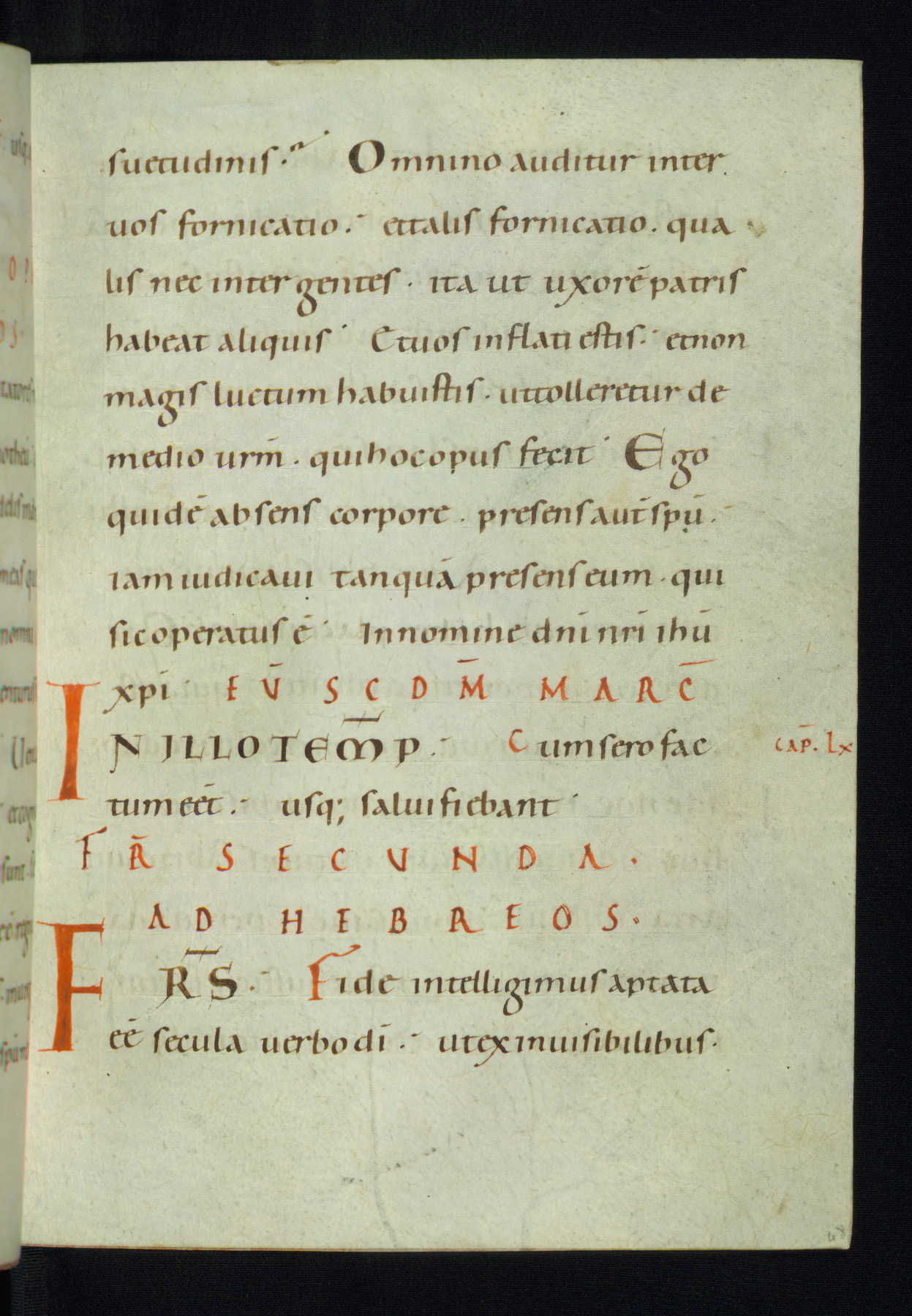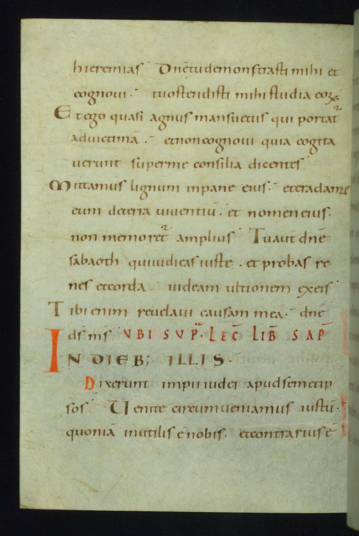 This Lectionary was created ca. 1000 in Trier. Written in a clear Caroline minuscule, it contains decorated initials at the openings of important readings. A set of illuminated letters marks the beginning of the Epistle and Gospel lessons for Easter; they display the hierarchy of scripts with capital letters decorated with gold leaf or drawn in red ink, followed by uncial and Caroline minuscule. Initials in orange, sometimes filled with gold, mark the divisions of the text. The book has been stylistically compared with Ottonian manuscripts, especially with a Psalter preserved in Trier (Stadtbibliothek, Ms. 7) illuminated by the so-called Master of the Registrum Gregorii.