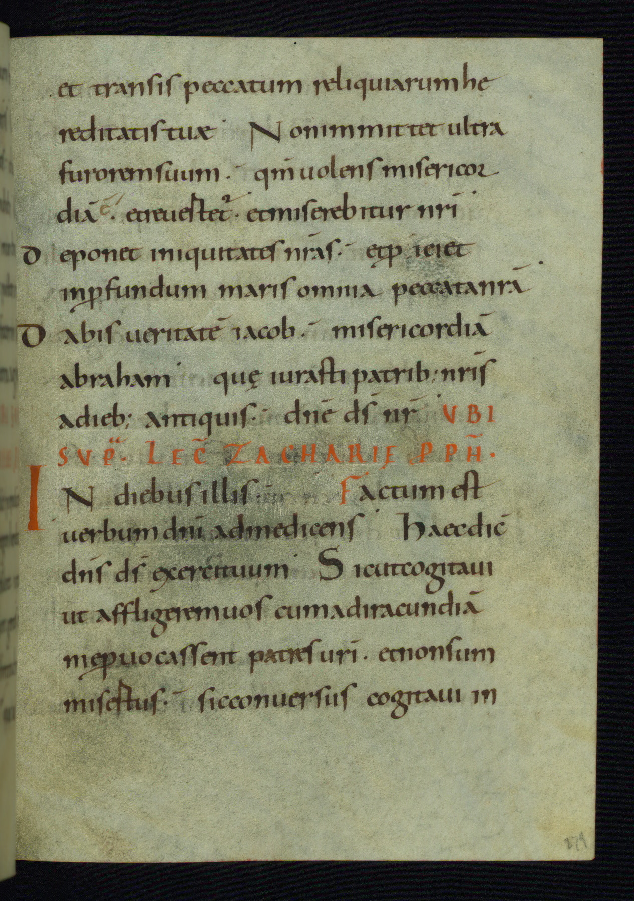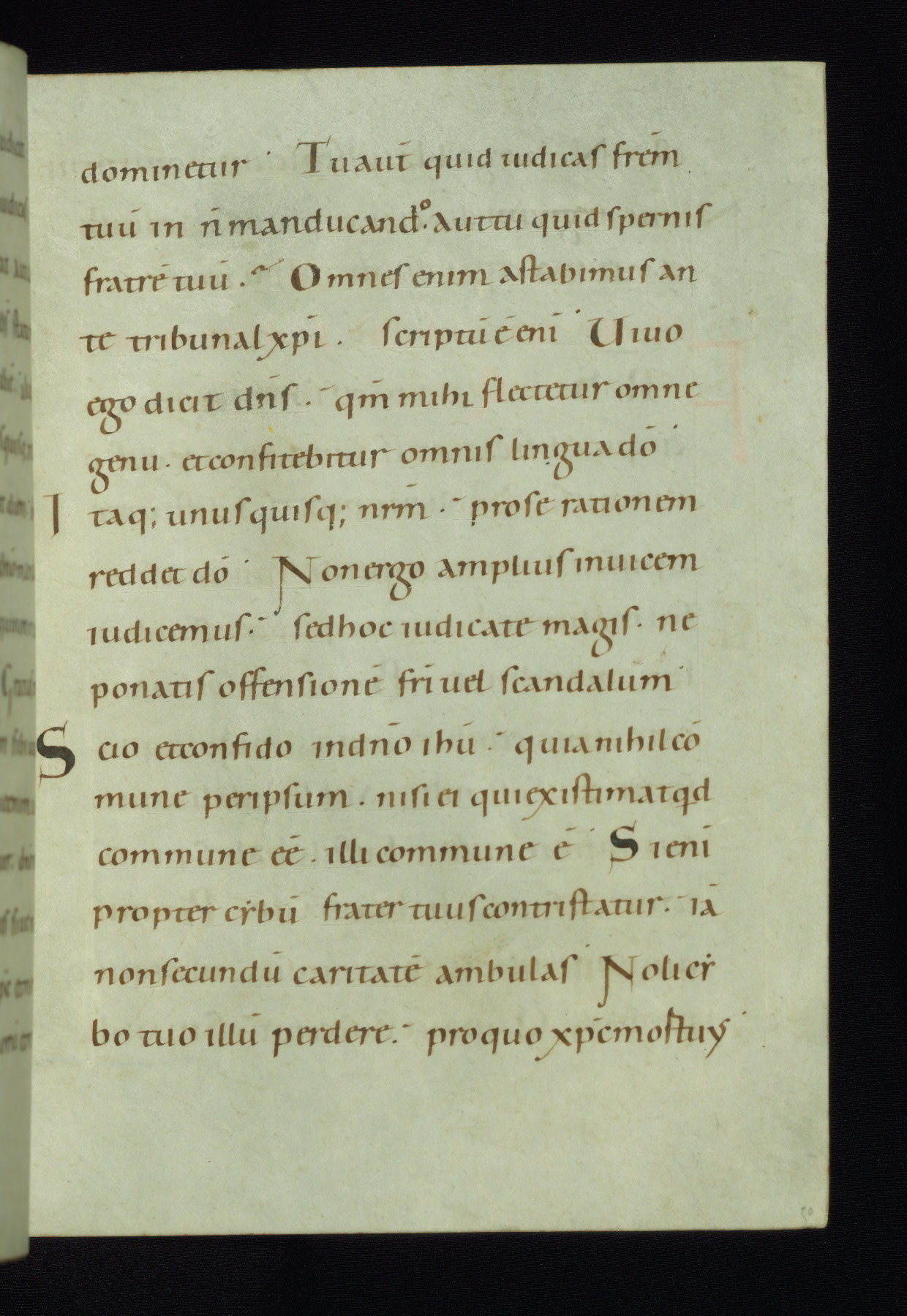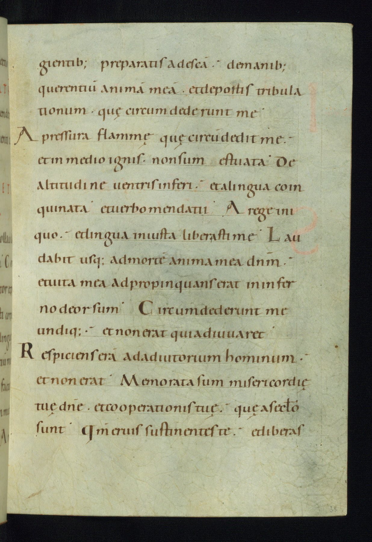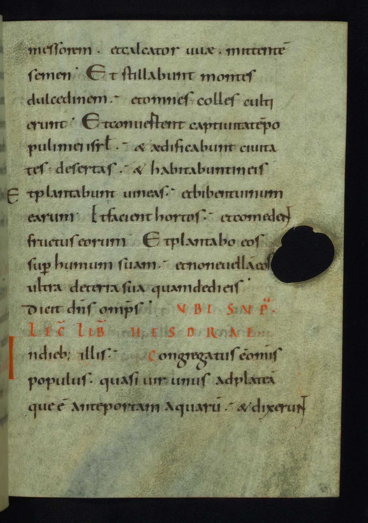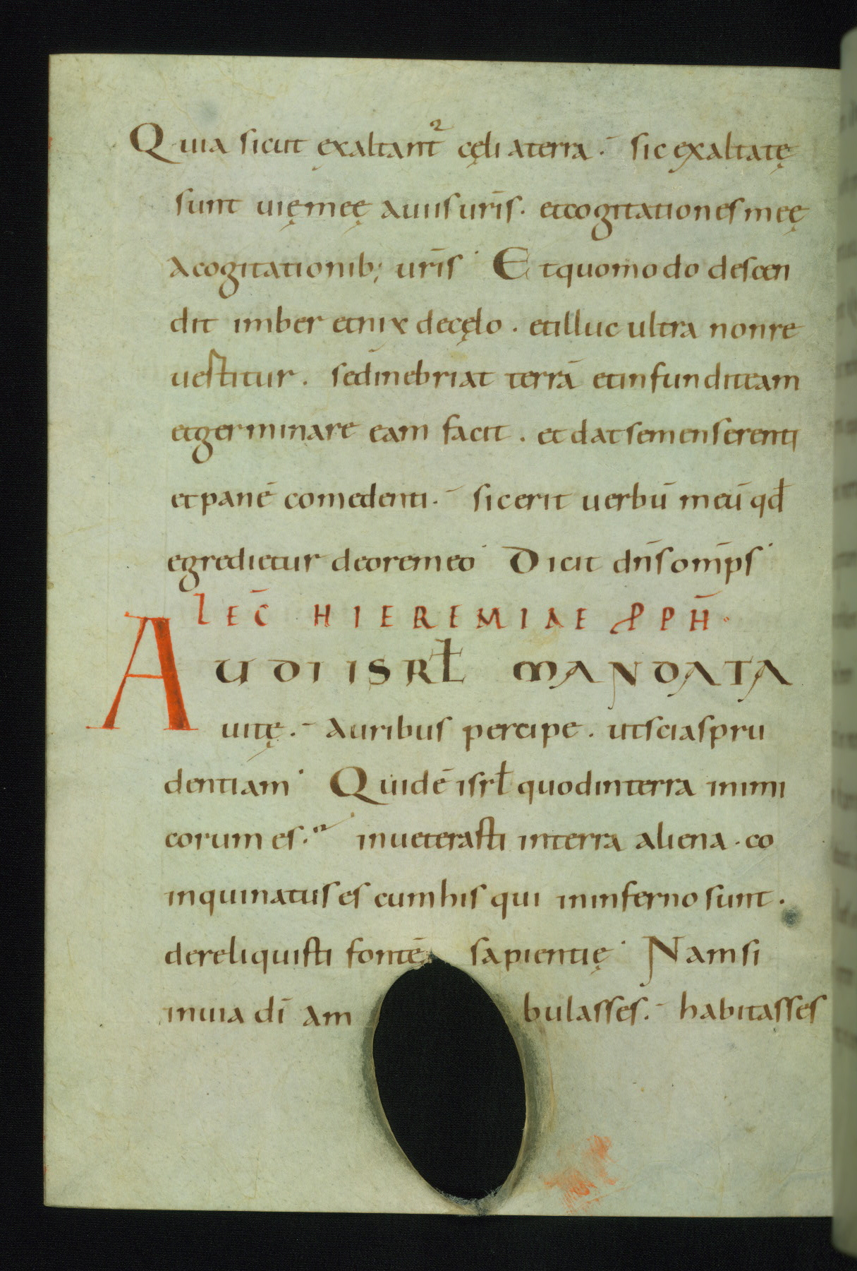 This Lectionary was created ca. 1000 in Trier. Written in a clear Caroline minuscule, it contains decorated initials at the openings of important readings. A set of illuminated letters marks the beginning of the Epistle and Gospel lessons for Easter; they display the hierarchy of scripts with capital letters decorated with gold leaf or drawn in red ink, followed by uncial and Caroline minuscule. Initials in orange, sometimes filled with gold, mark the divisions of the text. The book has been stylistically compared with Ottonian manuscripts, especially with a Psalter preserved in Trier (Stadtbibliothek, Ms. 7) illuminated by the so-called Master of the Registrum Gregorii.