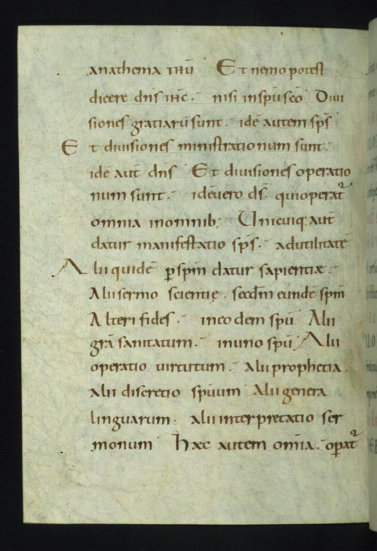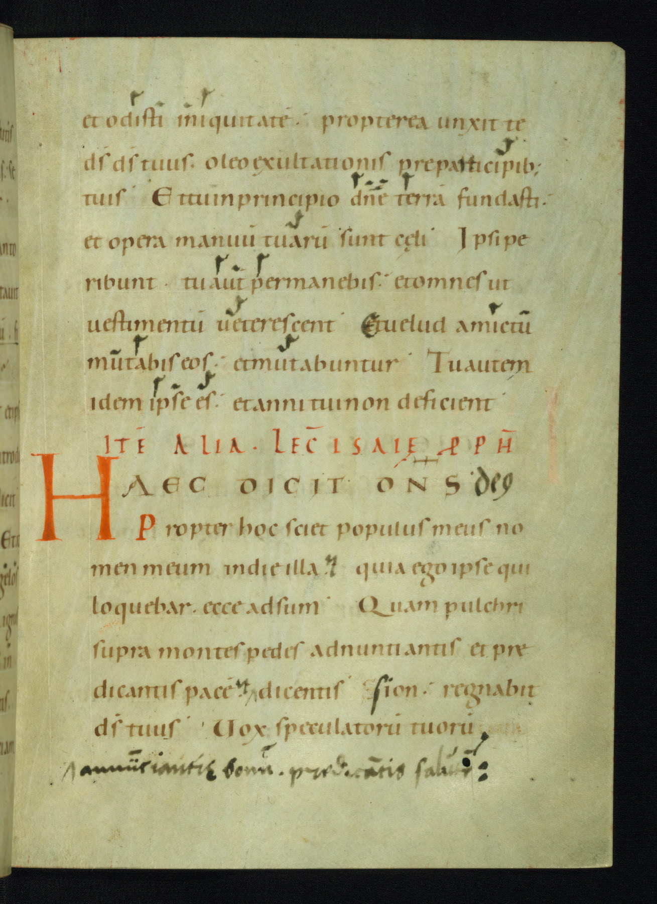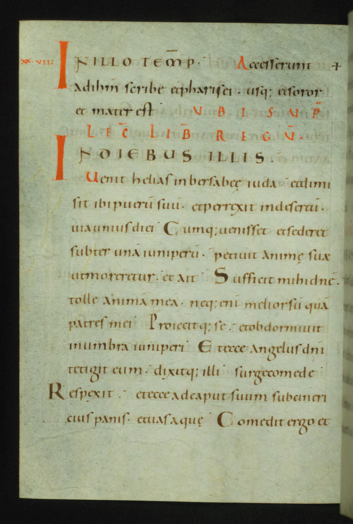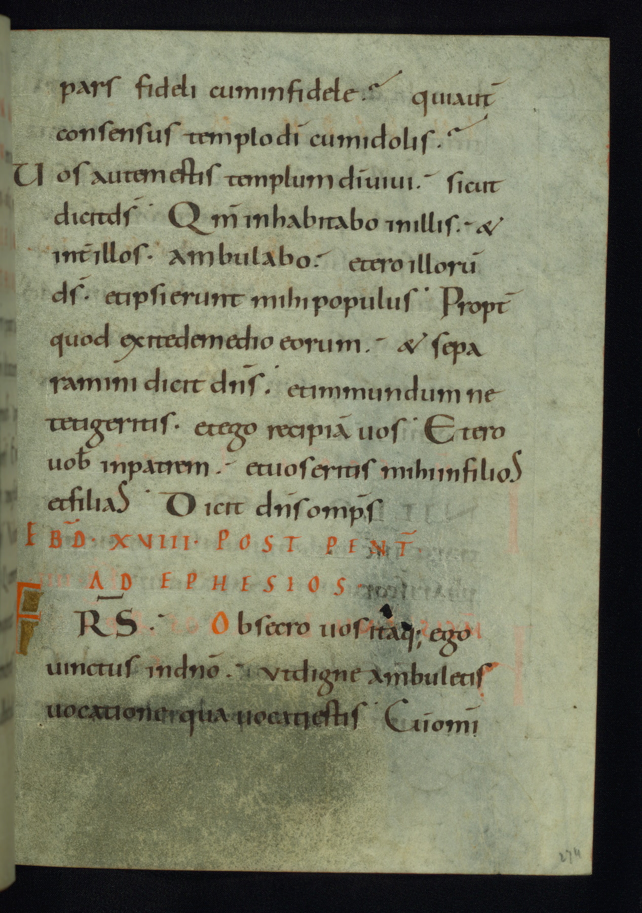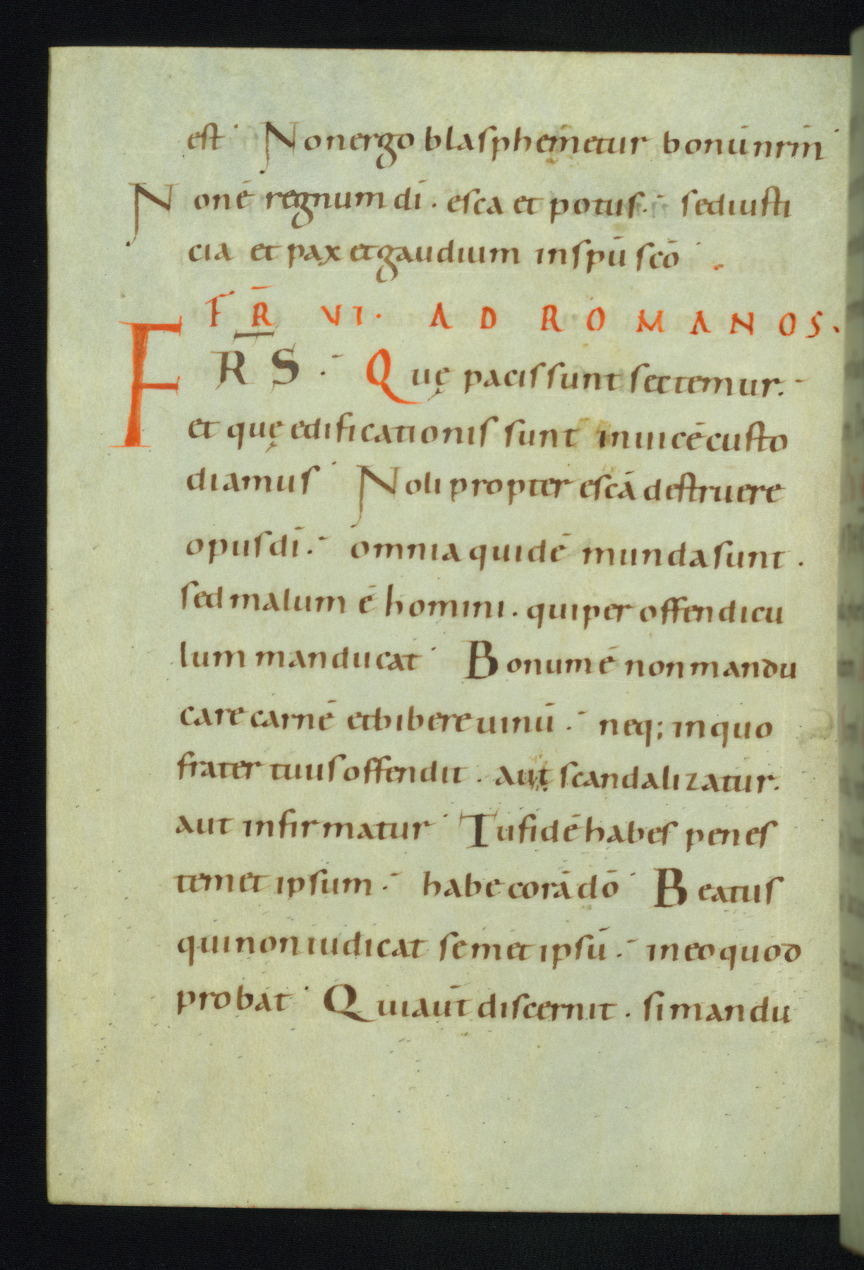 This Lectionary was created ca. 1000 in Trier. Written in a clear Caroline minuscule, it contains decorated initials at the openings of important readings. A set of illuminated letters marks the beginning of the Epistle and Gospel lessons for Easter; they display the hierarchy of scripts with capital letters decorated with gold leaf or drawn in red ink, followed by uncial and Caroline minuscule. Initials in orange, sometimes filled with gold, mark the divisions of the text. The book has been stylistically compared with Ottonian manuscripts, especially with a Psalter preserved in Trier (Stadtbibliothek, Ms. 7) illuminated by the so-called Master of the Registrum Gregorii.