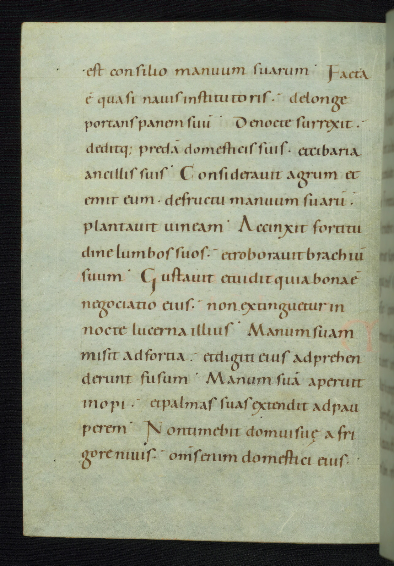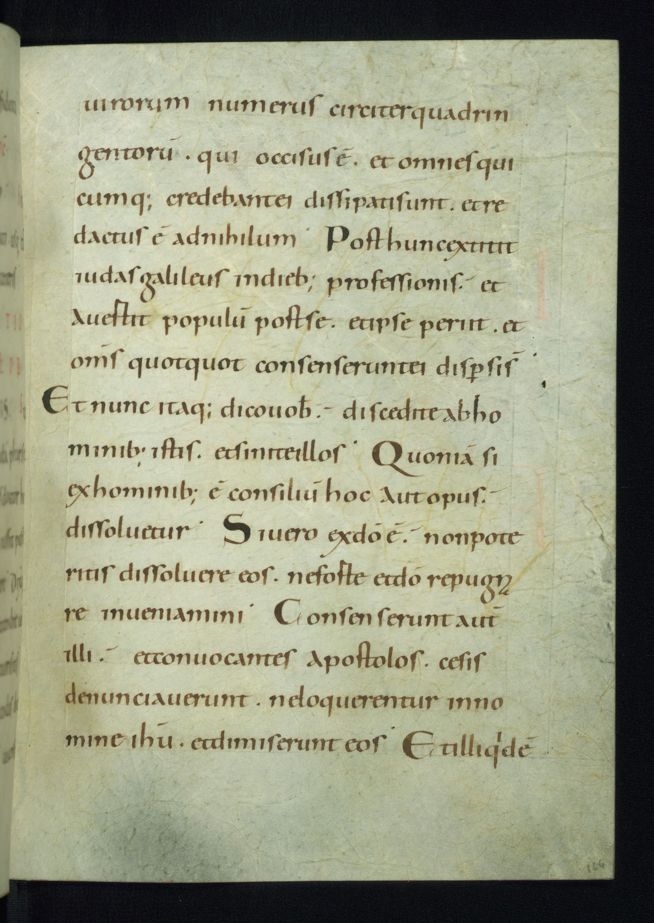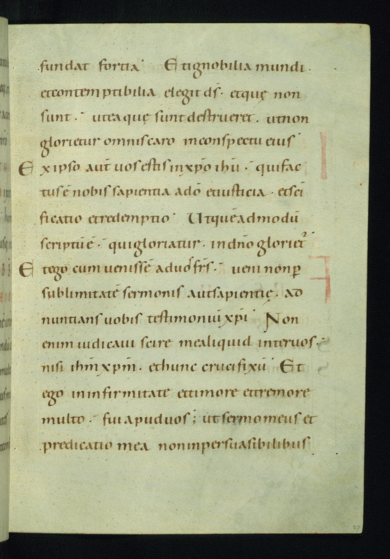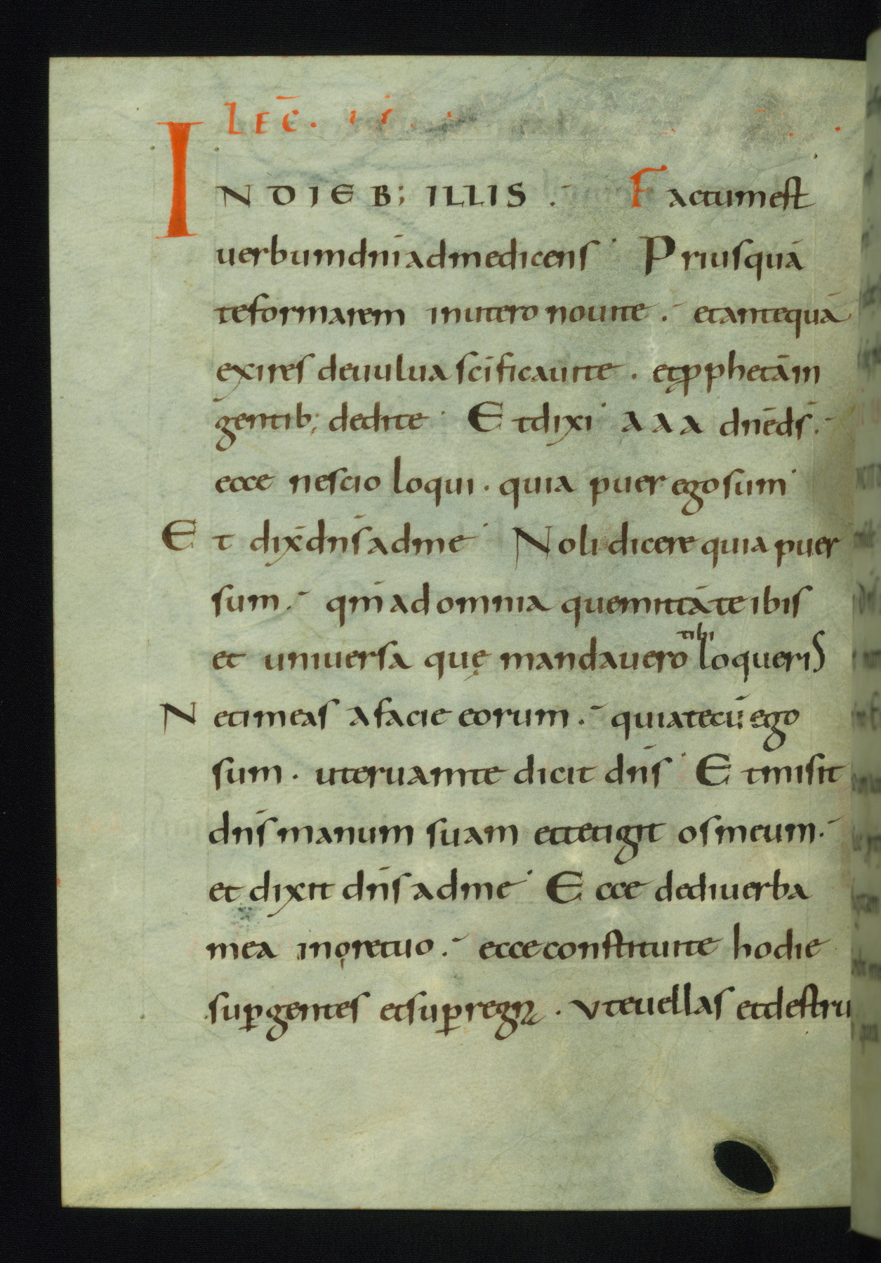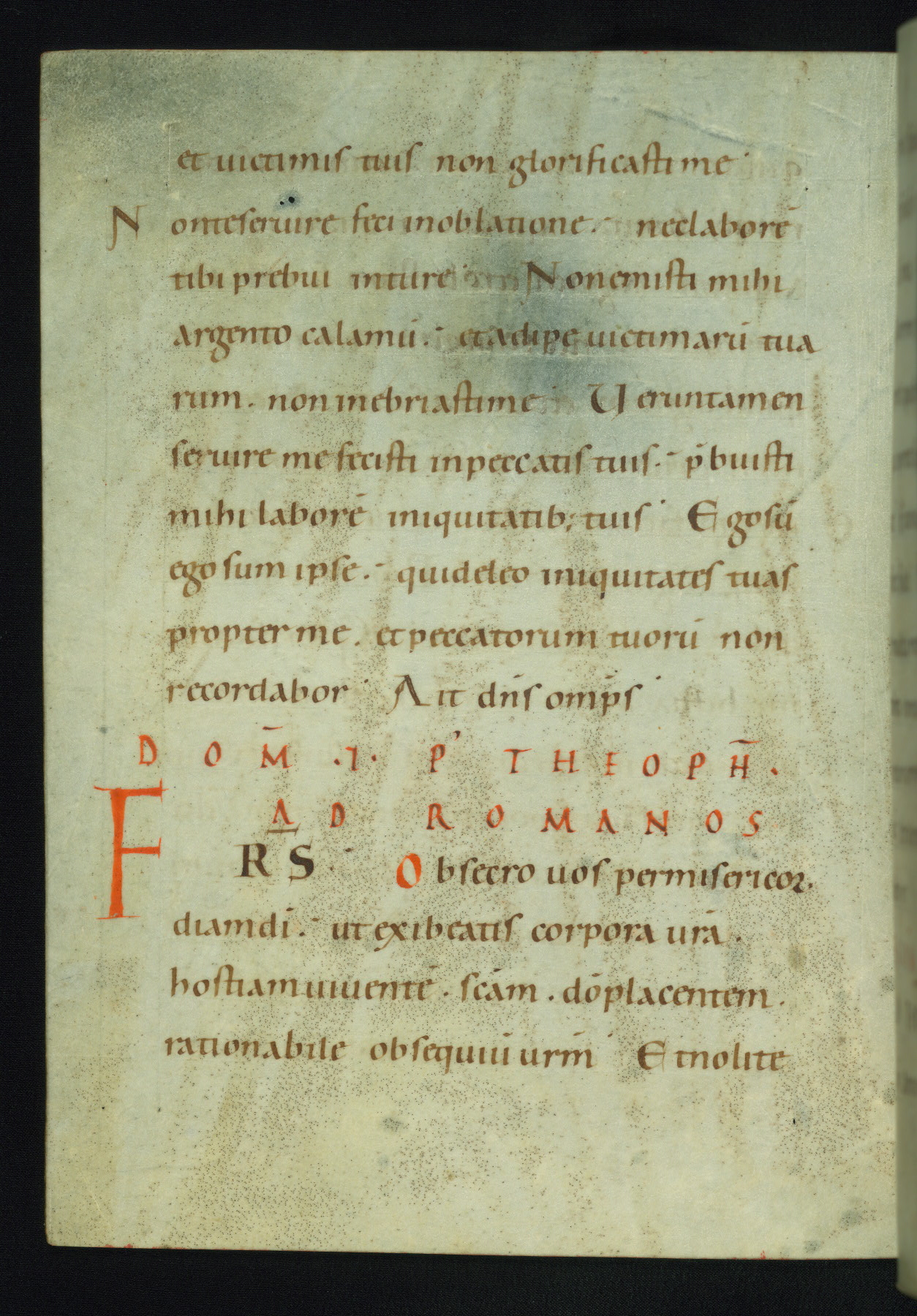 This Lectionary was created ca. 1000 in Trier. Written in a clear Caroline minuscule, it contains decorated initials at the openings of important readings. A set of illuminated letters marks the beginning of the Epistle and Gospel lessons for Easter; they display the hierarchy of scripts with capital letters decorated with gold leaf or drawn in red ink, followed by uncial and Caroline minuscule. Initials in orange, sometimes filled with gold, mark the divisions of the text. The book has been stylistically compared with Ottonian manuscripts, especially with a Psalter preserved in Trier (Stadtbibliothek, Ms. 7) illuminated by the so-called Master of the Registrum Gregorii.