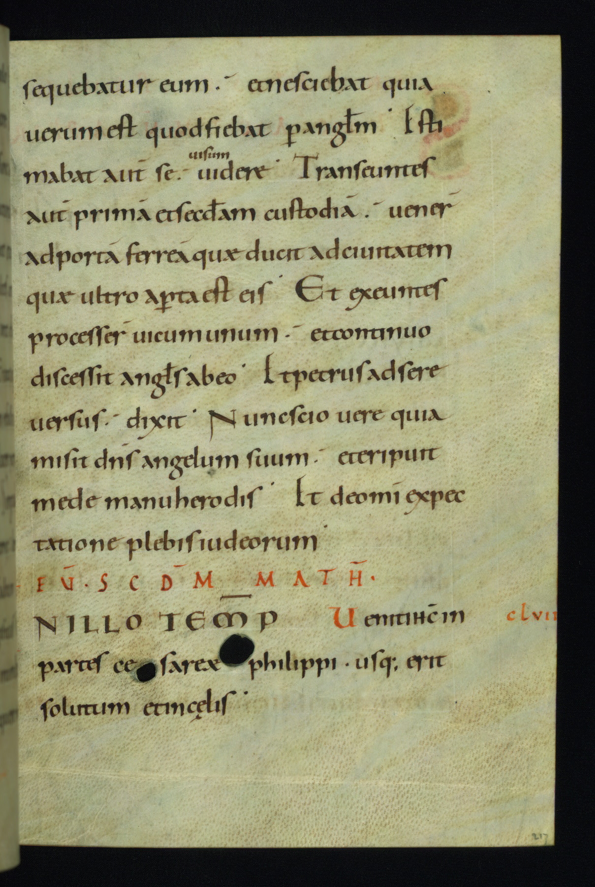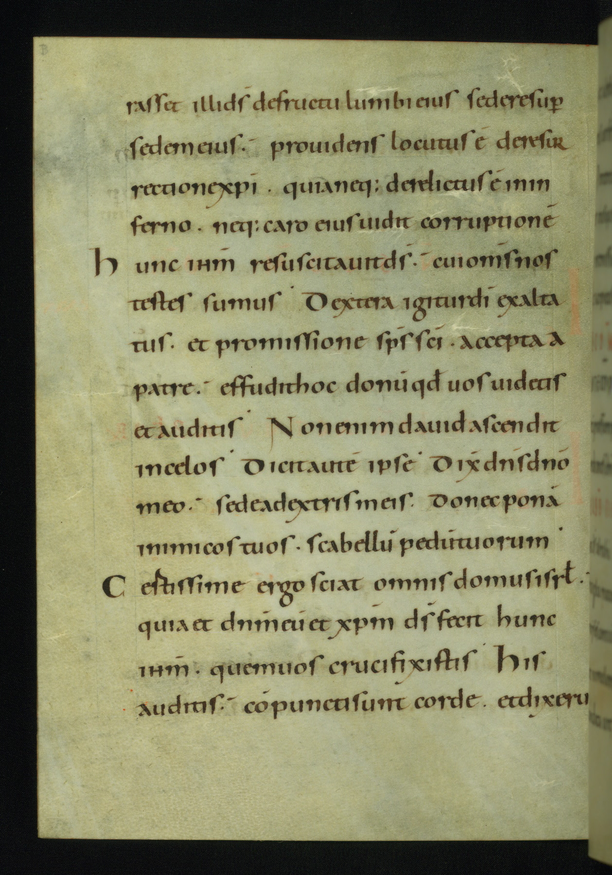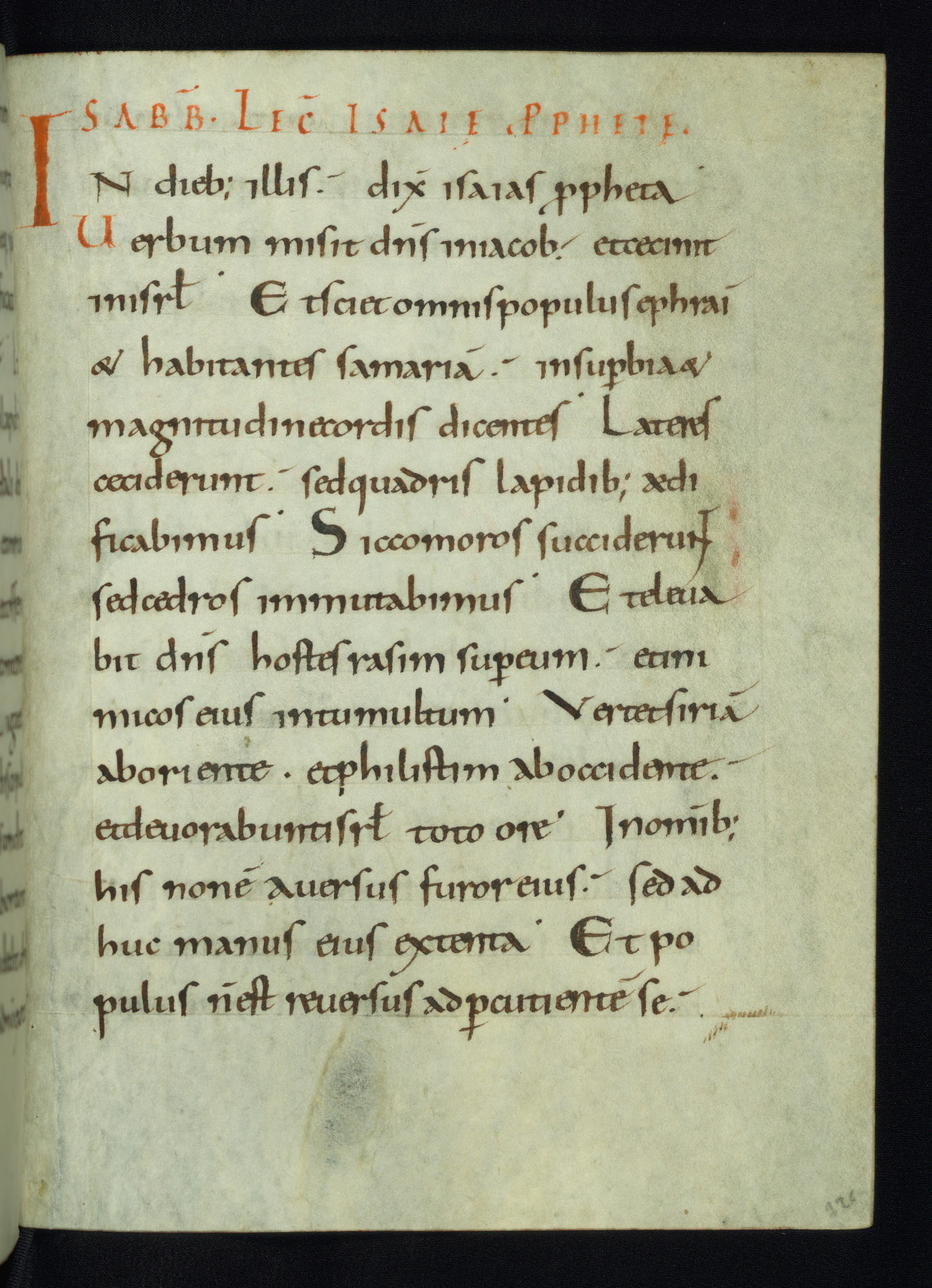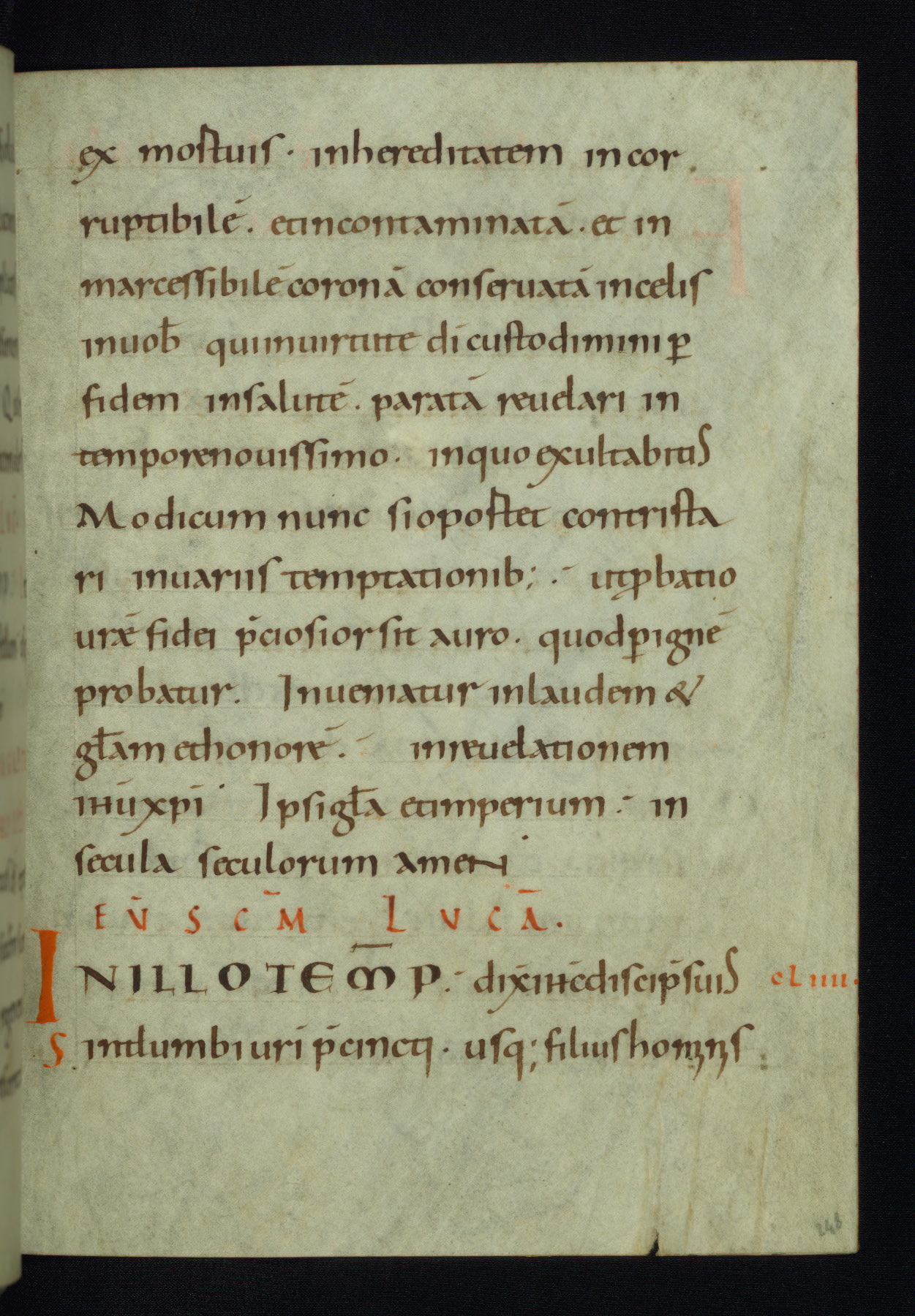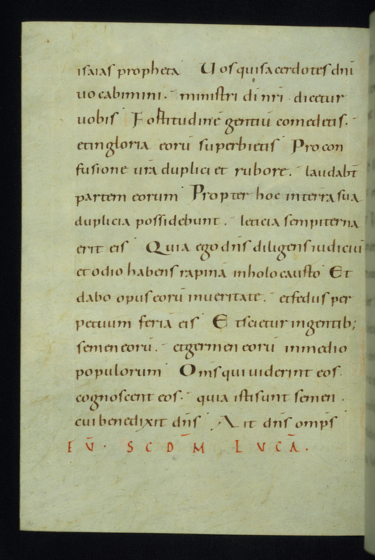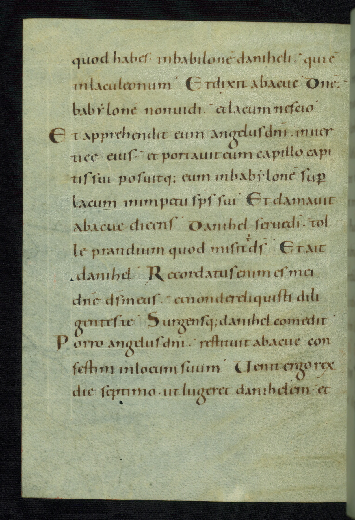 This Lectionary was created ca. 1000 in Trier. Written in a clear Caroline minuscule, it contains decorated initials at the openings of important readings. A set of illuminated letters marks the beginning of the Epistle and Gospel lessons for Easter; they display the hierarchy of scripts with capital letters decorated with gold leaf or drawn in red ink, followed by uncial and Caroline minuscule. Initials in orange, sometimes filled with gold, mark the divisions of the text. The book has been stylistically compared with Ottonian manuscripts, especially with a Psalter preserved in Trier (Stadtbibliothek, Ms. 7) illuminated by the so-called Master of the Registrum Gregorii.