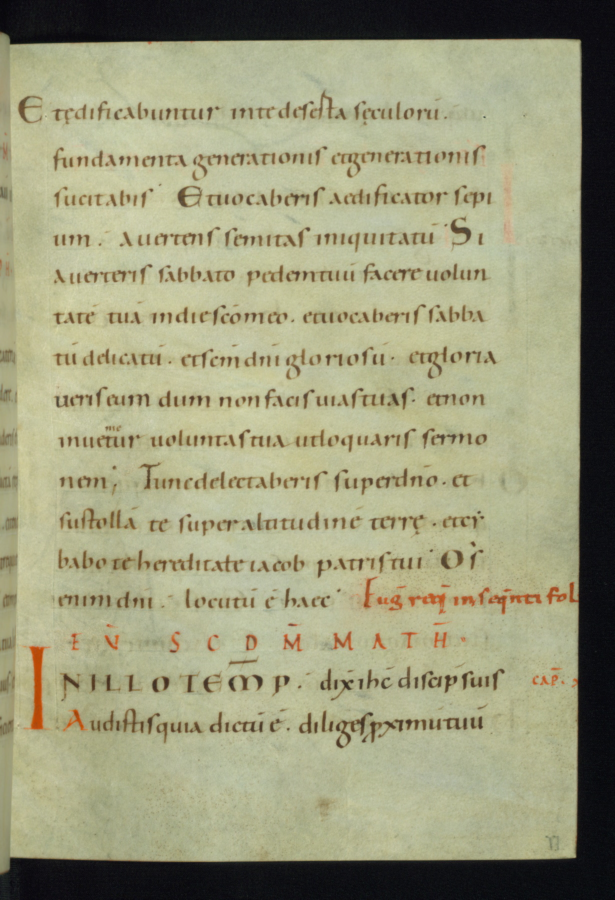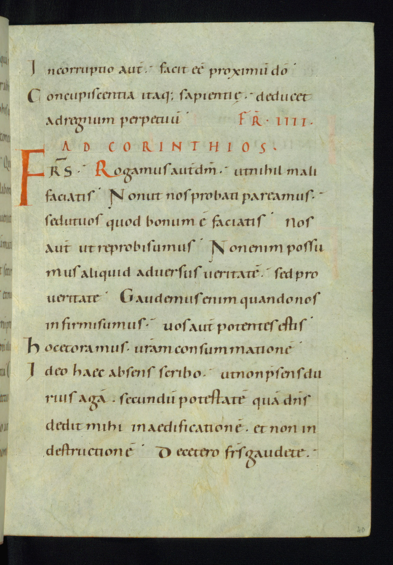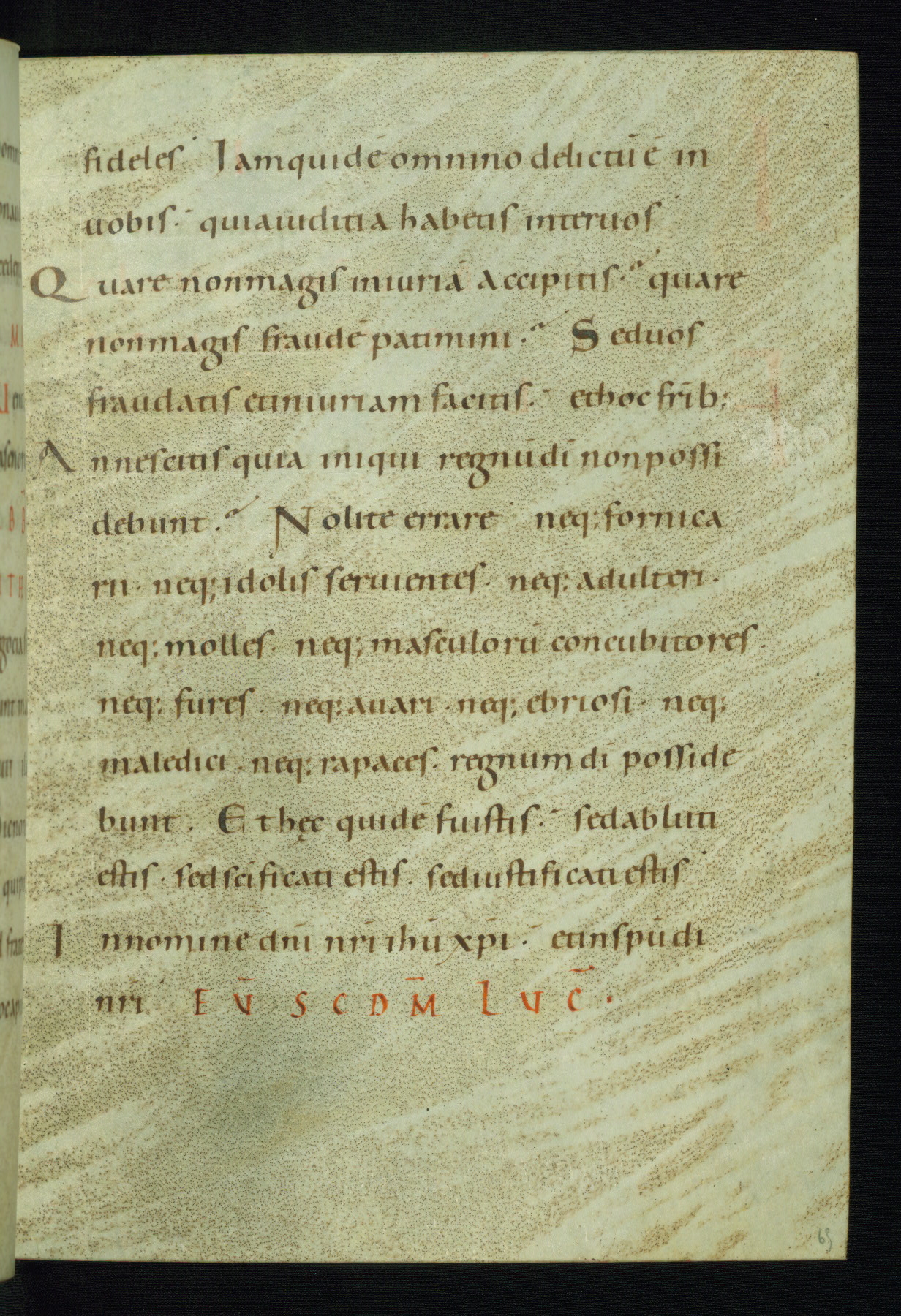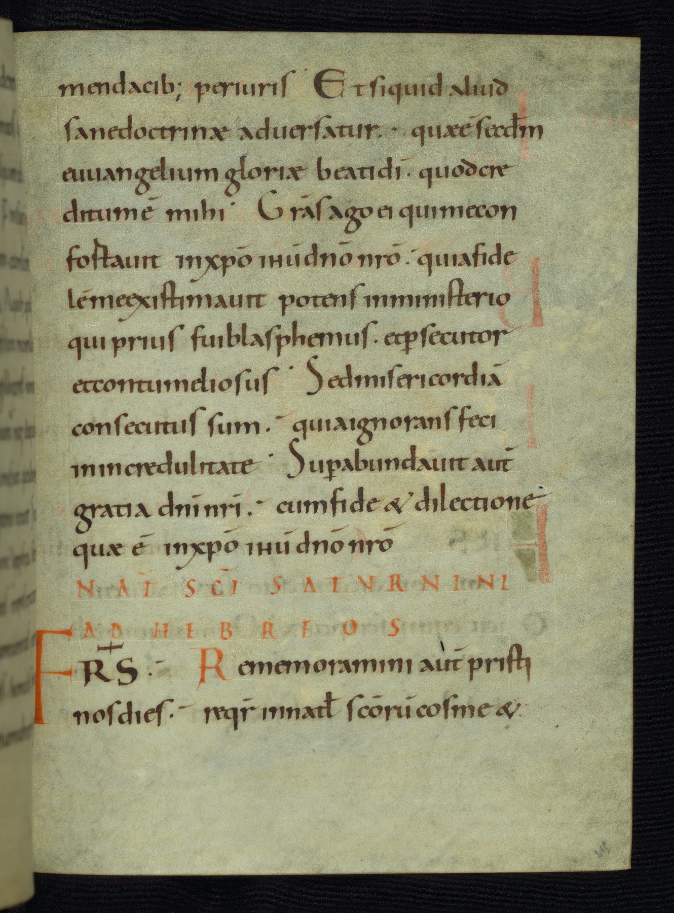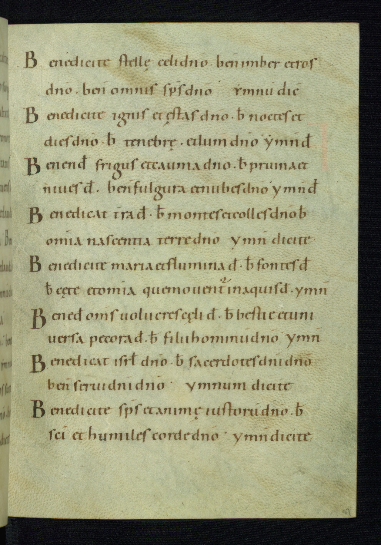 This Lectionary was created ca. 1000 in Trier. Written in a clear Caroline minuscule, it contains decorated initials at the openings of important readings. A set of illuminated letters marks the beginning of the Epistle and Gospel lessons for Easter; they display the hierarchy of scripts with capital letters decorated with gold leaf or drawn in red ink, followed by uncial and Caroline minuscule. Initials in orange, sometimes filled with gold, mark the divisions of the text. The book has been stylistically compared with Ottonian manuscripts, especially with a Psalter preserved in Trier (Stadtbibliothek, Ms. 7) illuminated by the so-called Master of the Registrum Gregorii.