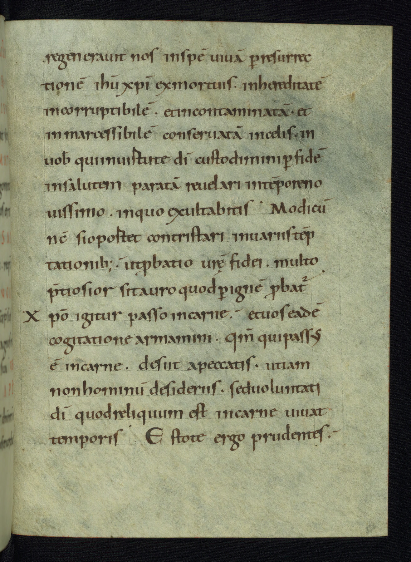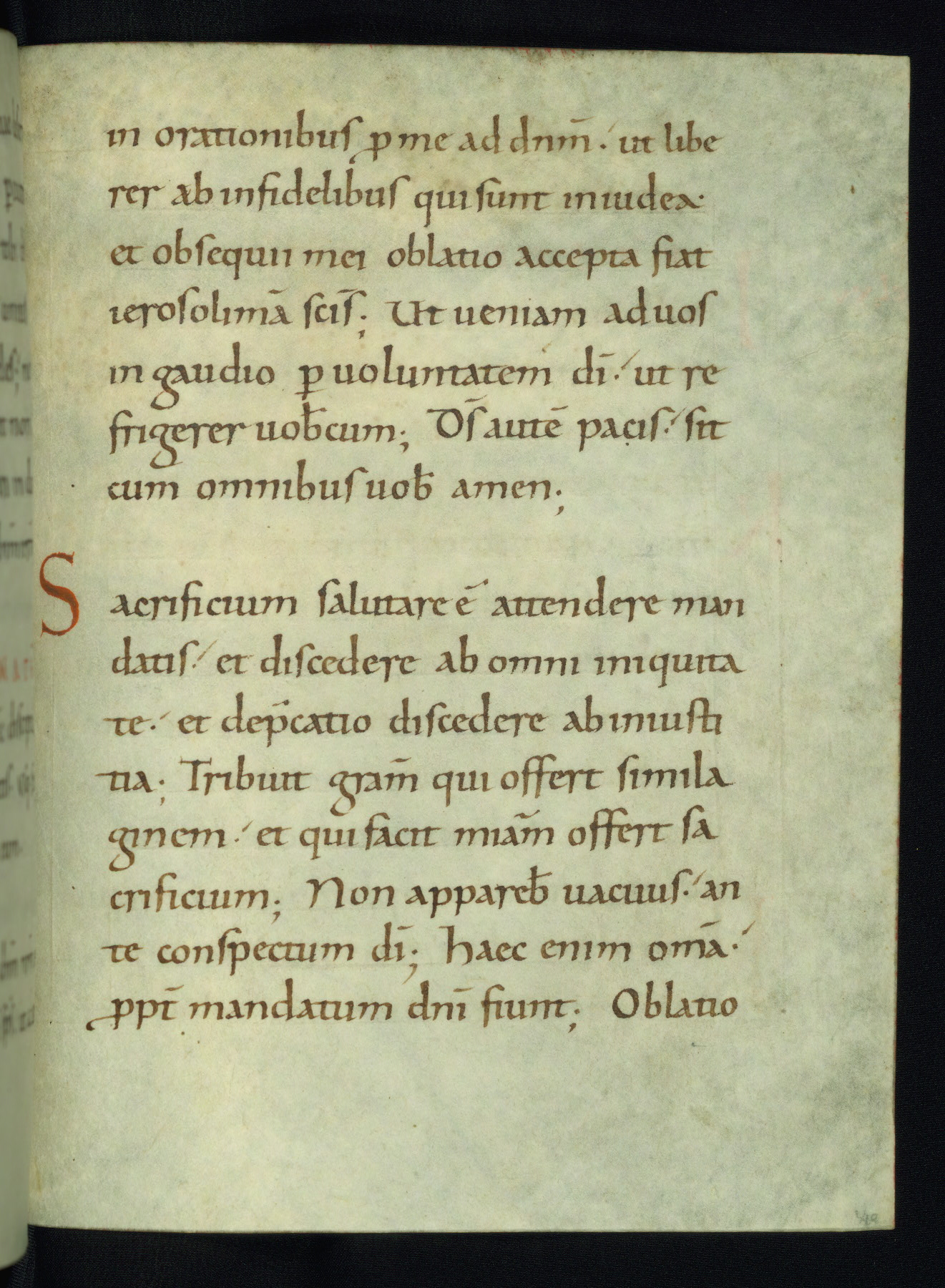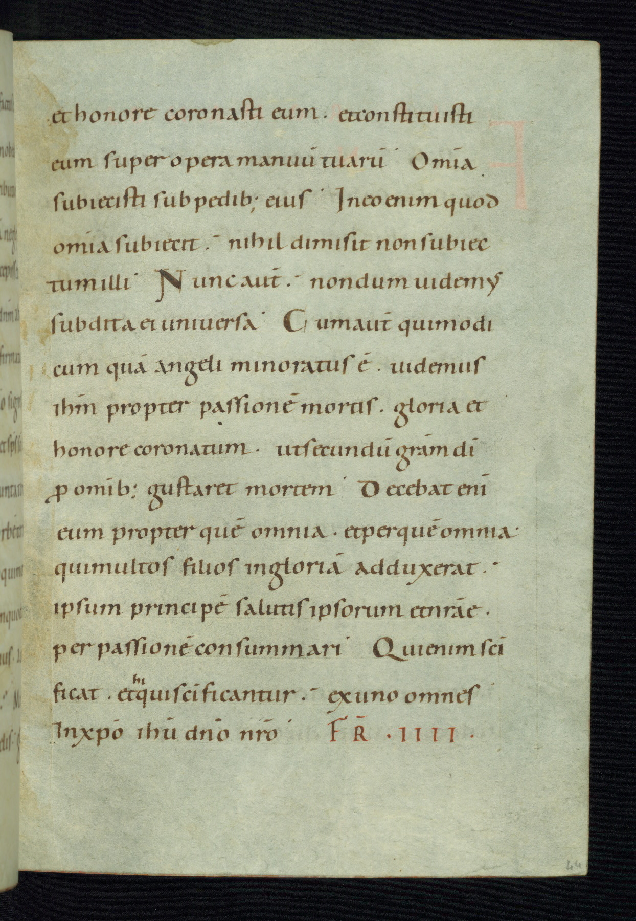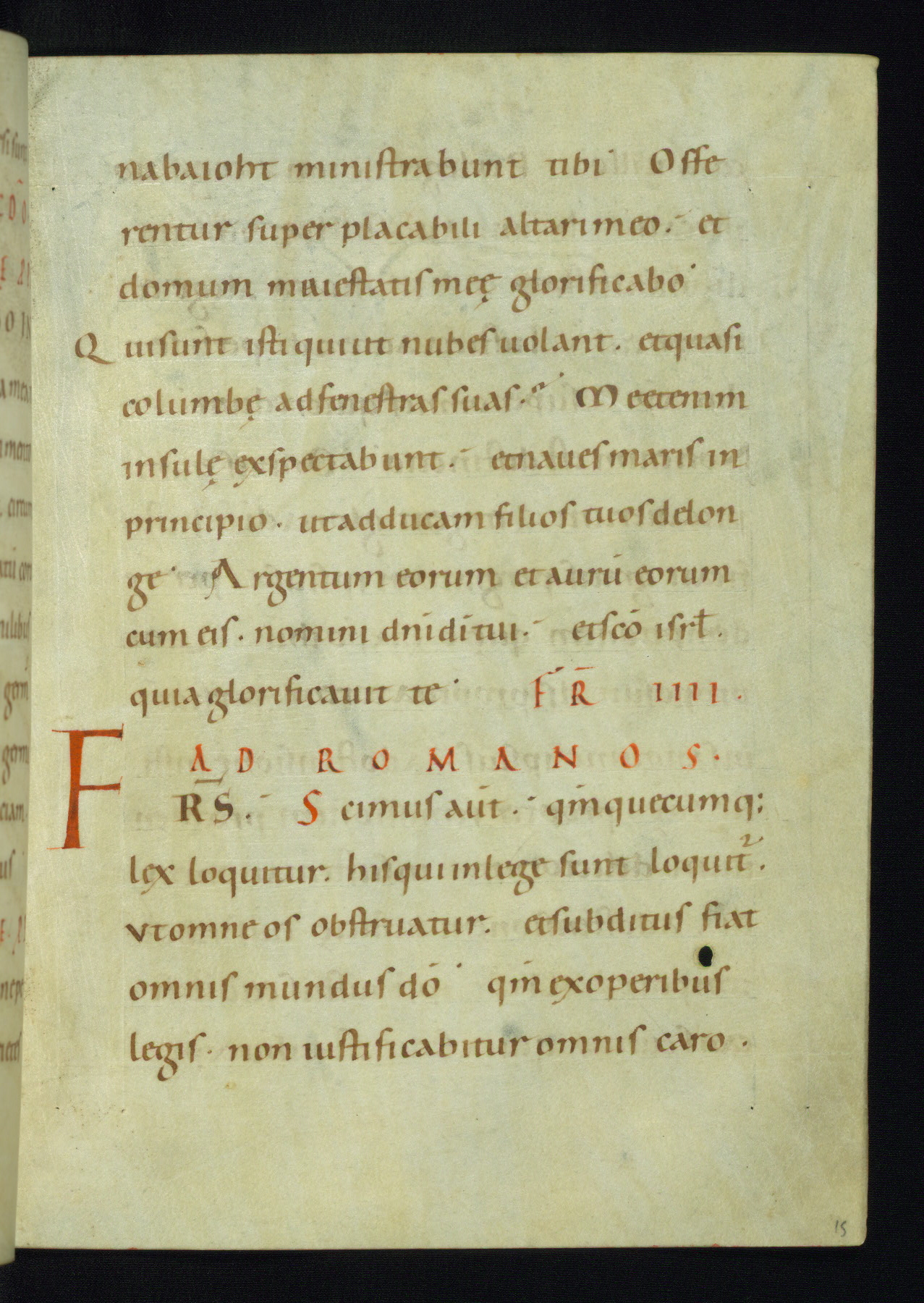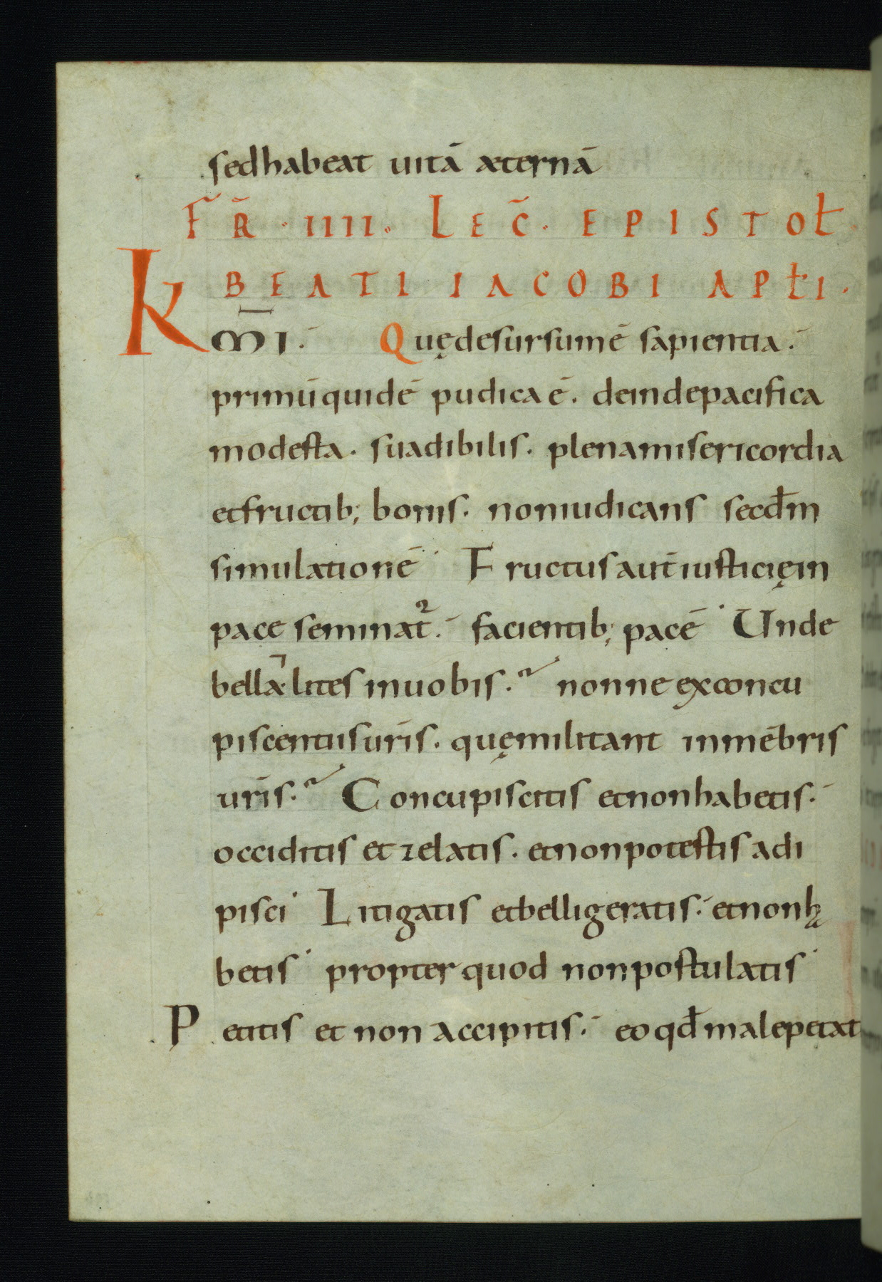 This Lectionary was created ca. 1000 in Trier. Written in a clear Caroline minuscule, it contains decorated initials at the openings of important readings. A set of illuminated letters marks the beginning of the Epistle and Gospel lessons for Easter; they display the hierarchy of scripts with capital letters decorated with gold leaf or drawn in red ink, followed by uncial and Caroline minuscule. Initials in orange, sometimes filled with gold, mark the divisions of the text. The book has been stylistically compared with Ottonian manuscripts, especially with a Psalter preserved in Trier (Stadtbibliothek, Ms. 7) illuminated by the so-called Master of the Registrum Gregorii.