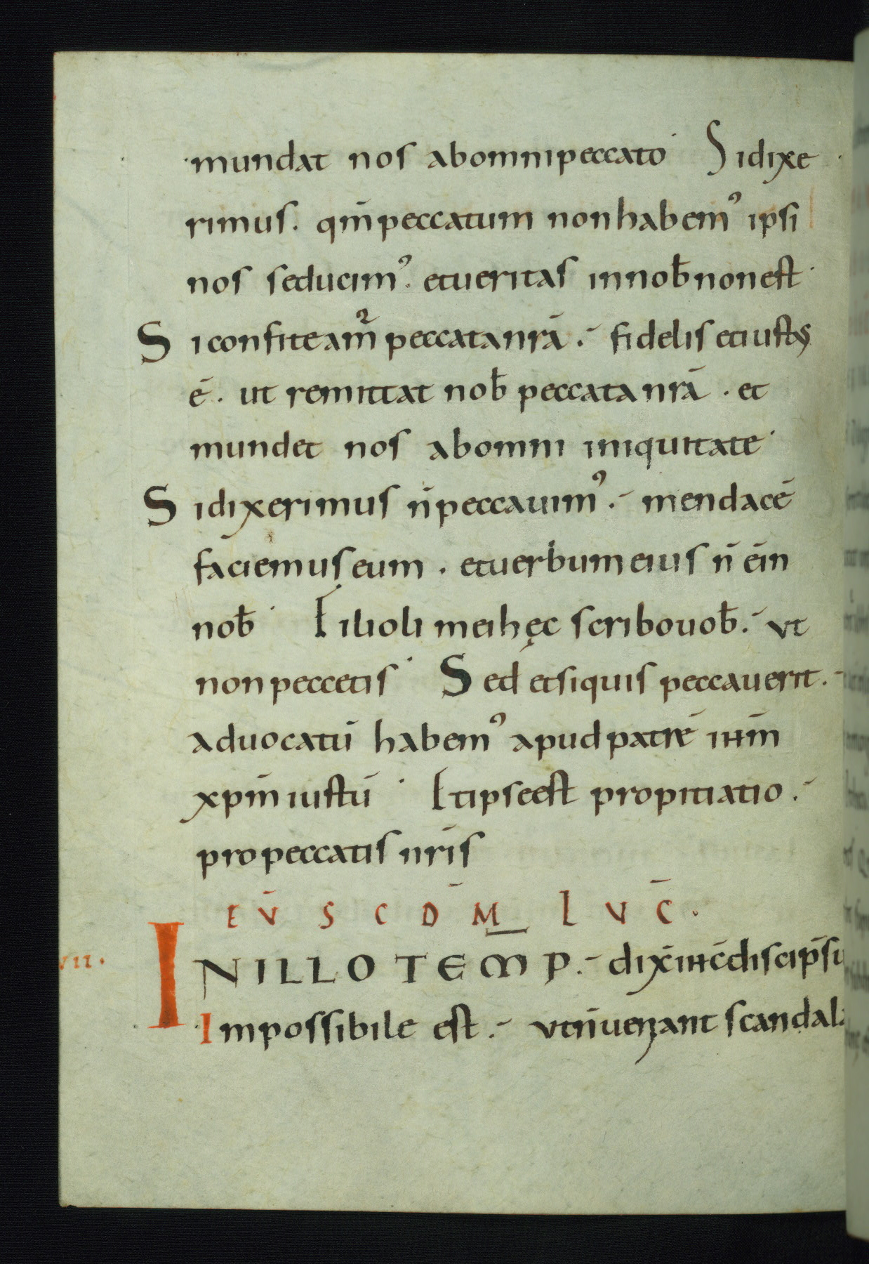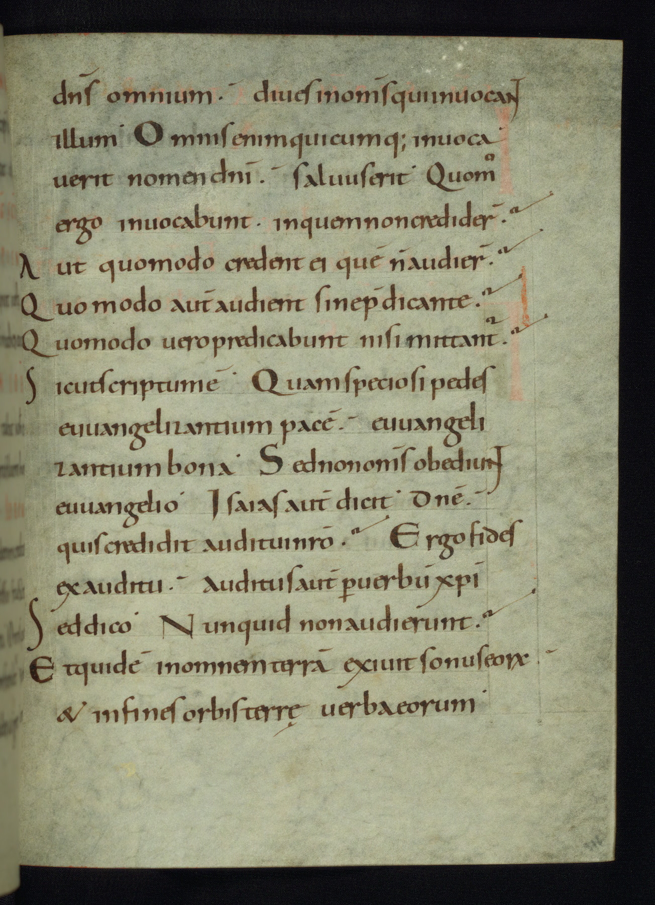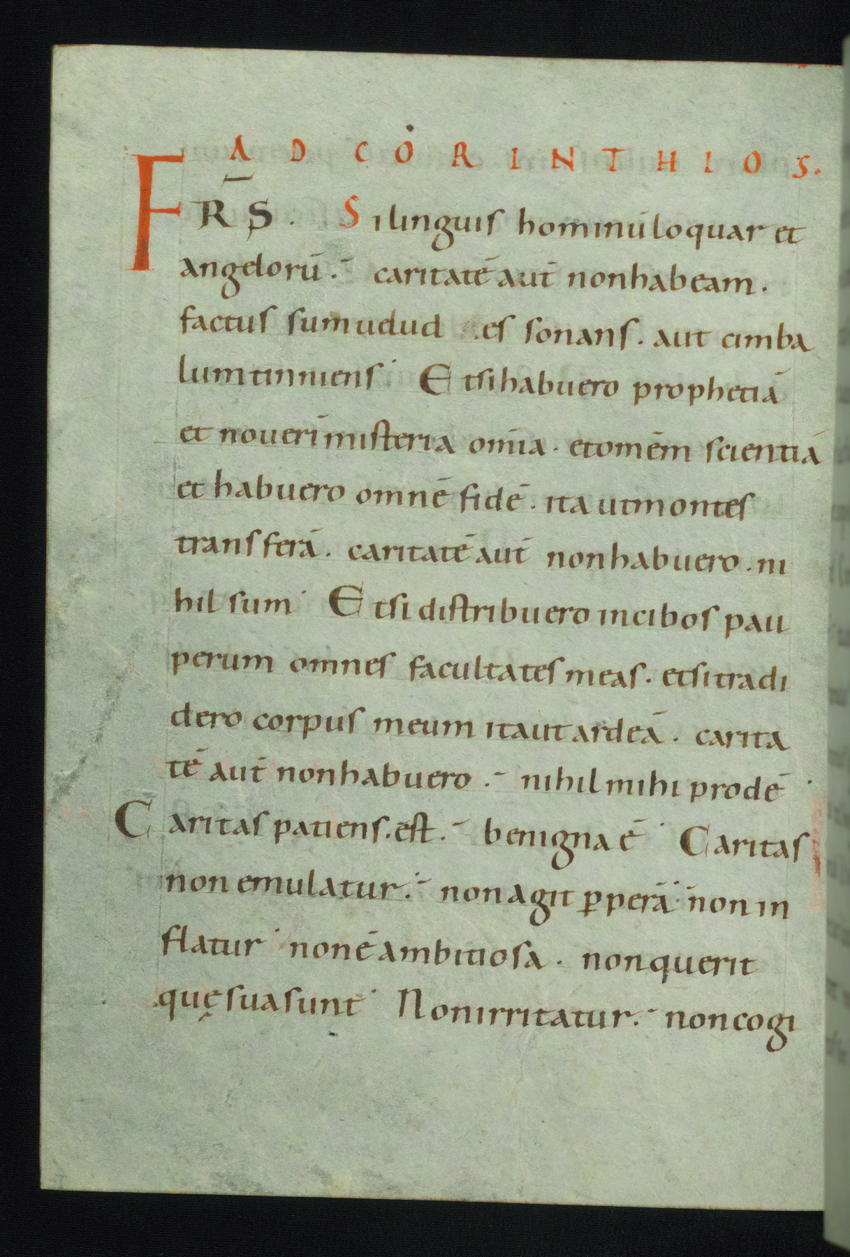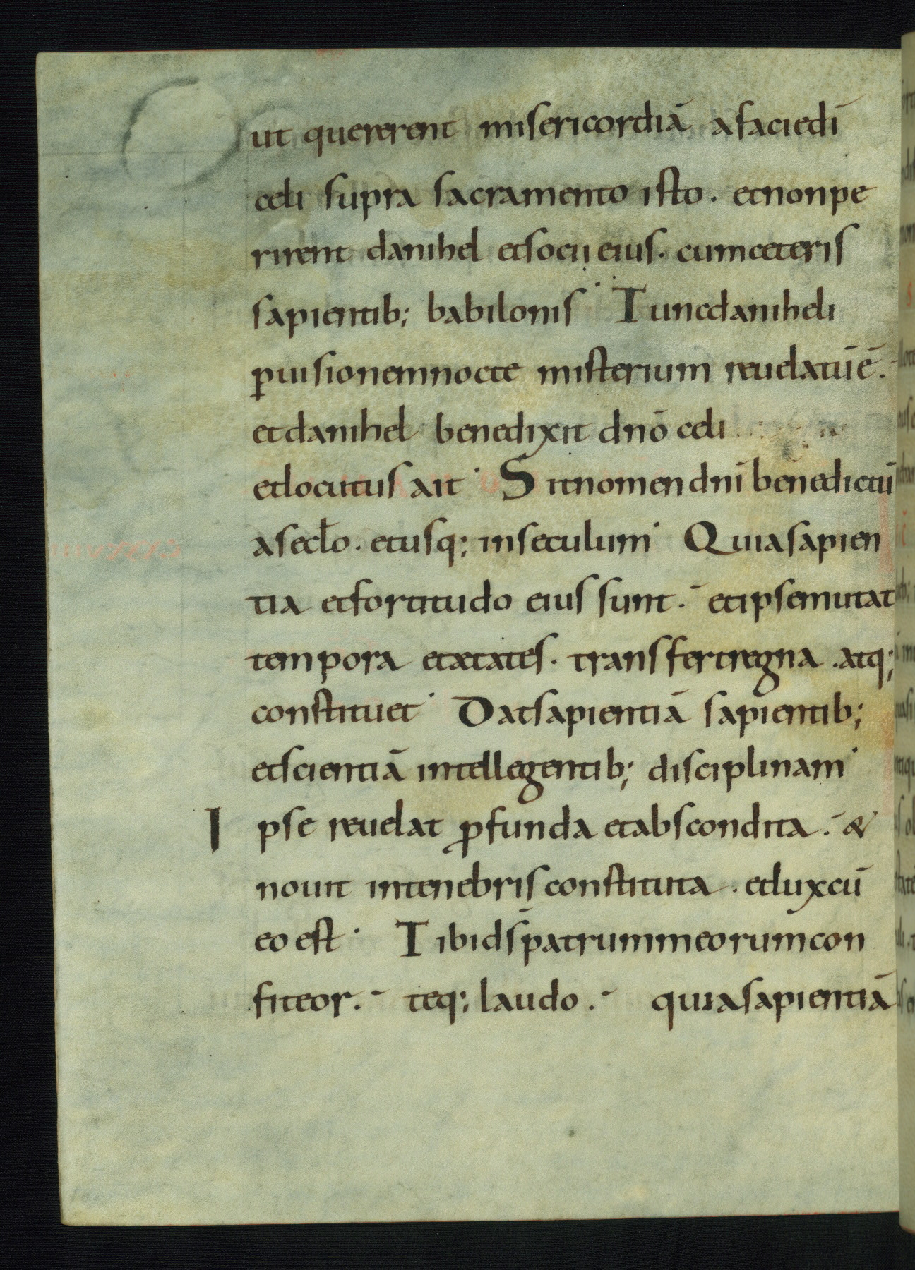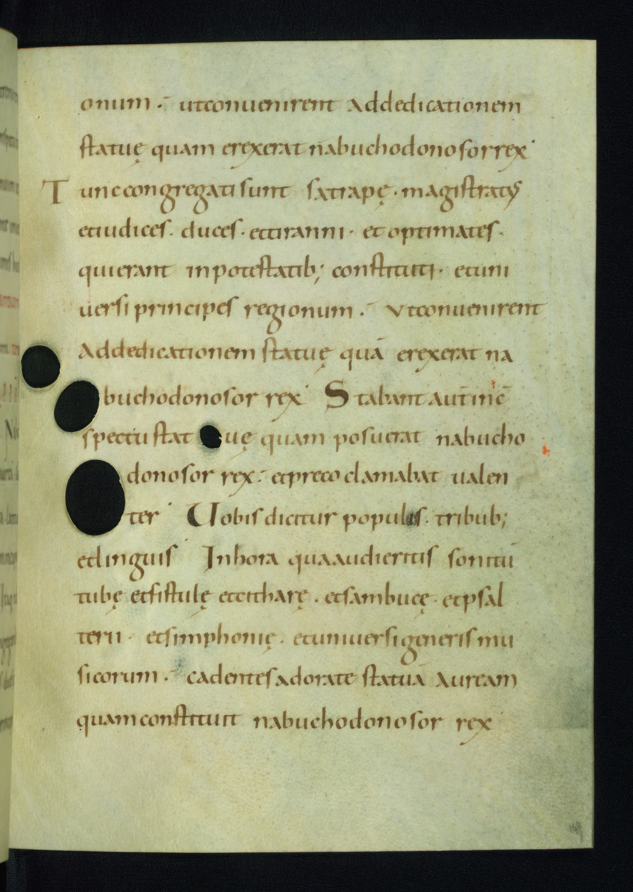 This Lectionary was created ca. 1000 in Trier. Written in a clear Caroline minuscule, it contains decorated initials at the openings of important readings. A set of illuminated letters marks the beginning of the Epistle and Gospel lessons for Easter; they display the hierarchy of scripts with capital letters decorated with gold leaf or drawn in red ink, followed by uncial and Caroline minuscule. Initials in orange, sometimes filled with gold, mark the divisions of the text. The book has been stylistically compared with Ottonian manuscripts, especially with a Psalter preserved in Trier (Stadtbibliothek, Ms. 7) illuminated by the so-called Master of the Registrum Gregorii.