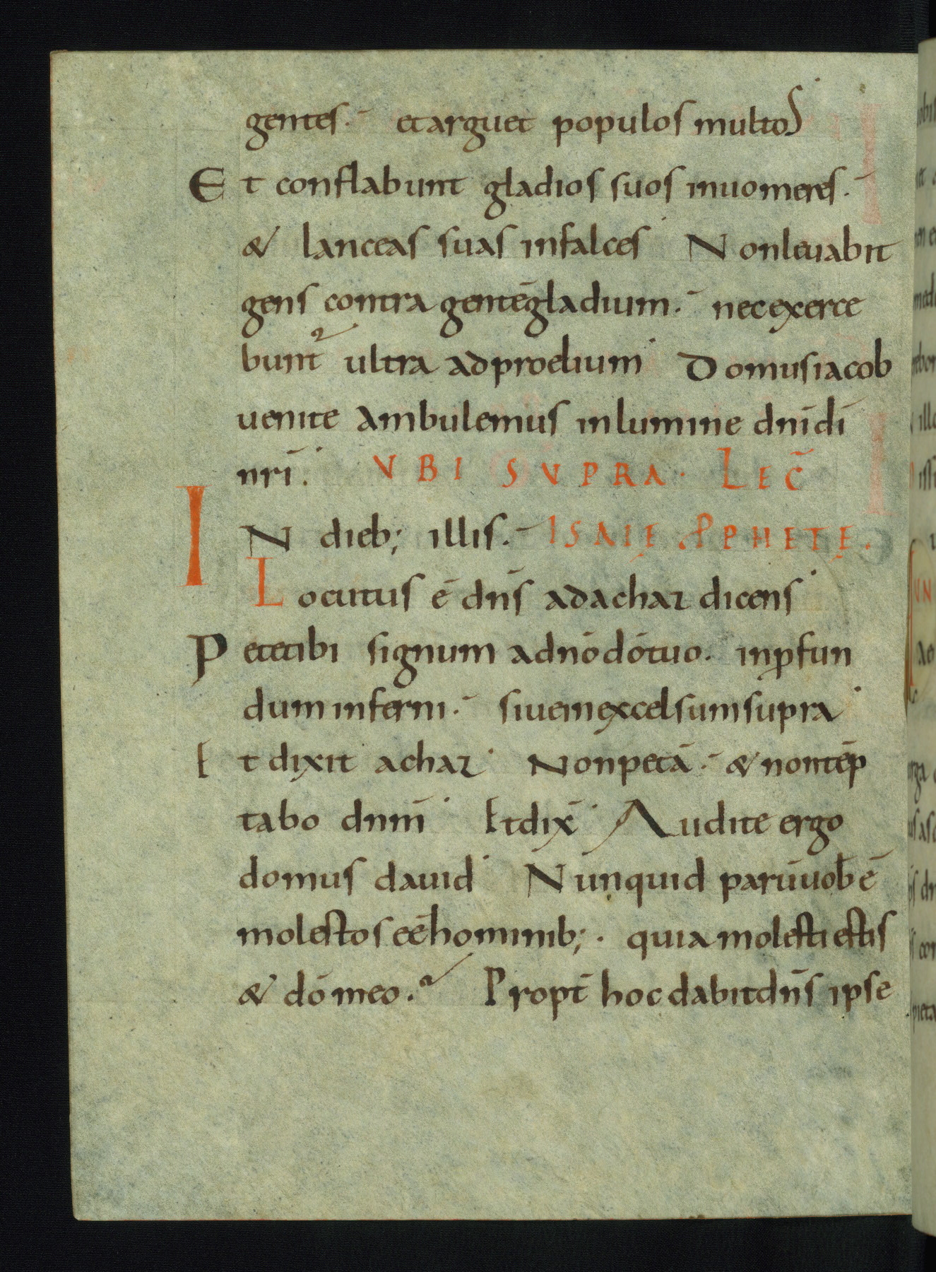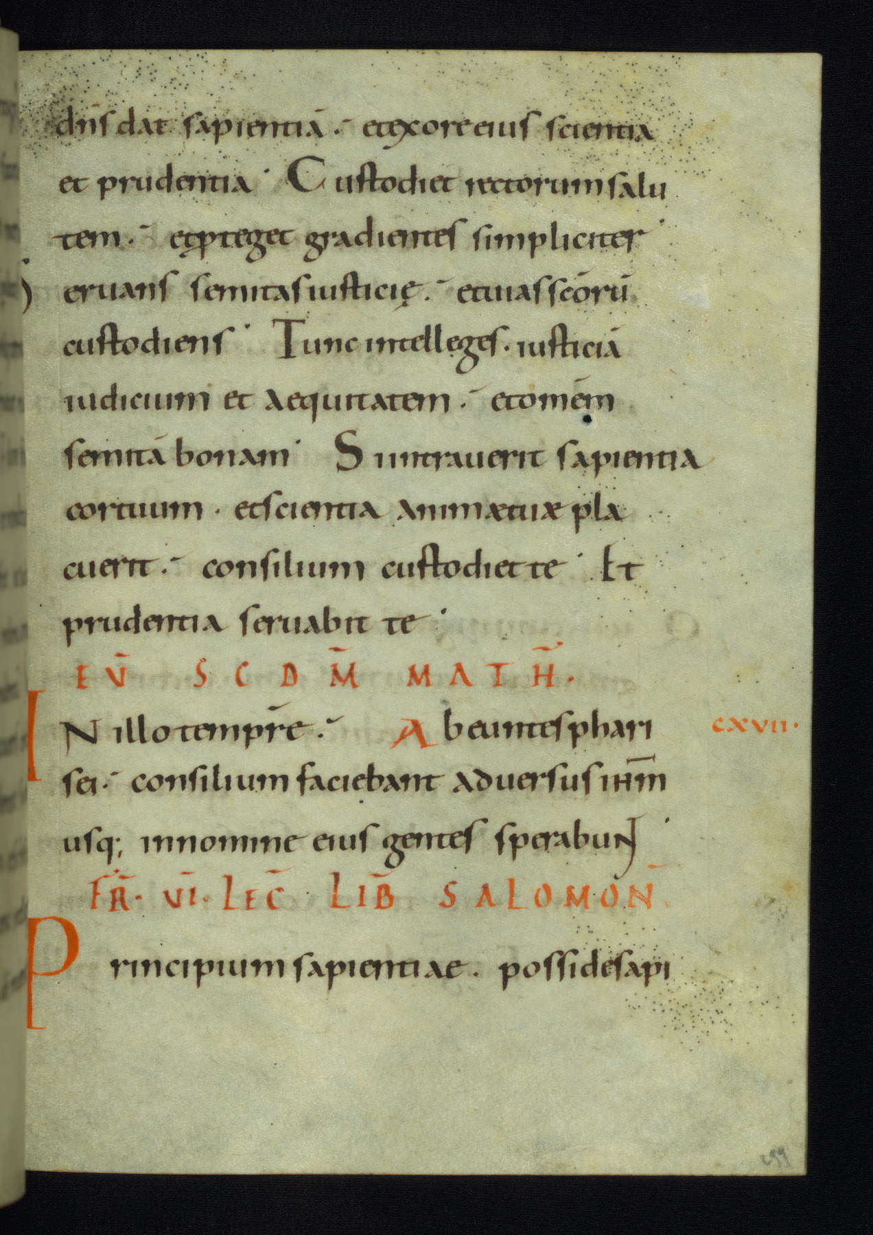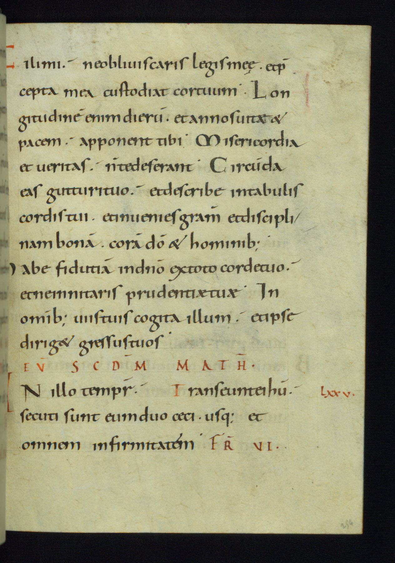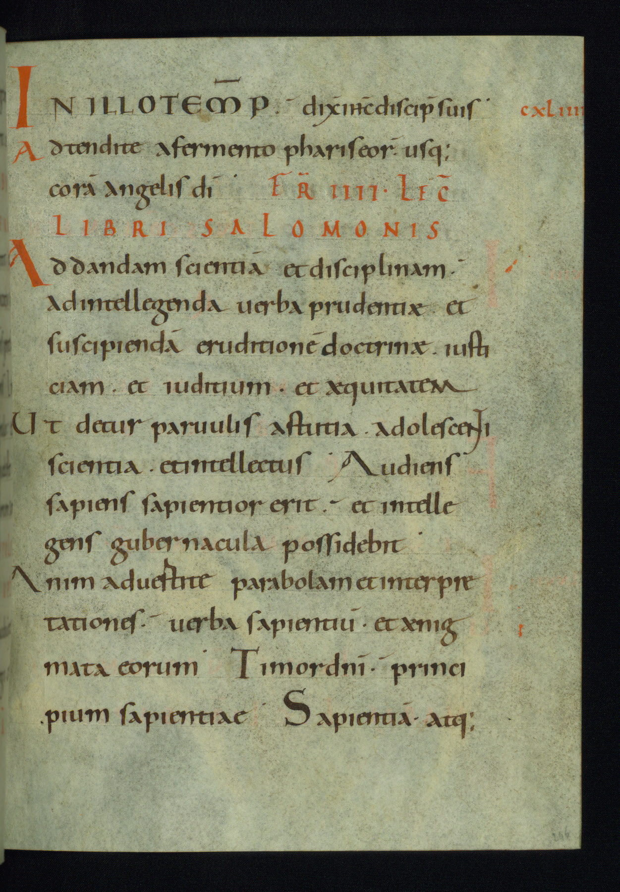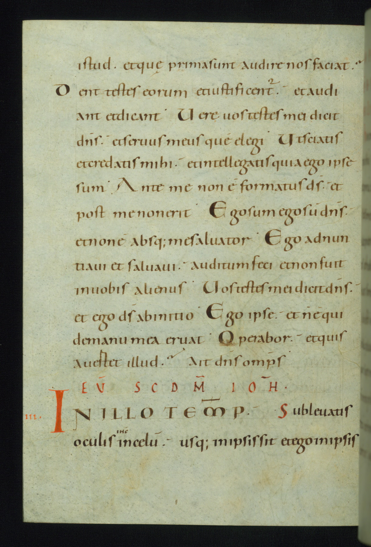 This Lectionary was created ca. 1000 in Trier. Written in a clear Caroline minuscule, it contains decorated initials at the openings of important readings. A set of illuminated letters marks the beginning of the Epistle and Gospel lessons for Easter; they display the hierarchy of scripts with capital letters decorated with gold leaf or drawn in red ink, followed by uncial and Caroline minuscule. Initials in orange, sometimes filled with gold, mark the divisions of the text. The book has been stylistically compared with Ottonian manuscripts, especially with a Psalter preserved in Trier (Stadtbibliothek, Ms. 7) illuminated by the so-called Master of the Registrum Gregorii.