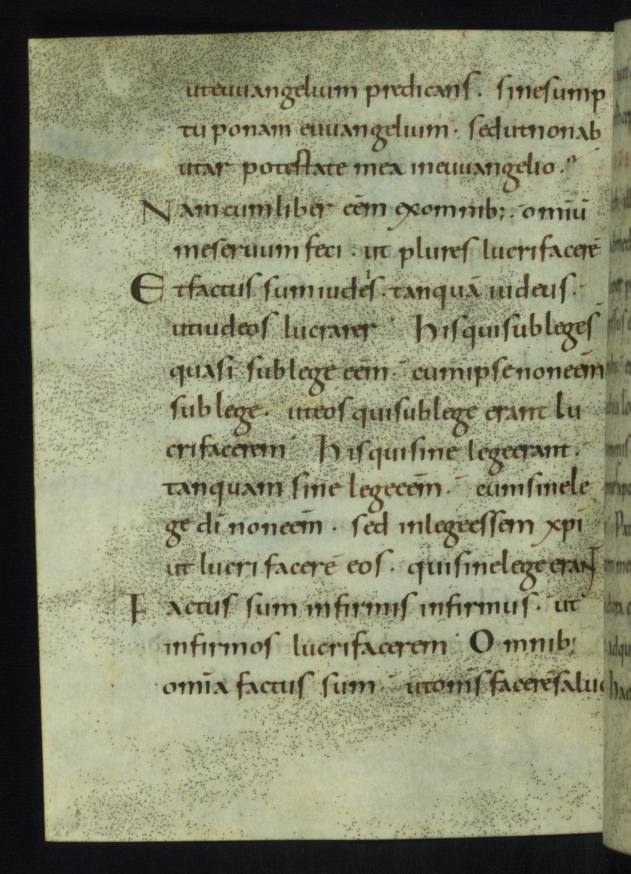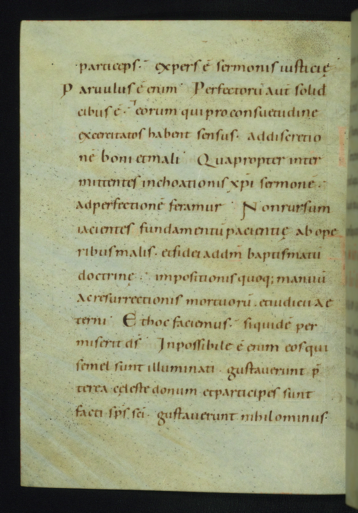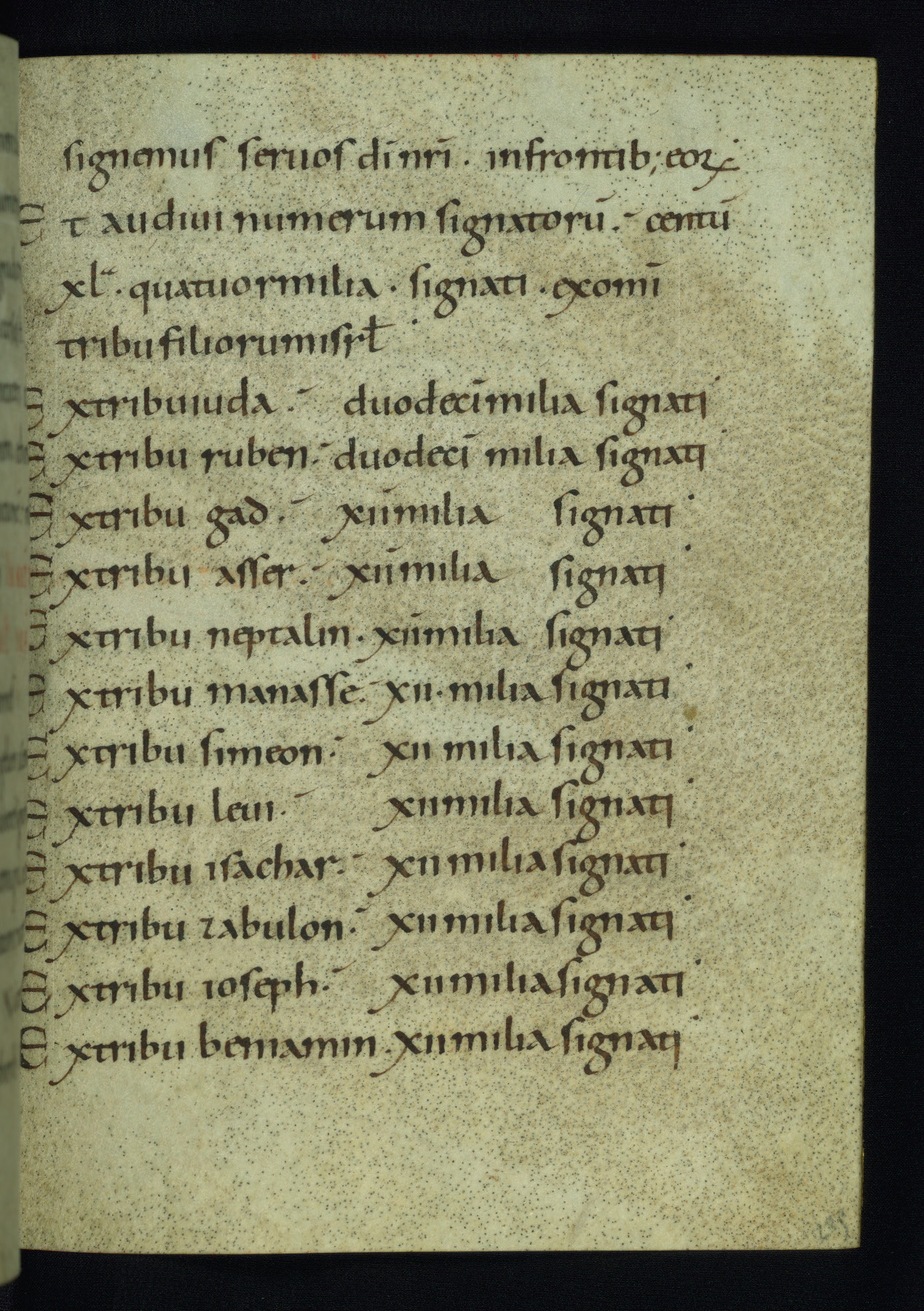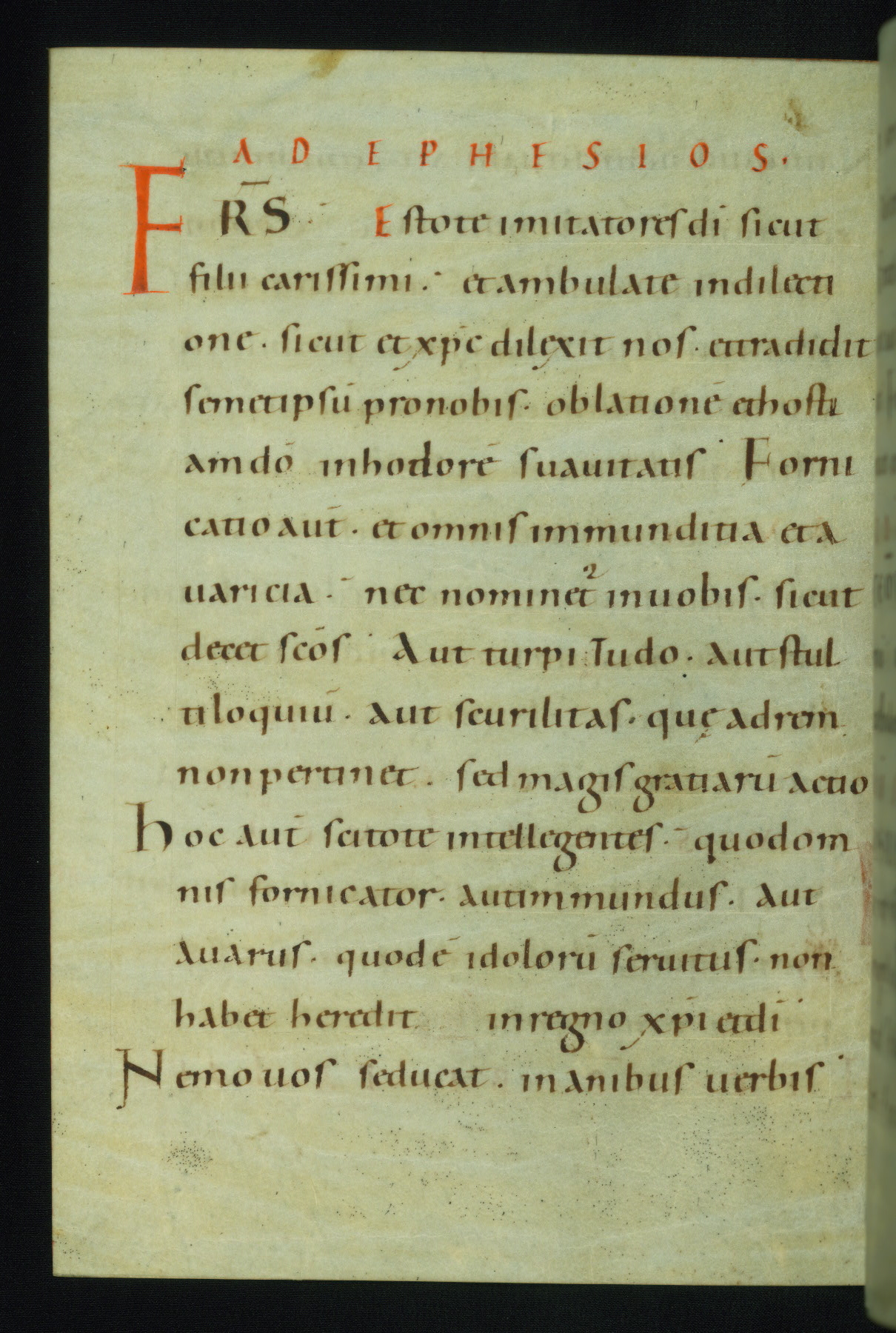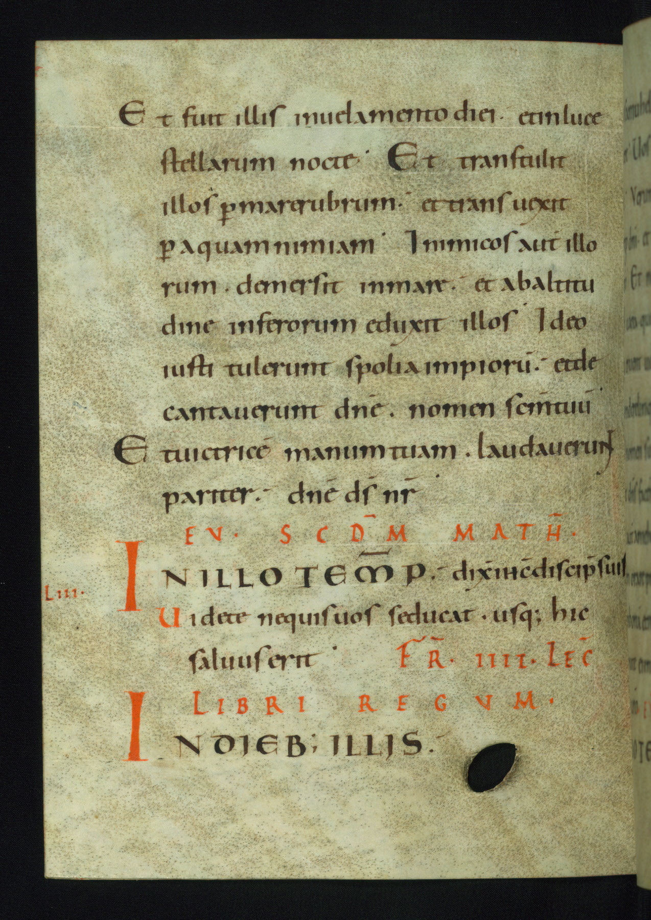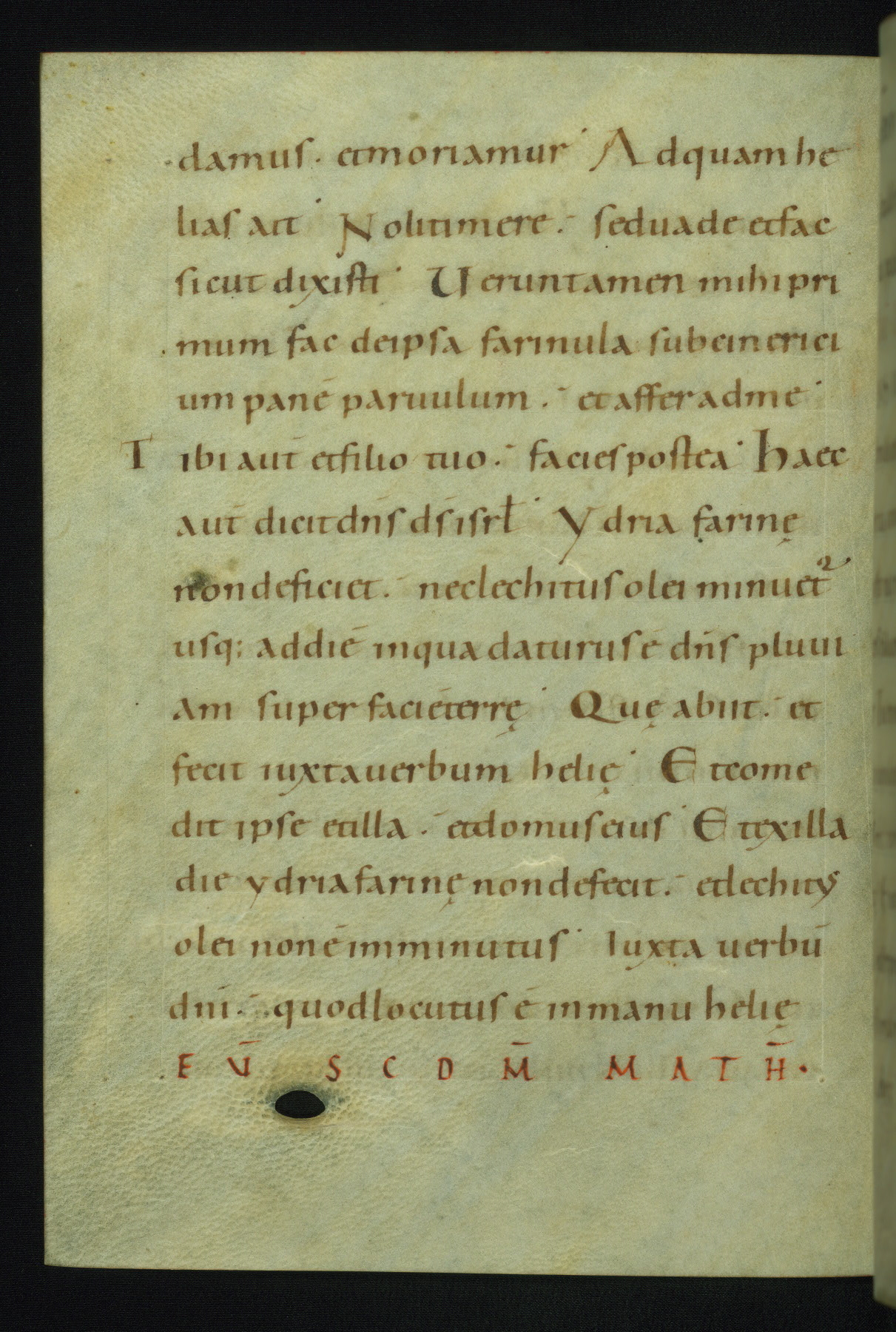 This Lectionary was created ca. 1000 in Trier. Written in a clear Caroline minuscule, it contains decorated initials at the openings of important readings. A set of illuminated letters marks the beginning of the Epistle and Gospel lessons for Easter; they display the hierarchy of scripts with capital letters decorated with gold leaf or drawn in red ink, followed by uncial and Caroline minuscule. Initials in orange, sometimes filled with gold, mark the divisions of the text. The book has been stylistically compared with Ottonian manuscripts, especially with a Psalter preserved in Trier (Stadtbibliothek, Ms. 7) illuminated by the so-called Master of the Registrum Gregorii.