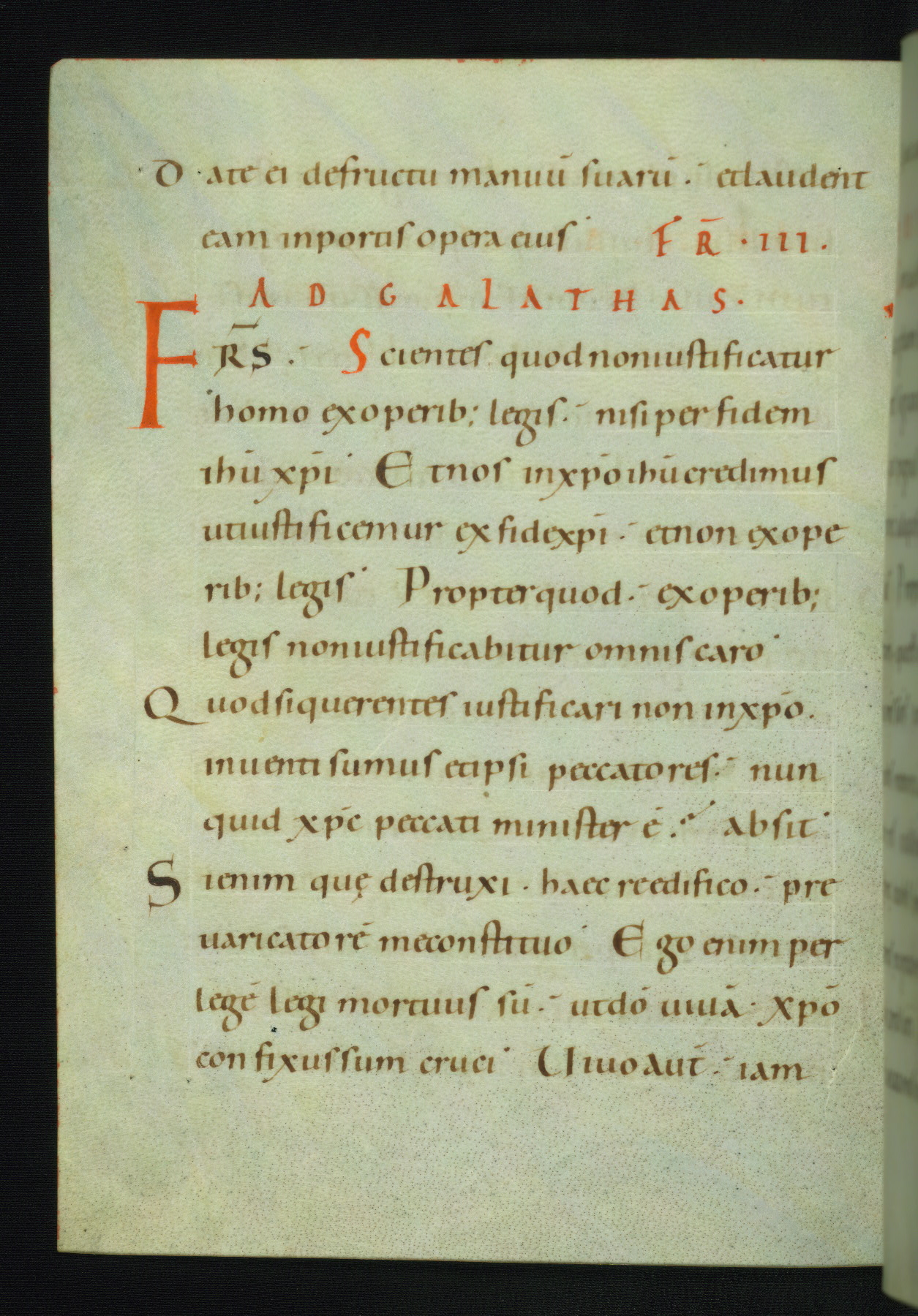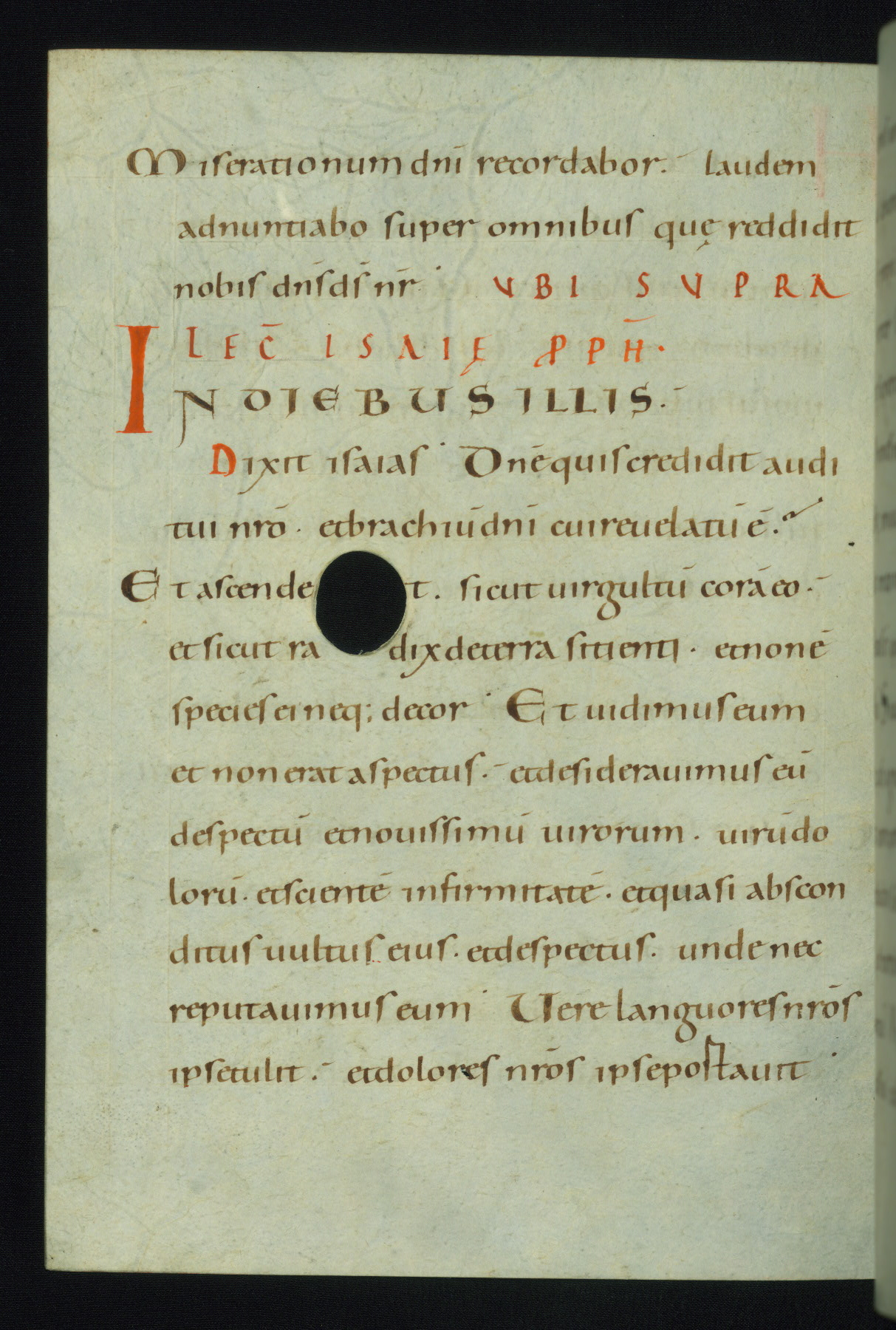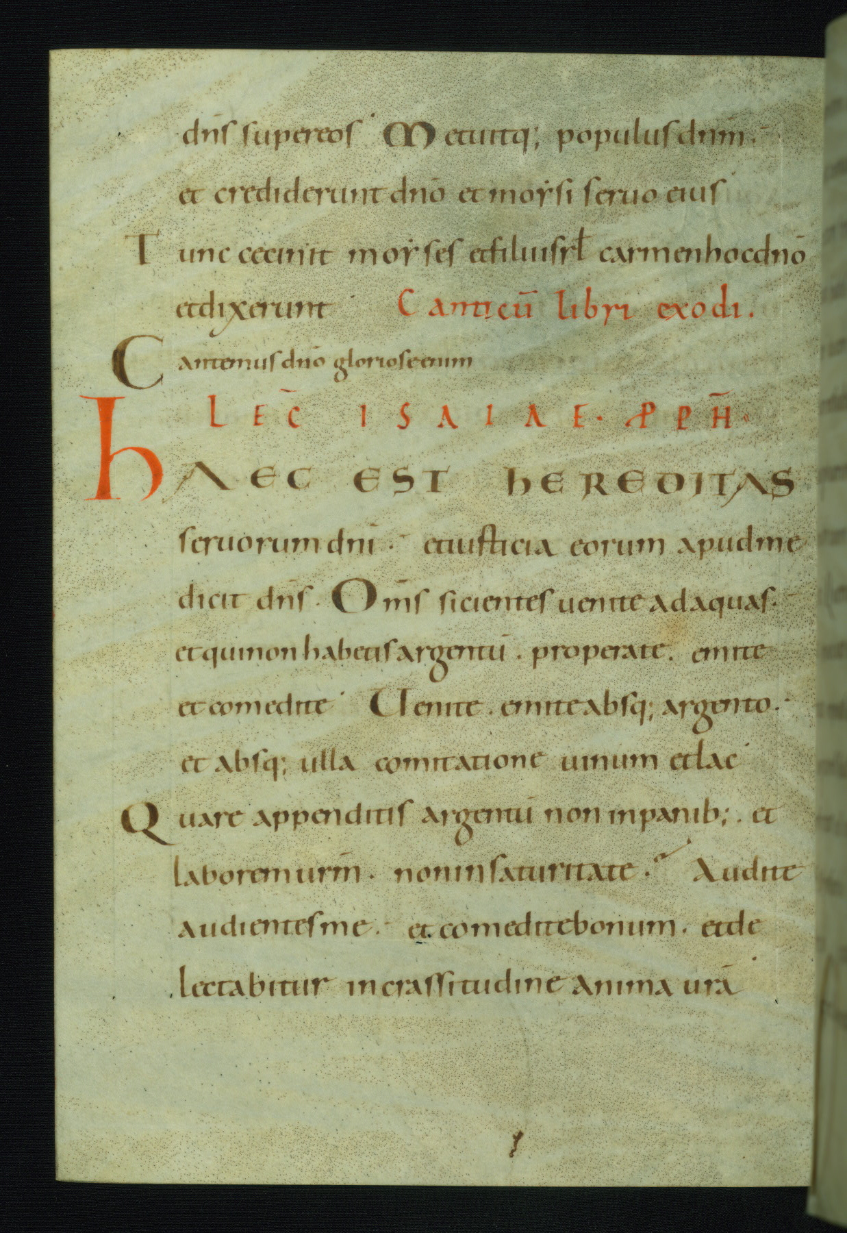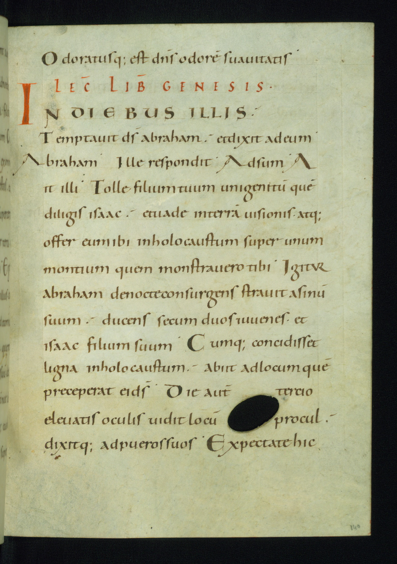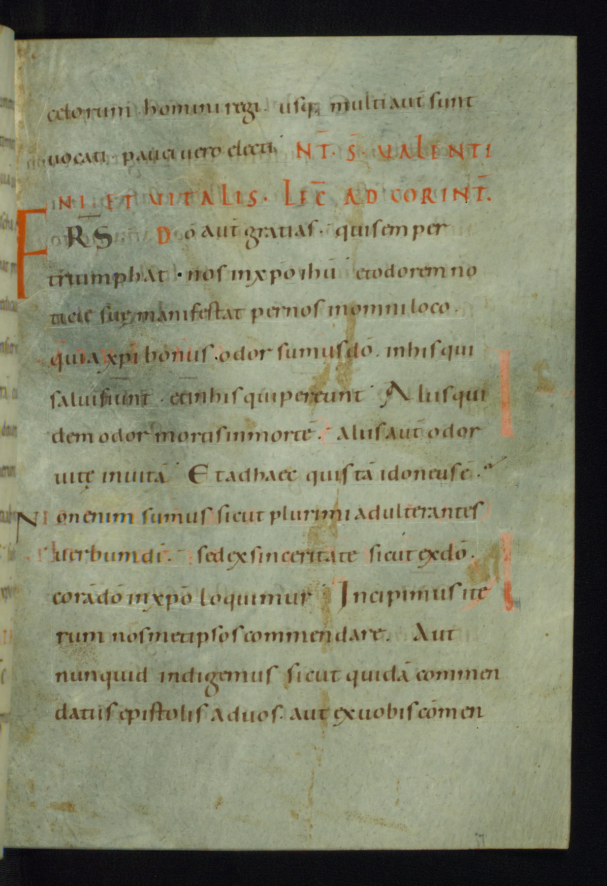 This Lectionary was created ca. 1000 in Trier. Written in a clear Caroline minuscule, it contains decorated initials at the openings of important readings. A set of illuminated letters marks the beginning of the Epistle and Gospel lessons for Easter; they display the hierarchy of scripts with capital letters decorated with gold leaf or drawn in red ink, followed by uncial and Caroline minuscule. Initials in orange, sometimes filled with gold, mark the divisions of the text. The book has been stylistically compared with Ottonian manuscripts, especially with a Psalter preserved in Trier (Stadtbibliothek, Ms. 7) illuminated by the so-called Master of the Registrum Gregorii.