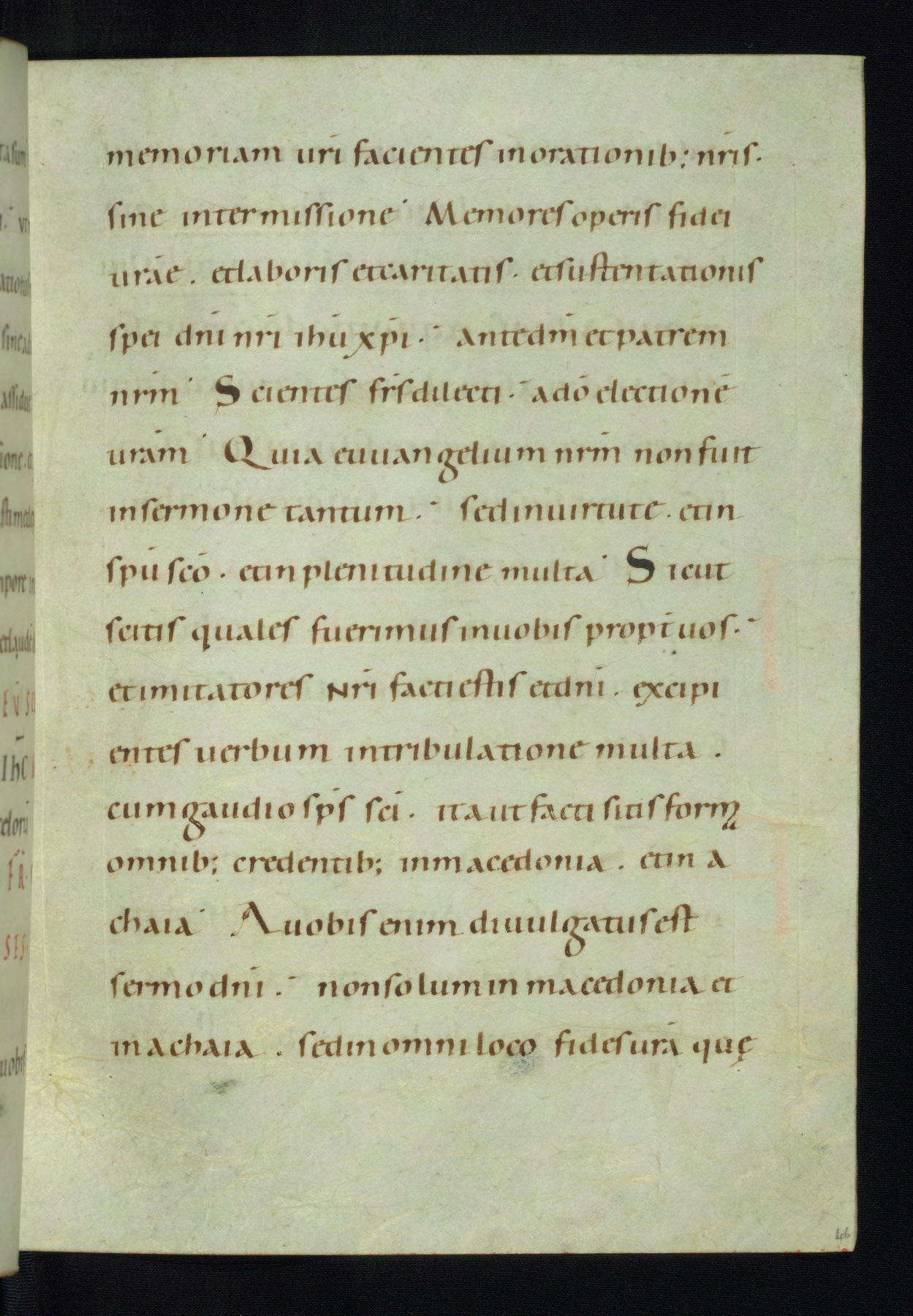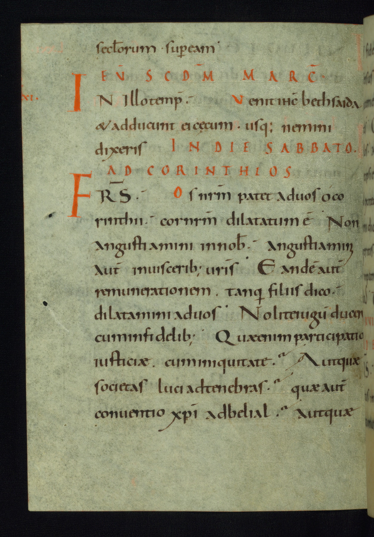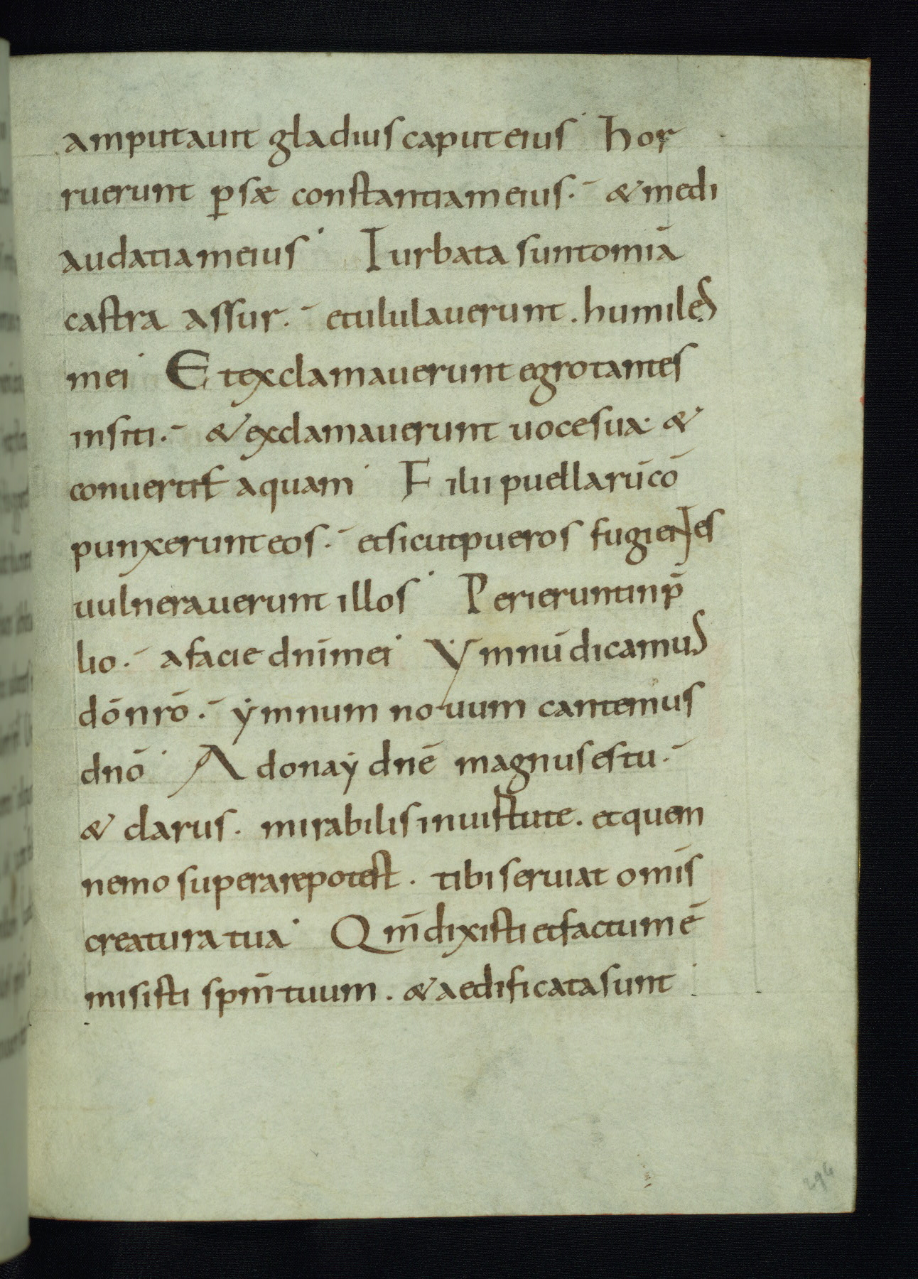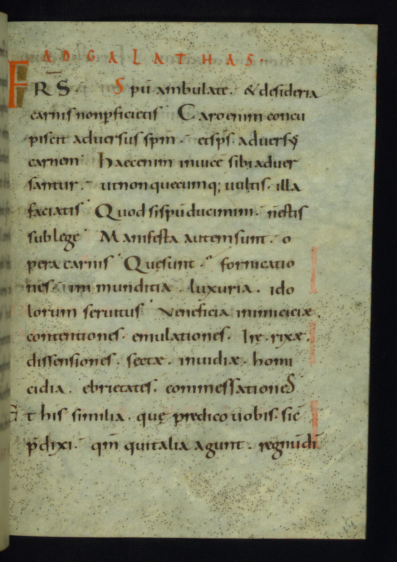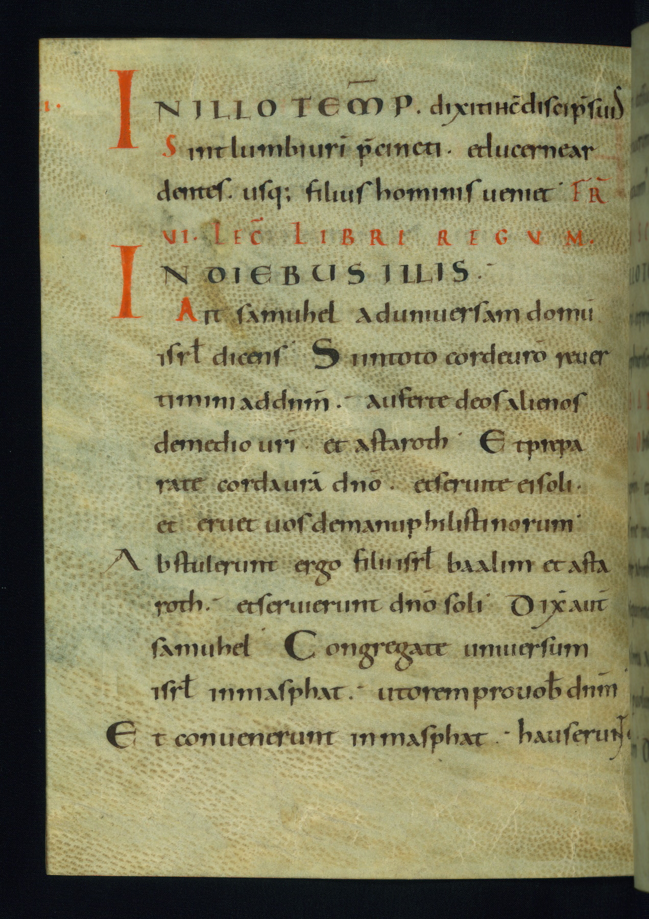 This Lectionary was created ca. 1000 in Trier. Written in a clear Caroline minuscule, it contains decorated initials at the openings of important readings. A set of illuminated letters marks the beginning of the Epistle and Gospel lessons for Easter; they display the hierarchy of scripts with capital letters decorated with gold leaf or drawn in red ink, followed by uncial and Caroline minuscule. Initials in orange, sometimes filled with gold, mark the divisions of the text. The book has been stylistically compared with Ottonian manuscripts, especially with a Psalter preserved in Trier (Stadtbibliothek, Ms. 7) illuminated by the so-called Master of the Registrum Gregorii.