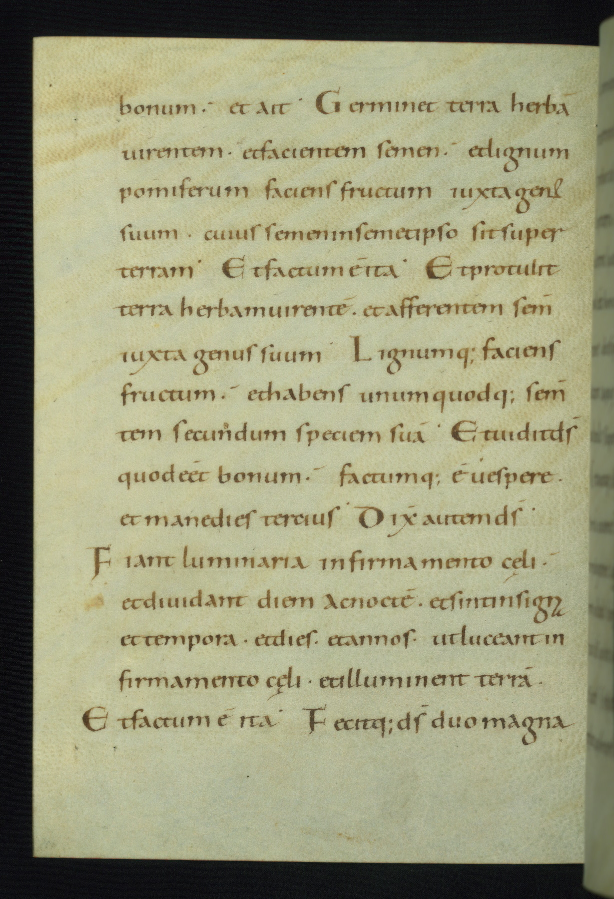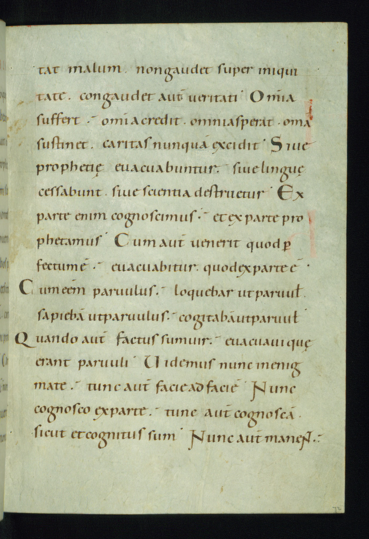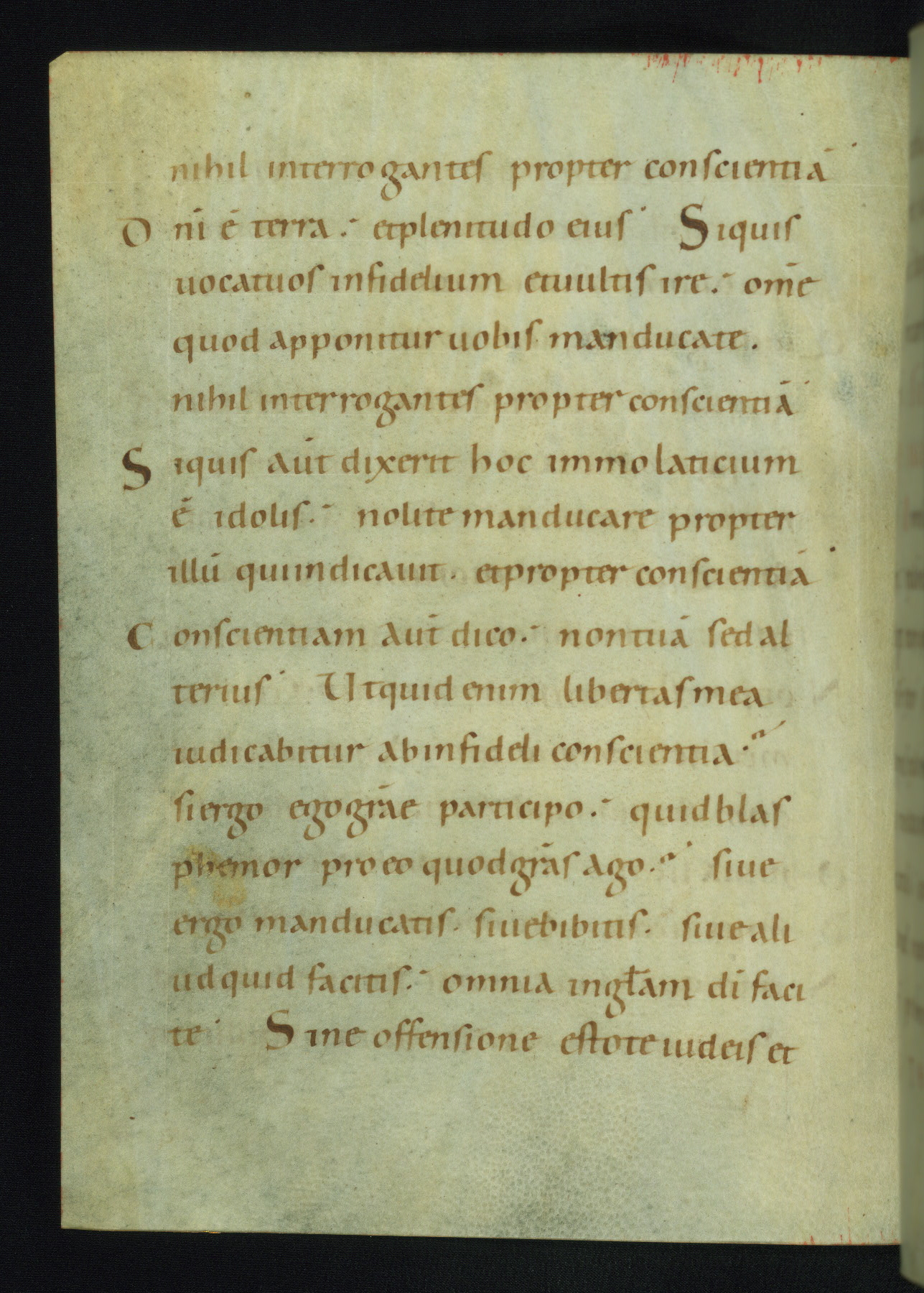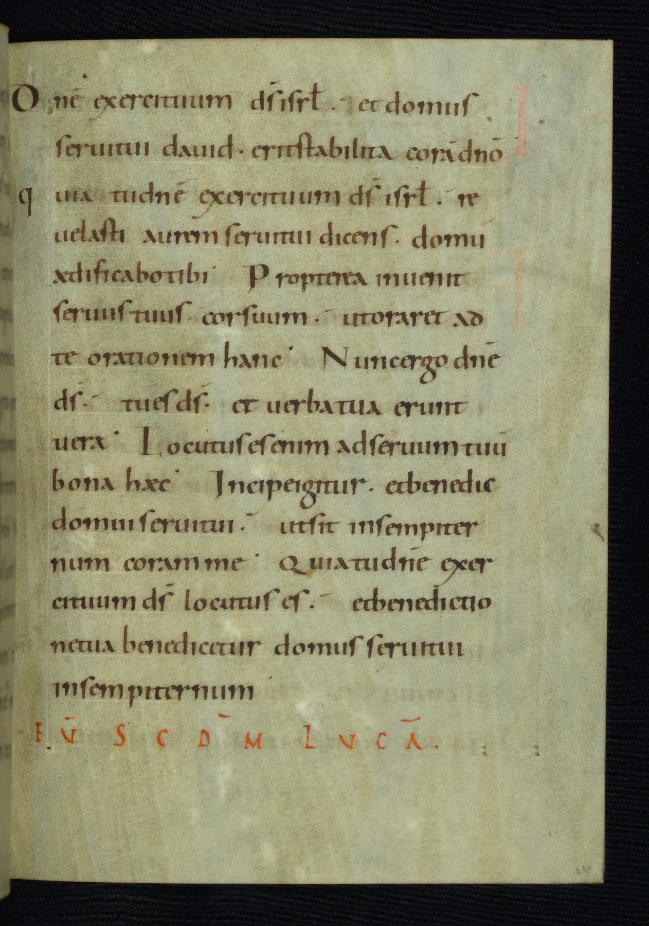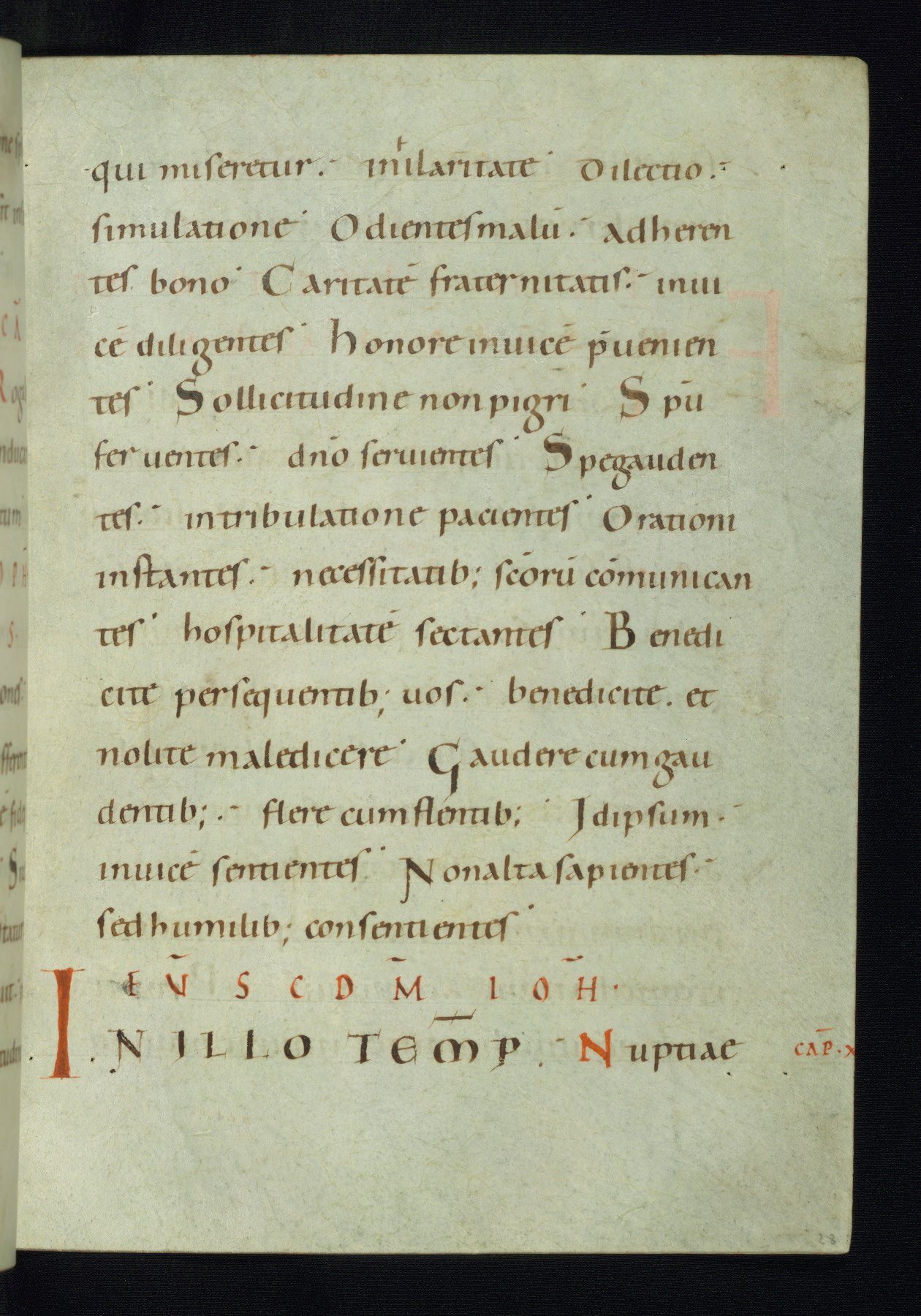 This Lectionary was created ca. 1000 in Trier. Written in a clear Caroline minuscule, it contains decorated initials at the openings of important readings. A set of illuminated letters marks the beginning of the Epistle and Gospel lessons for Easter; they display the hierarchy of scripts with capital letters decorated with gold leaf or drawn in red ink, followed by uncial and Caroline minuscule. Initials in orange, sometimes filled with gold, mark the divisions of the text. The book has been stylistically compared with Ottonian manuscripts, especially with a Psalter preserved in Trier (Stadtbibliothek, Ms. 7) illuminated by the so-called Master of the Registrum Gregorii.