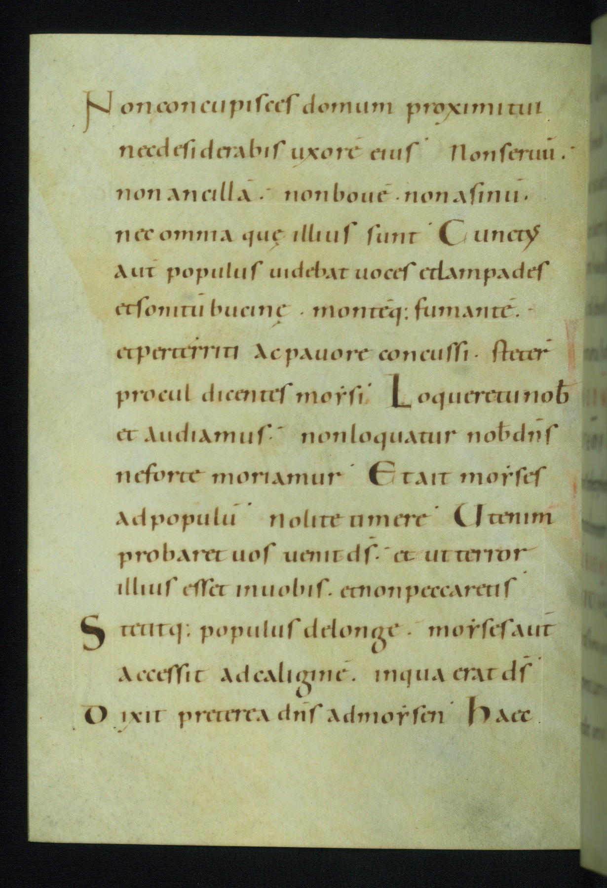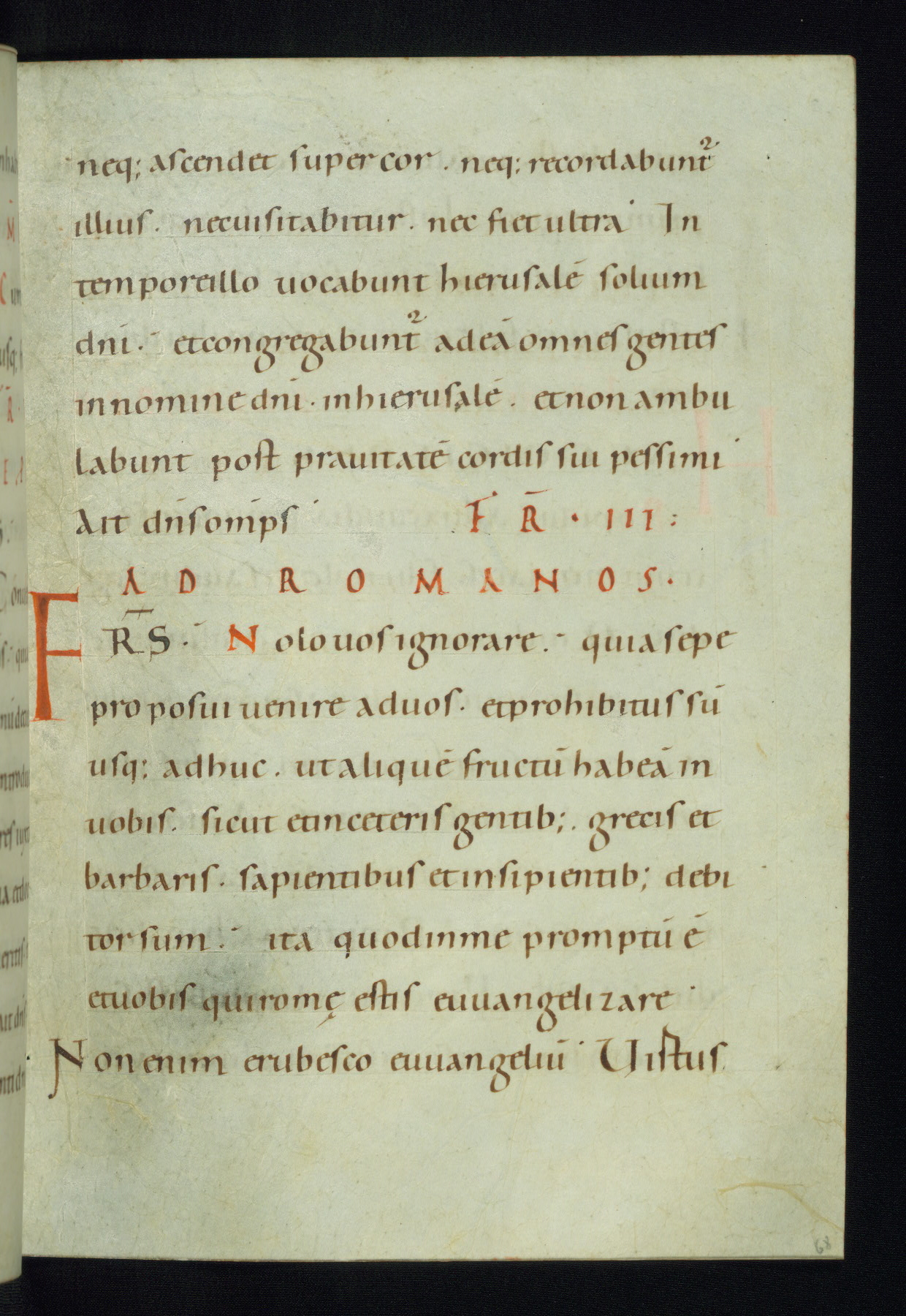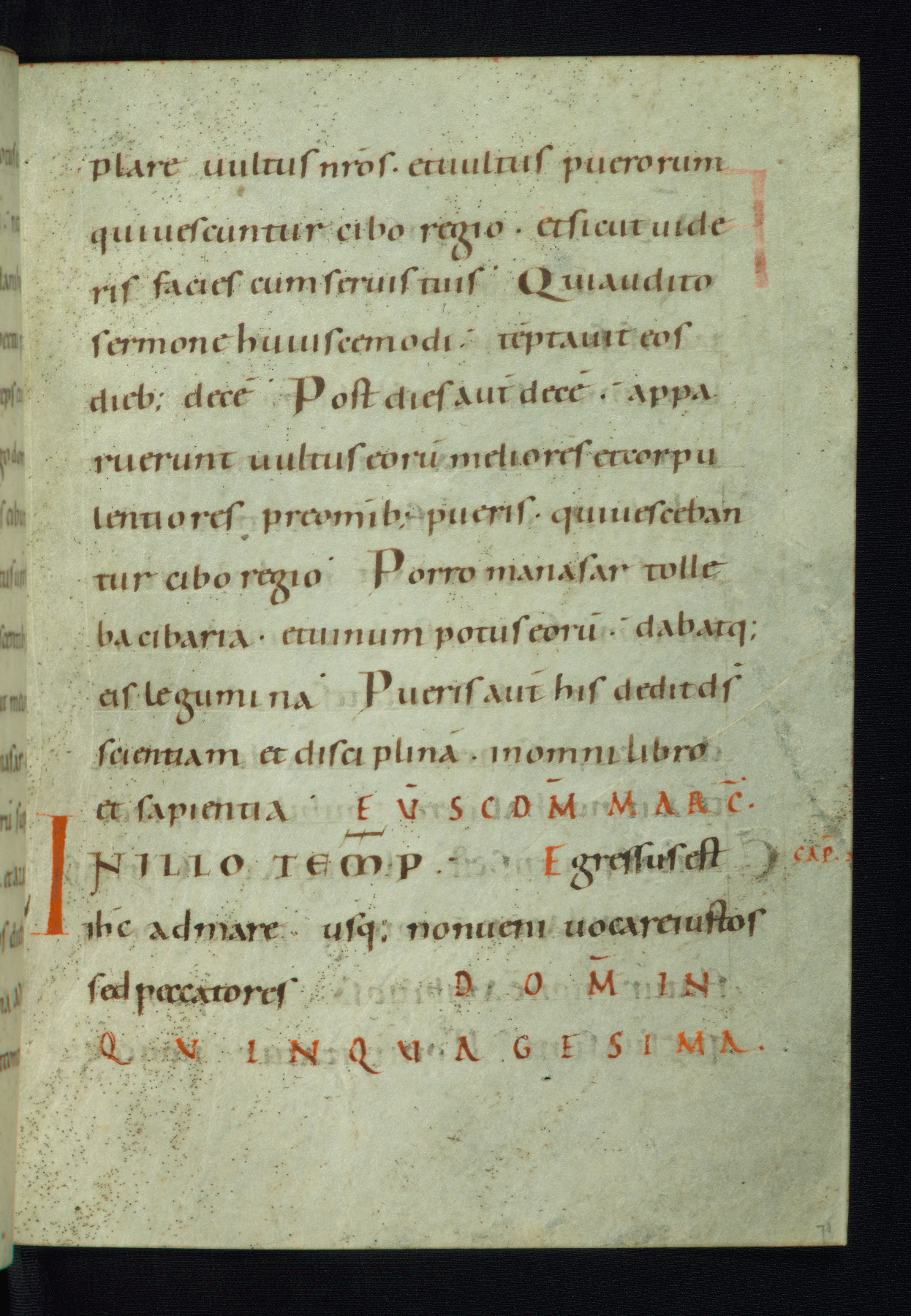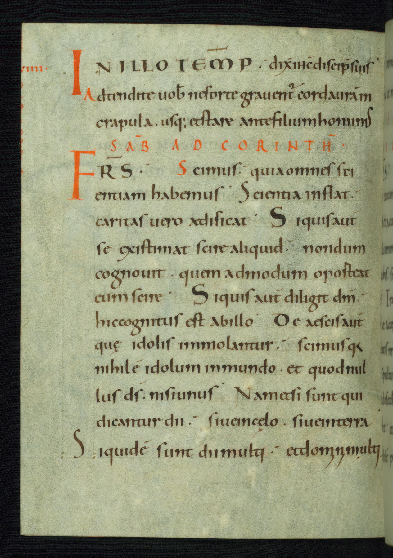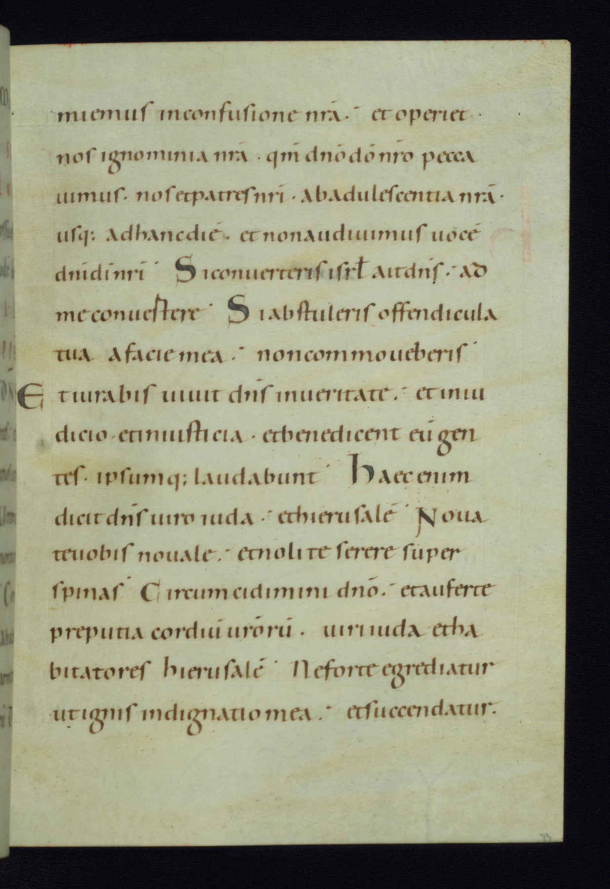 This Lectionary was created ca. 1000 in Trier. Written in a clear Caroline minuscule, it contains decorated initials at the openings of important readings. A set of illuminated letters marks the beginning of the Epistle and Gospel lessons for Easter; they display the hierarchy of scripts with capital letters decorated with gold leaf or drawn in red ink, followed by uncial and Caroline minuscule. Initials in orange, sometimes filled with gold, mark the divisions of the text. The book has been stylistically compared with Ottonian manuscripts, especially with a Psalter preserved in Trier (Stadtbibliothek, Ms. 7) illuminated by the so-called Master of the Registrum Gregorii.