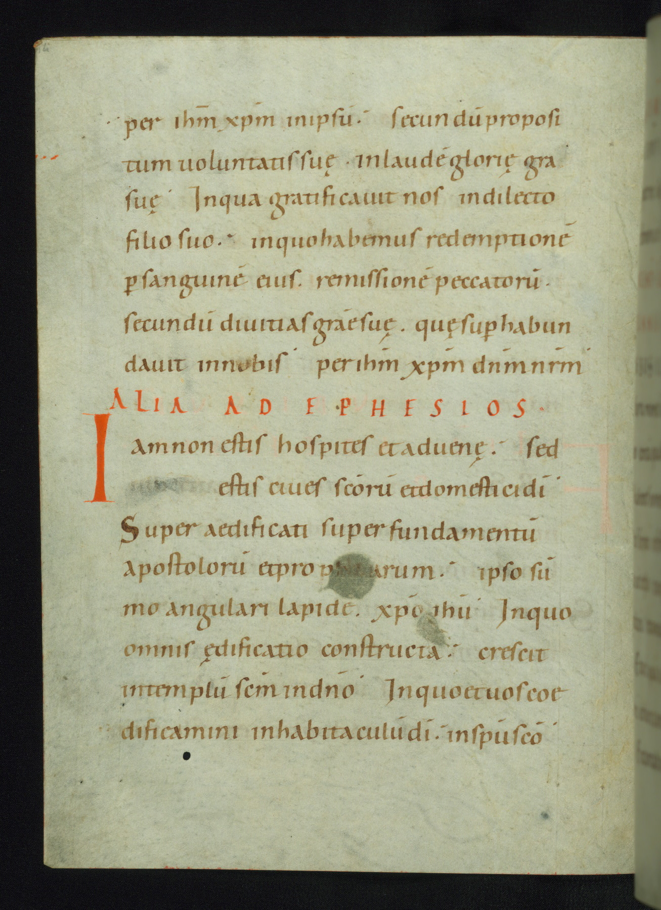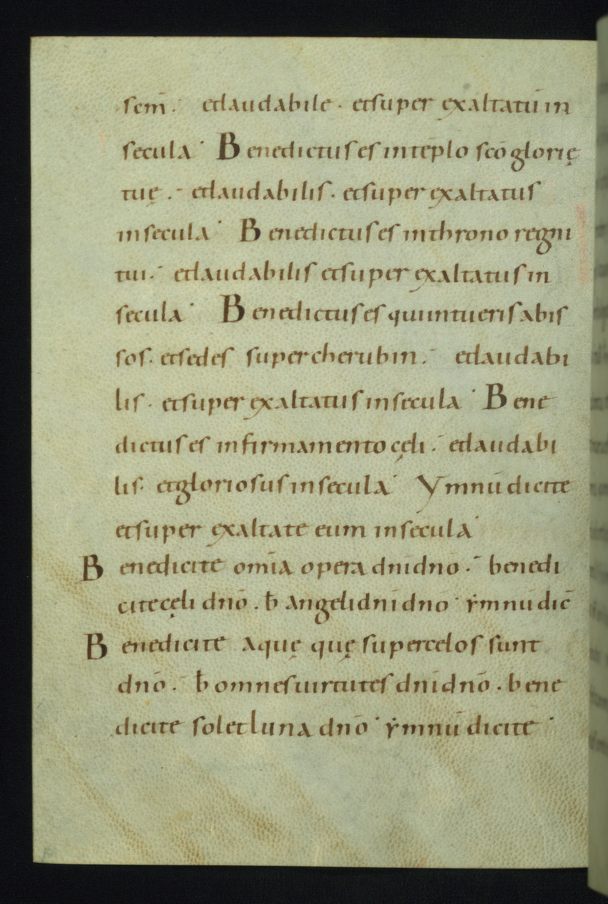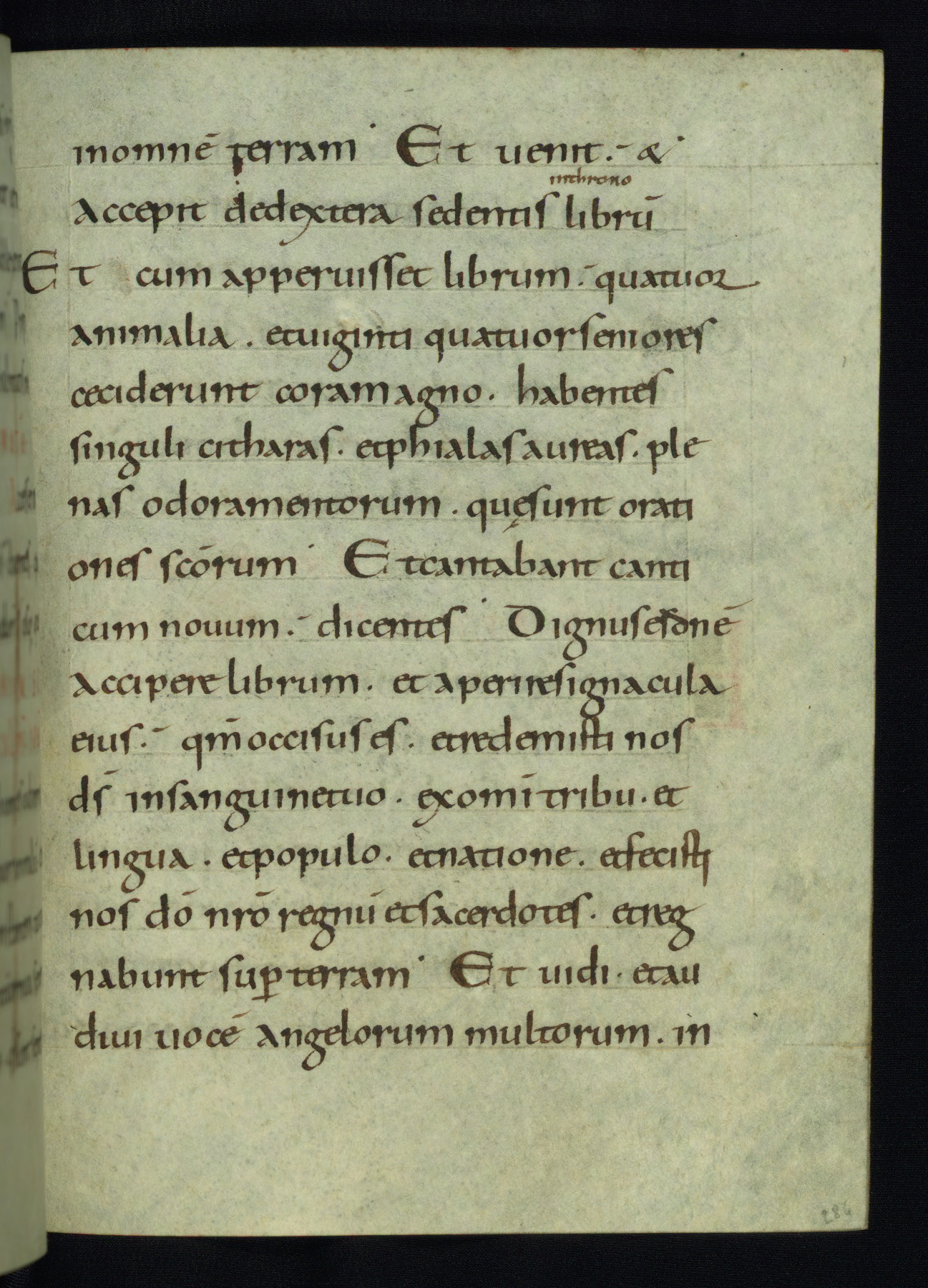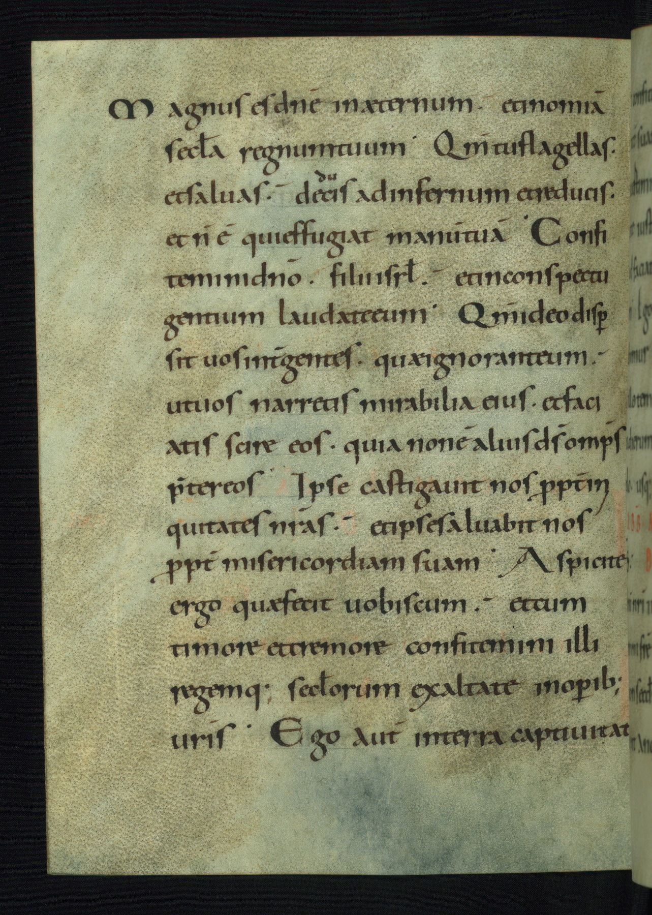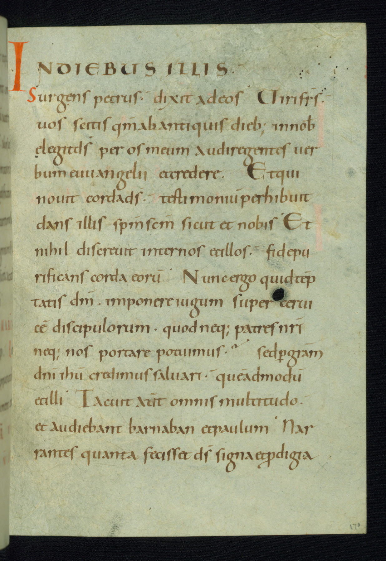 This Lectionary was created ca. 1000 in Trier. Written in a clear Caroline minuscule, it contains decorated initials at the openings of important readings. A set of illuminated letters marks the beginning of the Epistle and Gospel lessons for Easter; they display the hierarchy of scripts with capital letters decorated with gold leaf or drawn in red ink, followed by uncial and Caroline minuscule. Initials in orange, sometimes filled with gold, mark the divisions of the text. The book has been stylistically compared with Ottonian manuscripts, especially with a Psalter preserved in Trier (Stadtbibliothek, Ms. 7) illuminated by the so-called Master of the Registrum Gregorii.