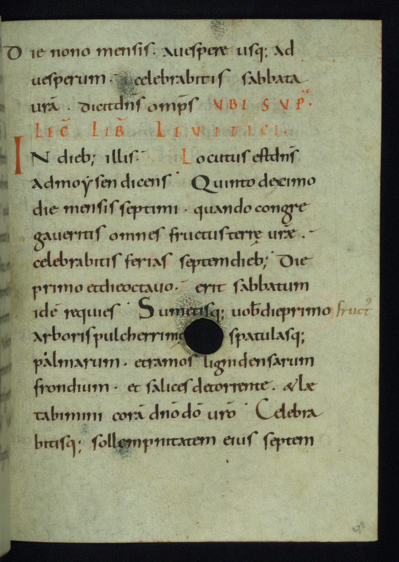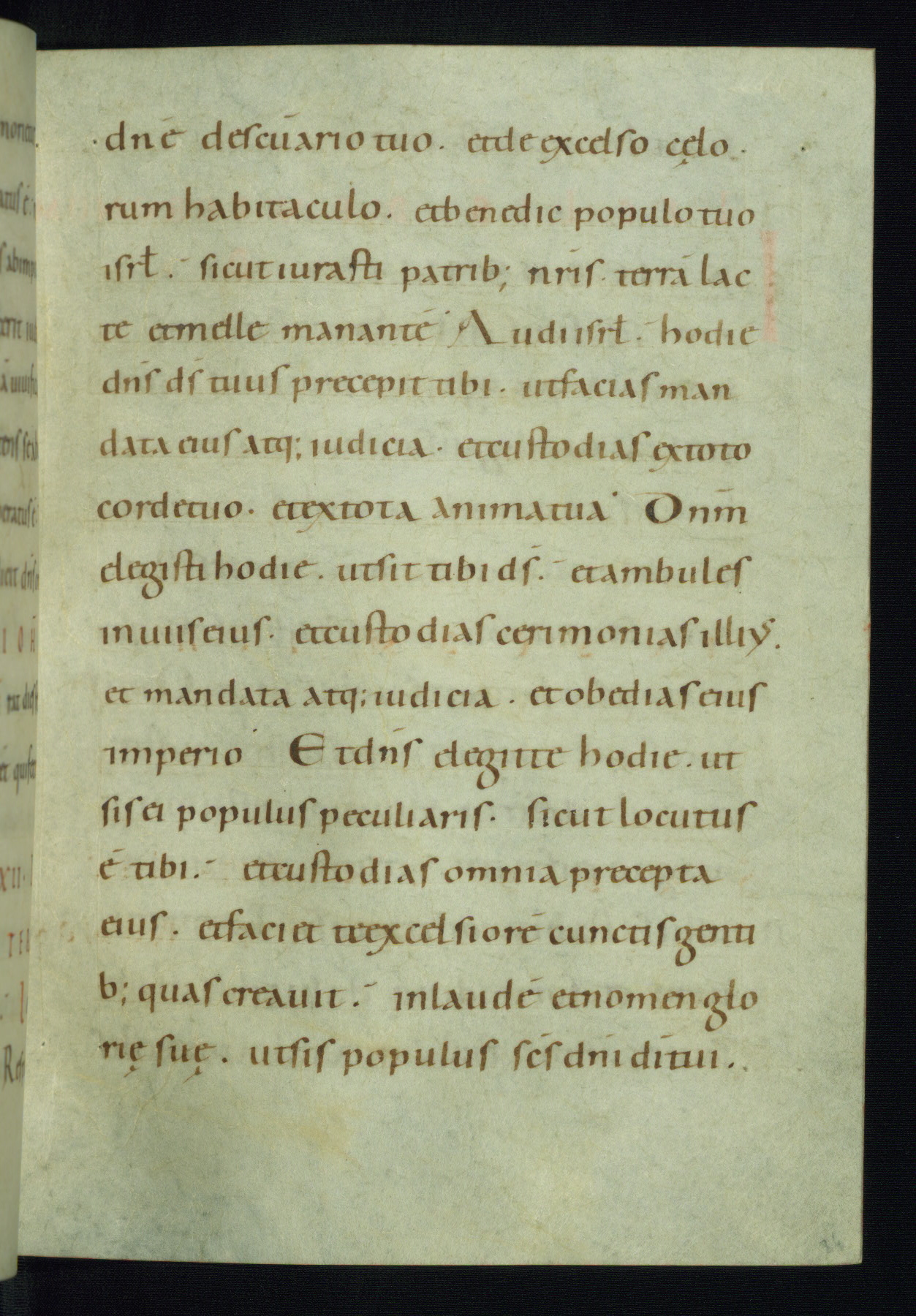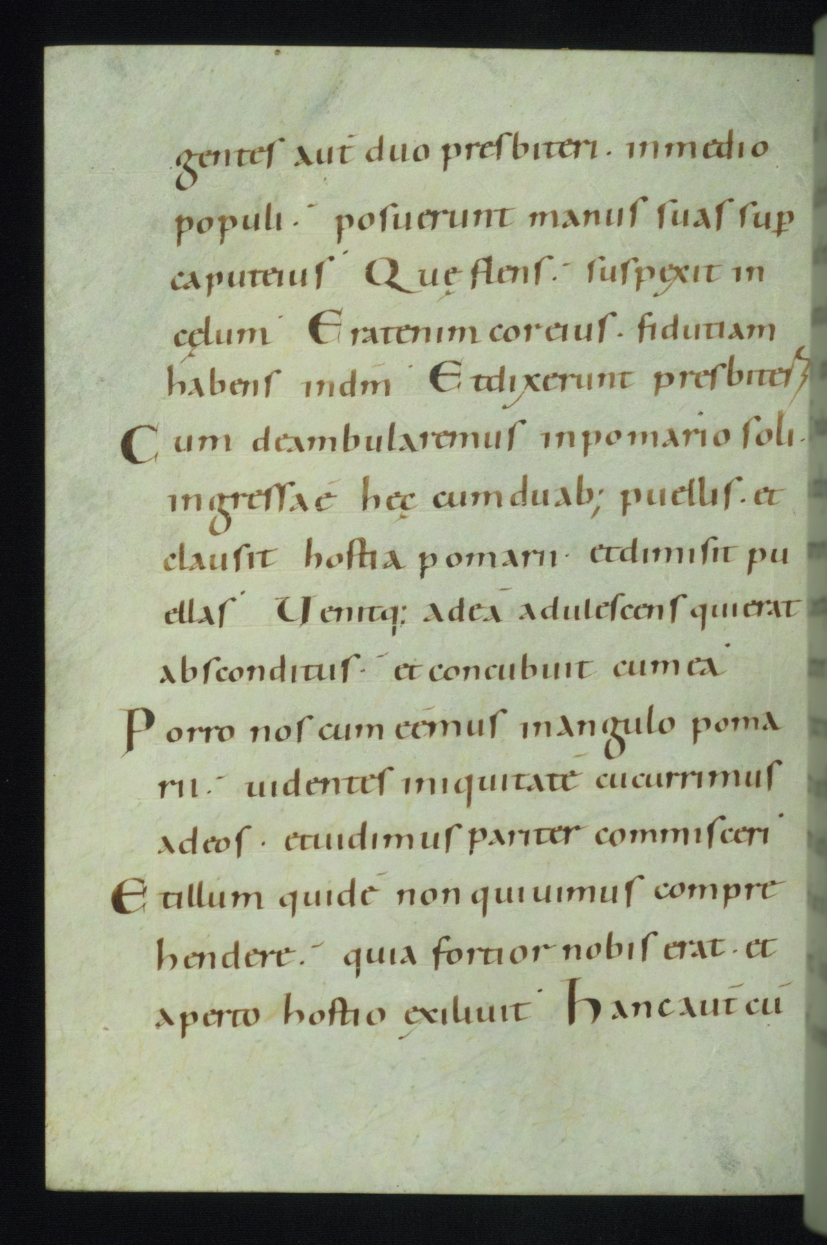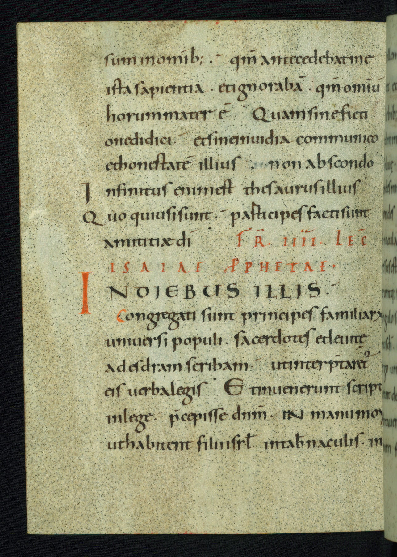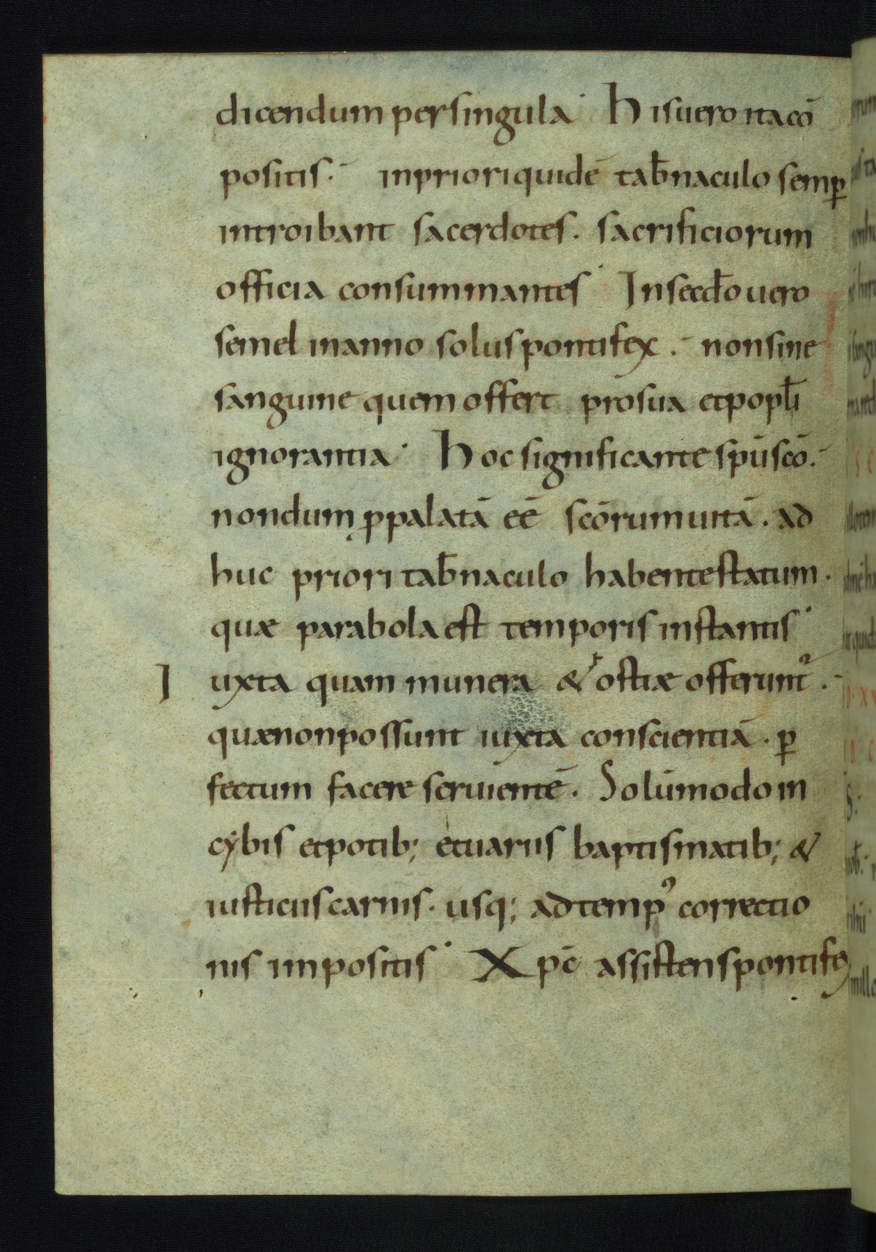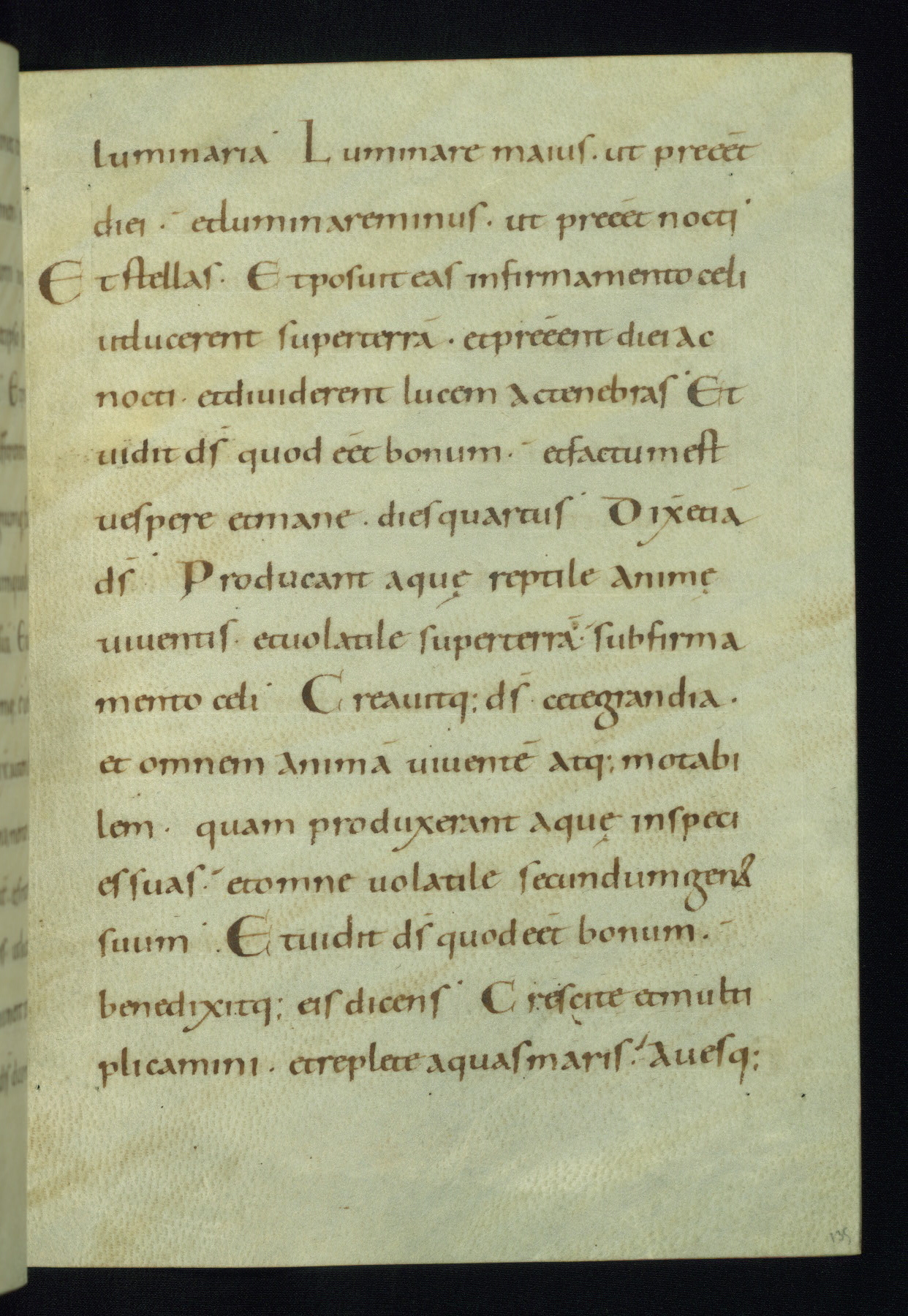 This Lectionary was created ca. 1000 in Trier. Written in a clear Caroline minuscule, it contains decorated initials at the openings of important readings. A set of illuminated letters marks the beginning of the Epistle and Gospel lessons for Easter; they display the hierarchy of scripts with capital letters decorated with gold leaf or drawn in red ink, followed by uncial and Caroline minuscule. Initials in orange, sometimes filled with gold, mark the divisions of the text. The book has been stylistically compared with Ottonian manuscripts, especially with a Psalter preserved in Trier (Stadtbibliothek, Ms. 7) illuminated by the so-called Master of the Registrum Gregorii.