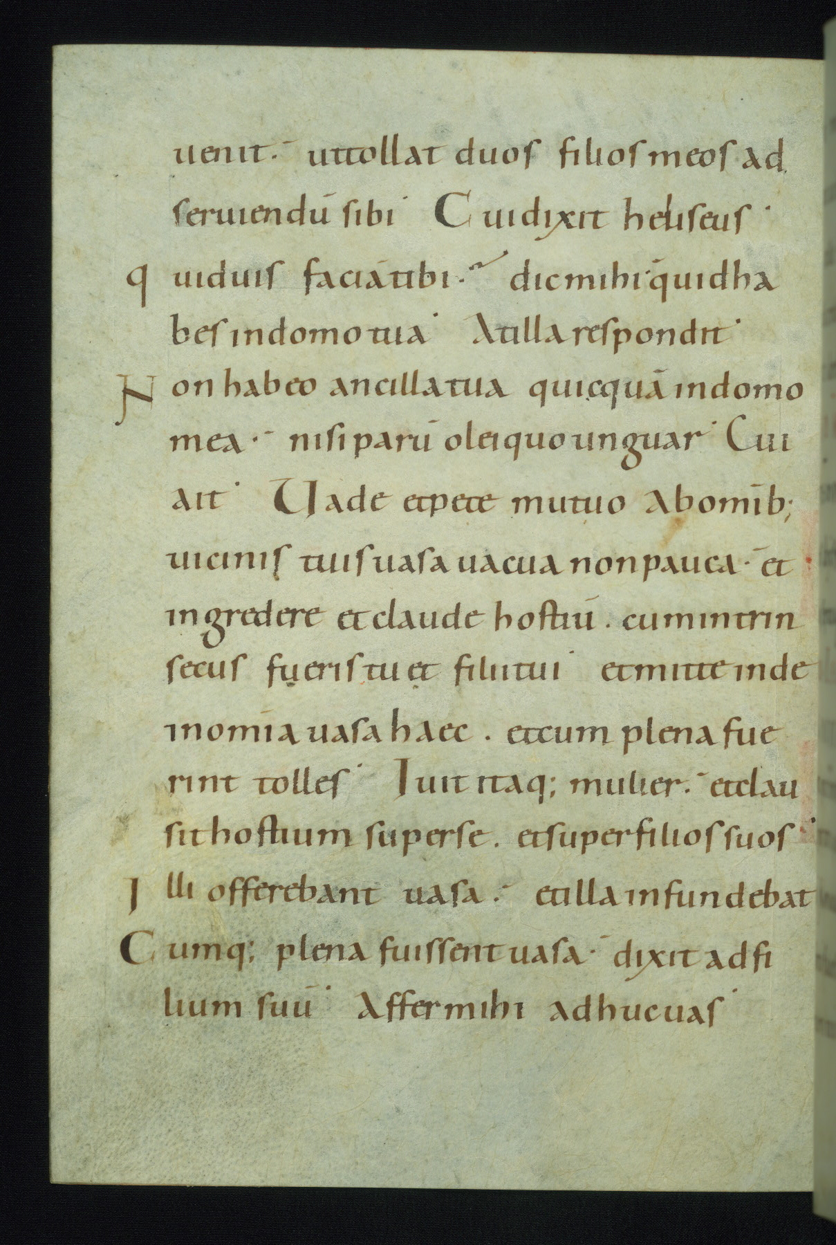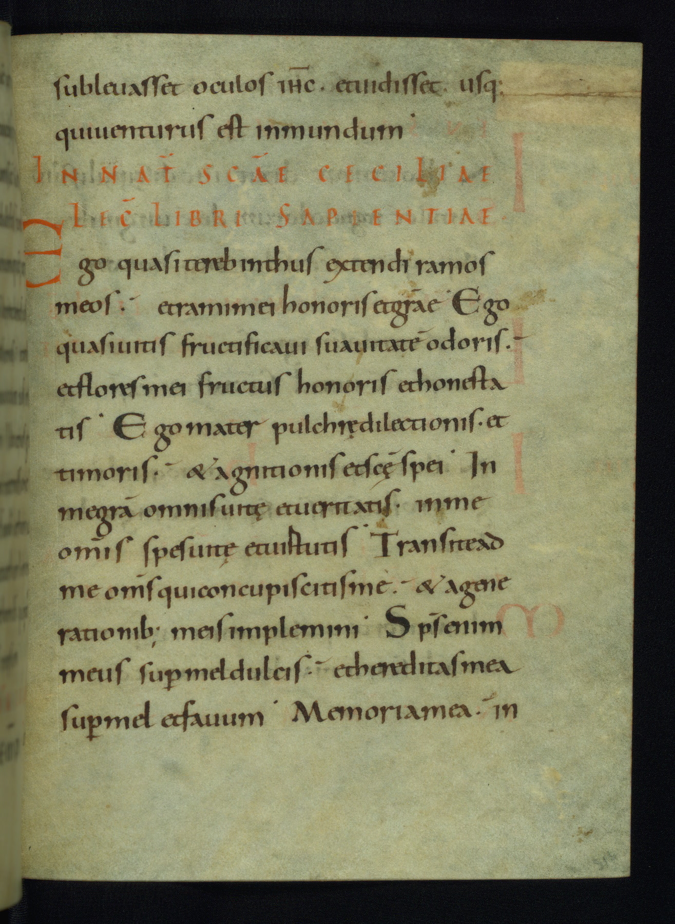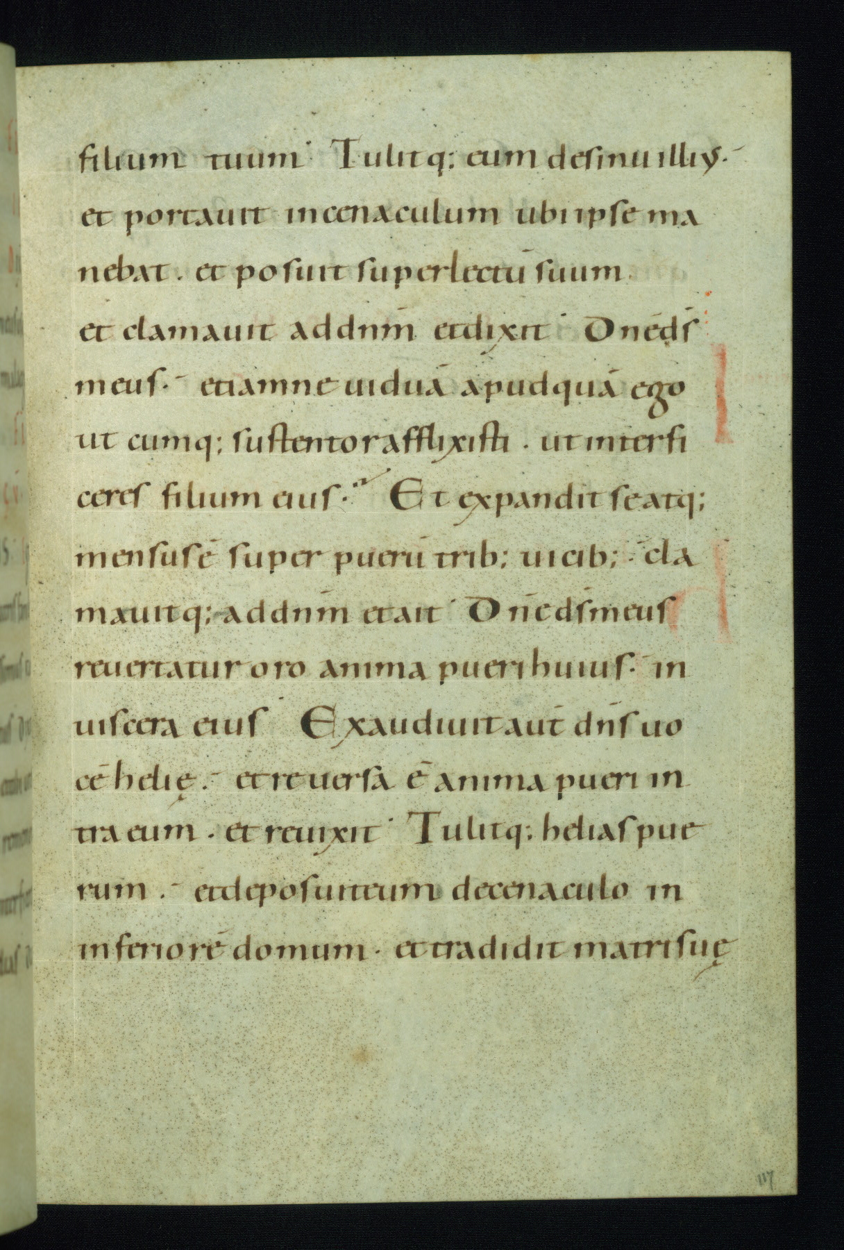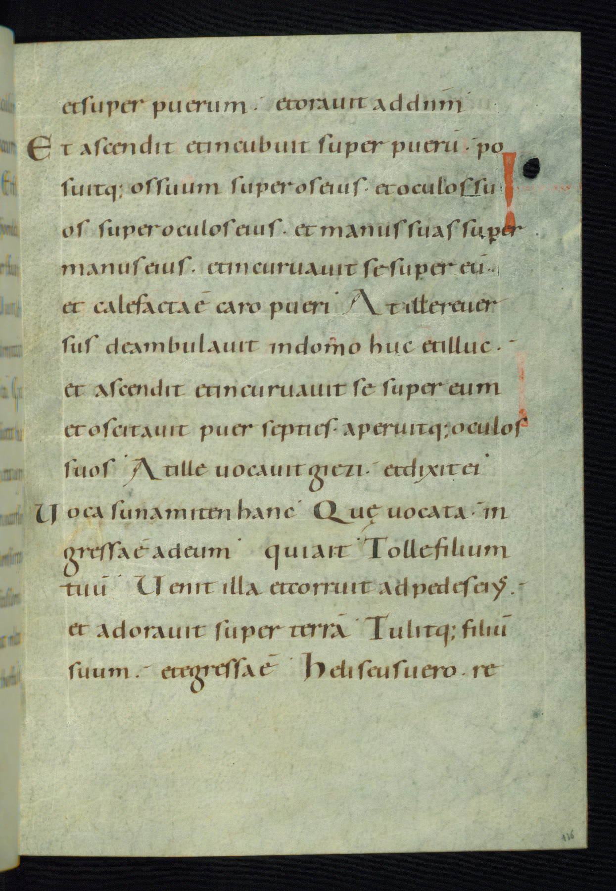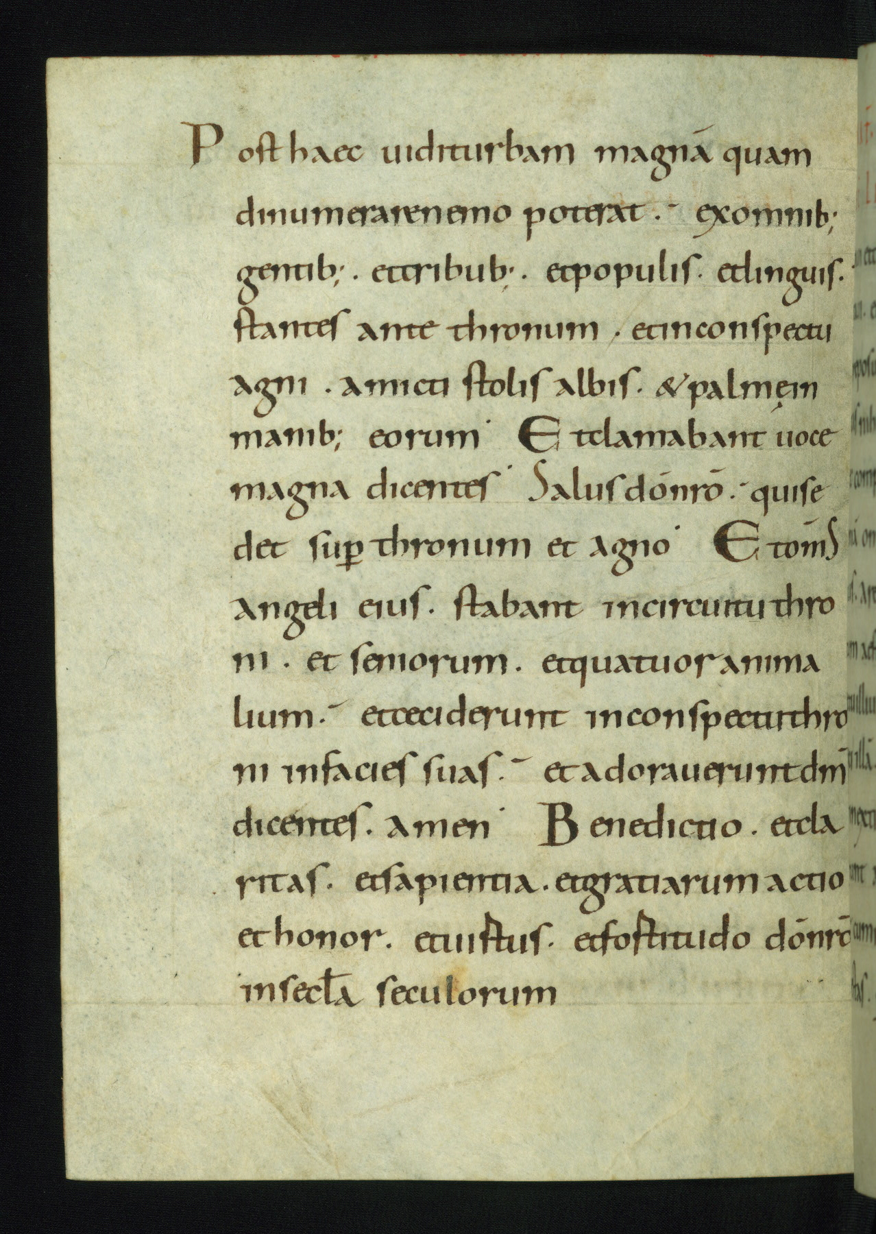 This Lectionary was created ca. 1000 in Trier. Written in a clear Caroline minuscule, it contains decorated initials at the openings of important readings. A set of illuminated letters marks the beginning of the Epistle and Gospel lessons for Easter; they display the hierarchy of scripts with capital letters decorated with gold leaf or drawn in red ink, followed by uncial and Caroline minuscule. Initials in orange, sometimes filled with gold, mark the divisions of the text. The book has been stylistically compared with Ottonian manuscripts, especially with a Psalter preserved in Trier (Stadtbibliothek, Ms. 7) illuminated by the so-called Master of the Registrum Gregorii.