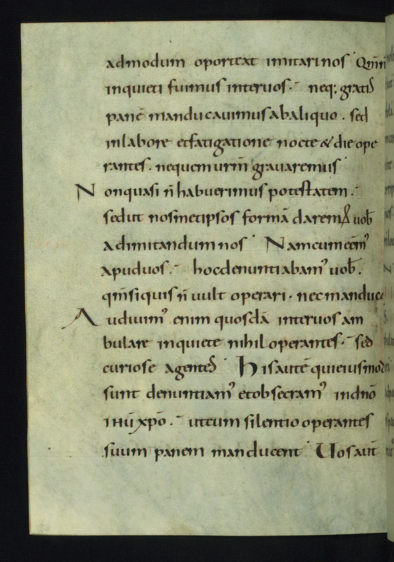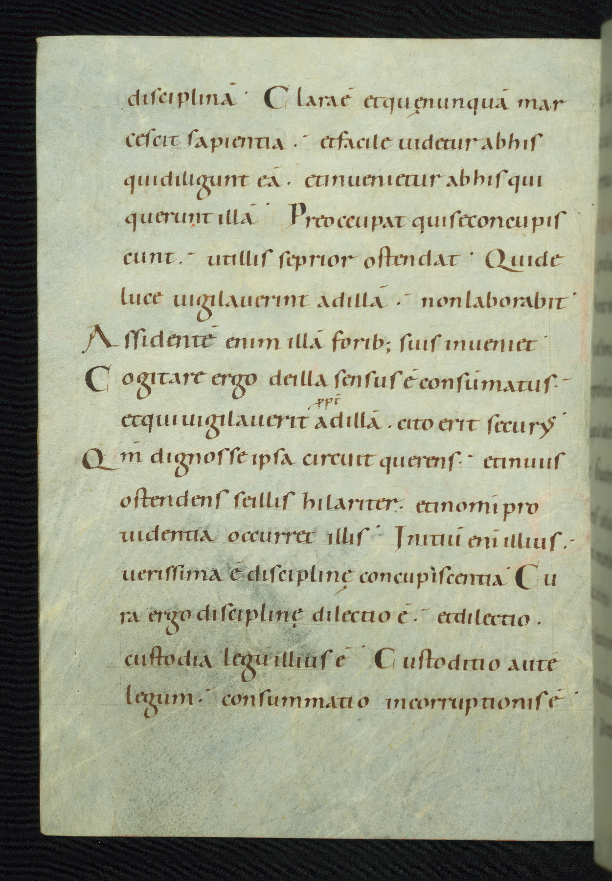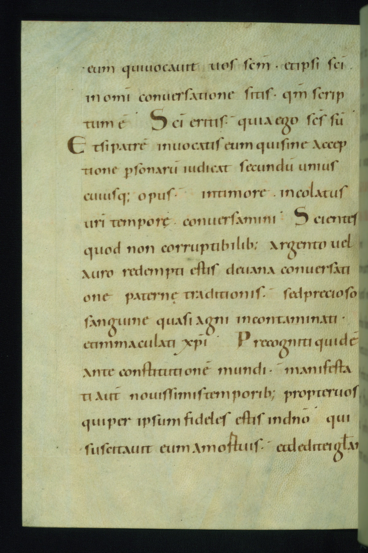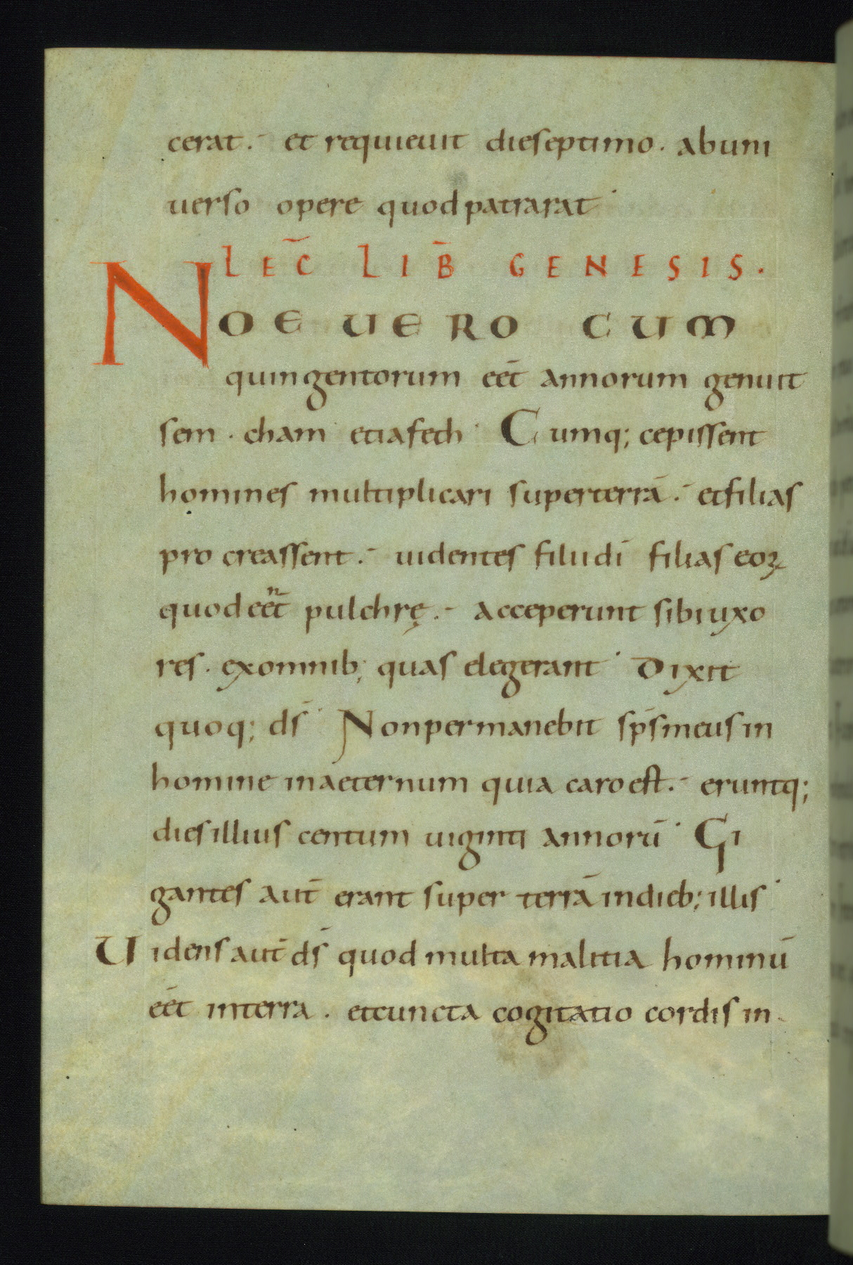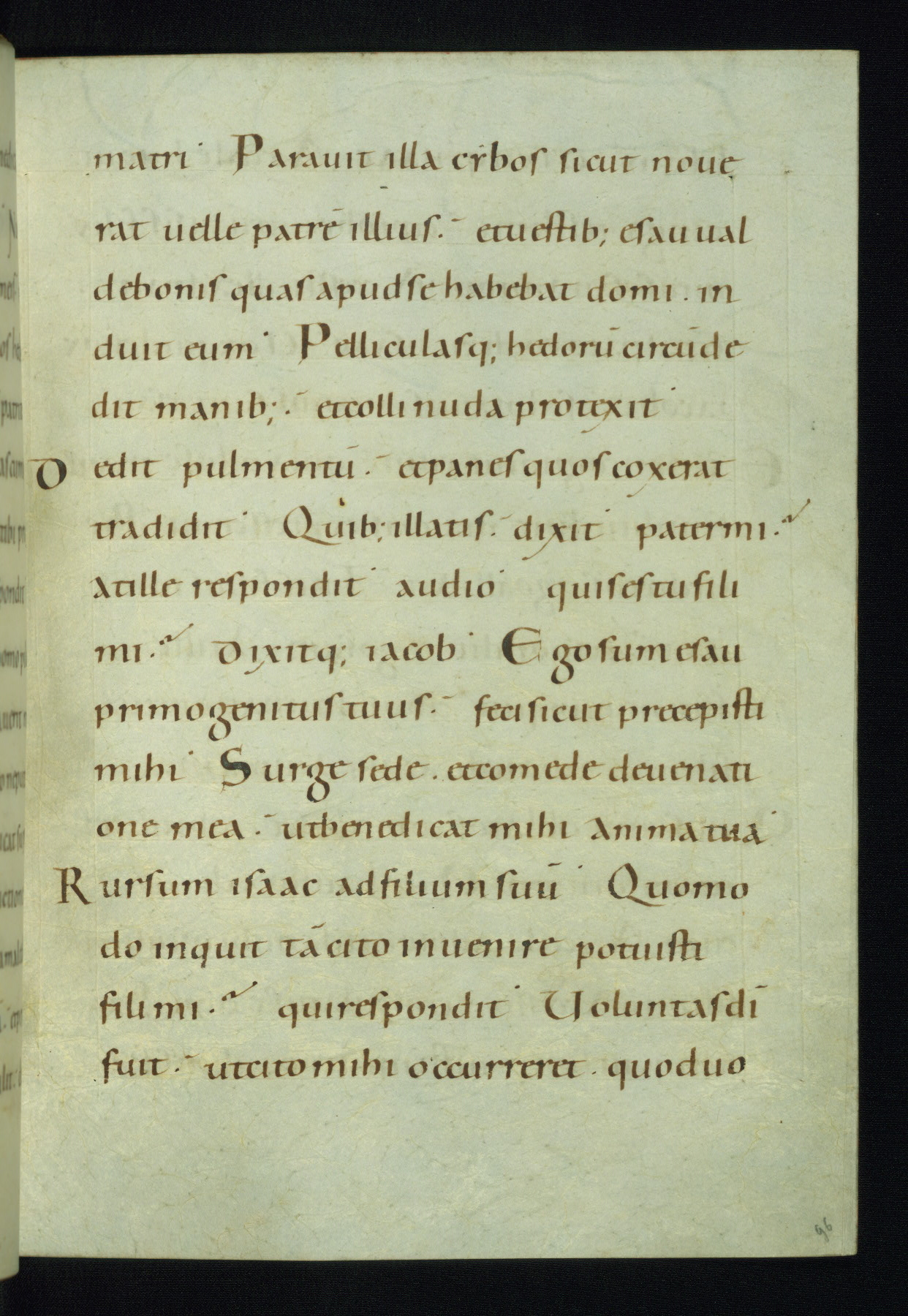 This Lectionary was created ca. 1000 in Trier. Written in a clear Caroline minuscule, it contains decorated initials at the openings of important readings. A set of illuminated letters marks the beginning of the Epistle and Gospel lessons for Easter; they display the hierarchy of scripts with capital letters decorated with gold leaf or drawn in red ink, followed by uncial and Caroline minuscule. Initials in orange, sometimes filled with gold, mark the divisions of the text. The book has been stylistically compared with Ottonian manuscripts, especially with a Psalter preserved in Trier (Stadtbibliothek, Ms. 7) illuminated by the so-called Master of the Registrum Gregorii.