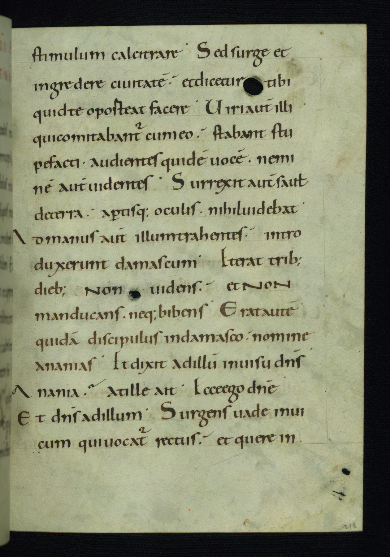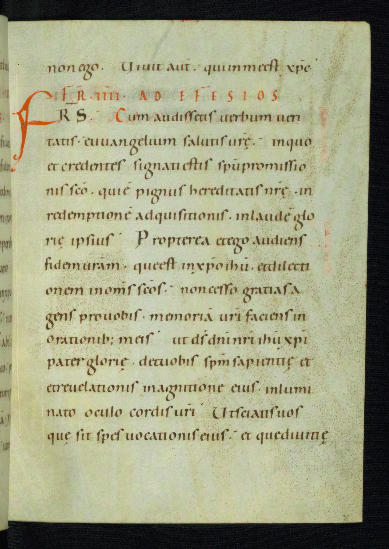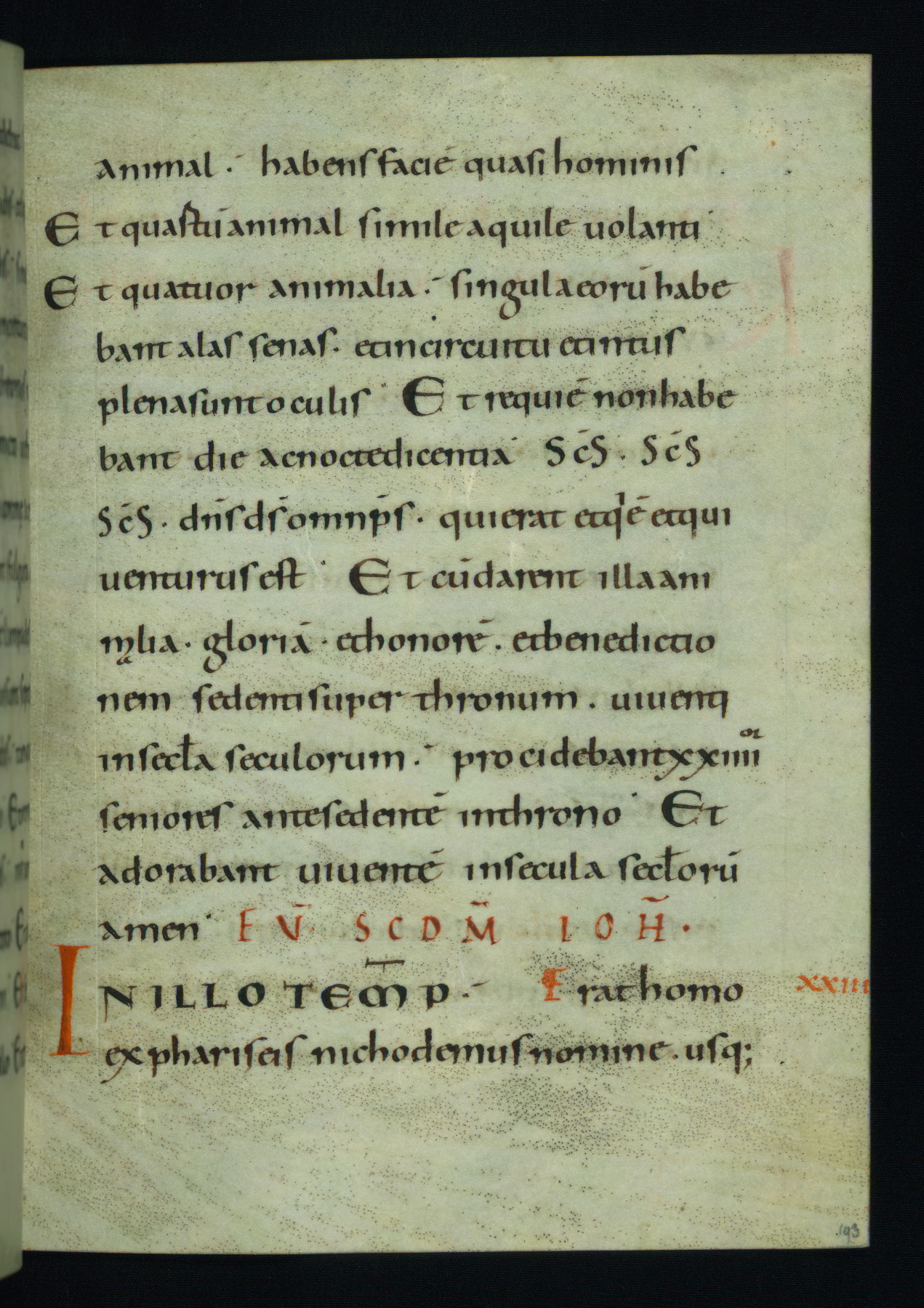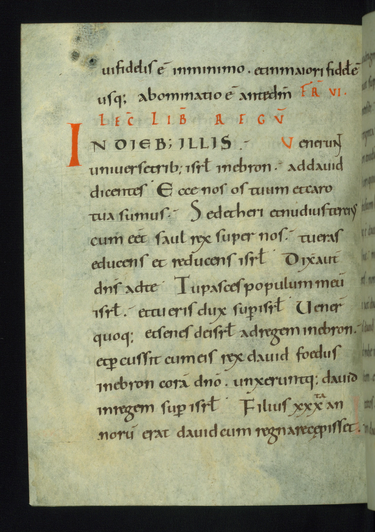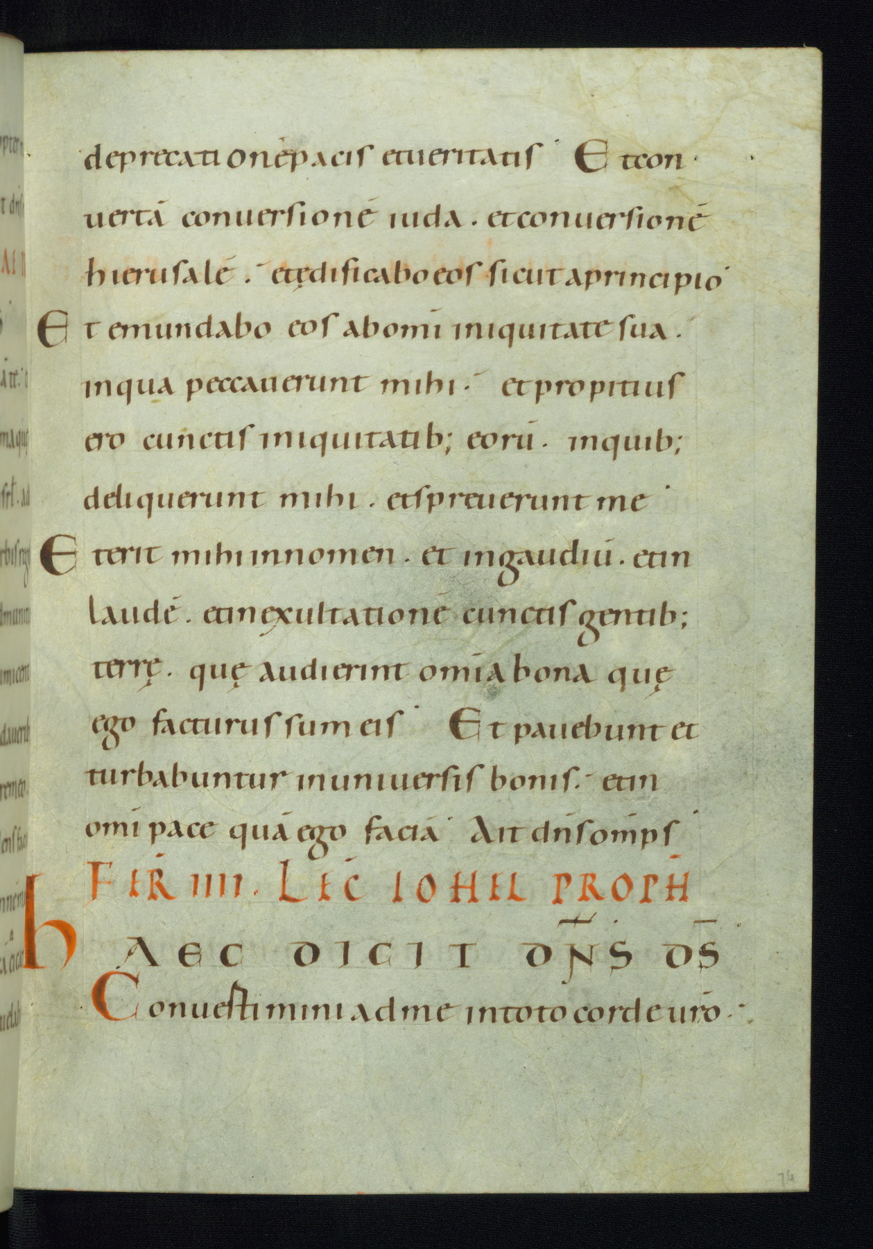 This Lectionary was created ca. 1000 in Trier. Written in a clear Caroline minuscule, it contains decorated initials at the openings of important readings. A set of illuminated letters marks the beginning of the Epistle and Gospel lessons for Easter; they display the hierarchy of scripts with capital letters decorated with gold leaf or drawn in red ink, followed by uncial and Caroline minuscule. Initials in orange, sometimes filled with gold, mark the divisions of the text. The book has been stylistically compared with Ottonian manuscripts, especially with a Psalter preserved in Trier (Stadtbibliothek, Ms. 7) illuminated by the so-called Master of the Registrum Gregorii.