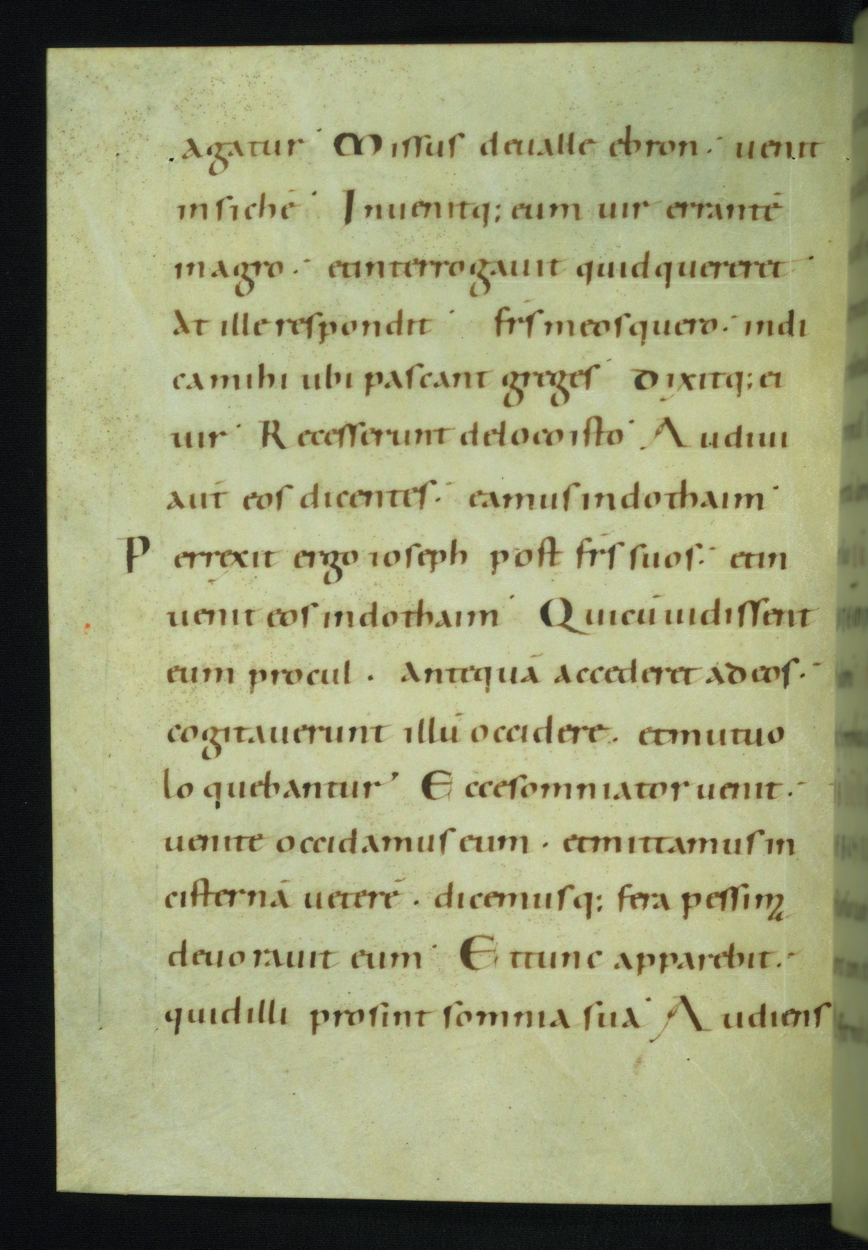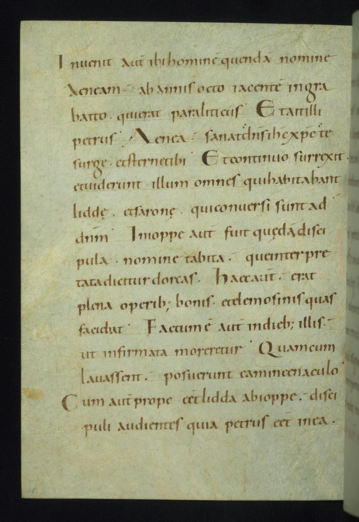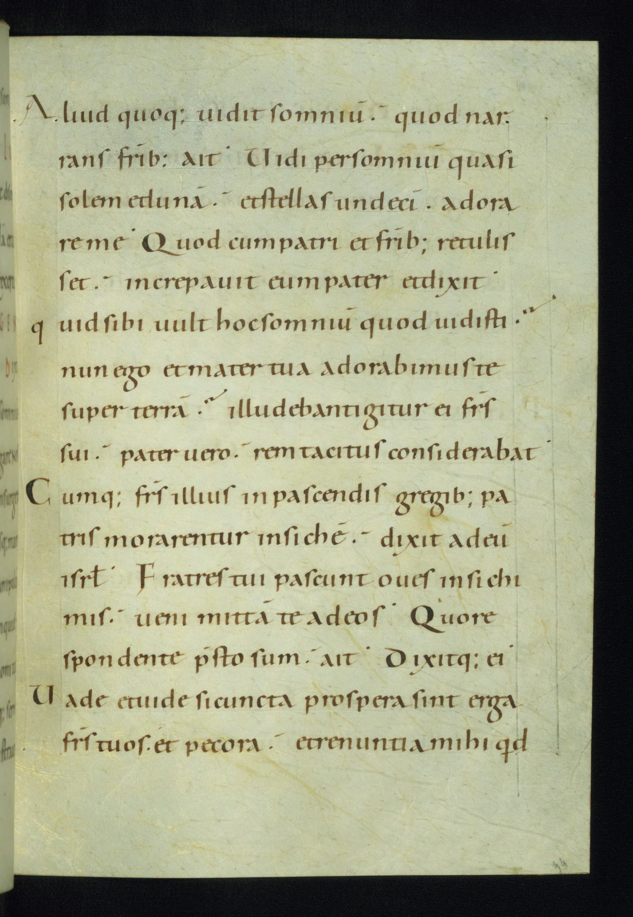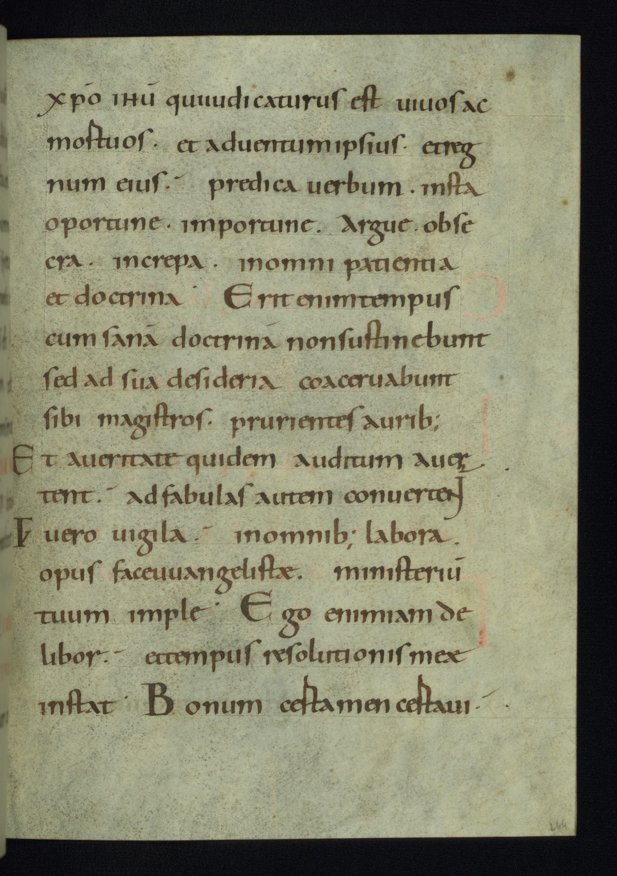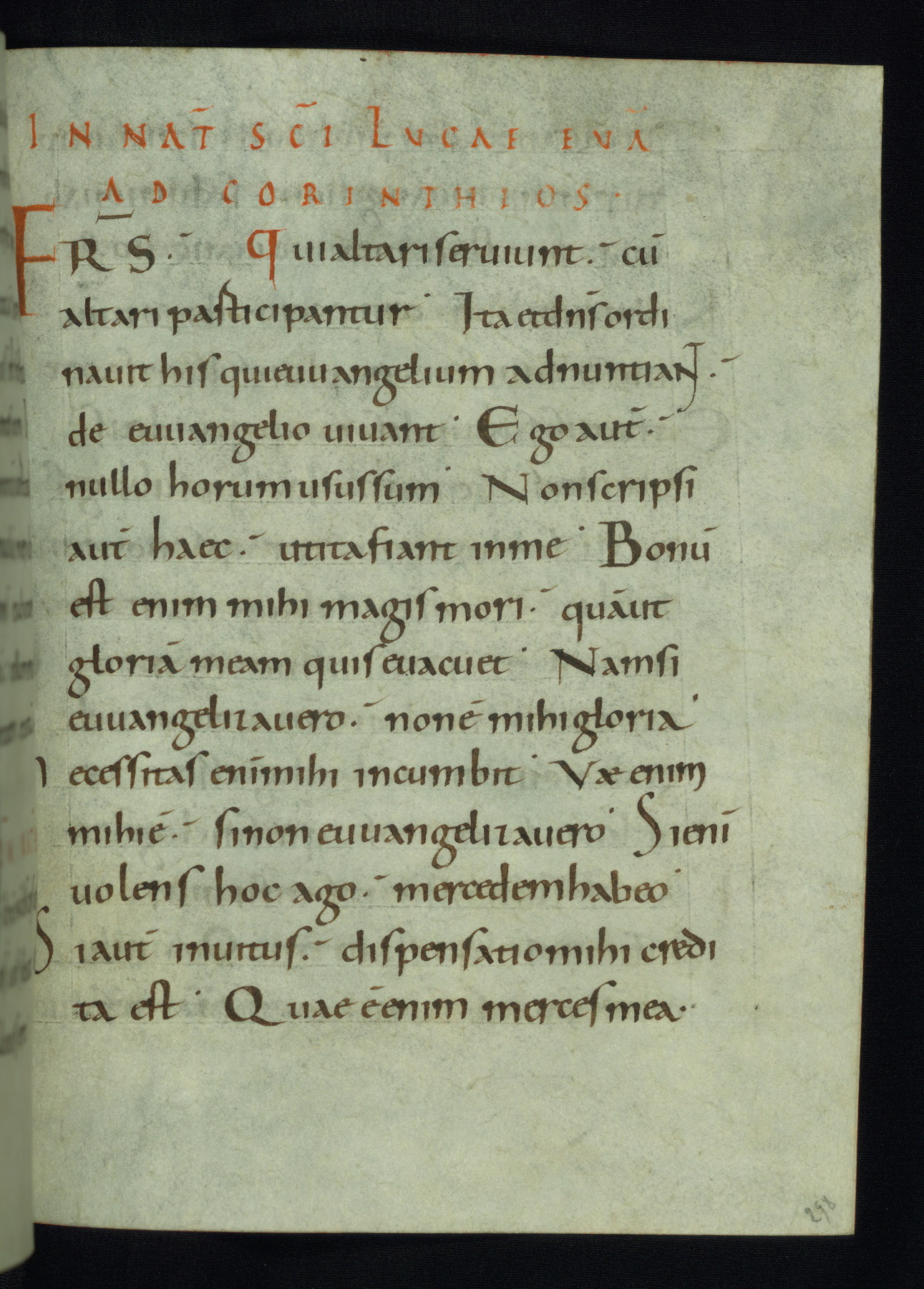 This Lectionary was created ca. 1000 in Trier. Written in a clear Caroline minuscule, it contains decorated initials at the openings of important readings. A set of illuminated letters marks the beginning of the Epistle and Gospel lessons for Easter; they display the hierarchy of scripts with capital letters decorated with gold leaf or drawn in red ink, followed by uncial and Caroline minuscule. Initials in orange, sometimes filled with gold, mark the divisions of the text. The book has been stylistically compared with Ottonian manuscripts, especially with a Psalter preserved in Trier (Stadtbibliothek, Ms. 7) illuminated by the so-called Master of the Registrum Gregorii.