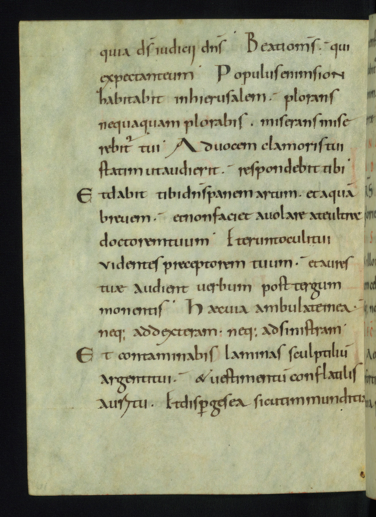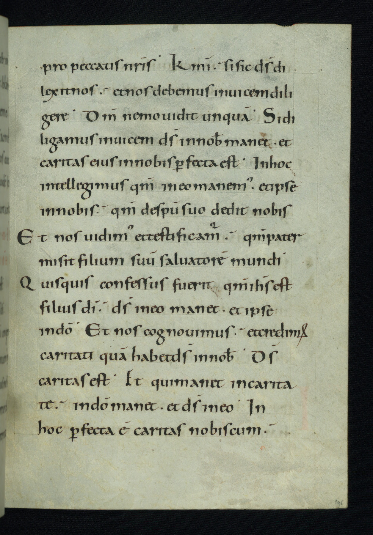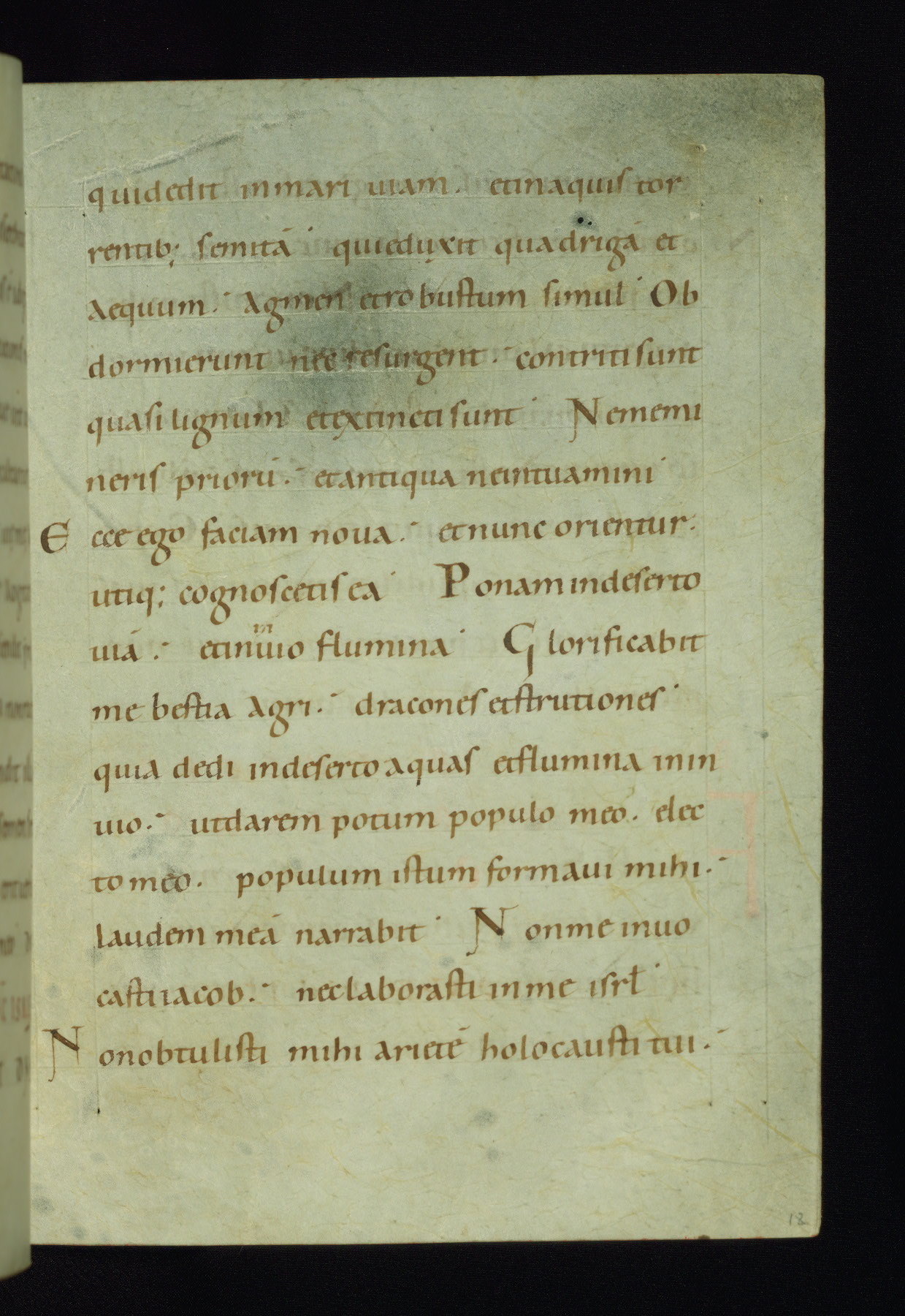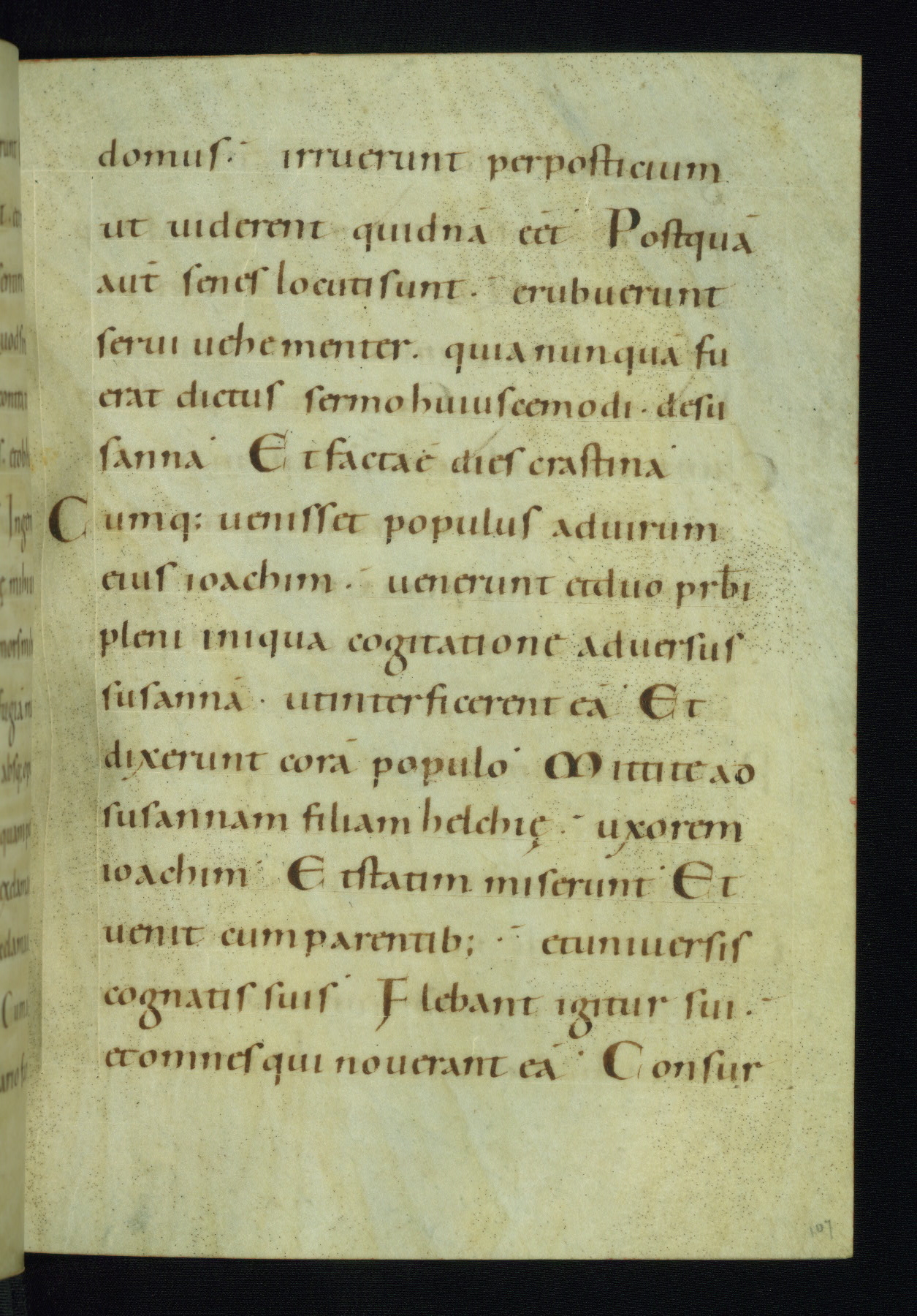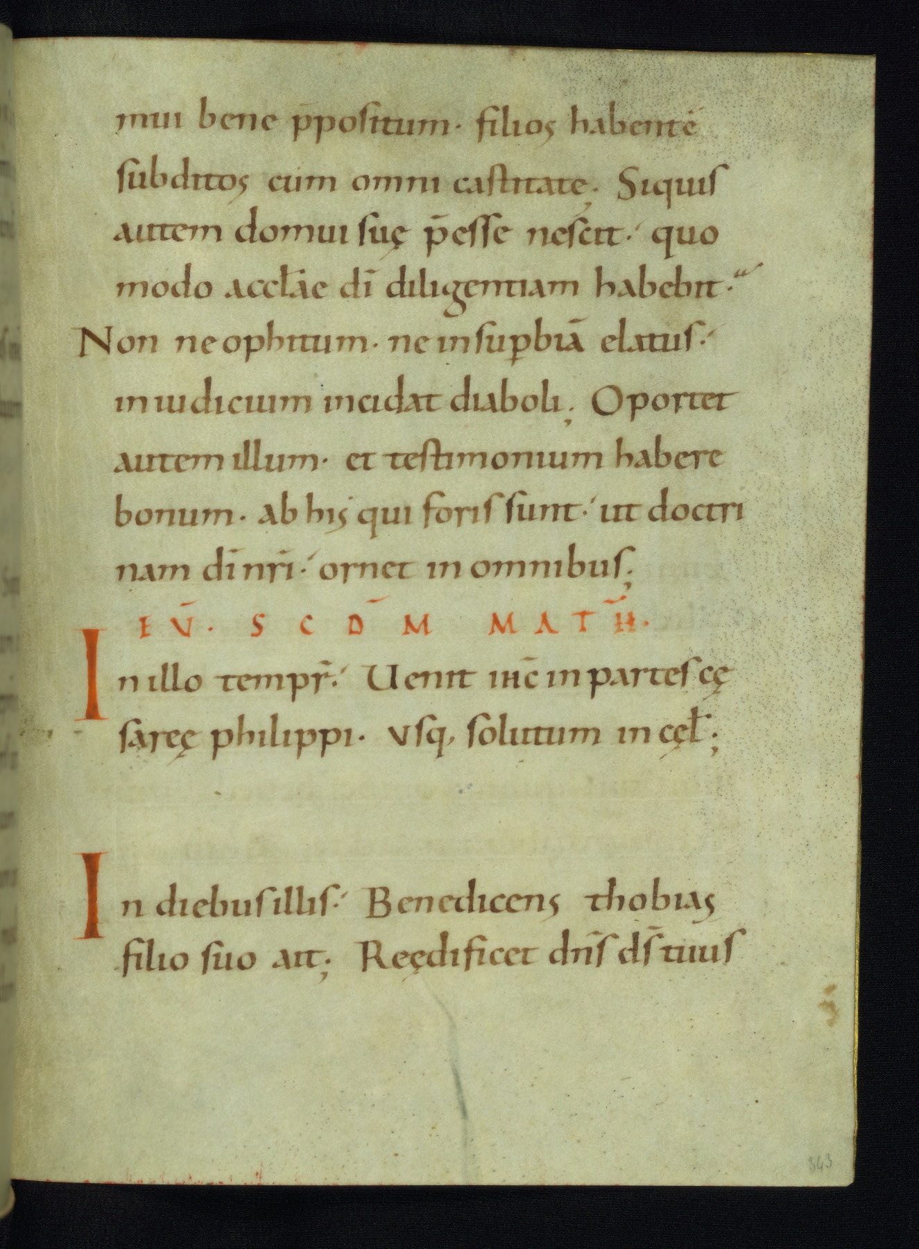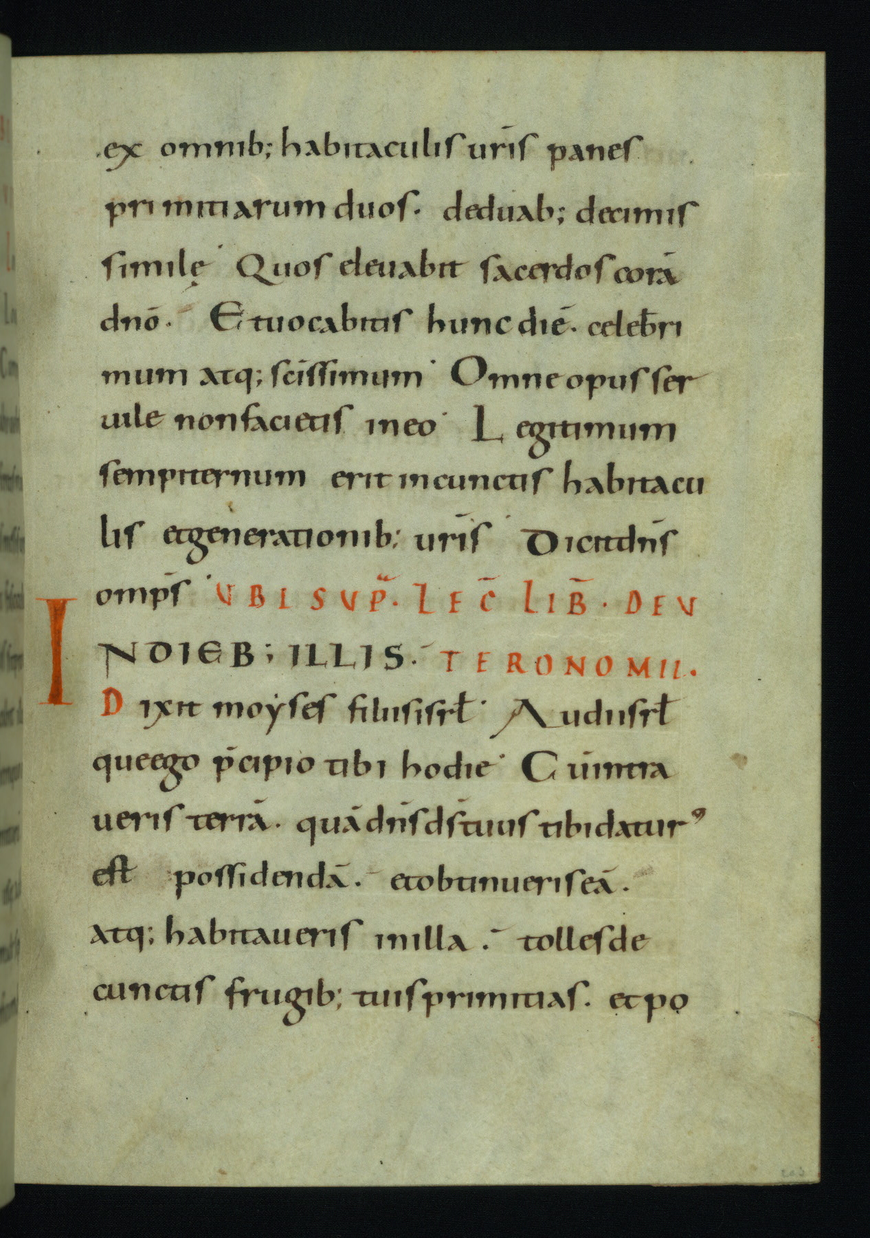 This Lectionary was created ca. 1000 in Trier. Written in a clear Caroline minuscule, it contains decorated initials at the openings of important readings. A set of illuminated letters marks the beginning of the Epistle and Gospel lessons for Easter; they display the hierarchy of scripts with capital letters decorated with gold leaf or drawn in red ink, followed by uncial and Caroline minuscule. Initials in orange, sometimes filled with gold, mark the divisions of the text. The book has been stylistically compared with Ottonian manuscripts, especially with a Psalter preserved in Trier (Stadtbibliothek, Ms. 7) illuminated by the so-called Master of the Registrum Gregorii.