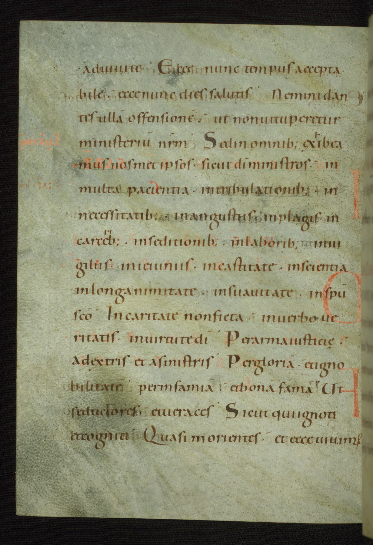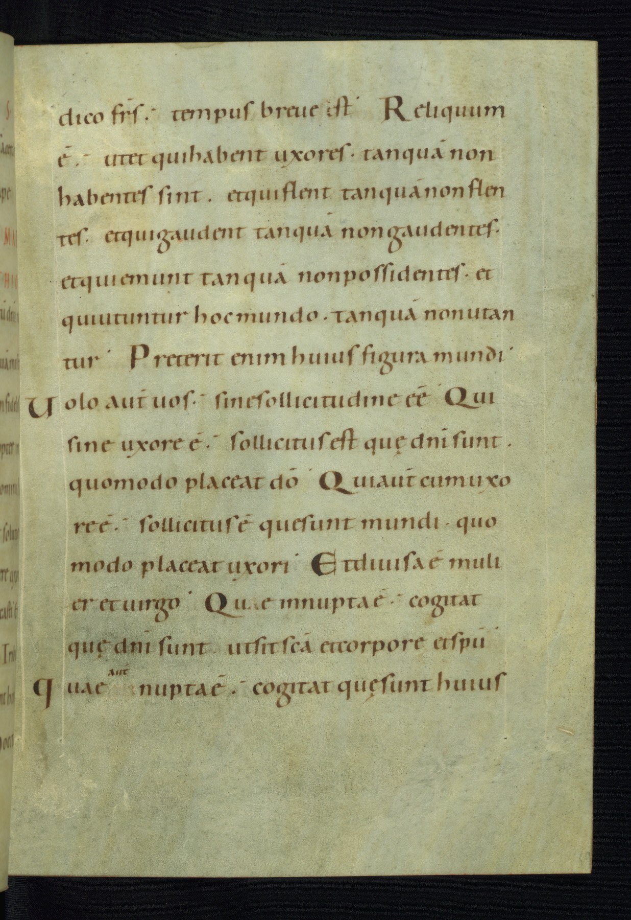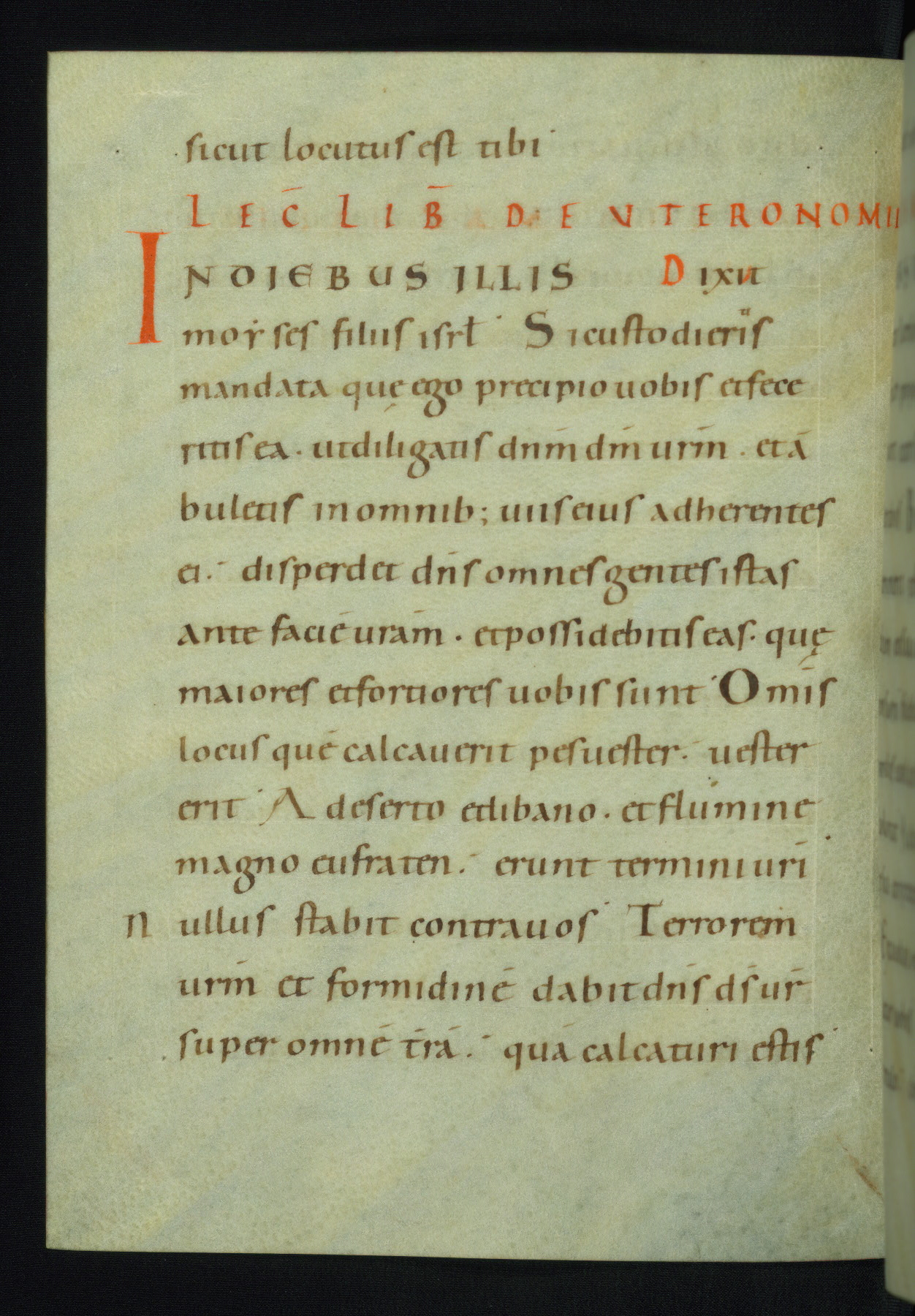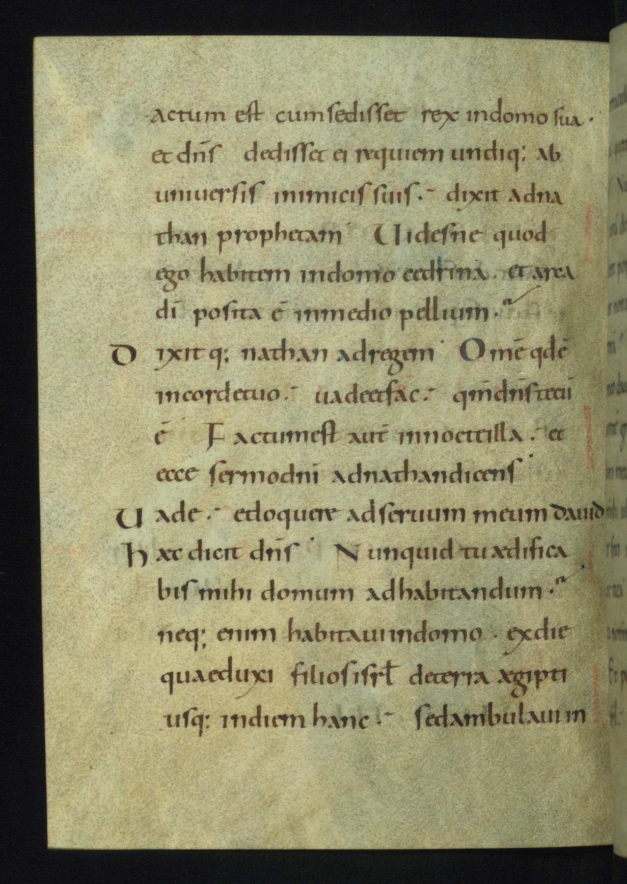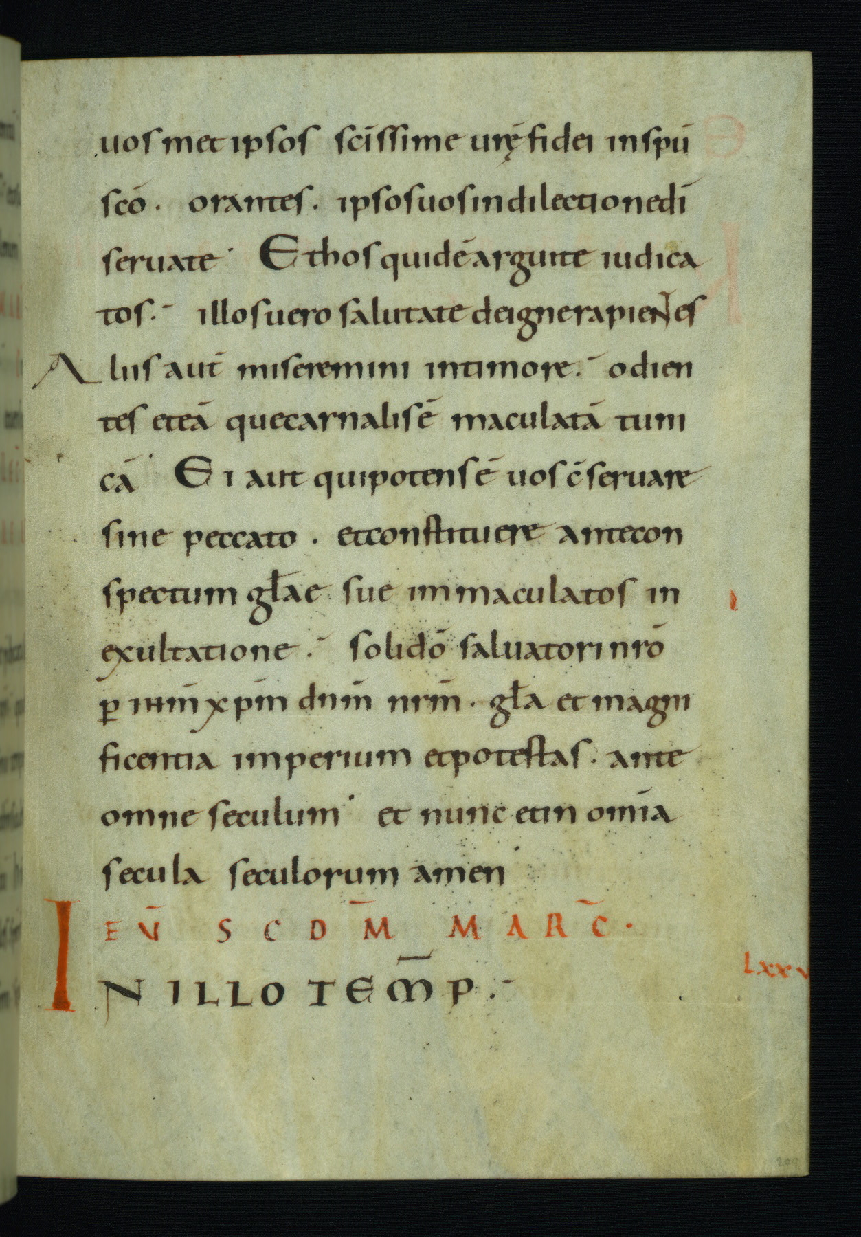 This Lectionary was created ca. 1000 in Trier. Written in a clear Caroline minuscule, it contains decorated initials at the openings of important readings. A set of illuminated letters marks the beginning of the Epistle and Gospel lessons for Easter; they display the hierarchy of scripts with capital letters decorated with gold leaf or drawn in red ink, followed by uncial and Caroline minuscule. Initials in orange, sometimes filled with gold, mark the divisions of the text. The book has been stylistically compared with Ottonian manuscripts, especially with a Psalter preserved in Trier (Stadtbibliothek, Ms. 7) illuminated by the so-called Master of the Registrum Gregorii.