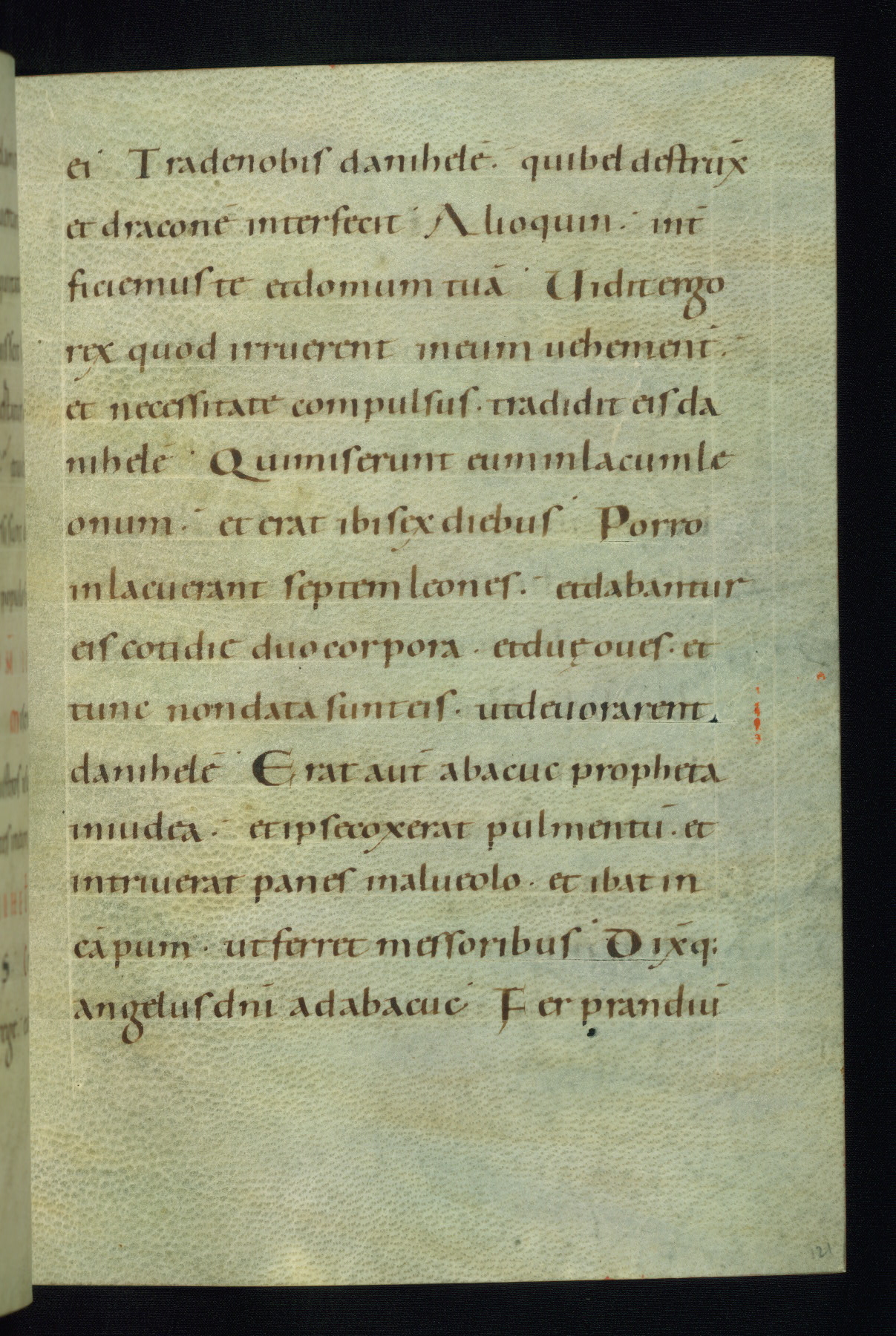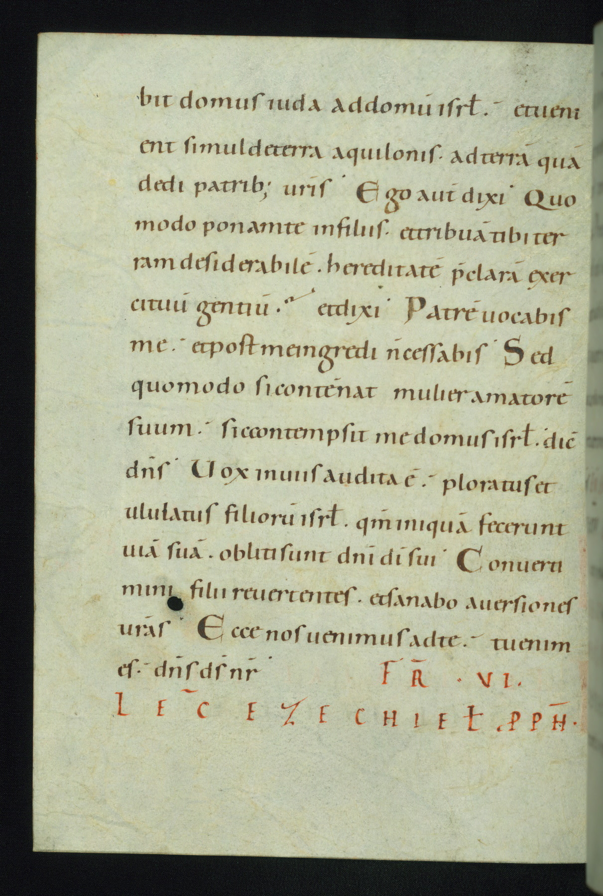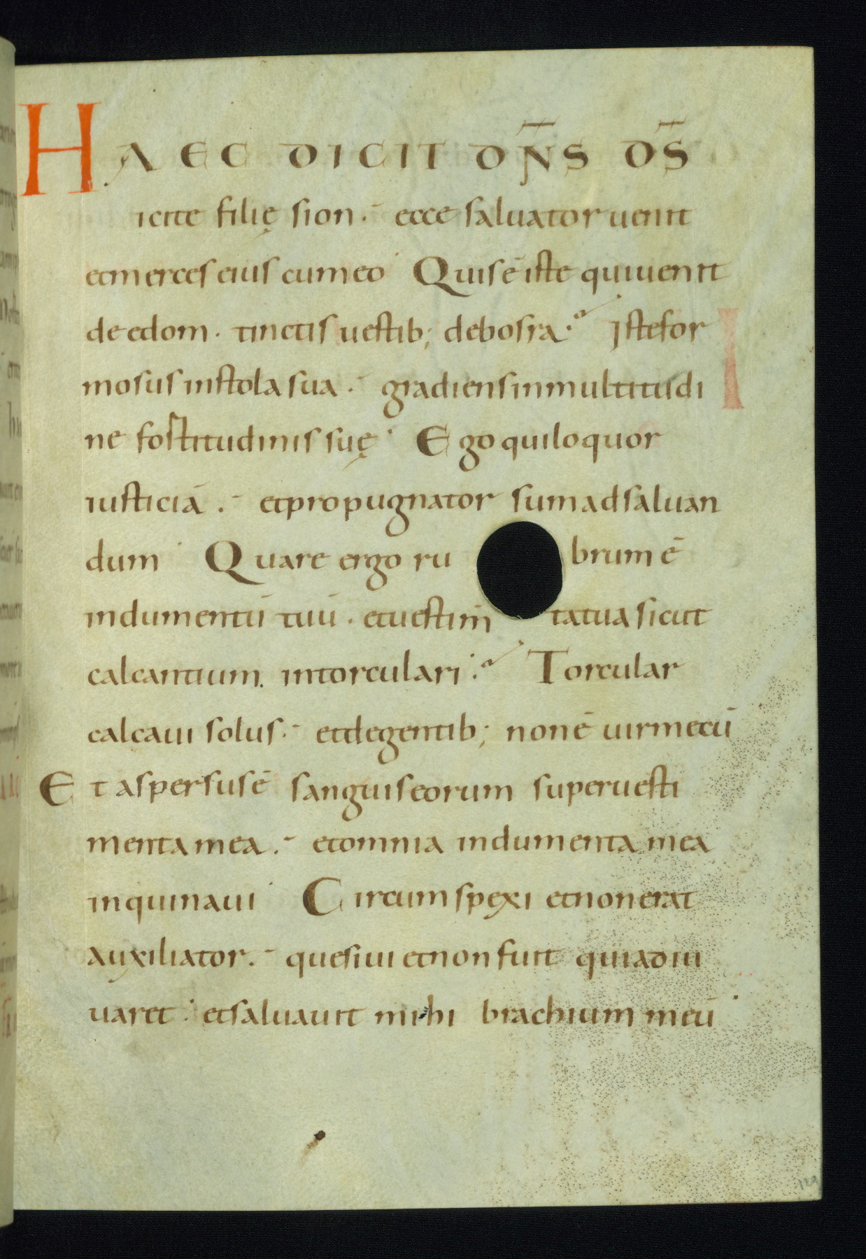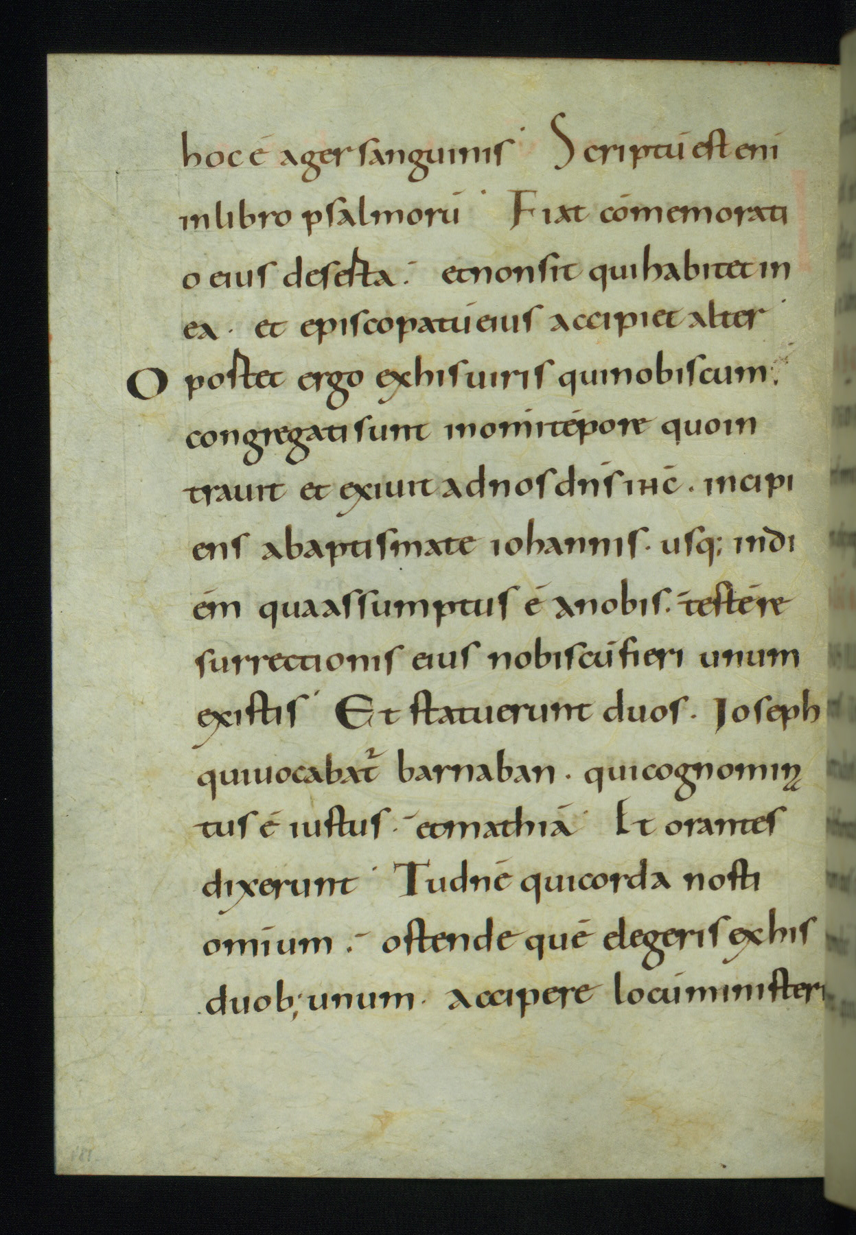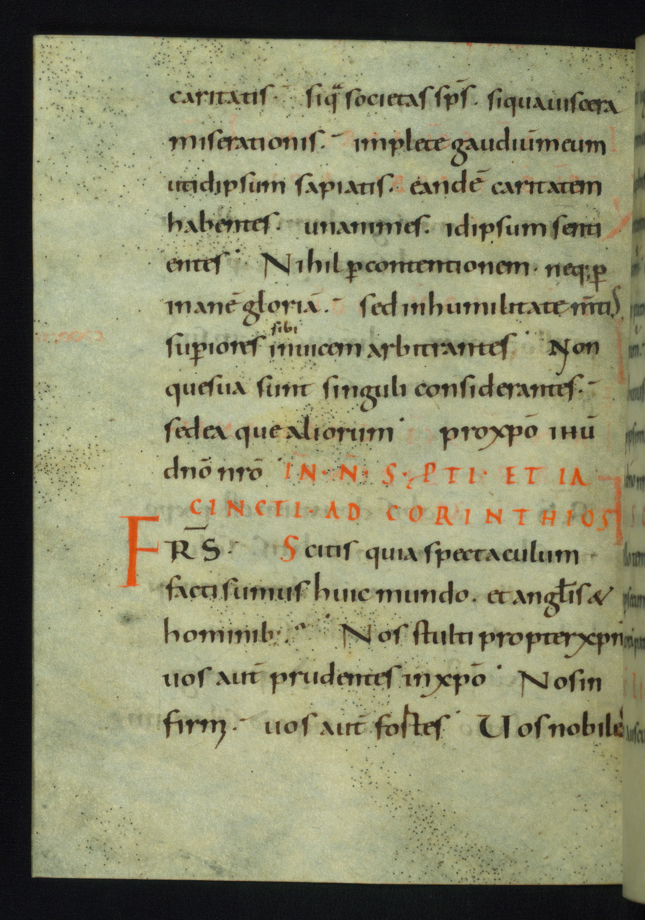 This Lectionary was created ca. 1000 in Trier. Written in a clear Caroline minuscule, it contains decorated initials at the openings of important readings. A set of illuminated letters marks the beginning of the Epistle and Gospel lessons for Easter; they display the hierarchy of scripts with capital letters decorated with gold leaf or drawn in red ink, followed by uncial and Caroline minuscule. Initials in orange, sometimes filled with gold, mark the divisions of the text. The book has been stylistically compared with Ottonian manuscripts, especially with a Psalter preserved in Trier (Stadtbibliothek, Ms. 7) illuminated by the so-called Master of the Registrum Gregorii.
