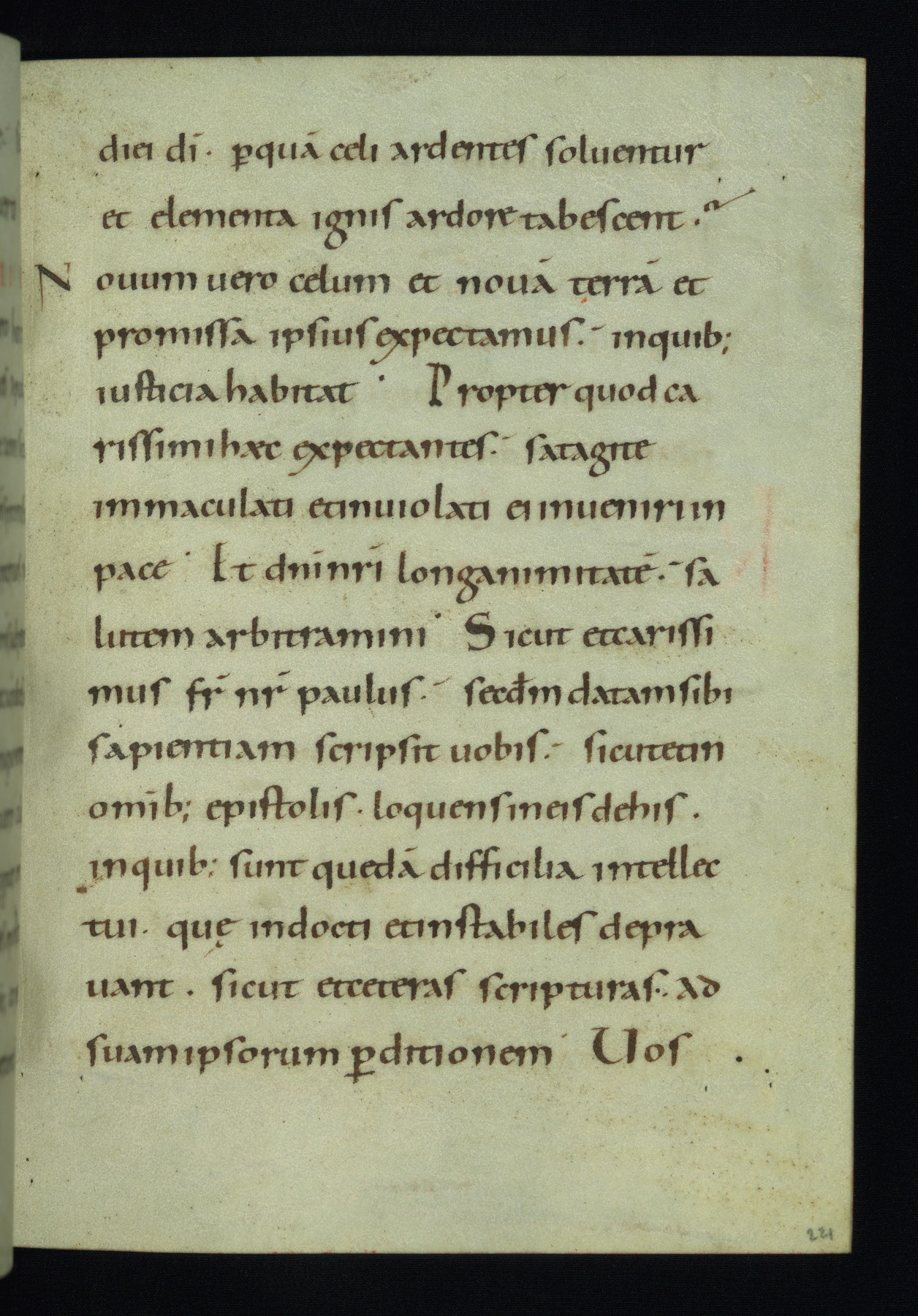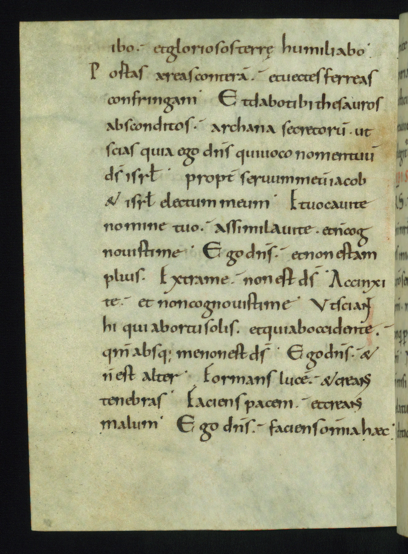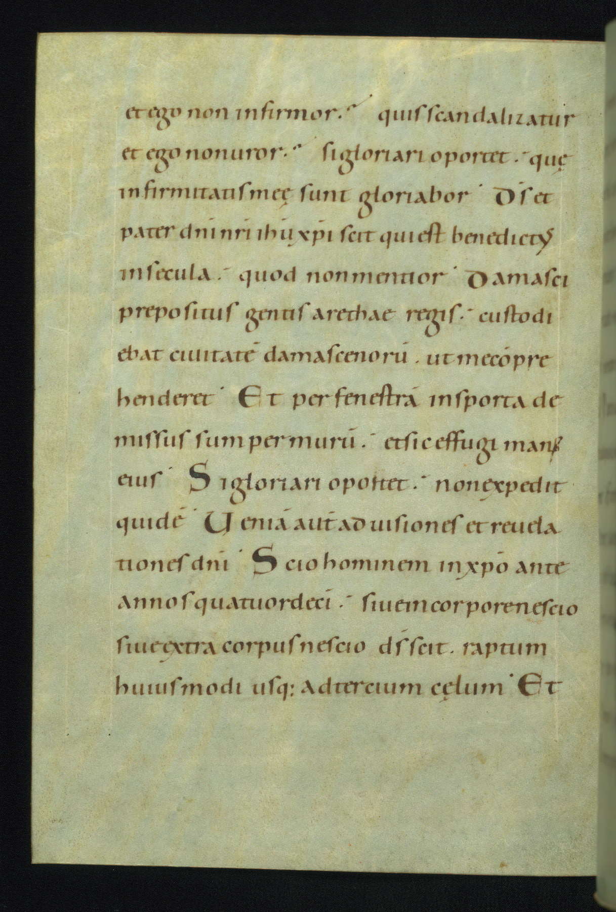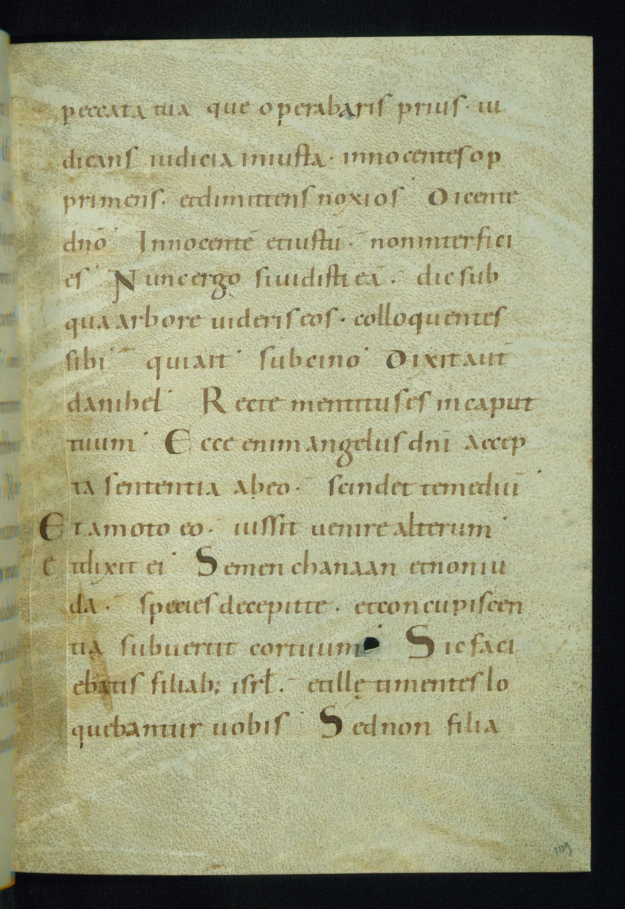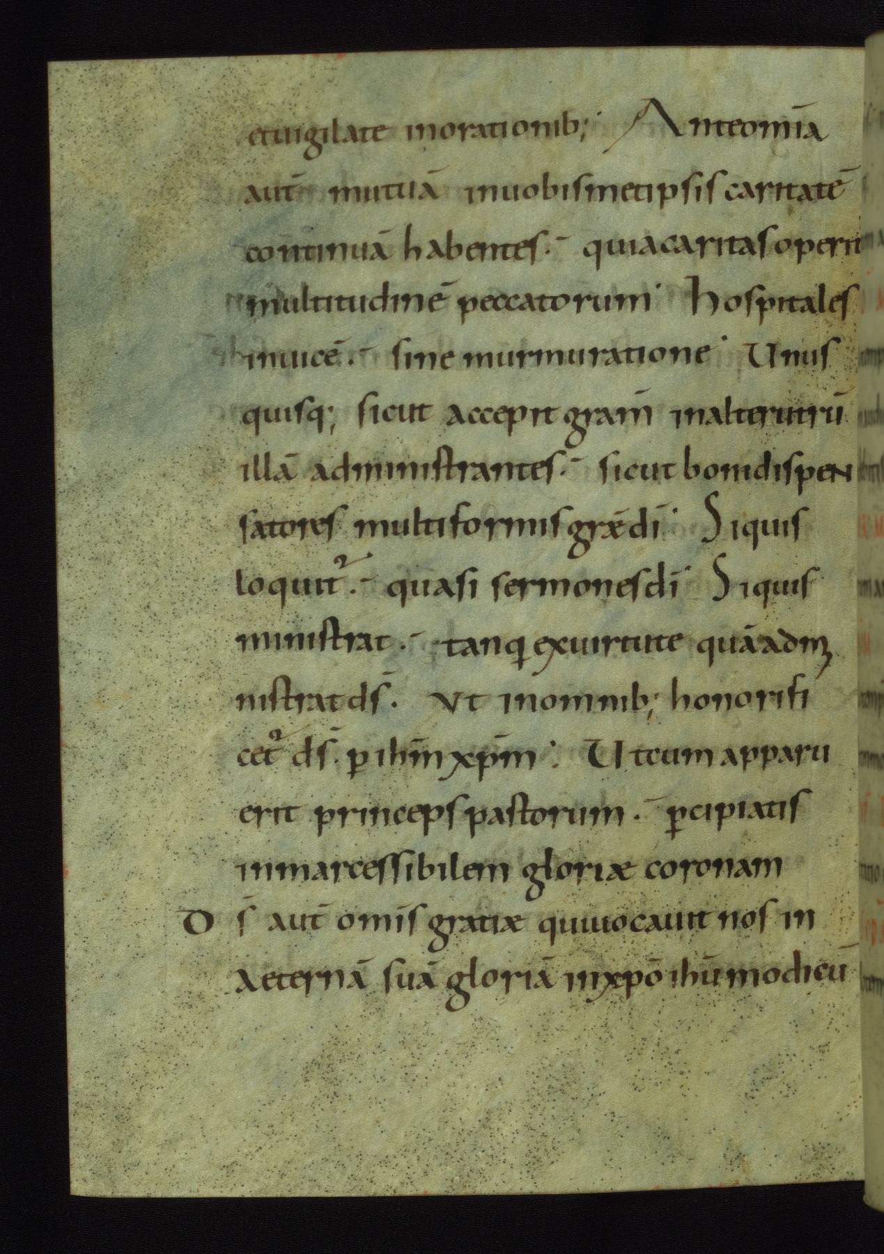 This Lectionary was created ca. 1000 in Trier. Written in a clear Caroline minuscule, it contains decorated initials at the openings of important readings. A set of illuminated letters marks the beginning of the Epistle and Gospel lessons for Easter; they display the hierarchy of scripts with capital letters decorated with gold leaf or drawn in red ink, followed by uncial and Caroline minuscule. Initials in orange, sometimes filled with gold, mark the divisions of the text. The book has been stylistically compared with Ottonian manuscripts, especially with a Psalter preserved in Trier (Stadtbibliothek, Ms. 7) illuminated by the so-called Master of the Registrum Gregorii.