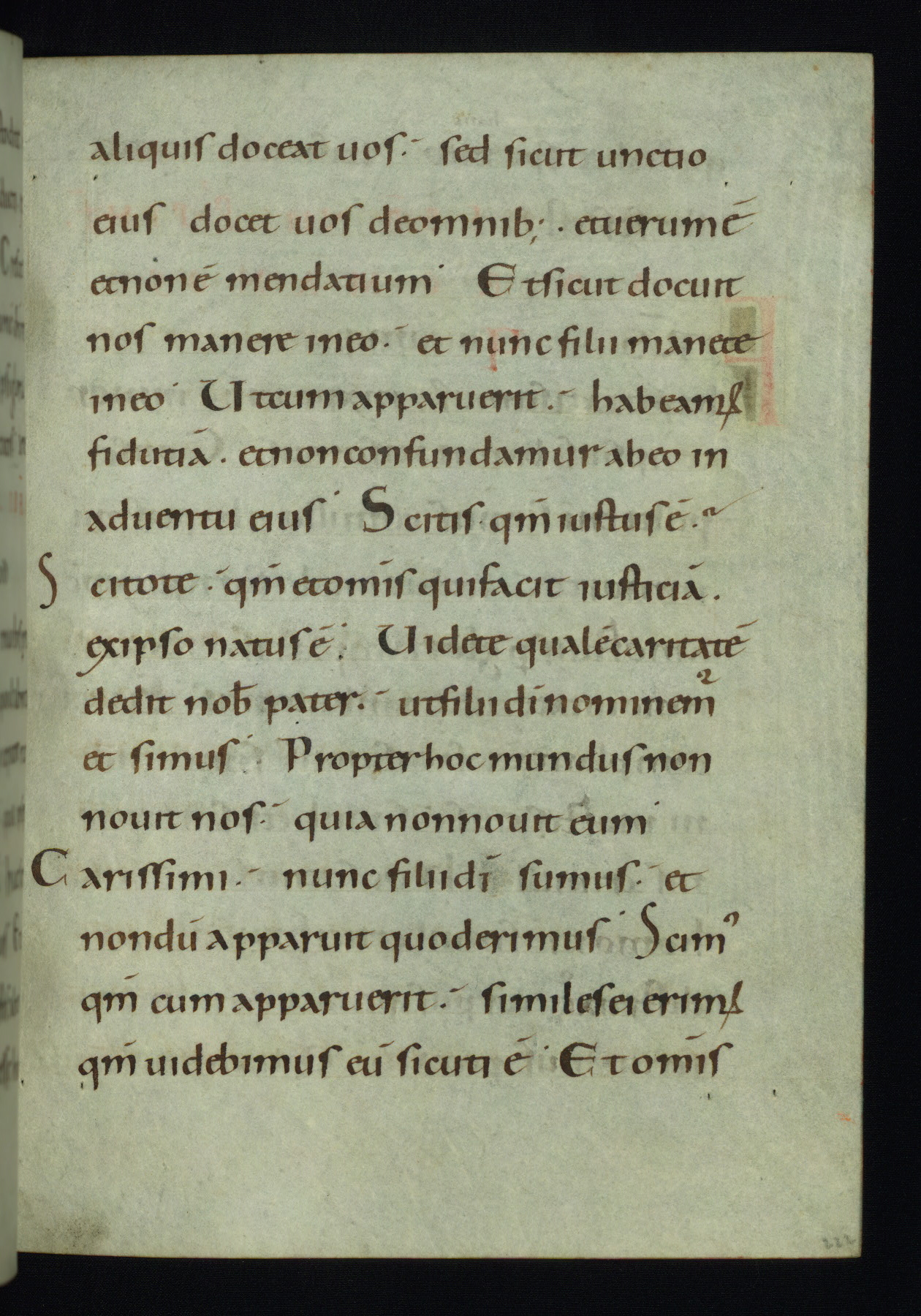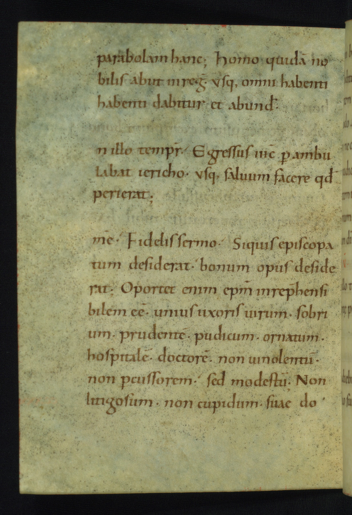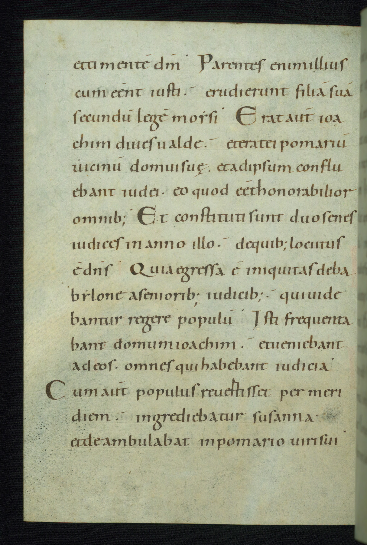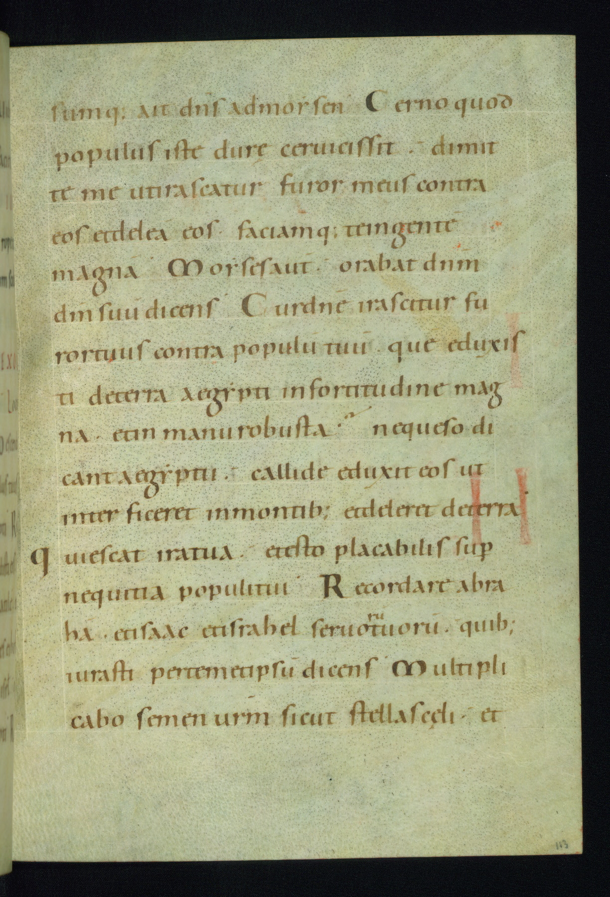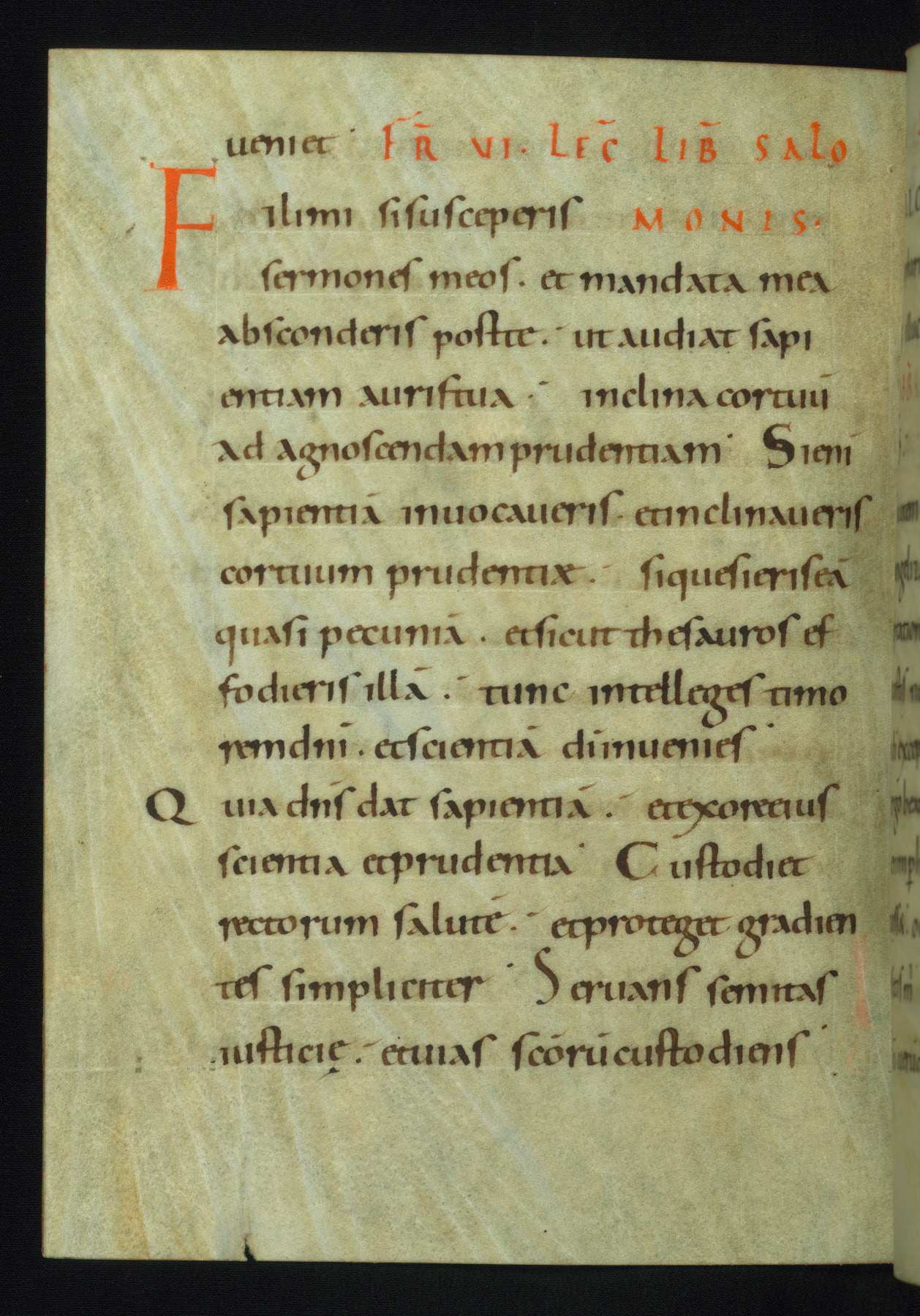 This Lectionary was created ca. 1000 in Trier. Written in a clear Caroline minuscule, it contains decorated initials at the openings of important readings. A set of illuminated letters marks the beginning of the Epistle and Gospel lessons for Easter; they display the hierarchy of scripts with capital letters decorated with gold leaf or drawn in red ink, followed by uncial and Caroline minuscule. Initials in orange, sometimes filled with gold, mark the divisions of the text. The book has been stylistically compared with Ottonian manuscripts, especially with a Psalter preserved in Trier (Stadtbibliothek, Ms. 7) illuminated by the so-called Master of the Registrum Gregorii.