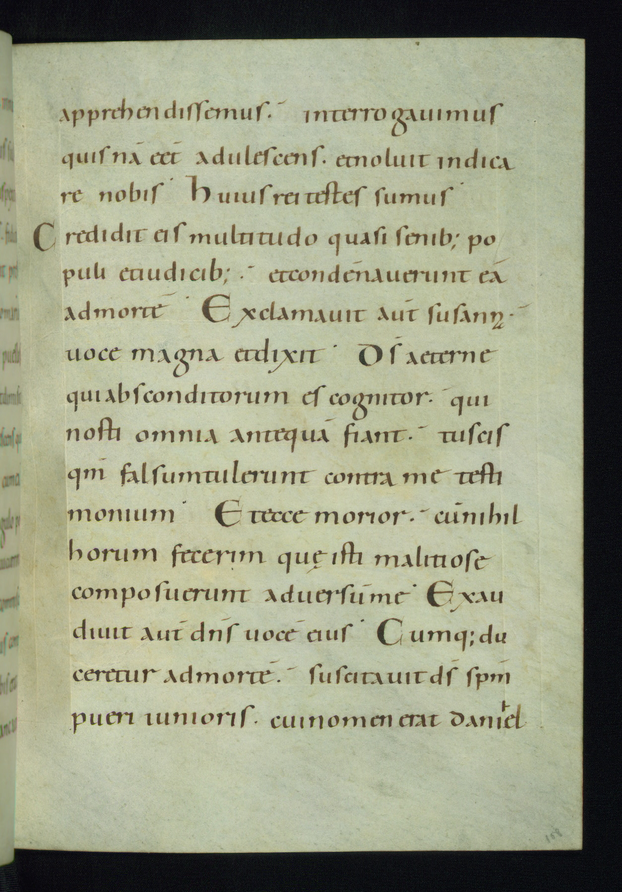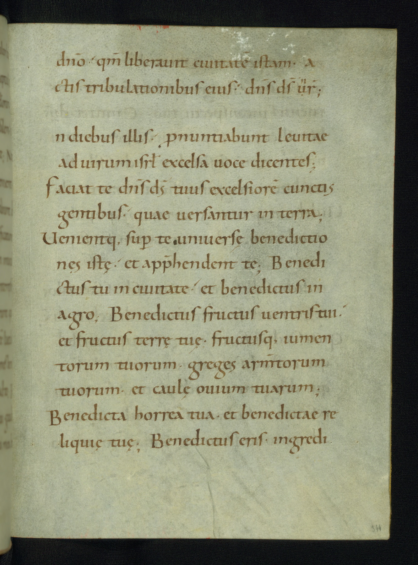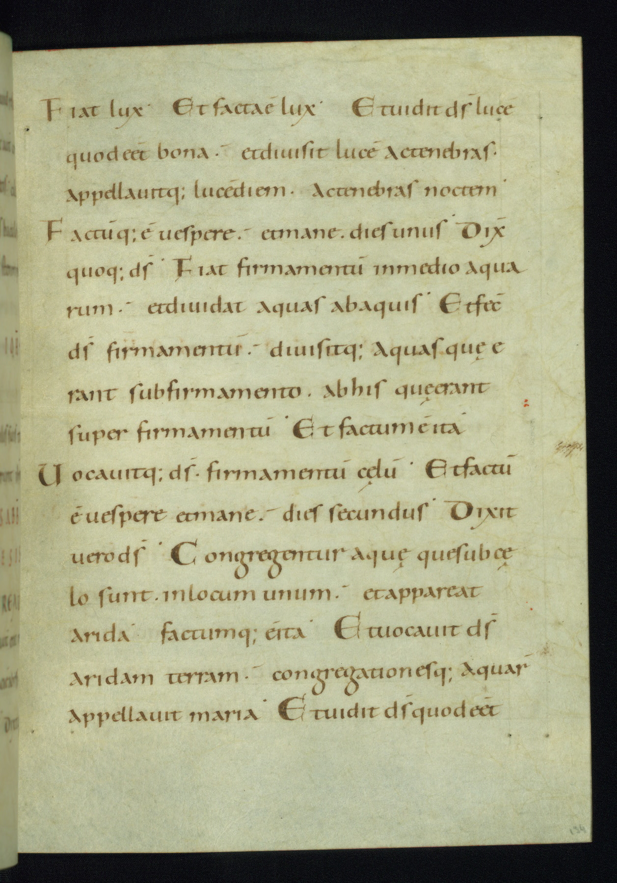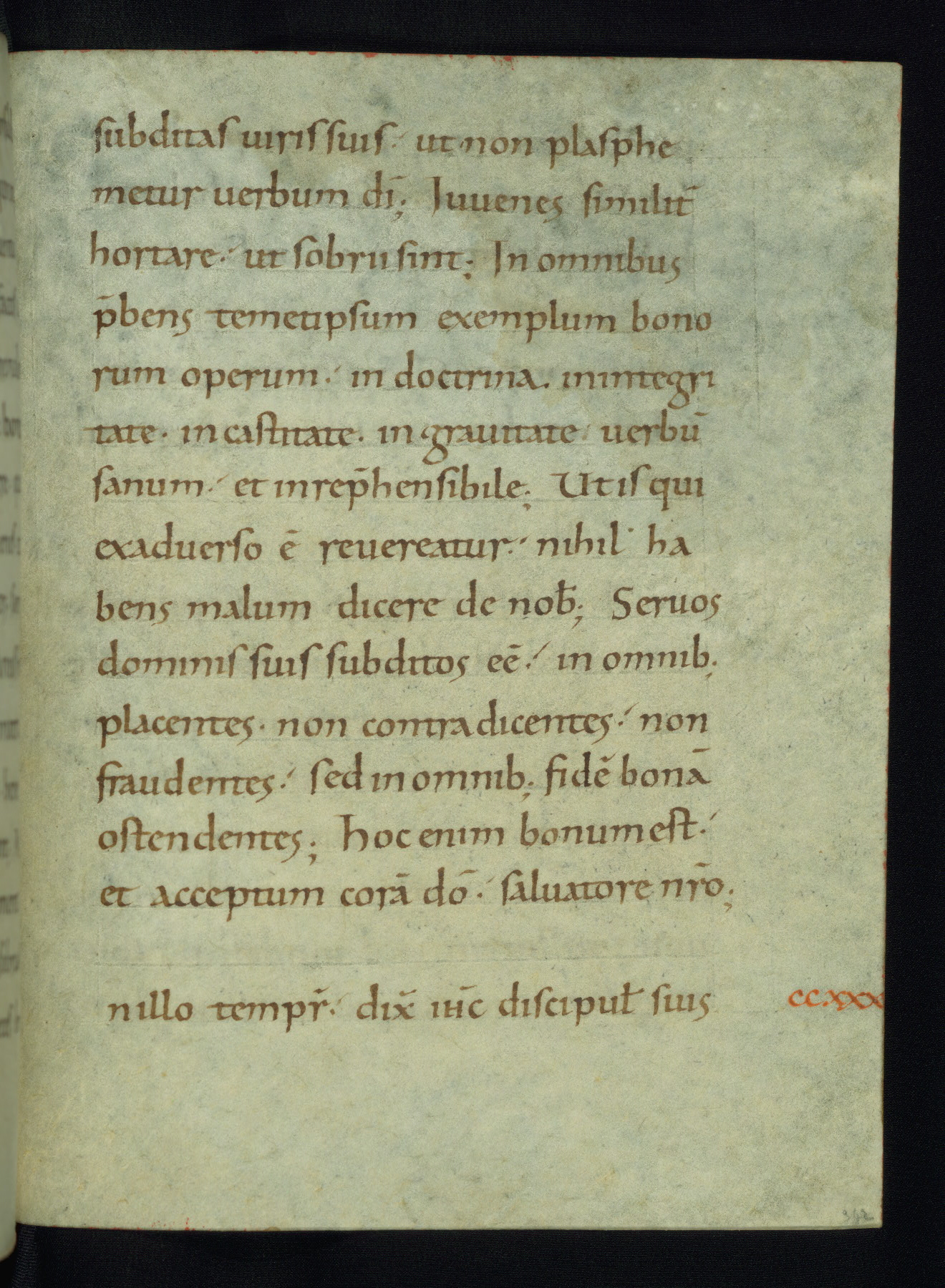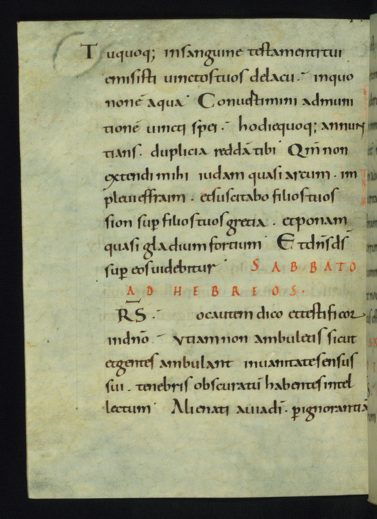 This Lectionary was created ca. 1000 in Trier. Written in a clear Caroline minuscule, it contains decorated initials at the openings of important readings. A set of illuminated letters marks the beginning of the Epistle and Gospel lessons for Easter; they display the hierarchy of scripts with capital letters decorated with gold leaf or drawn in red ink, followed by uncial and Caroline minuscule. Initials in orange, sometimes filled with gold, mark the divisions of the text. The book has been stylistically compared with Ottonian manuscripts, especially with a Psalter preserved in Trier (Stadtbibliothek, Ms. 7) illuminated by the so-called Master of the Registrum Gregorii.